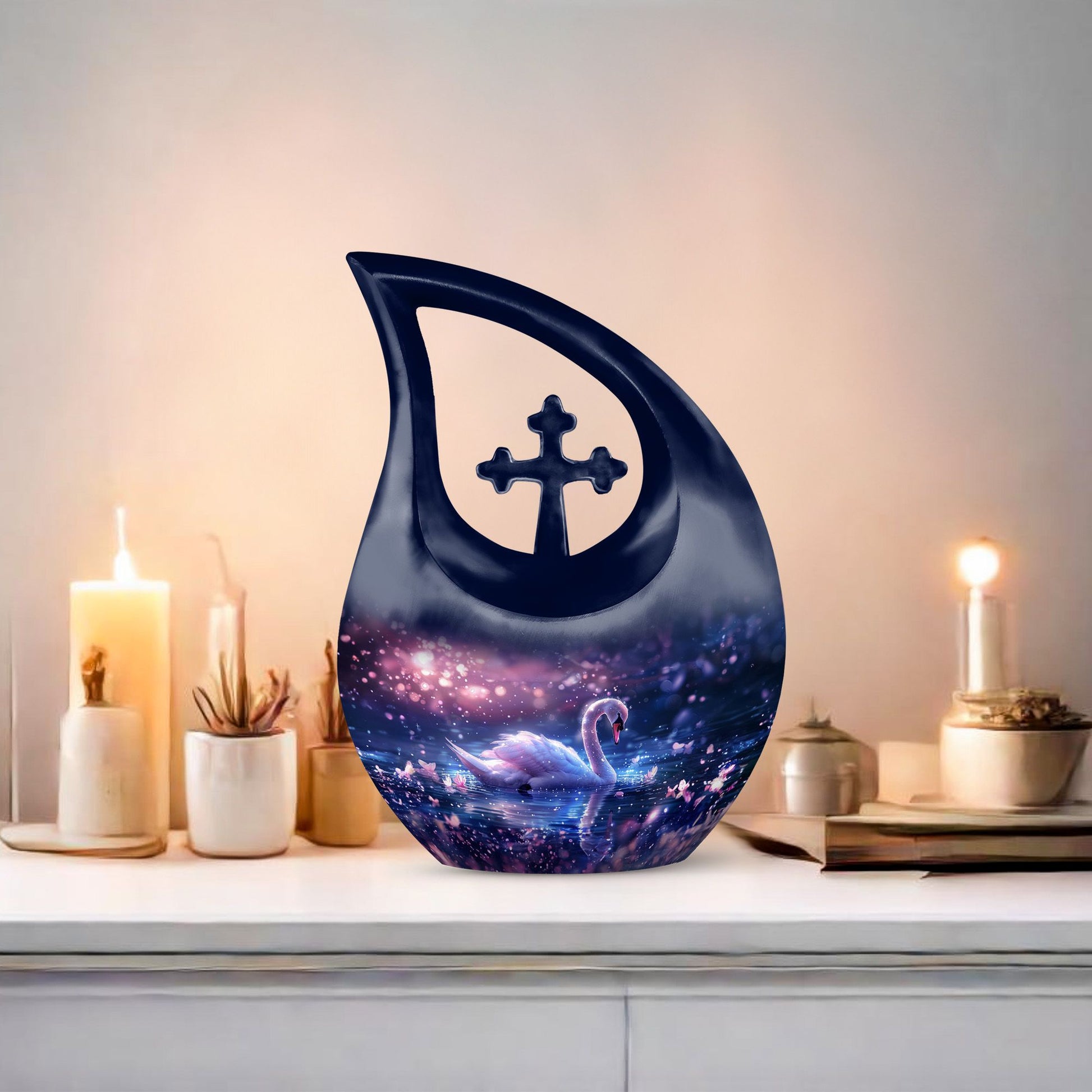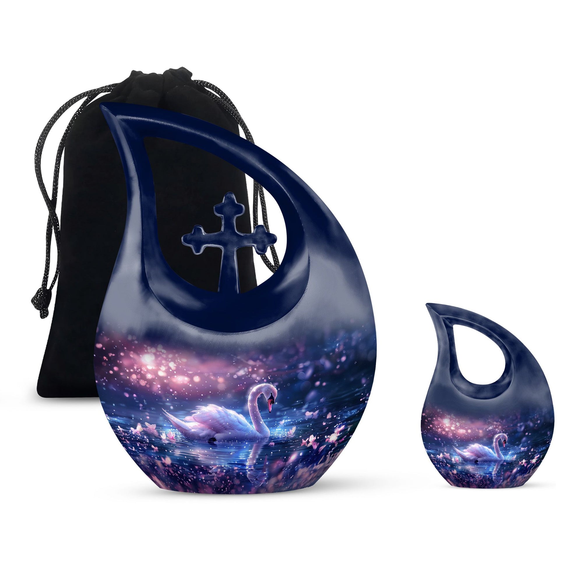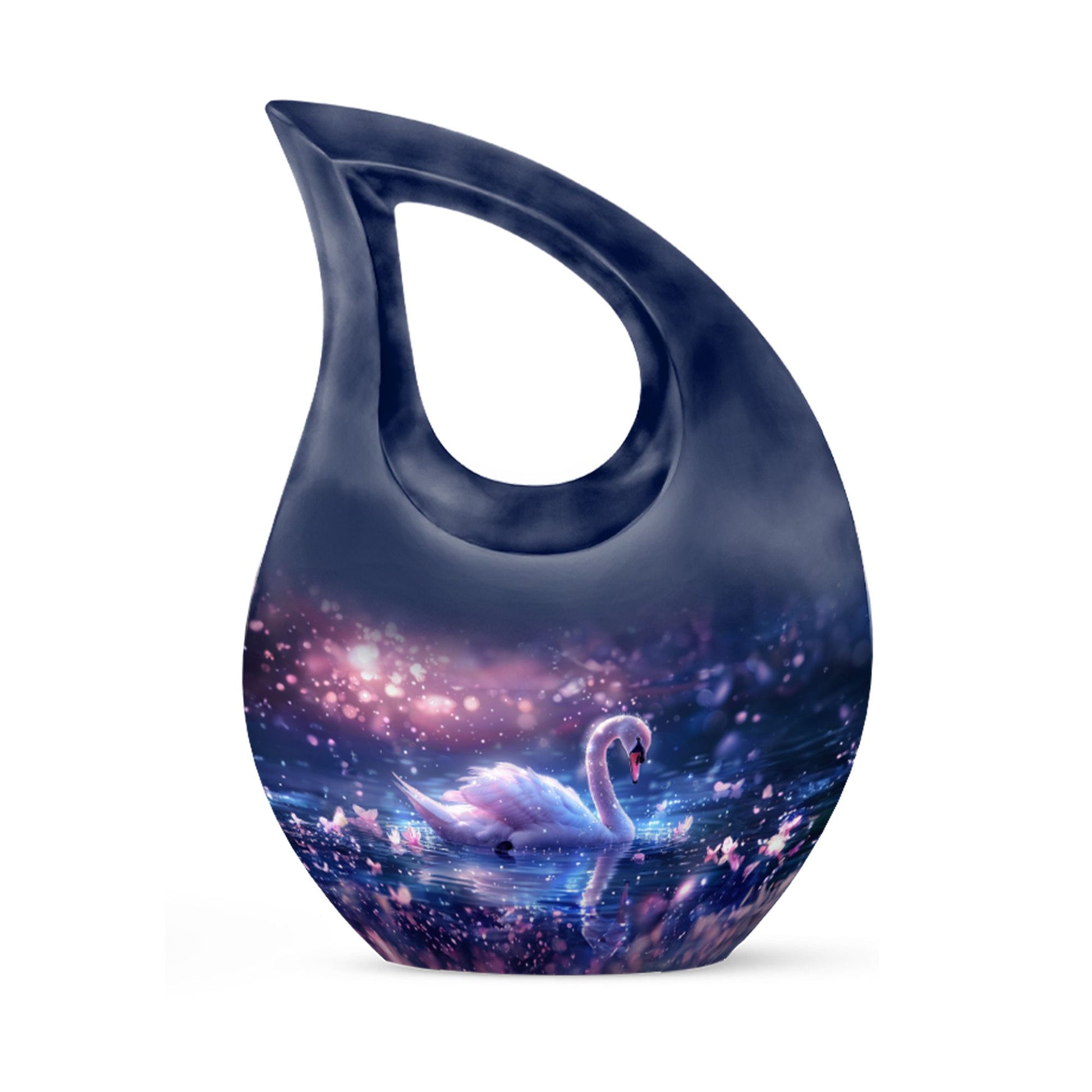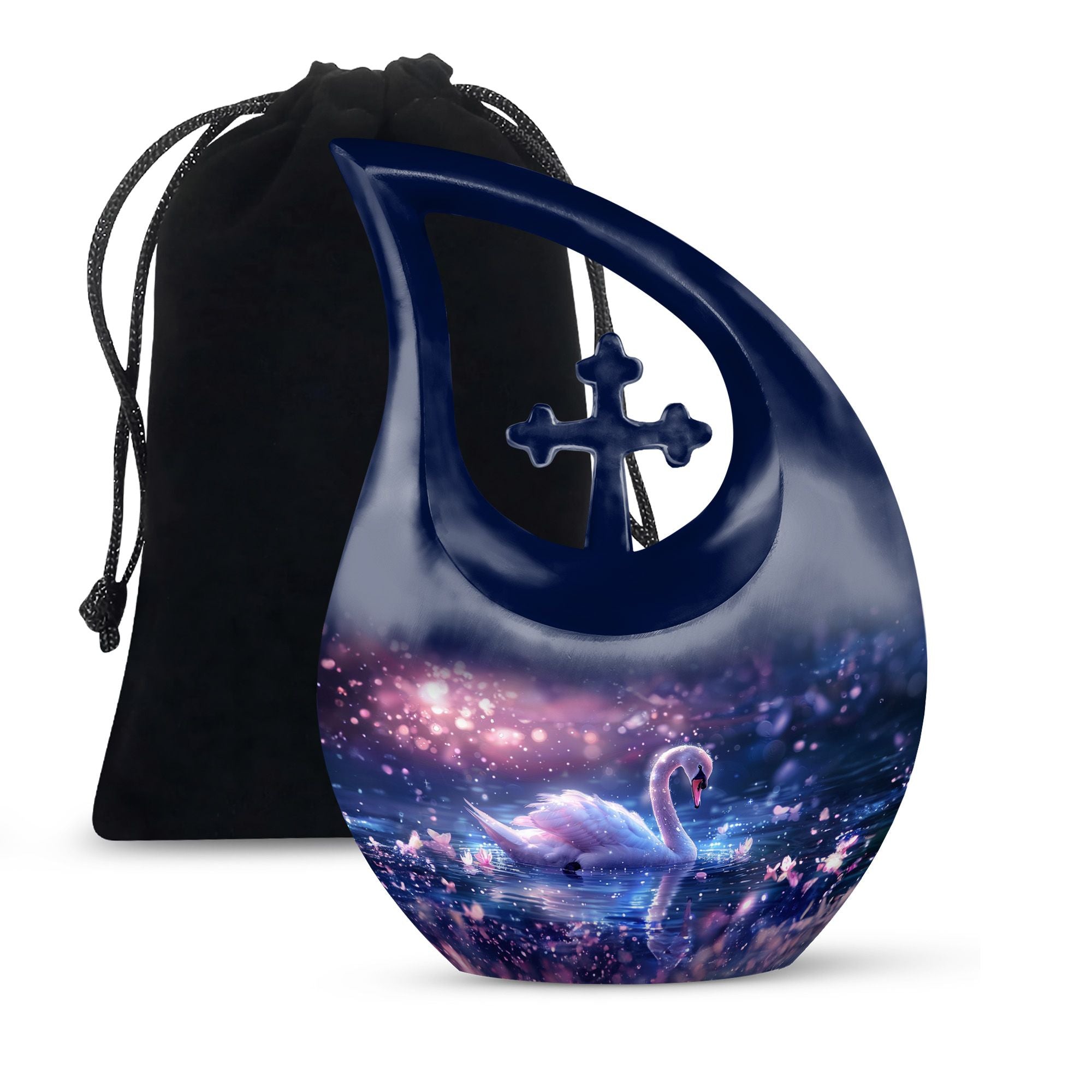 Immerse yourself in the enchanting serenity with our Dreamy Swan Nocturne Urn, a large urn that is perfect for adults who require a peaceful final resting place. The size of the urn is about 10 inches, crafted from durable aluminium, ensuring longevity and stability. The exterior features an intriguing 'Cross Drop' detail, adding an element of subtlety and style. Capable of holding 200 cubic inches, this urn is suitable for most needs. Weighing at just 3.3 pounds, it is both sturdy and portable. Each urn comes conveniently packaged with a velvet pouch, providing a secure containment for ashes. To make our urns even more special, customize and personalize them with engraved names, promising a truly unique tribute to your loved ones. Suitable for both indoor and outdoor settings, the Dreamy Swan Nocturne Urn includes terms like 'Urns For Women's Ashes', 'Pet Urn Vase', 'Outdoor Cremation Urns, and 'Outdoor Urns' in its secondary keywords. Remember the loved ones in a peaceful environment, let the memorial urns capture their essence.