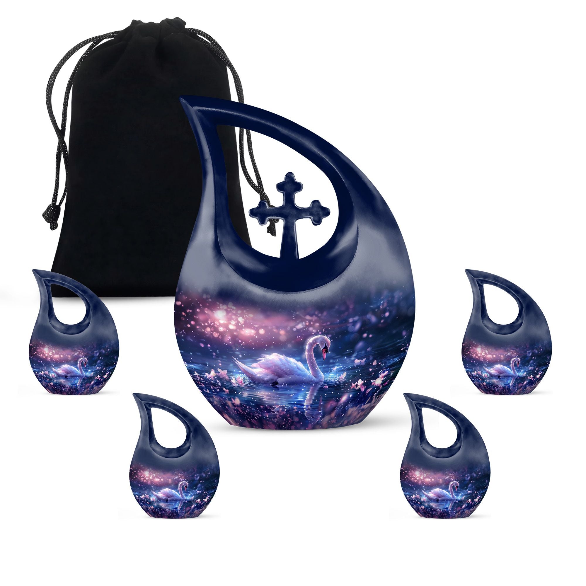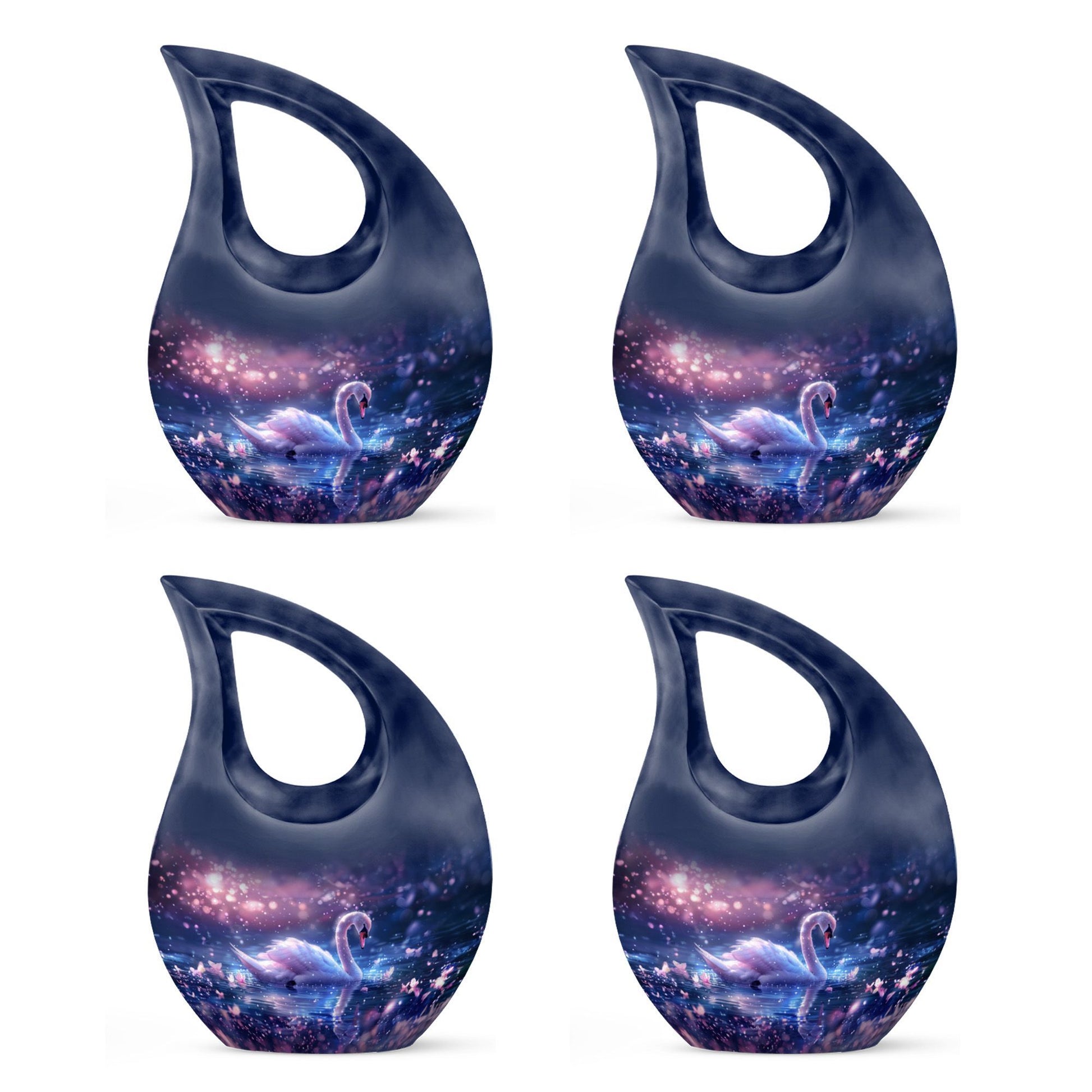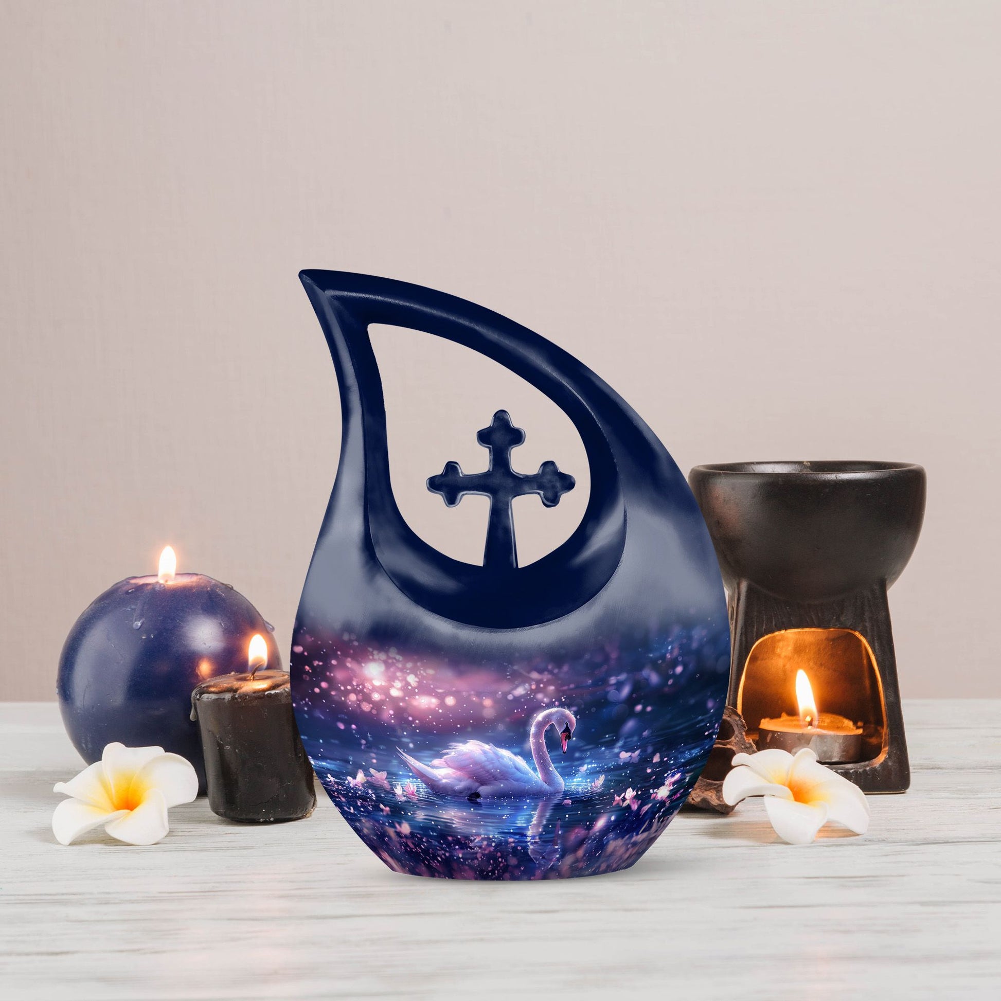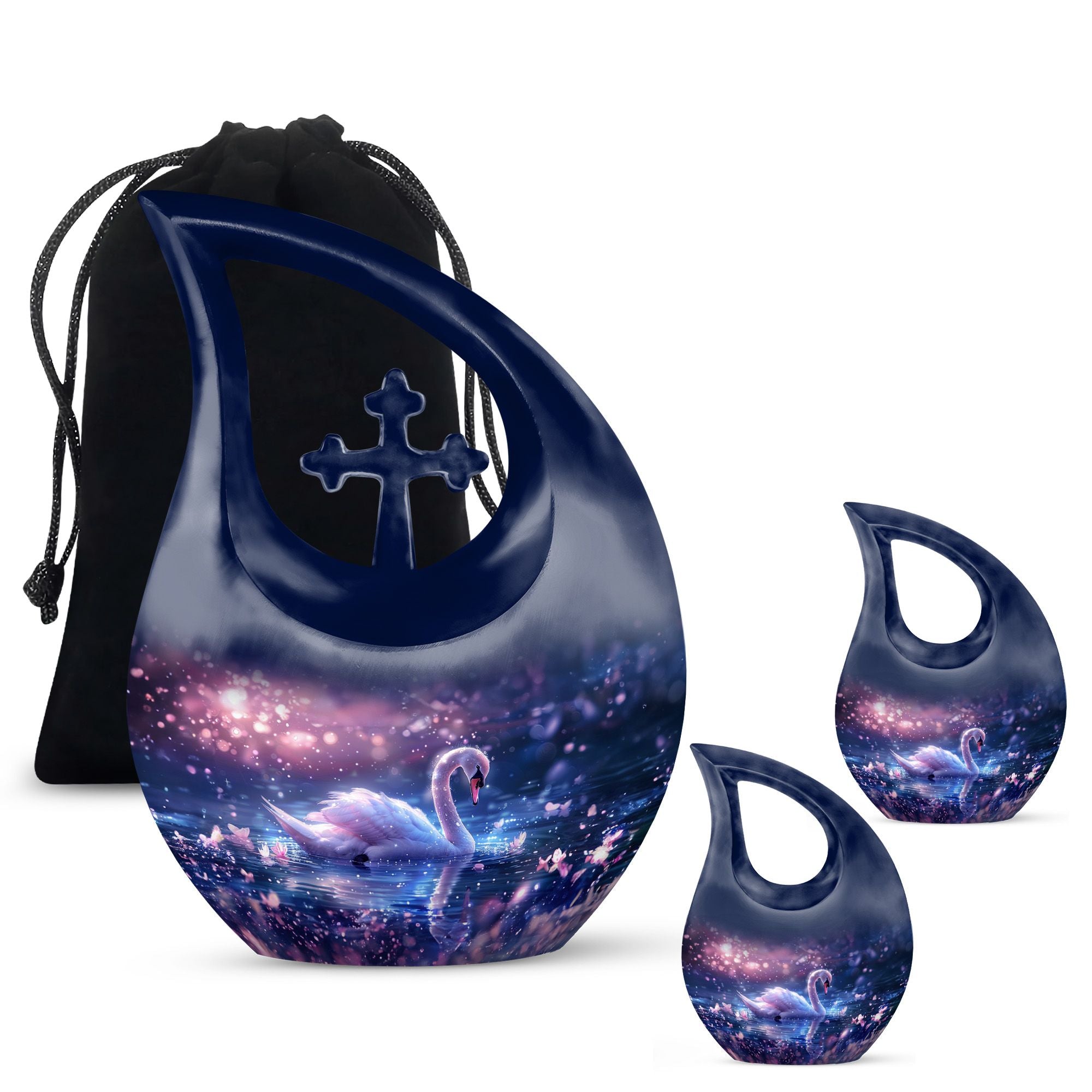 Immerse yourself in the enchanting serenity with our Dreamy Swan Nocturne Urn, a large urn that is perfect for adults who require a peaceful final resting place. The size of the urn is about 10 inches, crafted from durable aluminium, ensuring longevity and stability. The exterior features an intriguing 'Cross Drop' detail, adding an element of subtlety and style. Capable of holding 200 cubic inches, this urn is suitable for most needs. Weighing at just 3.3 pounds, it is both sturdy and portable. Each urn comes conveniently packaged with a velvet pouch, providing a secure containment for ashes. To make our urns even more special, customize and personalize them with engraved names, promising a truly unique tribute to your loved ones. Suitable for both indoor and outdoor settings, the Dreamy Swan Nocturne Urn includes terms like 'Urns For Women's Ashes', 'Pet Urn Vase', 'Outdoor Cremation Urns, and 'Outdoor Urns' in its secondary keywords. Remember the loved ones in a peaceful environment, let the memorial urns capture their essence.