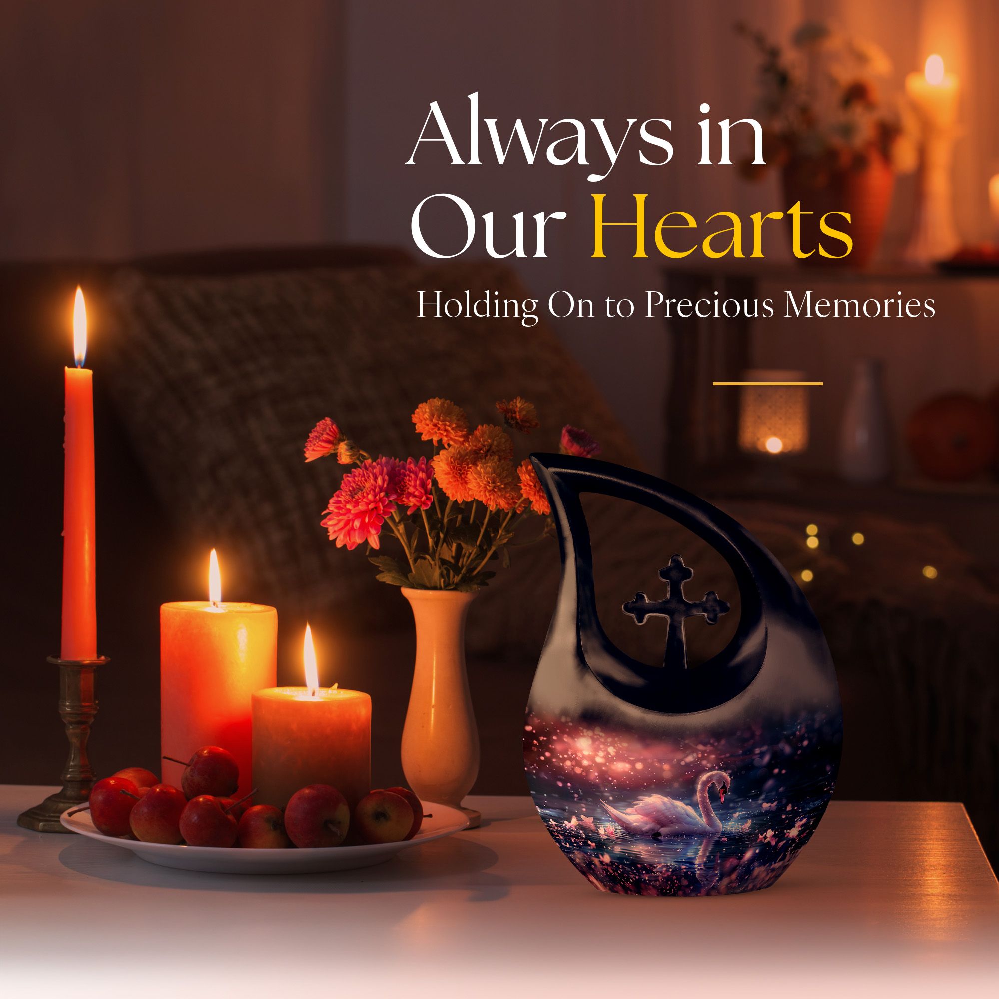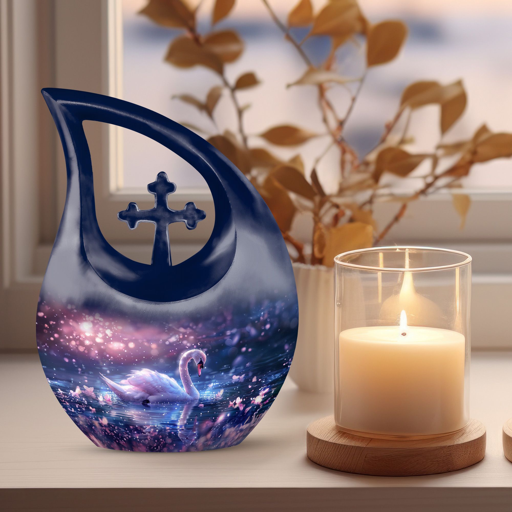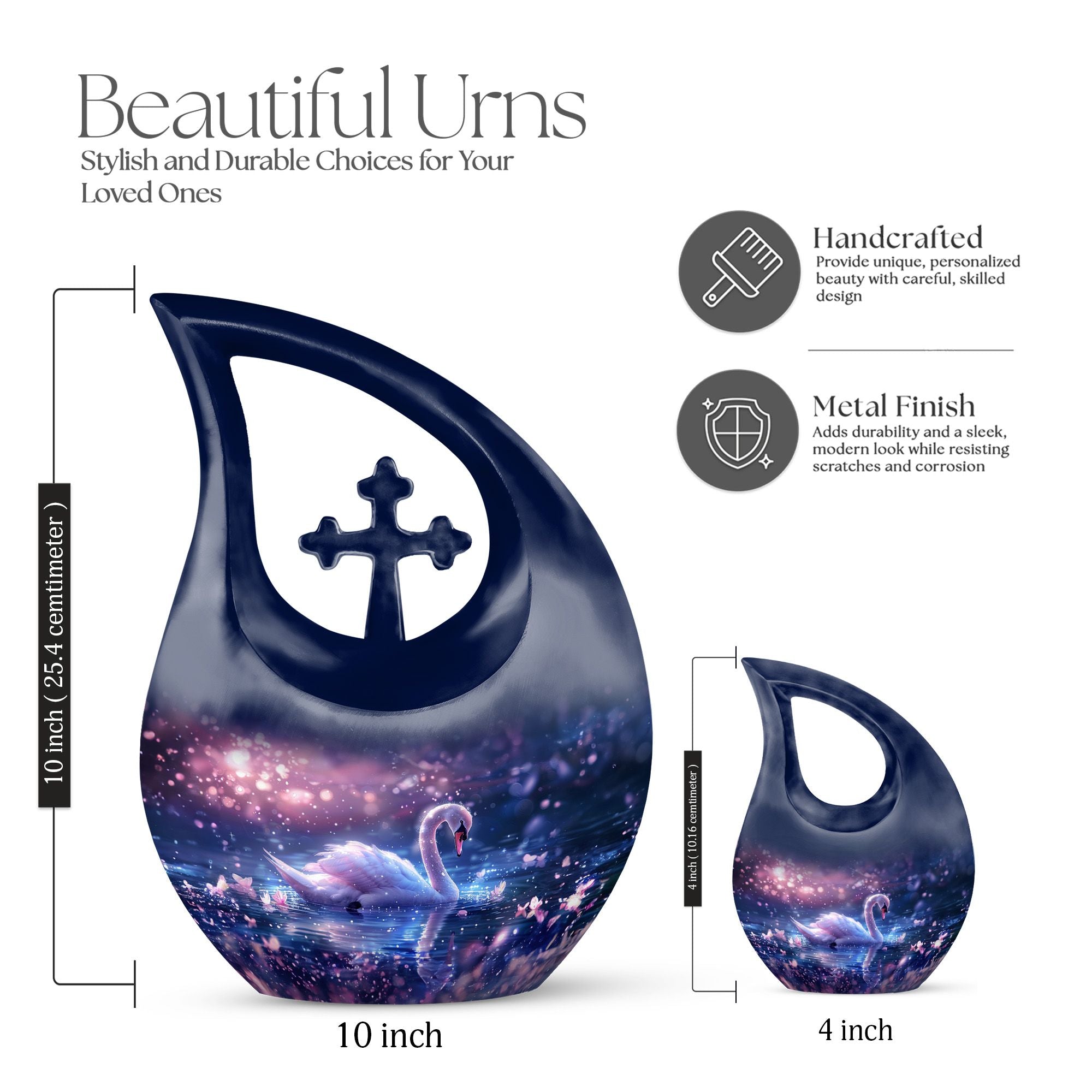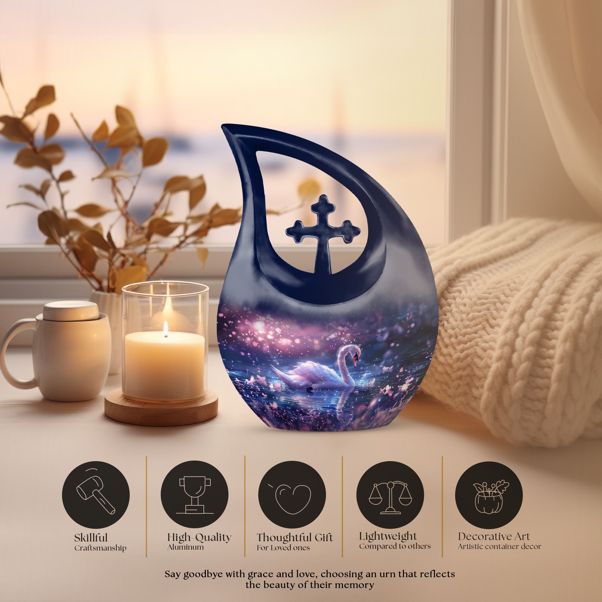Immerse yourself in the enchanting serenity with our Dreamy Swan Nocturne Urn, a large urn that is perfect for adults who require a peaceful final resting place. The size of the urn is about 10 inches, crafted from durable aluminium, ensuring longevity and stability. The exterior features an intriguing 'Cross Drop' detail, adding an element of subtlety and style. Capable of holding 200 cubic inches, this urn is suitable for most needs. Weighing at just 3.3 pounds, it is both sturdy and portable. Each urn comes conveniently packaged with a velvet pouch, providing a secure containment for ashes. To make our urns even more special, customize and personalize them with engraved names, promising a truly unique tribute to your loved ones. Suitable for both indoor and outdoor settings, the Dreamy Swan Nocturne Urn includes terms like 'Urns For Women's Ashes', 'Pet Urn Vase', 'Outdoor Cremation Urns, and 'Outdoor Urns' in its secondary keywords. Remember the loved ones in a peaceful environment, let the memorial urns capture their essence.