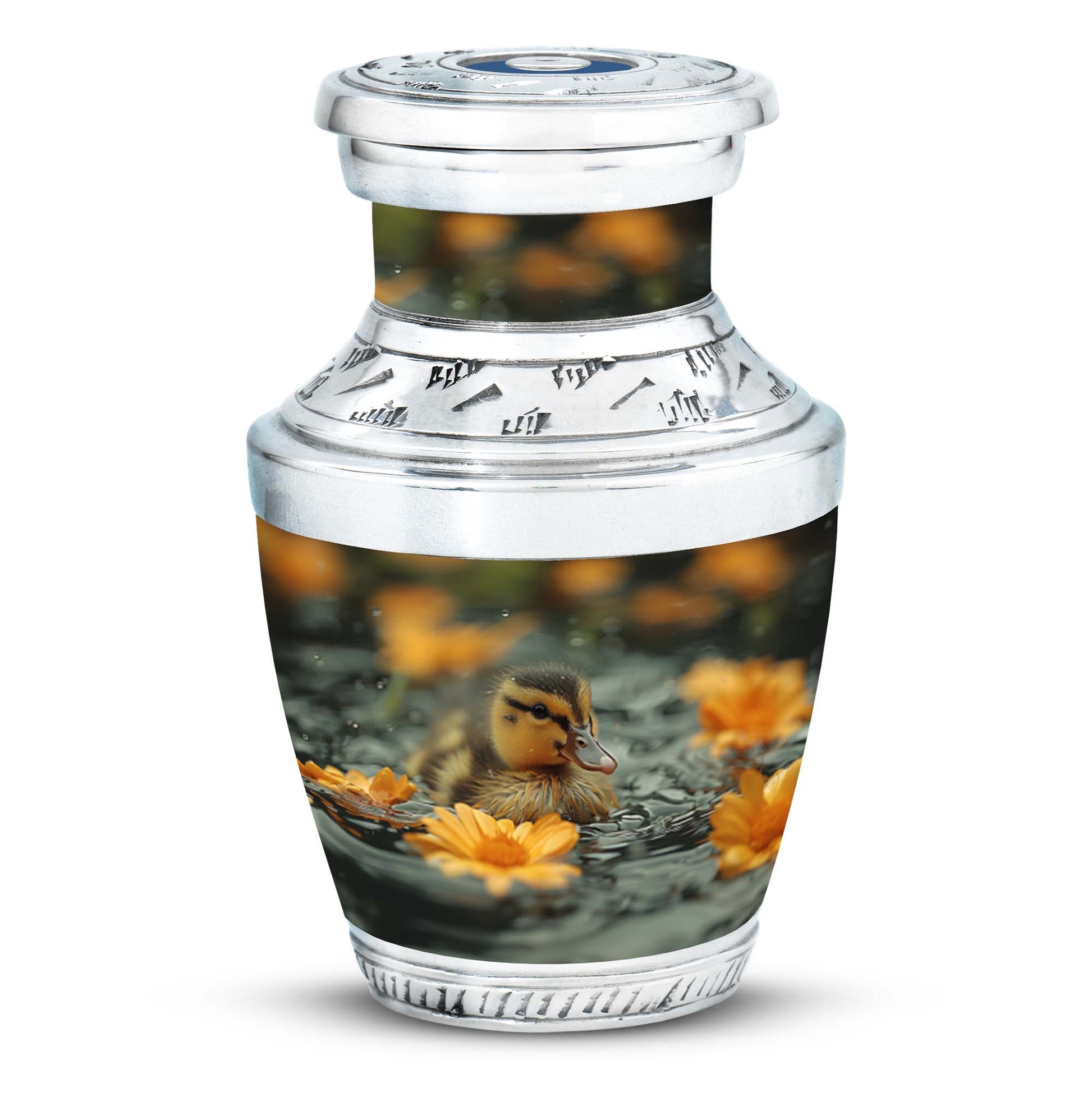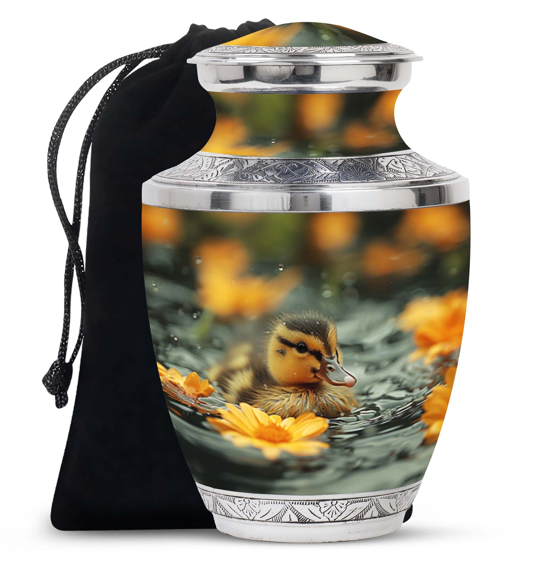 Handcrafted from premium aluminum, this 10 inch urn for ashes adult male and female features serene baby ducklings gliding on tranquil waters, surrounded by pastel blooms. The polished finish highlights each detail beautifully, while the secure screw-top lid ensures the ashes remain safely contained. This versatile design suits both men urns for human ashes and women adult urn needs, offering timeless beauty and durability.