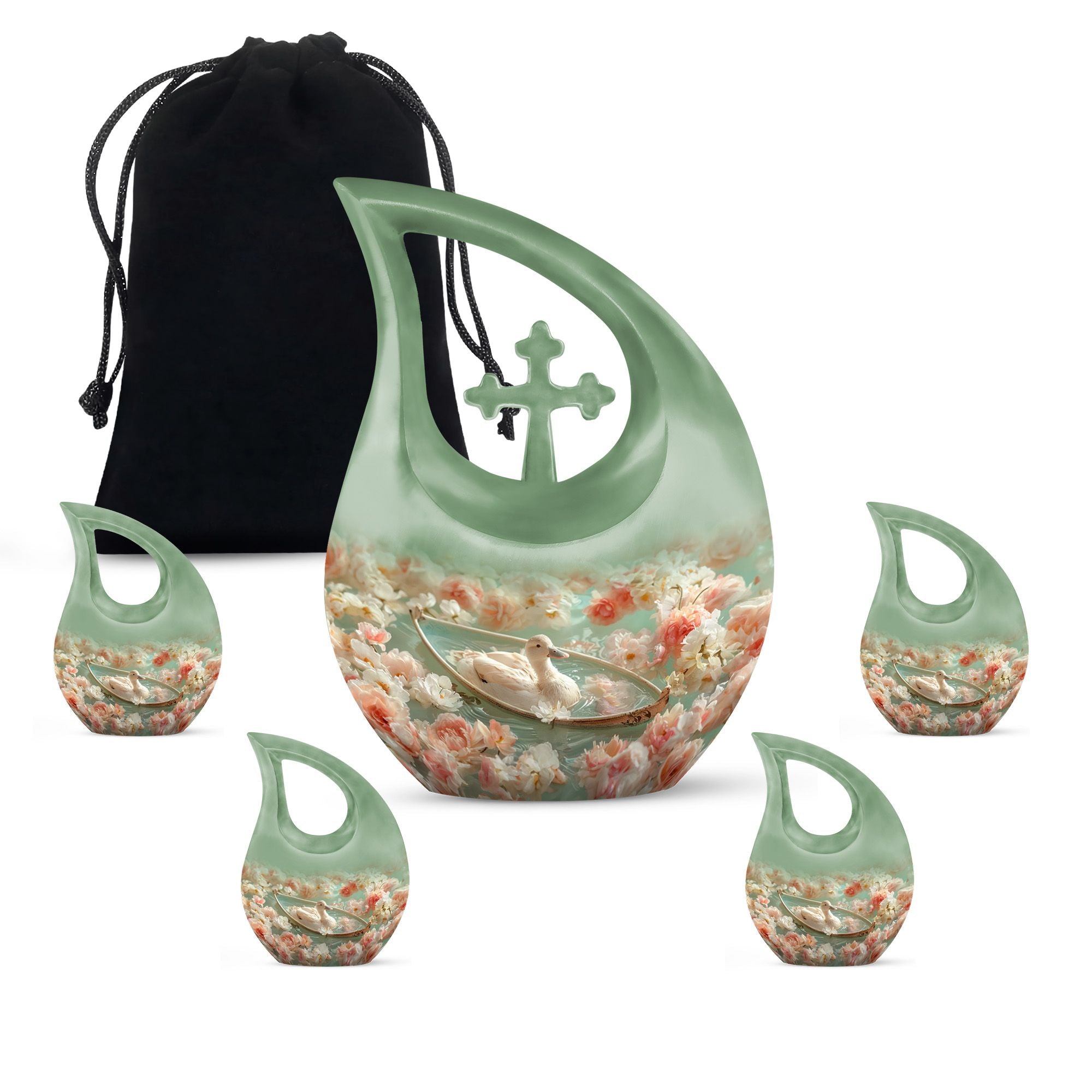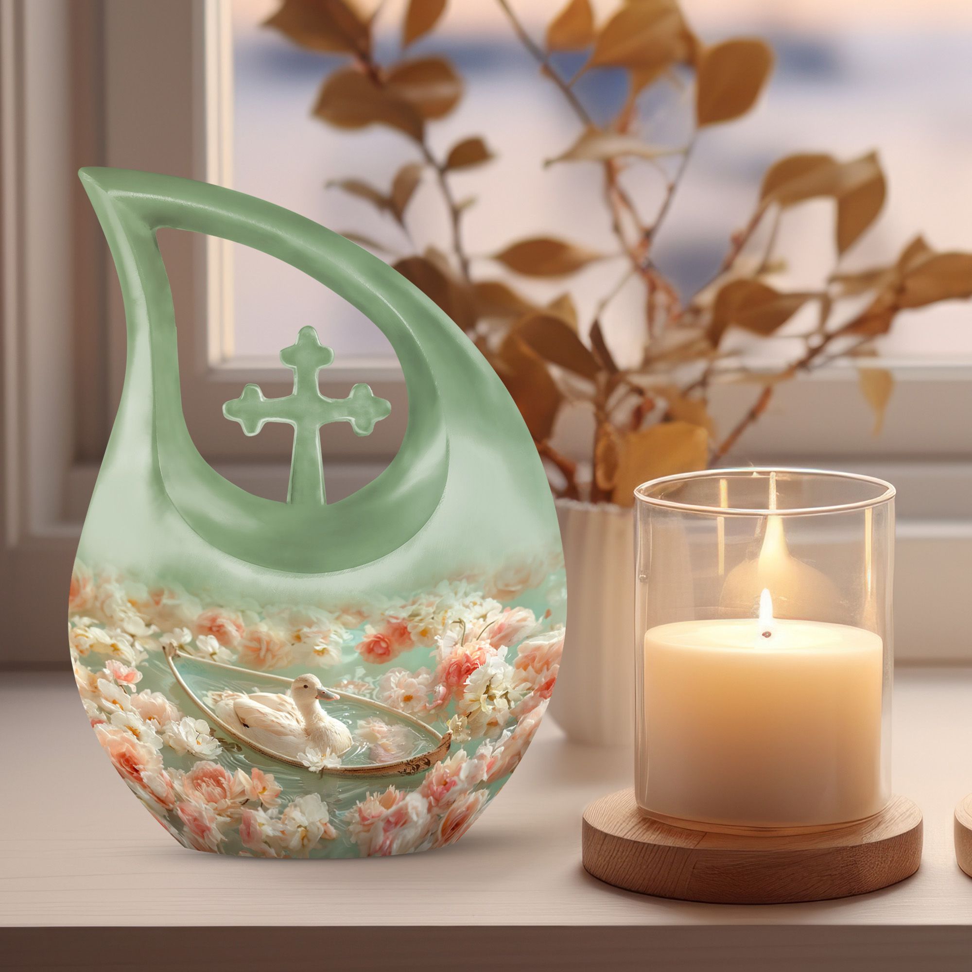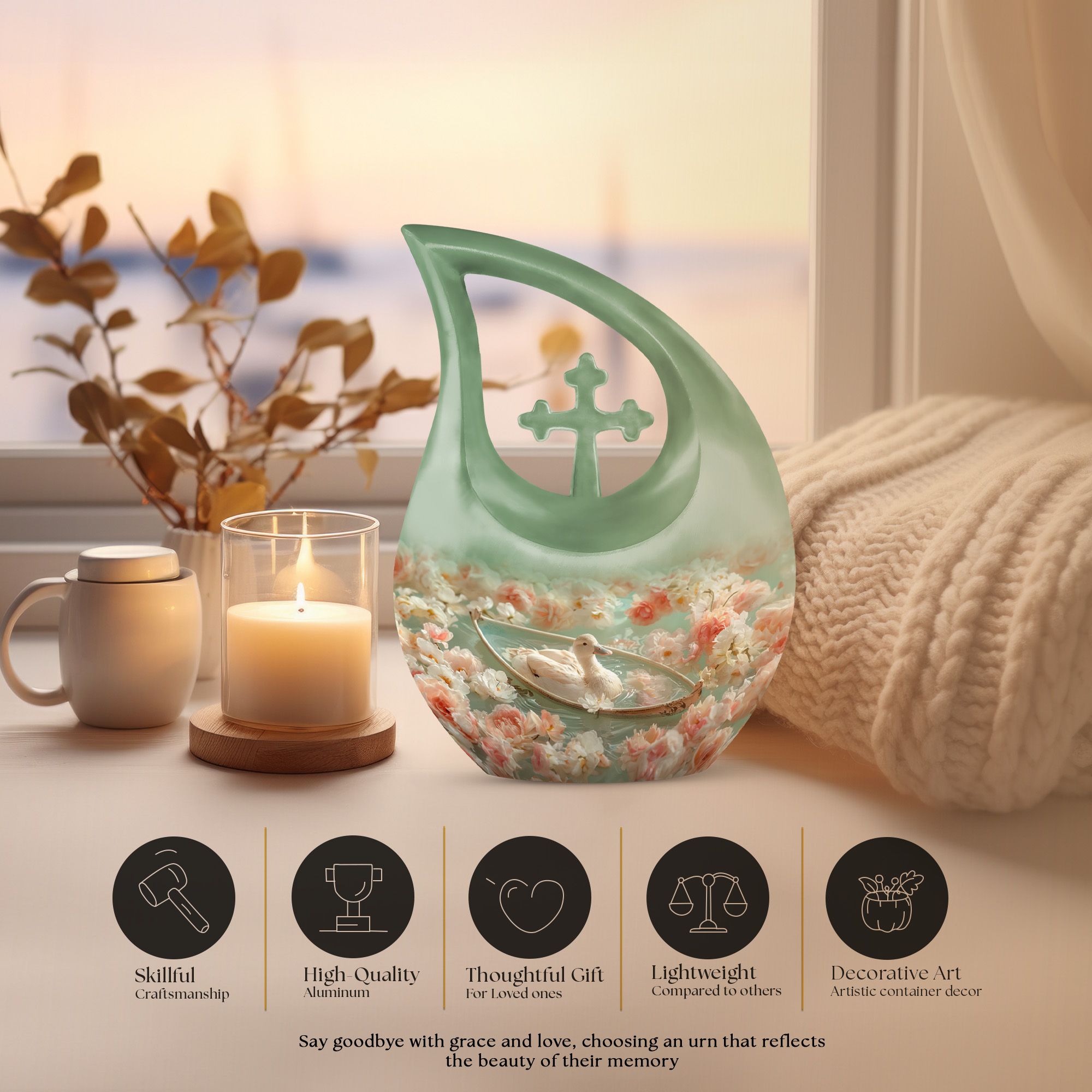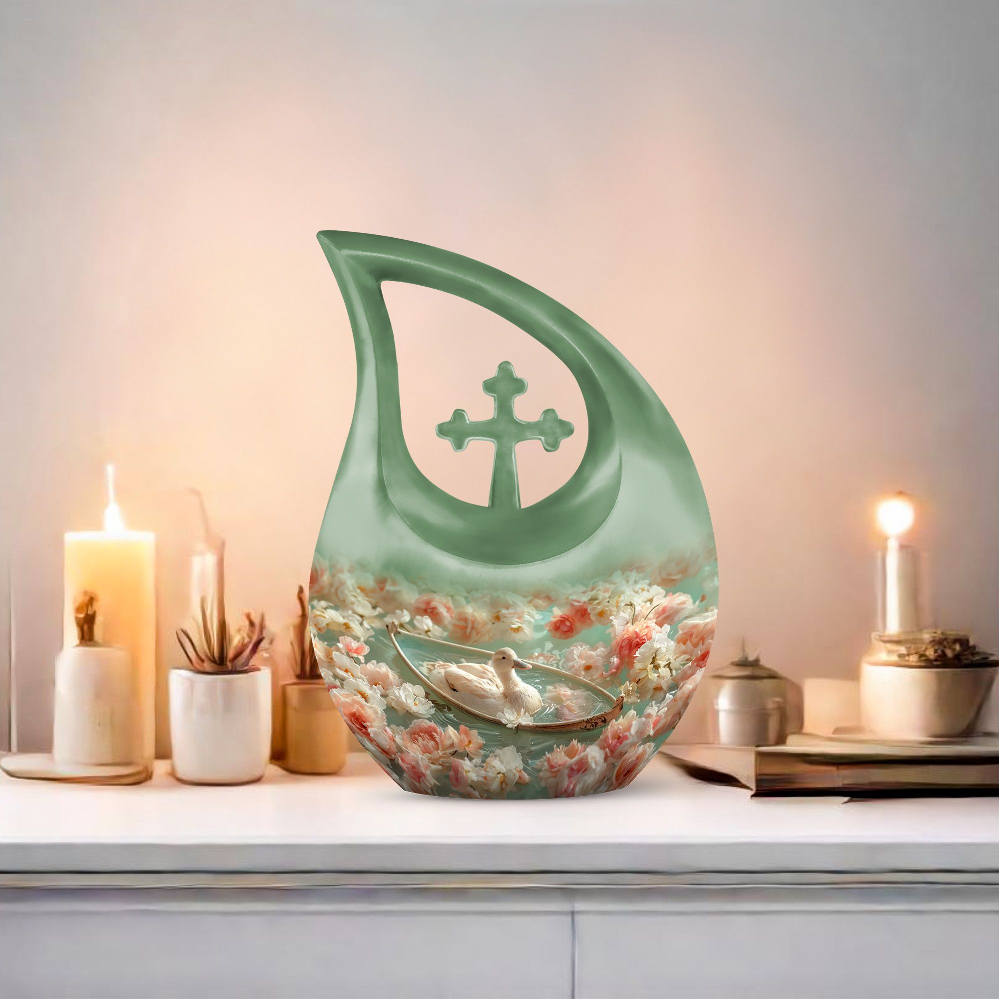 Engage with a touching tribute to your loved ones with this Duck's Floral Voyage Urn. It stands as a unique and lasting commemoration of treasured memories. Crafted from high-quality aluminium, this large urn radiates resilience and grandeur. Its 10-inch height and weight of 3.3 pounds underscore its substantial capacity of 200 cubic inches, ample space to lovingly hold the ashes. An exceptionally notable feature is the central Cross Drop concept of the urn, a discreet reminder of the divine journey. The package includes a graceful velvet pouch that securely contains the ashes, augmenting the intimacy of this commemoration. Moreover, this floral voyage urn can be personalized with engraved names, adding an extra touch of closeness. This unconventional urn serves as the perfect homage to your dearly departed, combining utilitarian value with aesthetic elegance. Ideal for those searching for 'cremation boxes for human ashes', 'modern urns for ashes', 'personalised urns', or 'memorial urns'.