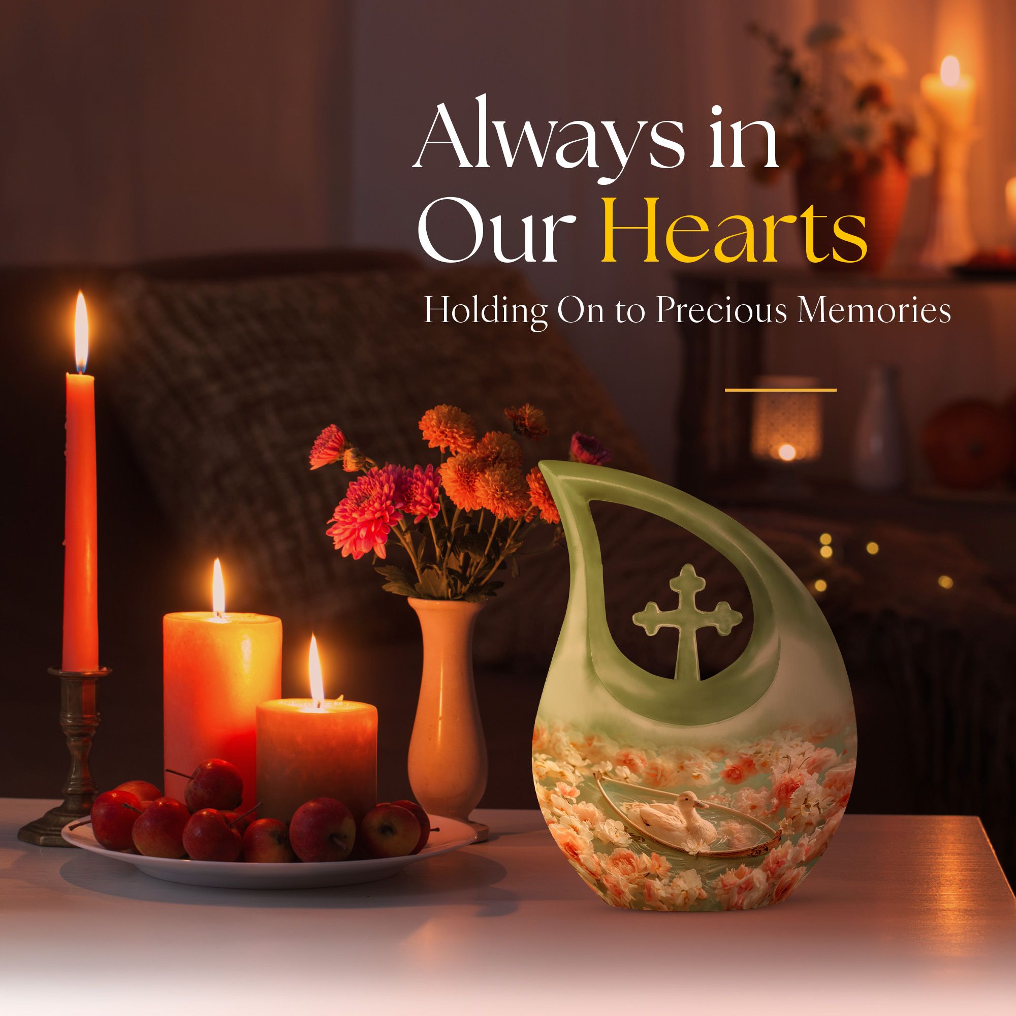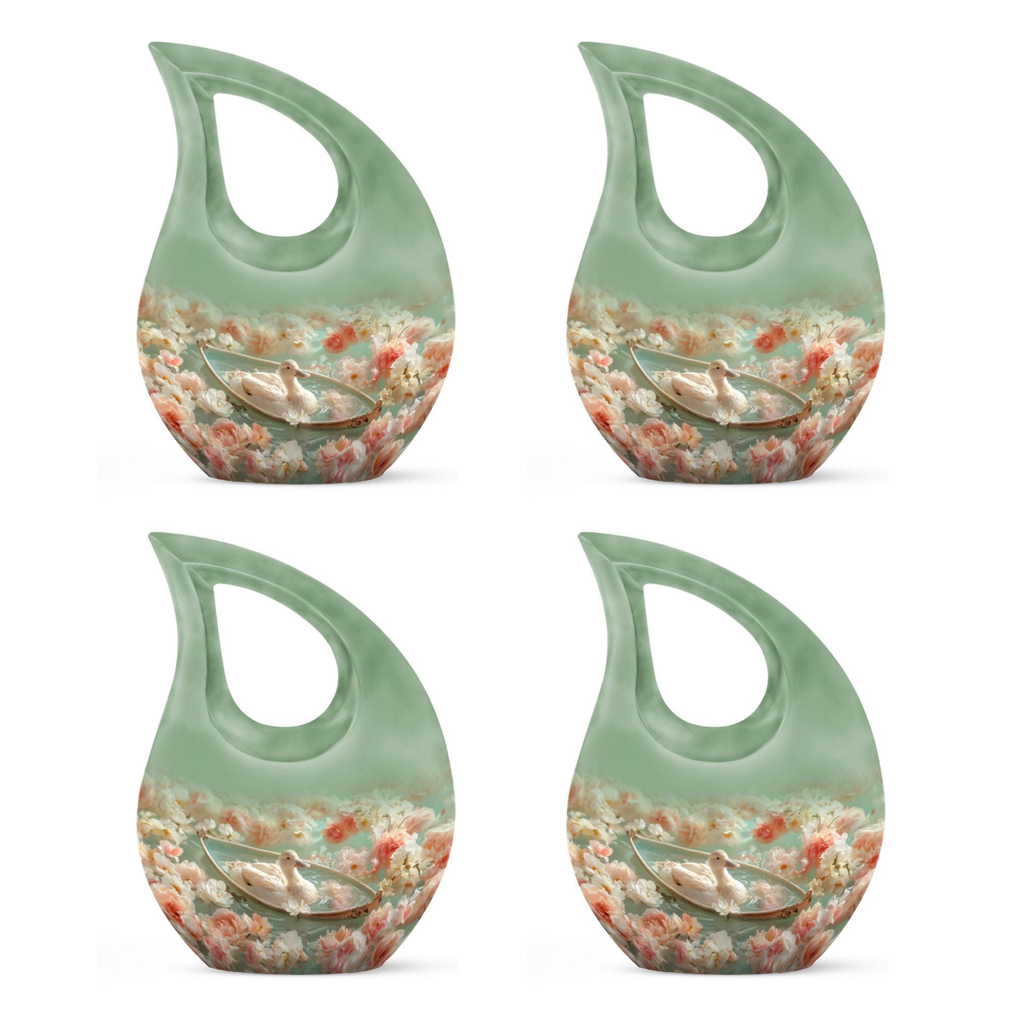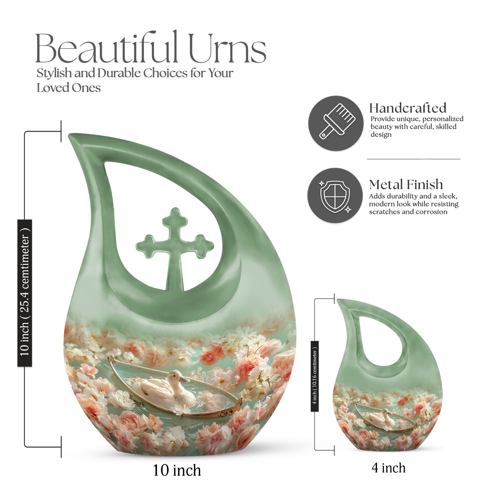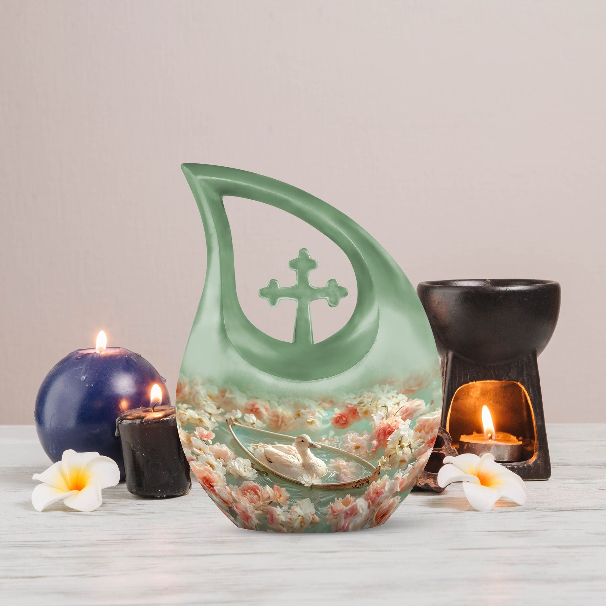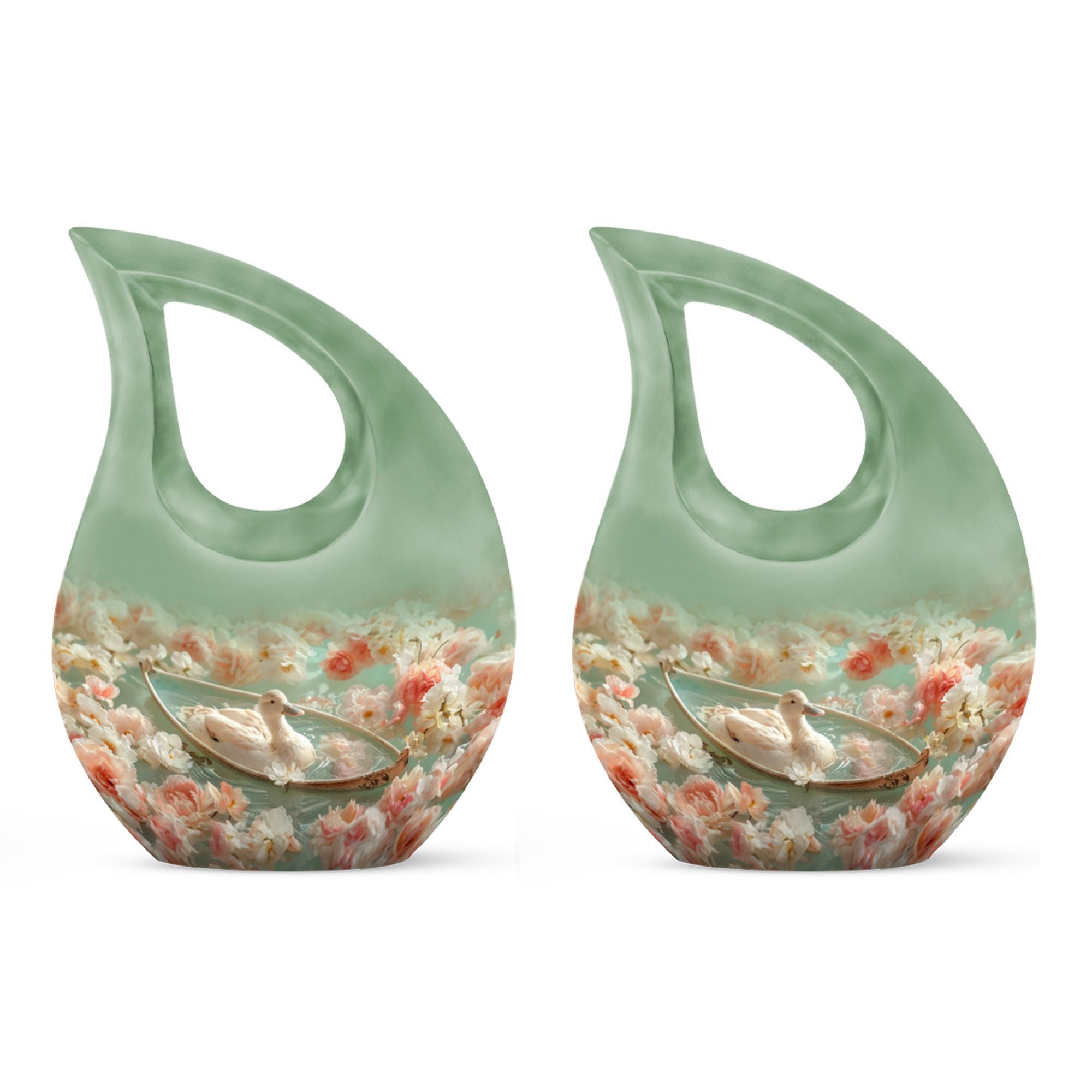 Engage with a touching tribute to your loved ones with this Duck's Floral Voyage Urn. It stands as a unique and lasting commemoration of treasured memories. Crafted from high-quality aluminium, this large urn radiates resilience and grandeur. Its 10-inch height and weight of 3.3 pounds underscore its substantial capacity of 200 cubic inches, ample space to lovingly hold the ashes. An exceptionally notable feature is the central Cross Drop concept of the urn, a discreet reminder of the divine journey. The package includes a graceful velvet pouch that securely contains the ashes, augmenting the intimacy of this commemoration. Moreover, this floral voyage urn can be personalized with engraved names, adding an extra touch of closeness. This unconventional urn serves as the perfect homage to your dearly departed, combining utilitarian value with aesthetic elegance. Ideal for those searching for 'cremation boxes for human ashes', 'modern urns for ashes', 'personalised urns', or 'memorial urns'.