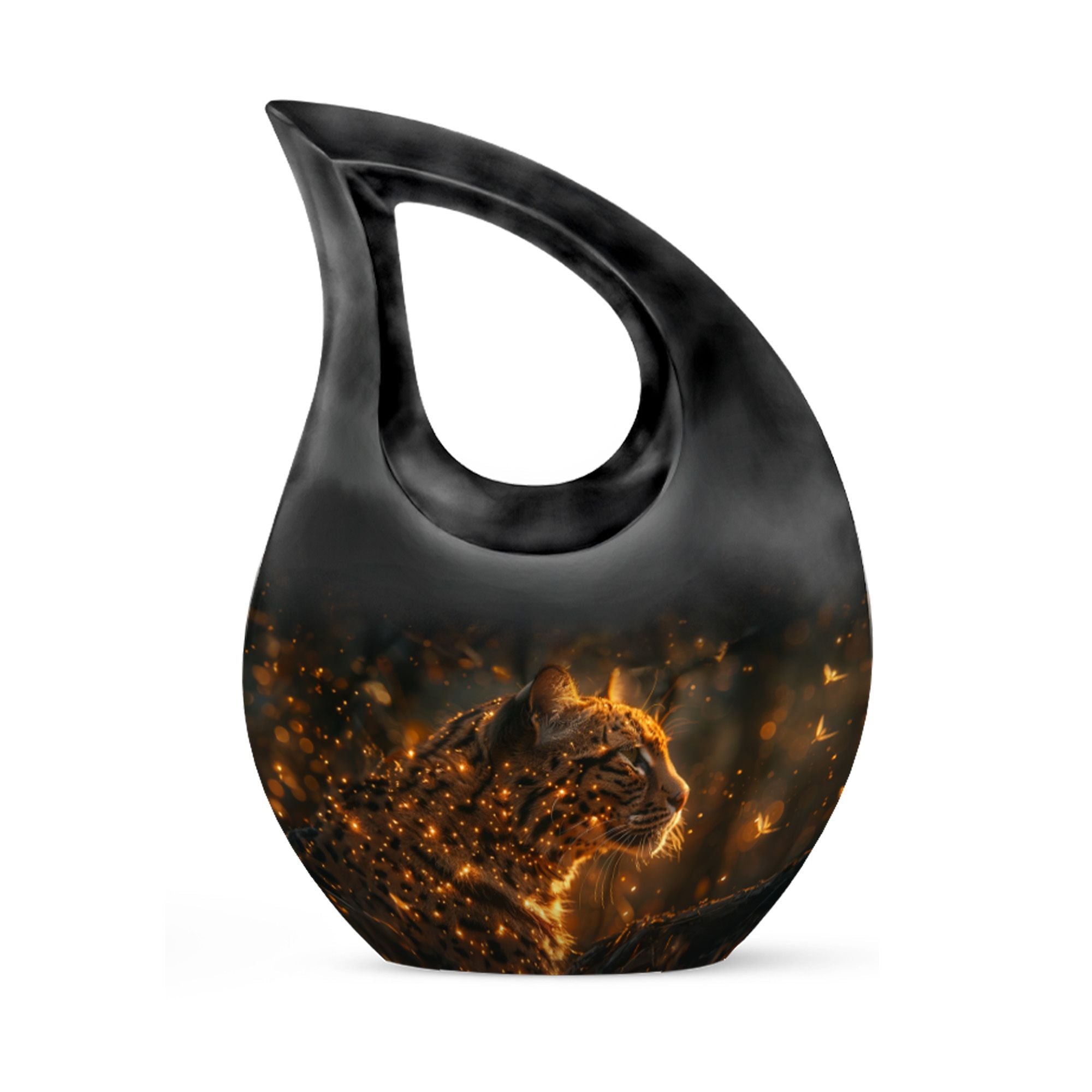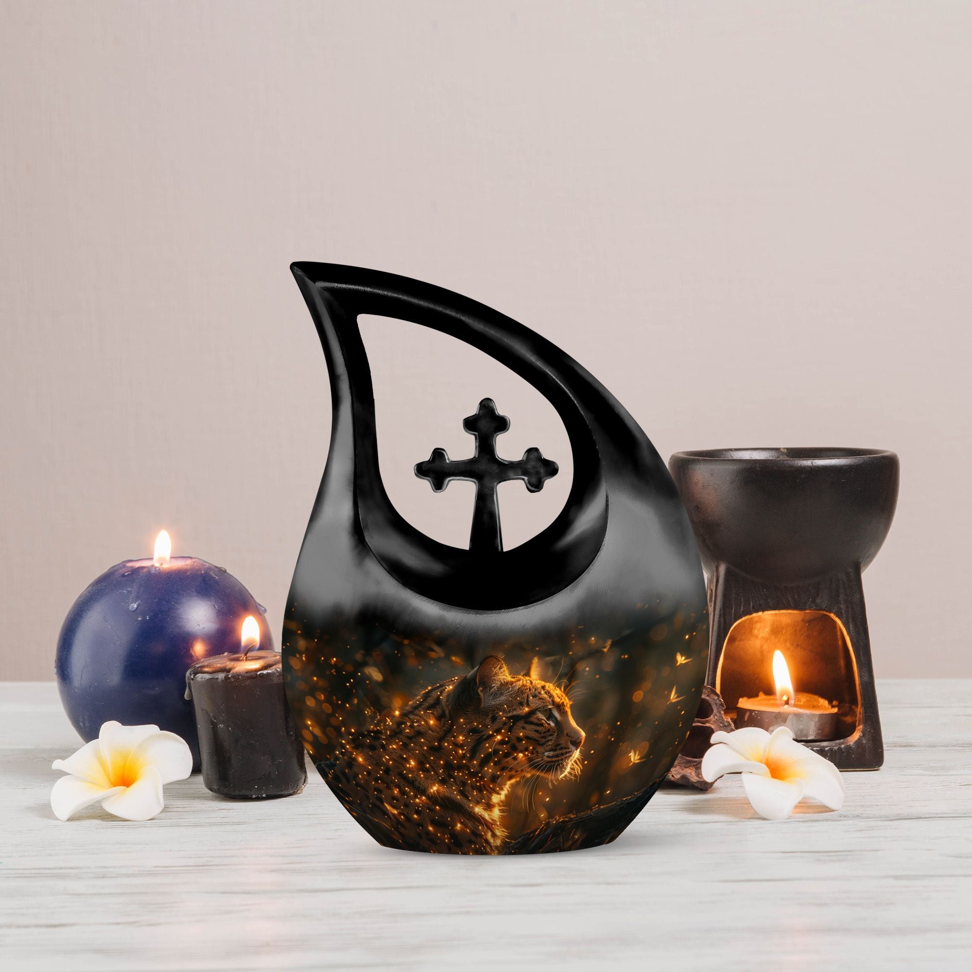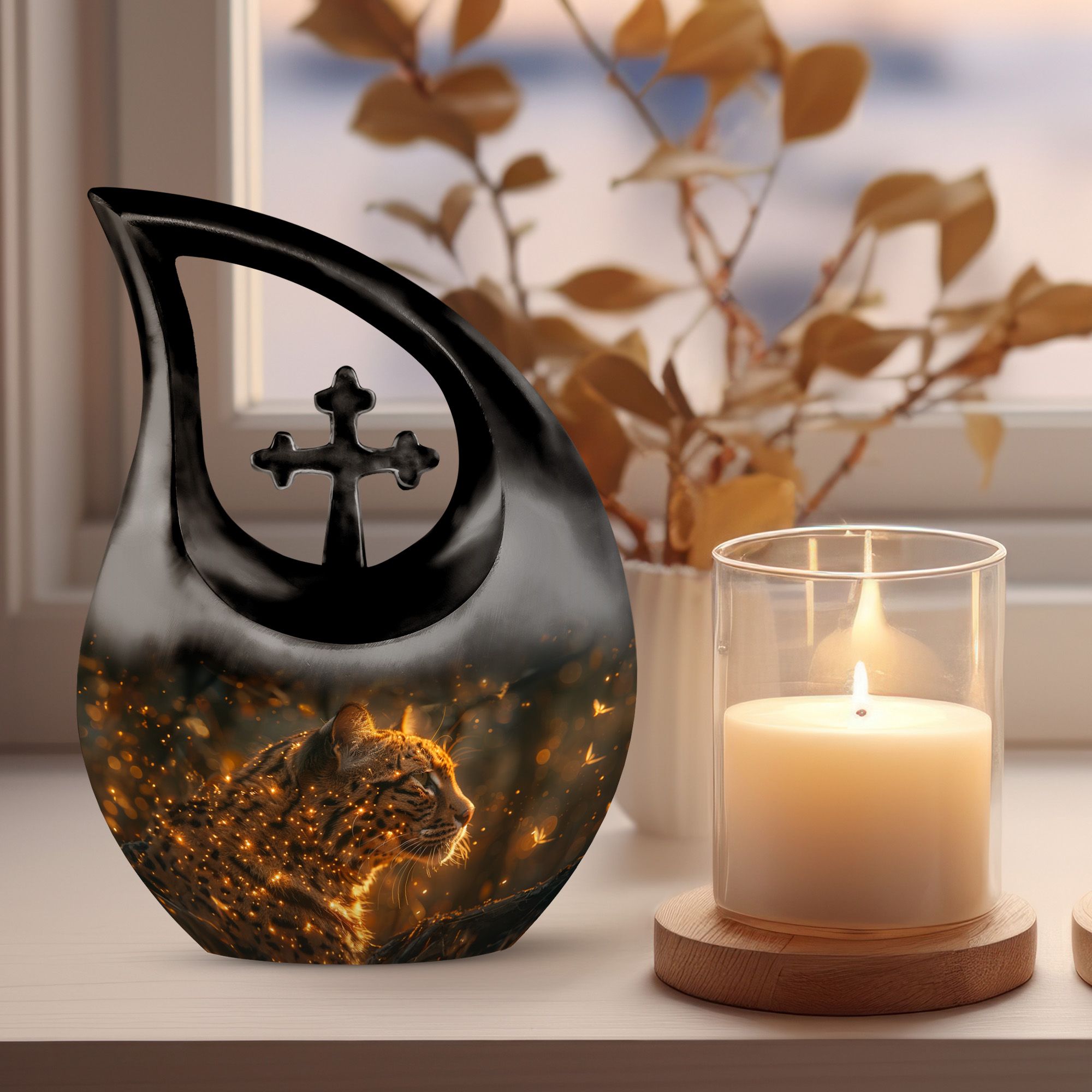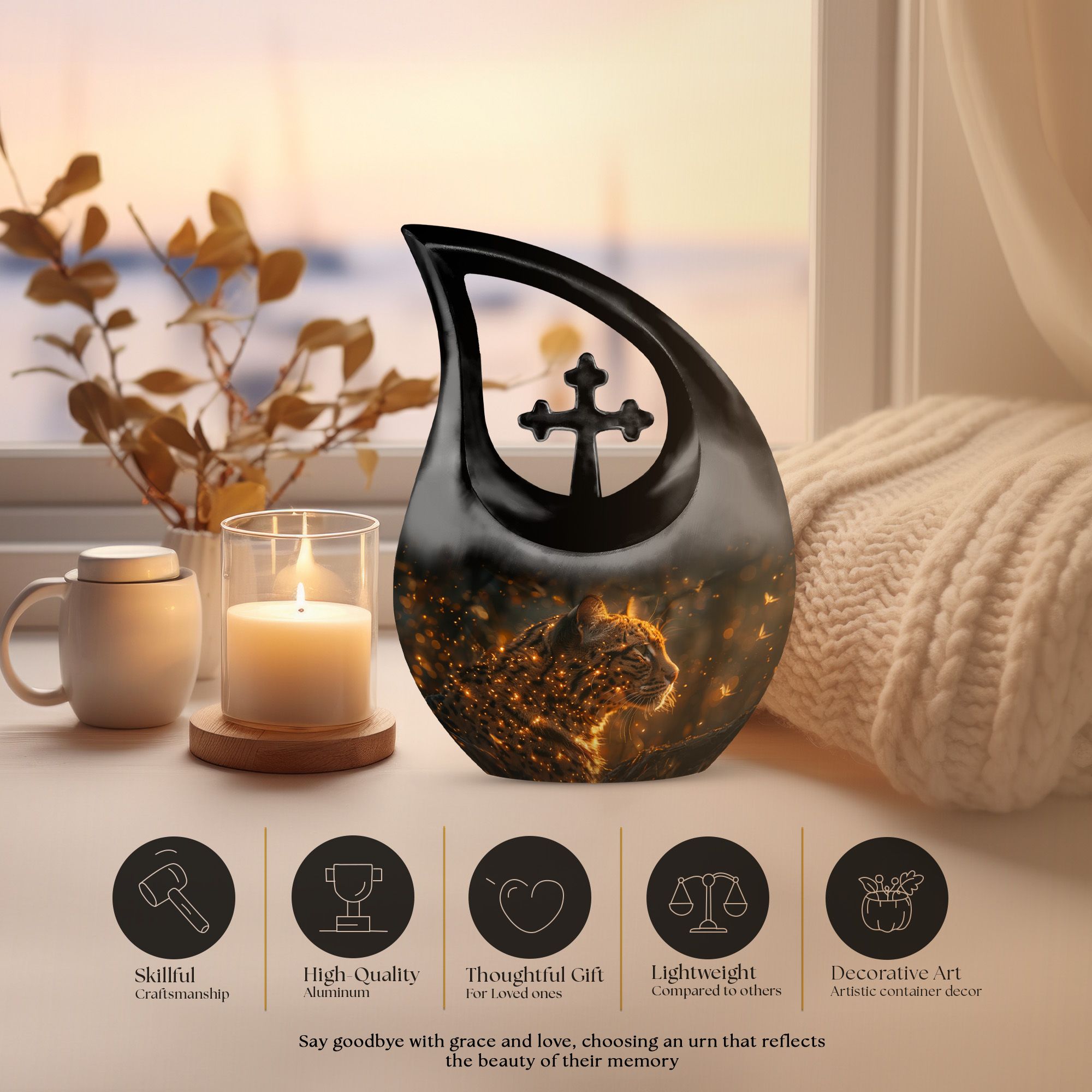 Cherish the memory of your loved ones with our 'Glowing Dusk Prowler Urn'. This large urn, carved from top-grade aluminium, definitely brings an enchanting allure. It stands 10 inches tall and holds a capacity of 200 cubic inches, making it the ideal keepsake for holding the ashes of your departed. This urn pays tribute with its beautiful 'Cross-Drop' theme, illustrating a mesmerizing glowing dusk prowler motif that imbues it with a unique, dignified charm. The urn, weighing a mere 3.3 pounds, is convenient for transportation. Each urn is supplied with a velvet pouch for respectful containment of the ashes, reinforcing the overall quality and thoughtfulness of this item. The customizable feature allows for engraved names, adding a personal touch to each urn and making your remembrance truly unique. Reflect your enduring affection with this meticulously crafted memorial urn. It's more than a resting place - it's a haven that blends love, respect and remembrance into a stunning tribute.