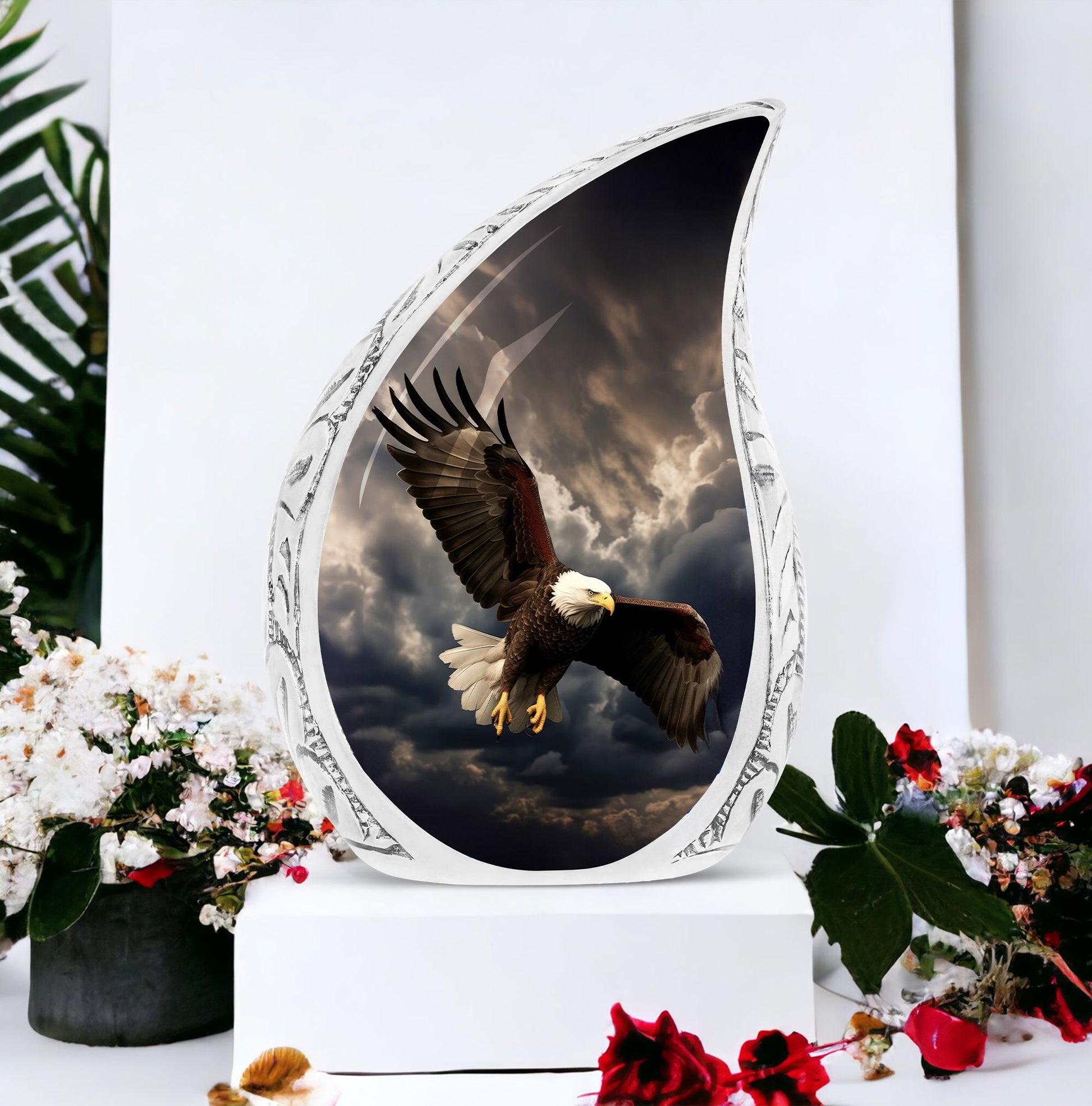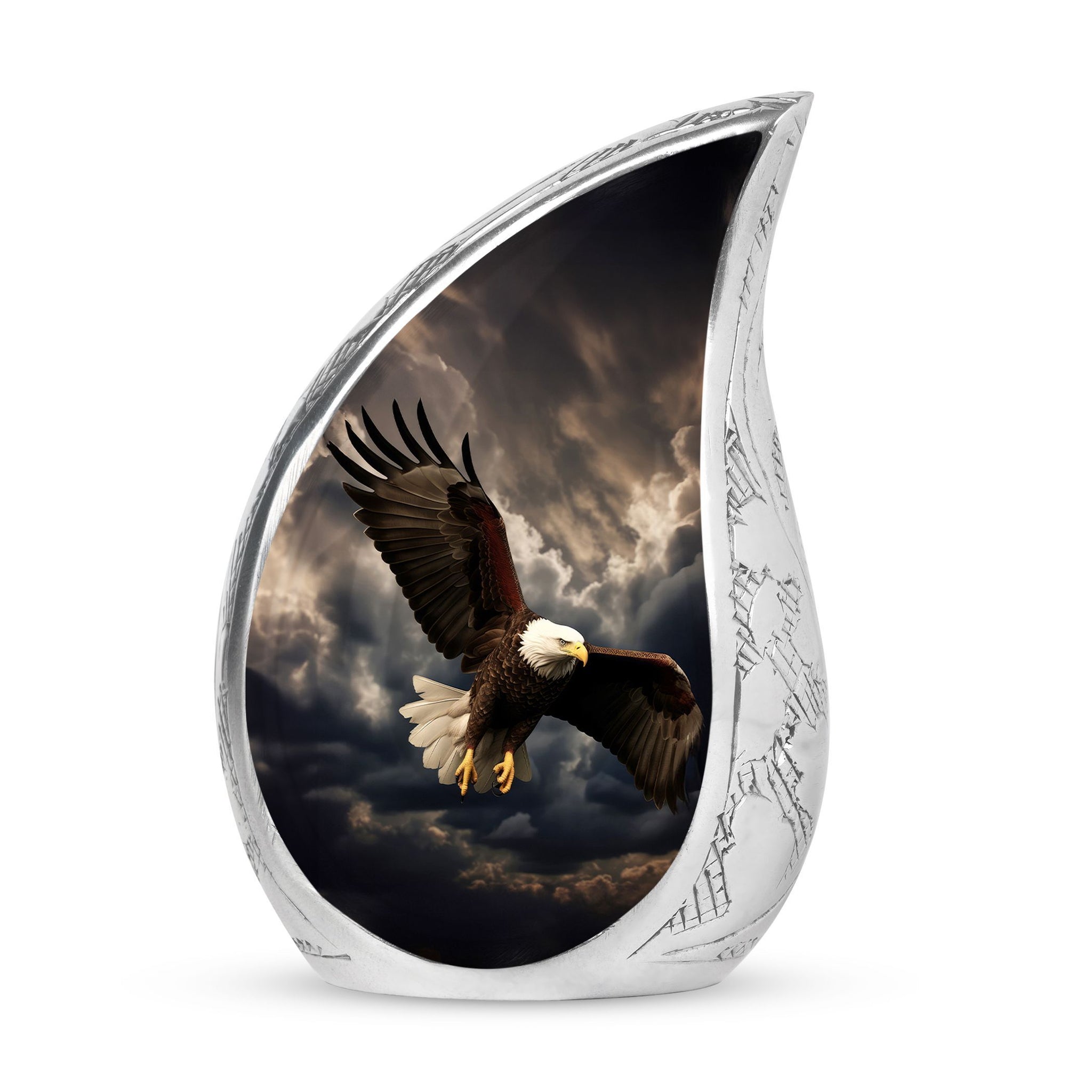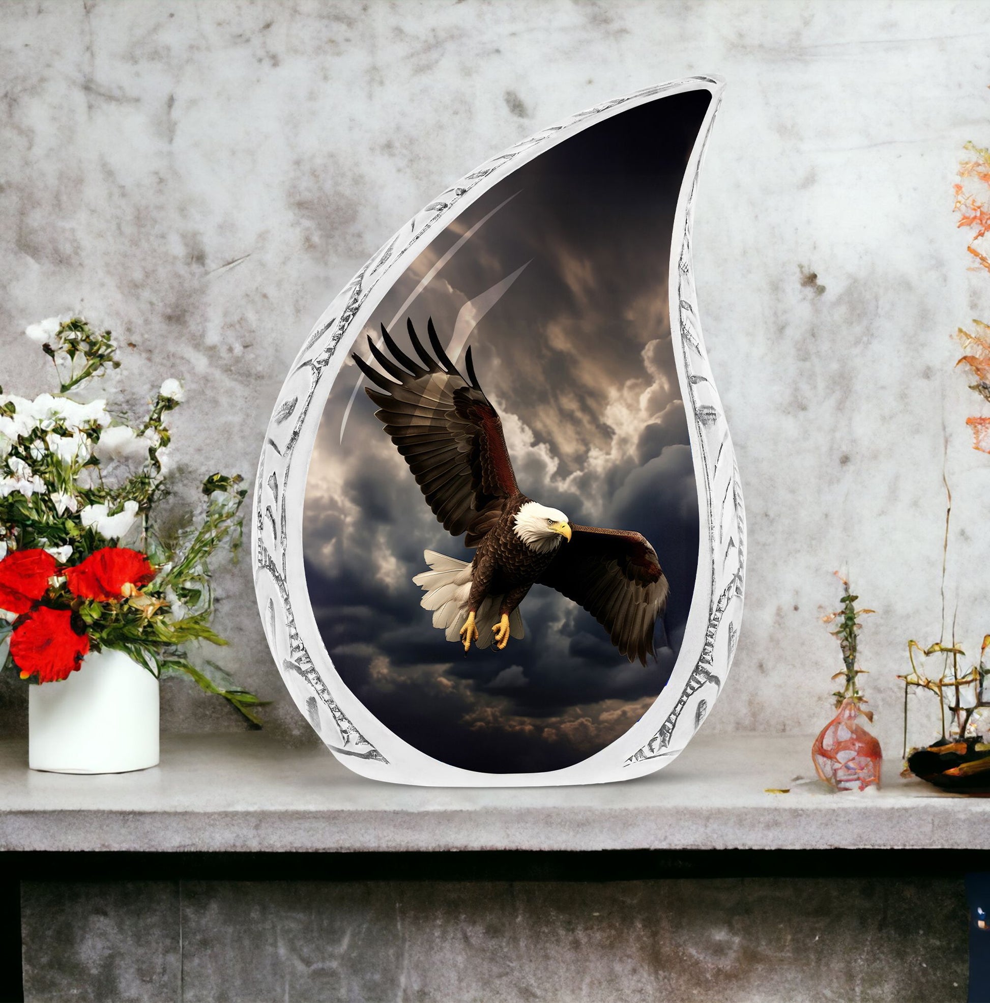 In life's most challenging times, cherish your loved ones' memories with our Eagle Urns for Human Ashes. These large urns aren't just a product but a 'feel sorry for your loss' statement designed for those seeking solace and peace. These memorial urns, standing at 10 inches high, boast ample capacity to hold up to 200 cubic inches of human cremation ashes. The Classic Urn is fashioned from high-quality, durable aluminium, which assures you of its integrity over time. Its weight of 3.3 pounds underlines the robustness of the construction. Each urn is finished to be pleasing to the touch, evoking calm with every caress. Our package extends beyond the urn; it includes a thoughtful velvet pouch for the containment of ashes, offering an added layer of respect to your beloved. Additionally, we provide an option to personalize your urn with engraved names, helping to make them that bit more special and unique. Note that its compact size of 3 inches makes it harmoniously blended into your home decor without causing disruption. These decorative urns bridge the gap between beauty and symbolic memory, creating a lasting impression. ['Eagle Urns for Human Ashes', 'Large Urns for Human Ashes', 'Human Cremation Urns', 'Decorative Urns', 'Human Cremation Ashes']