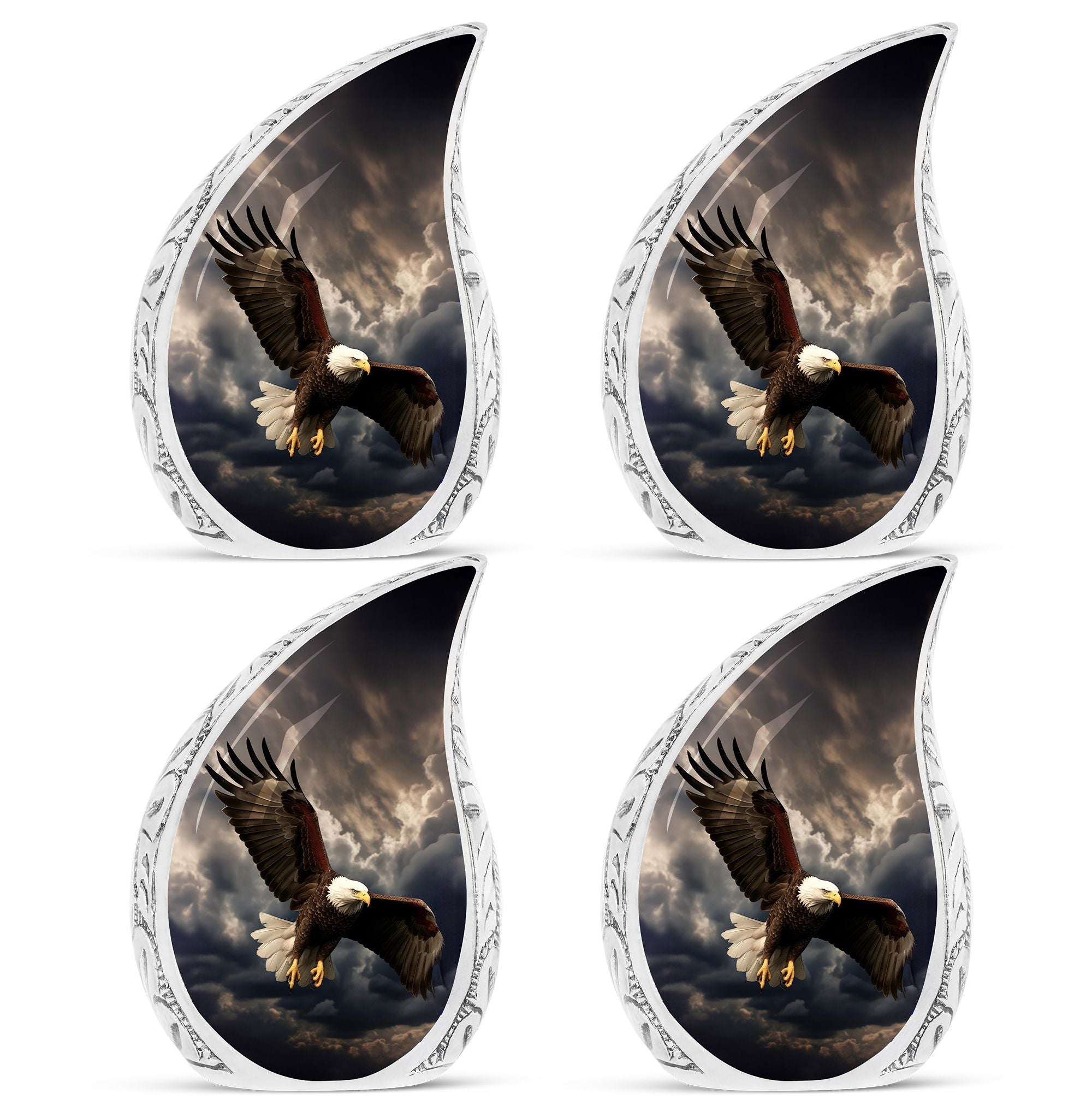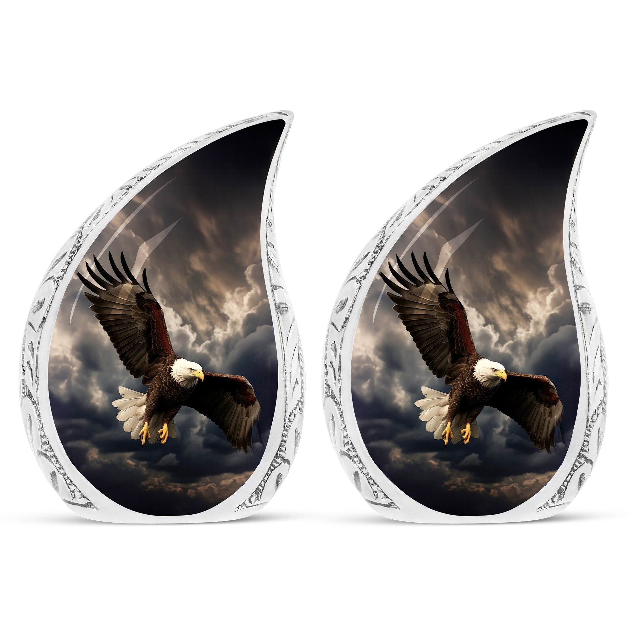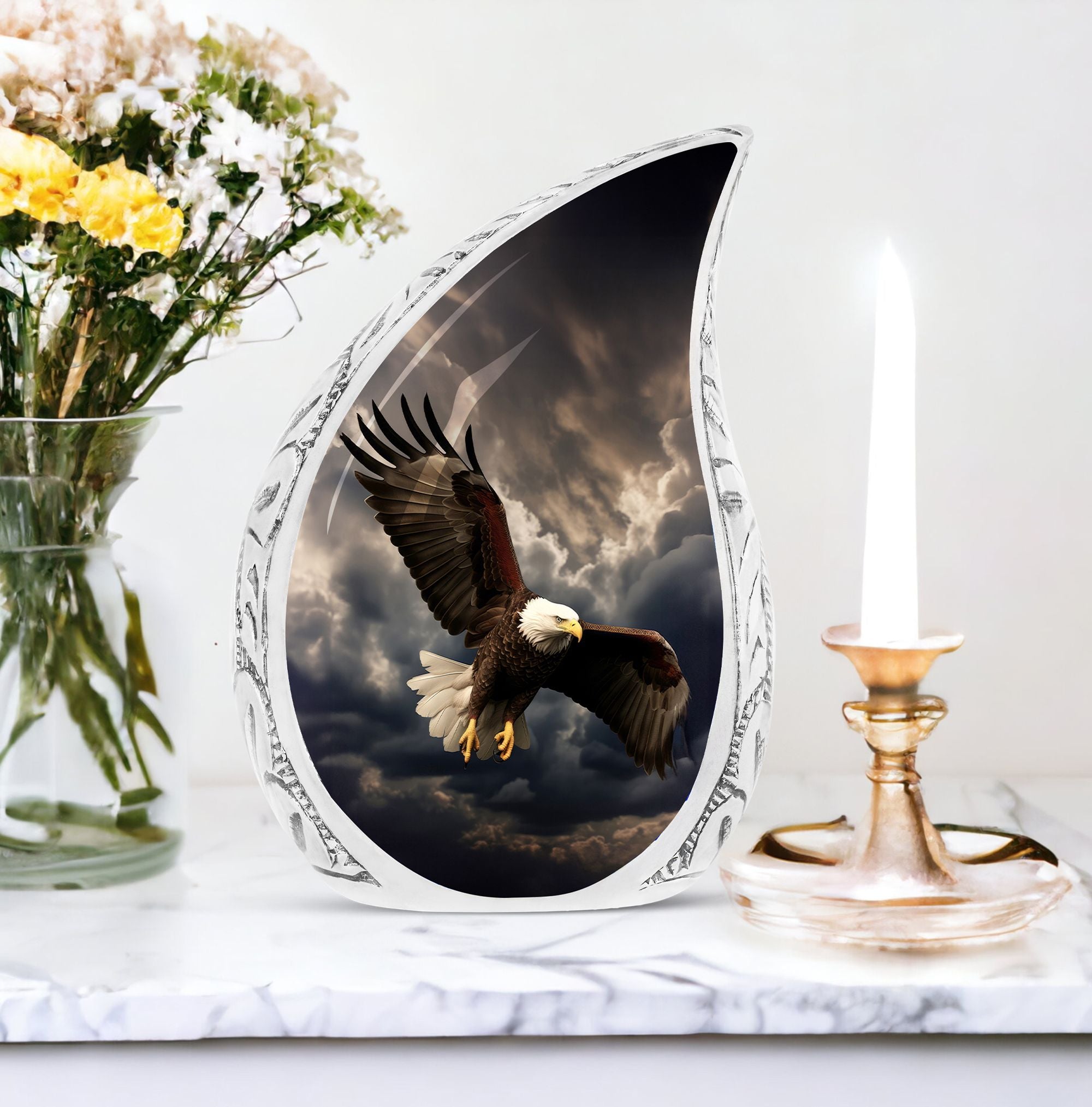 In life's most challenging times, cherish your loved ones' memories with our Eagle Urns for Human Ashes. These large urns aren't just a product but a 'feel sorry for your loss' statement designed for those seeking solace and peace. These memorial urns, standing at 10 inches high, boast ample capacity to hold up to 200 cubic inches of human cremation ashes. The Classic Urn is fashioned from high-quality, durable aluminium, which assures you of its integrity over time. Its weight of 3.3 pounds underlines the robustness of the construction. Each urn is finished to be pleasing to the touch, evoking calm with every caress. Our package extends beyond the urn; it includes a thoughtful velvet pouch for the containment of ashes, offering an added layer of respect to your beloved. Additionally, we provide an option to personalize your urn with engraved names, helping to make them that bit more special and unique. Note that its compact size of 3 inches makes it harmoniously blended into your home decor without causing disruption. These decorative urns bridge the gap between beauty and symbolic memory, creating a lasting impression. ['Eagle Urns for Human Ashes', 'Large Urns for Human Ashes', 'Human Cremation Urns', 'Decorative Urns', 'Human Cremation Ashes']