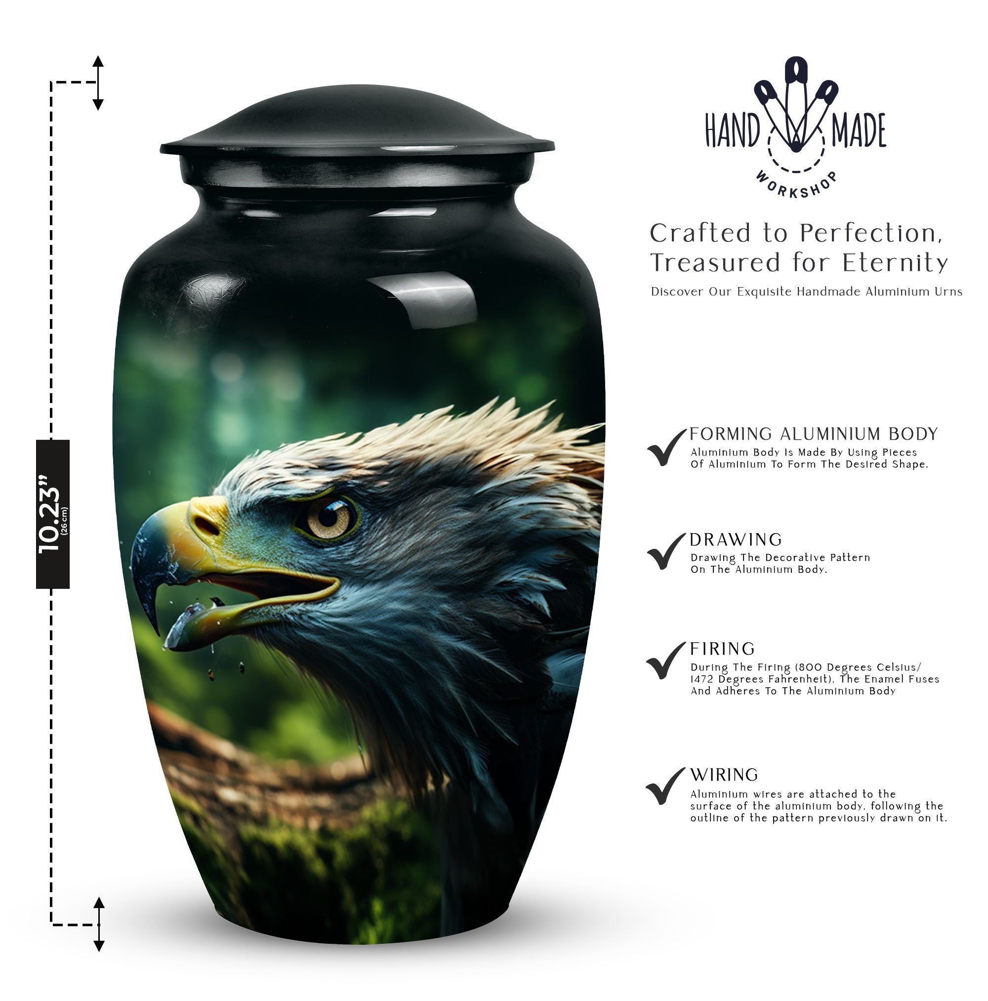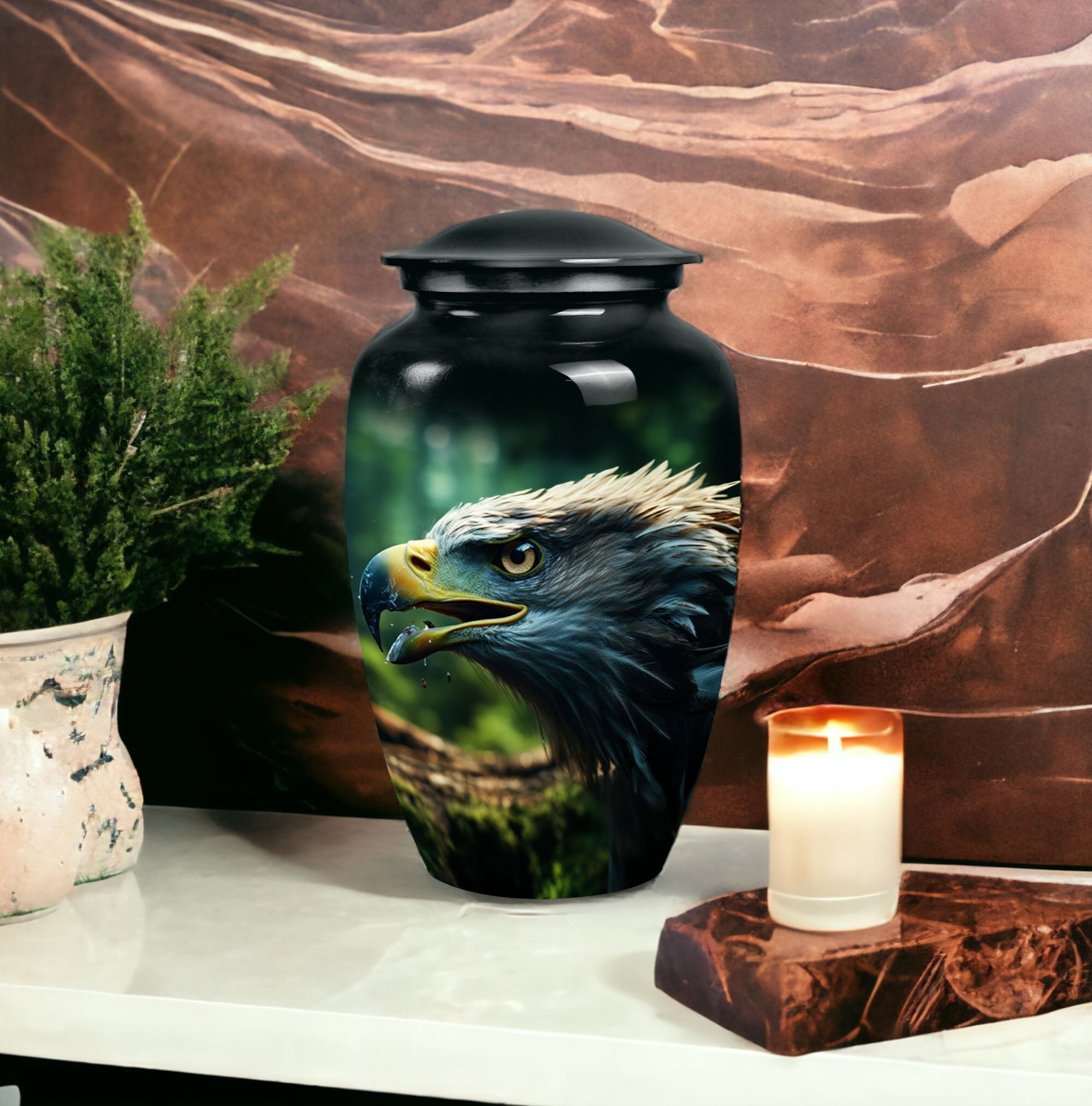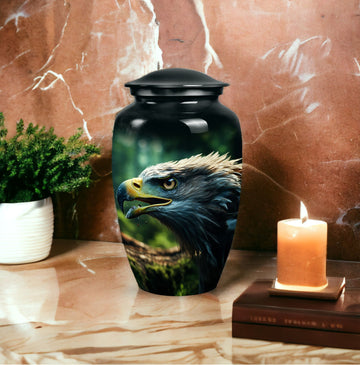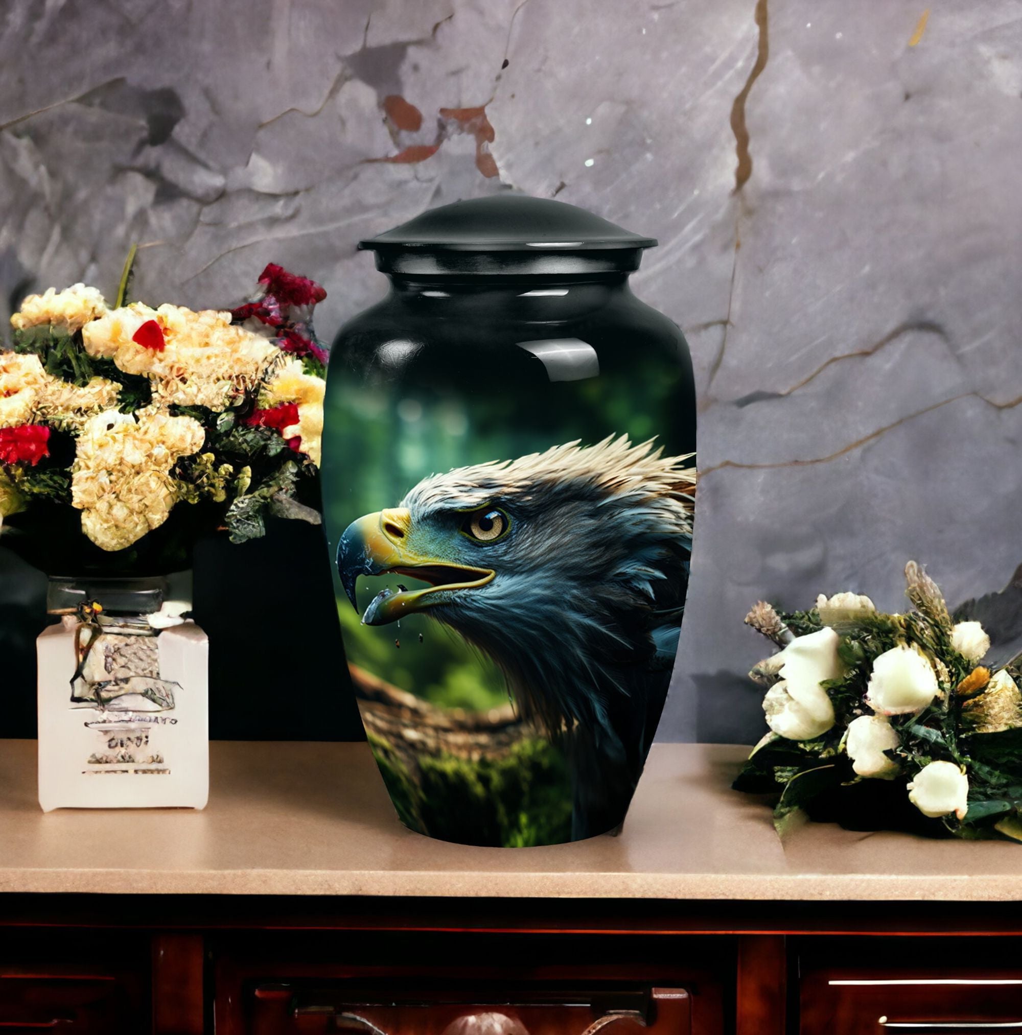 The Eagle Memorial Urn is a unique and heartfelt way to cherish the memory of your loved ones. This large urn, crafted from premium aluminium, is not only enduring but also an elegant memorial piece. With a height of 10 inches and a weight of 3.3 pounds, this cremation urn can securely hold up to 200 cubic inches of ashes. The urn comes with a velvet pouch to respectfully contain the ashes. At a convenient size of 3 inches, it serves as a distinctive piece of decor that speaks to your sentimentality. One of the unique features of this urn is that it can be personalized with engraved names, adding a touch of intimacy and uniqueness to your memorial gift. This Eagle Memorial Urn does more than simply hold ashes; it serves as a cherished keepsake, honouring and remembering the life you've shared with your loved ones.