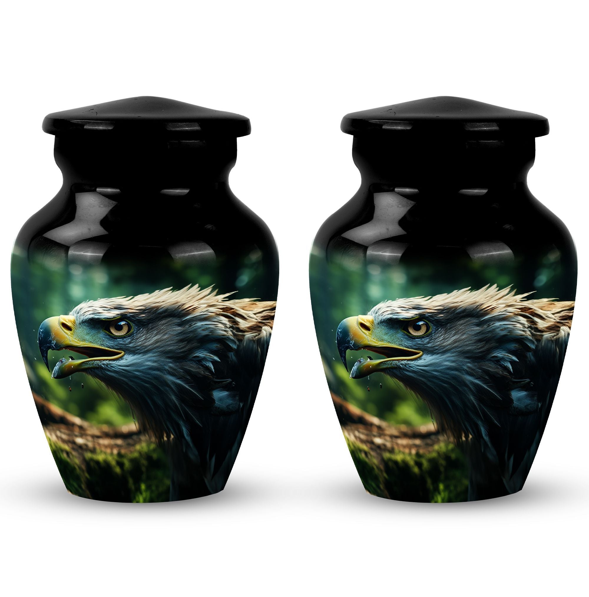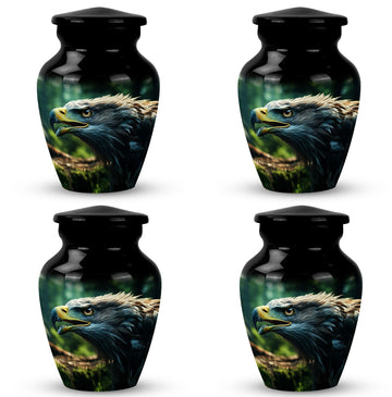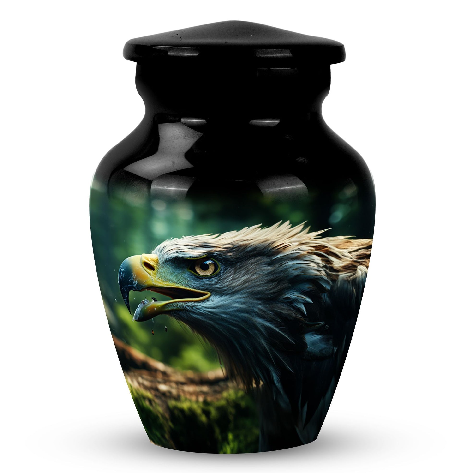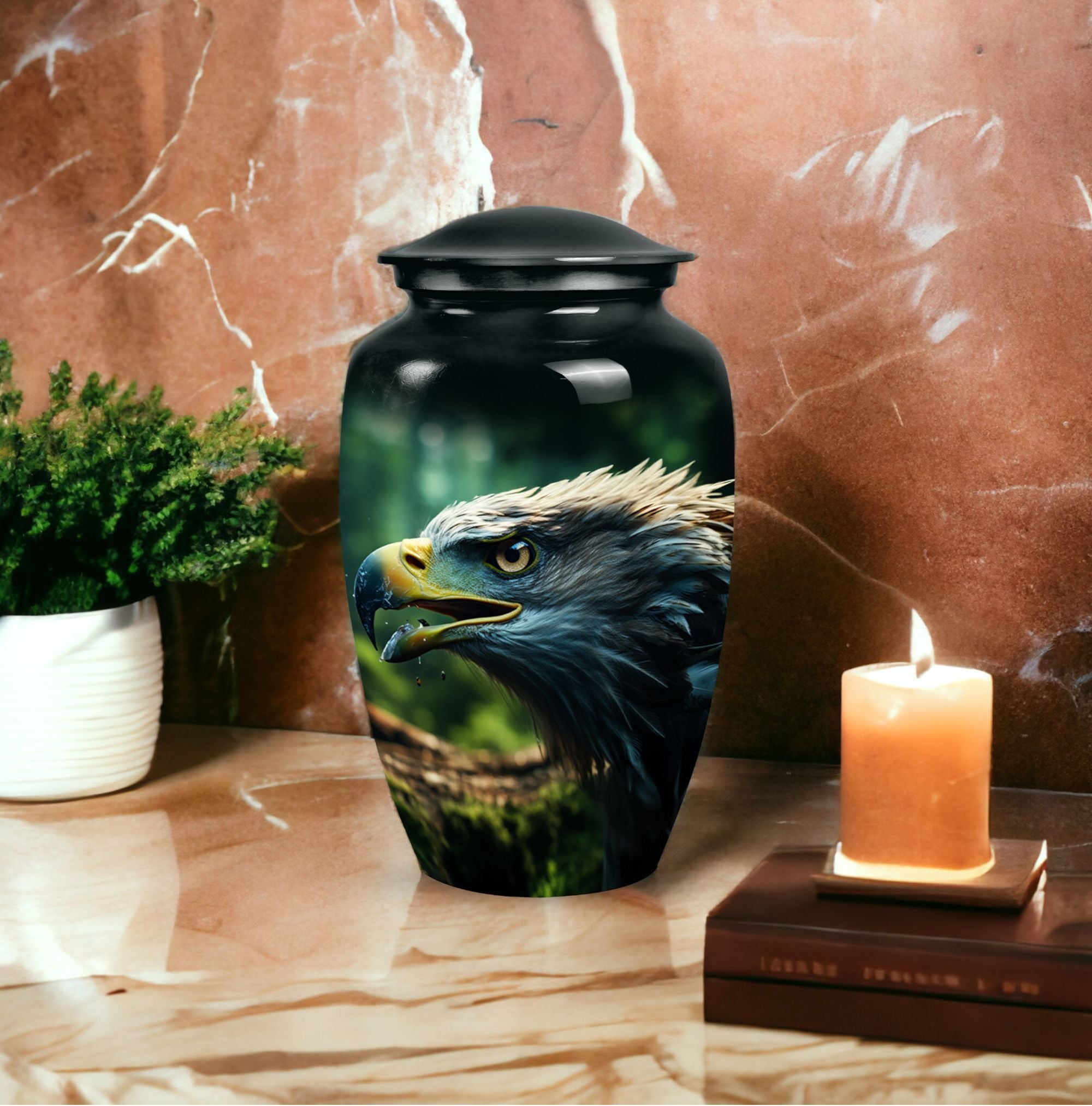 The Eagle Memorial Urn is a unique and heartfelt way to cherish the memory of your loved ones. This large urn, crafted from premium aluminium, is not only enduring but also an elegant memorial piece. With a height of 10 inches and a weight of 3.3 pounds, this cremation urn can securely hold up to 200 cubic inches of ashes. The urn comes with a velvet pouch to respectfully contain the ashes. At a convenient size of 3 inches, it serves as a distinctive piece of decor that speaks to your sentimentality. One of the unique features of this urn is that it can be personalized with engraved names, adding a touch of intimacy and uniqueness to your memorial gift. This Eagle Memorial Urn does more than simply hold ashes; it serves as a cherished keepsake, honouring and remembering the life you've shared with your loved ones.