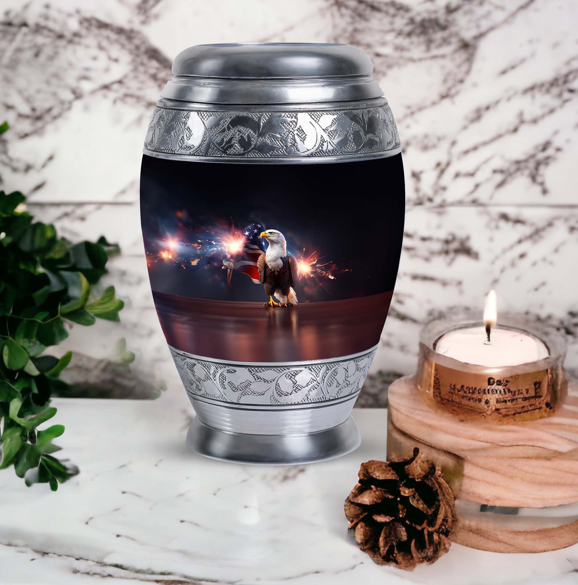 This premium cremation vessel features a stunning eagle motif, symbolizing strength and everlasting freedom. Expertly crafted from high-quality aluminum, it reflects exceptional durability and craftsmanship. Ideal as an urn keepsake human ashes piece or an urn with keepsake combo, it offers both functionality and elegance. Its smooth finish, secure closure, and timeless artistry make it a dignified choice for families seeking keepsake urns for human ashes adult with both beauty and purpose.