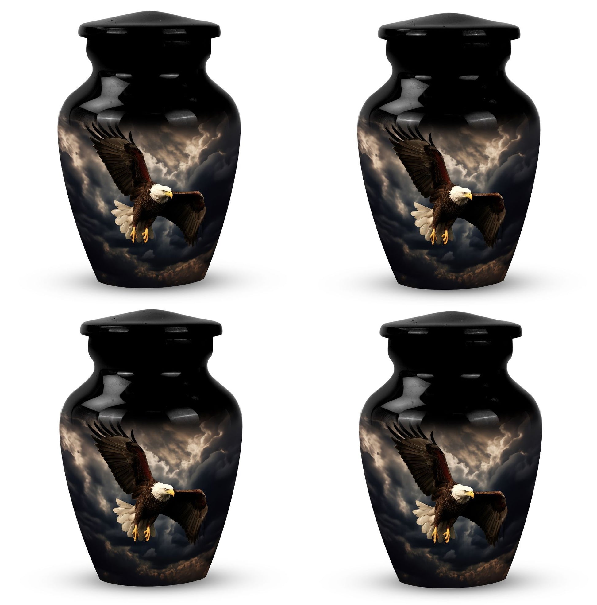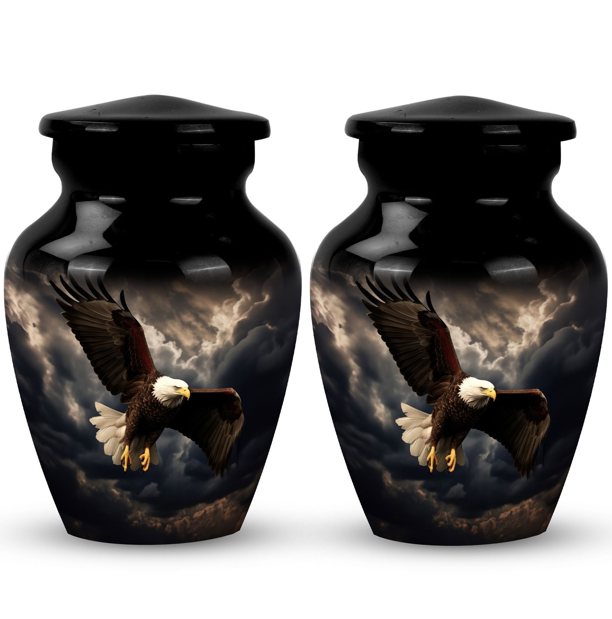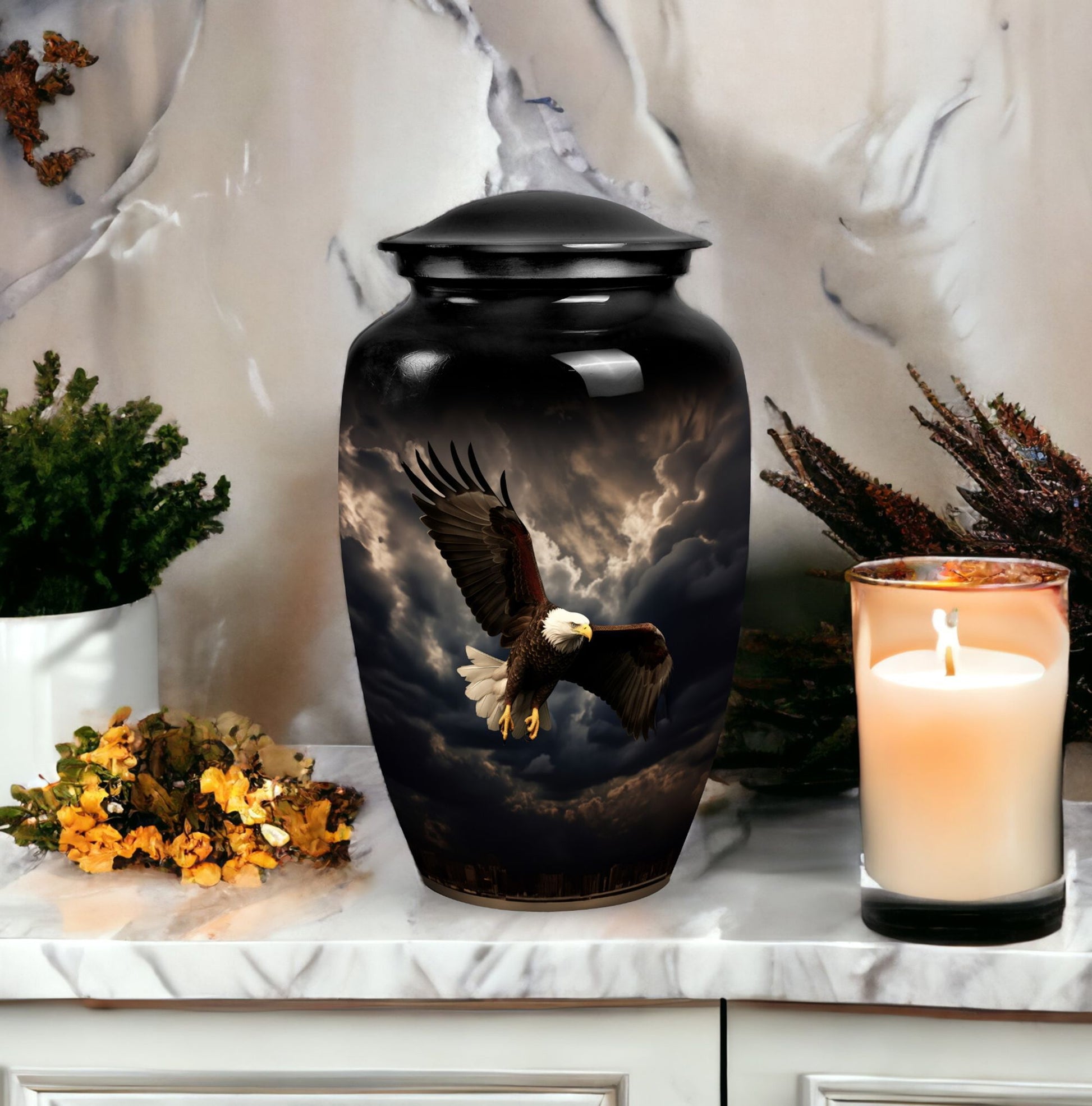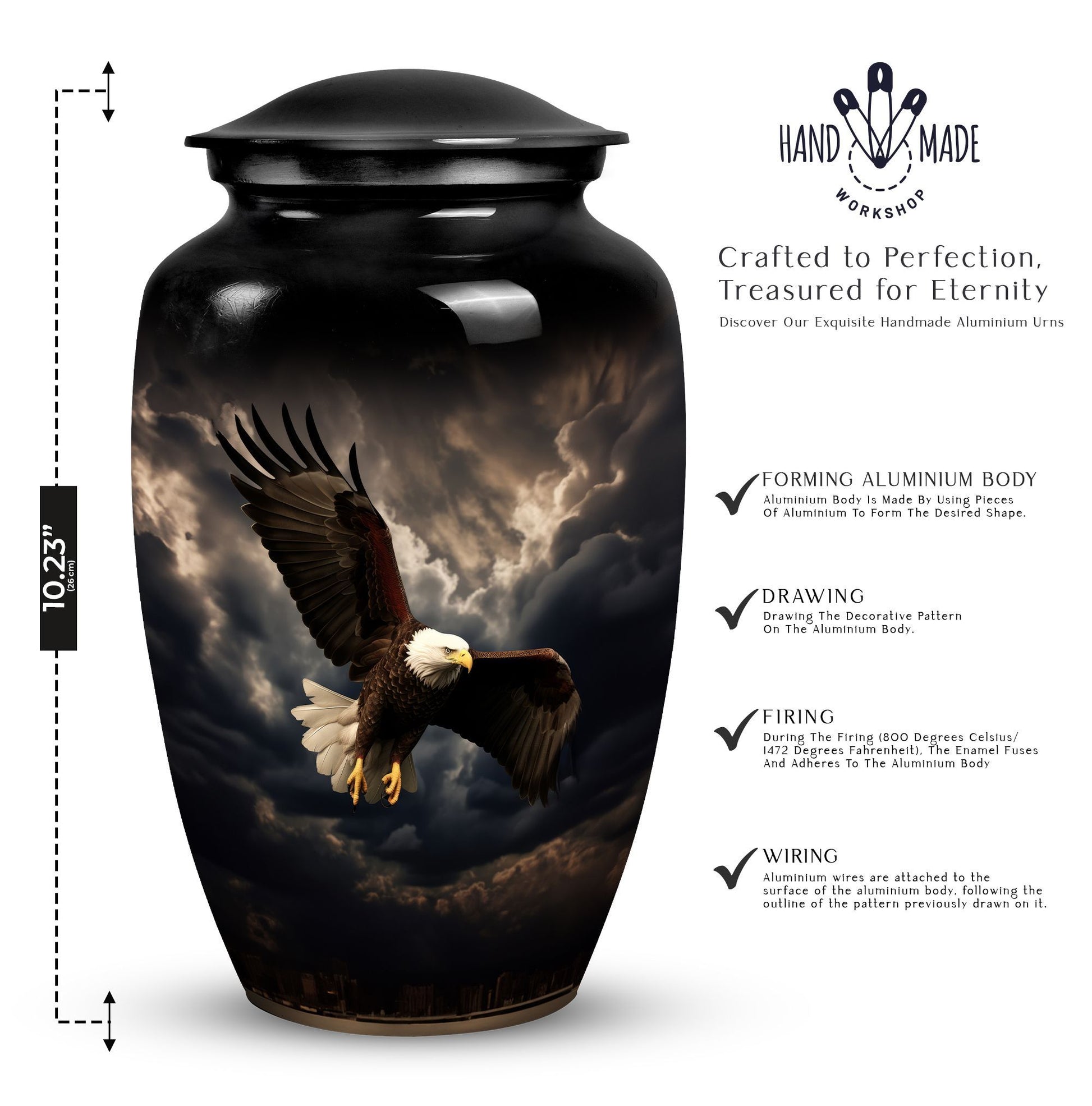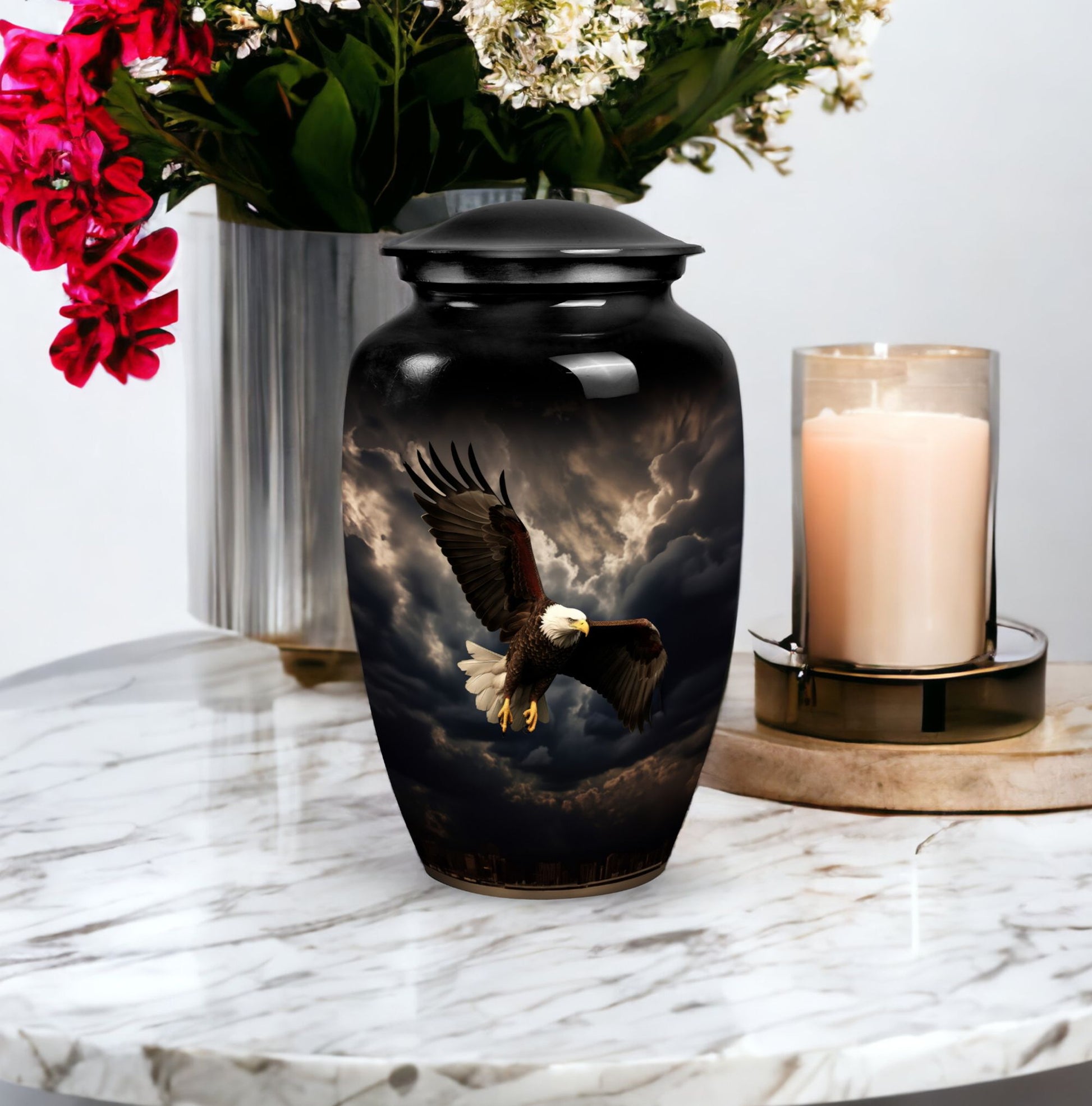 This elegant Eagle Urn for Human Ashes is a respectful testament of your heartfelt 'sorry for your loss' sentiment. This Large Urn is meticulously crafted from high-quality Aluminium, providing an endearing final home for your loved ones. Its generous 200 cubic inches capacity and 10 inches height comfortably accommodate the ashes while maintaining a modest footprint. Weighing at 3.3 pounds, the urn is substantial but not weighty. The inclusion of a velvet pouch offers a dignified containment for the ashes. The urn permits personalization with engraved names, augmenting its significance for memorial purposes. As an added feature, this memorial urn is a three-inch size, catering to varied preferences. Its classic urn design eschews ostentation while displaying respect for the deceased. Even as your pain remains private, this urn quietly symbolizes your love. Ideal for Human Cremation Ashes, this decorative urn blends seamlessly in any ceremonial setting.