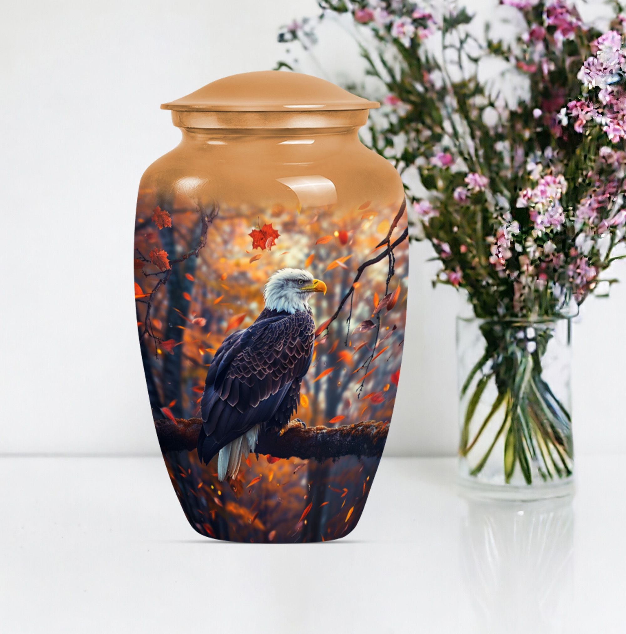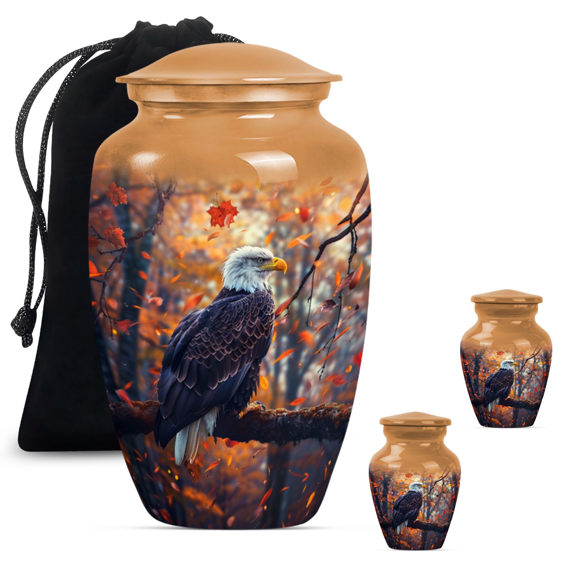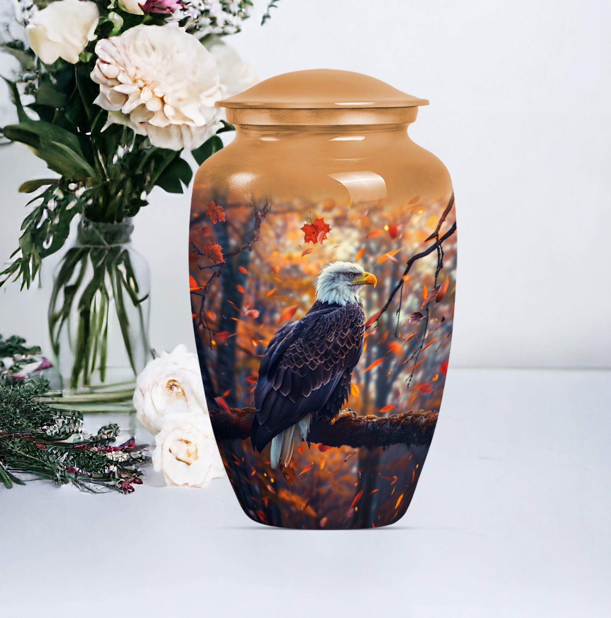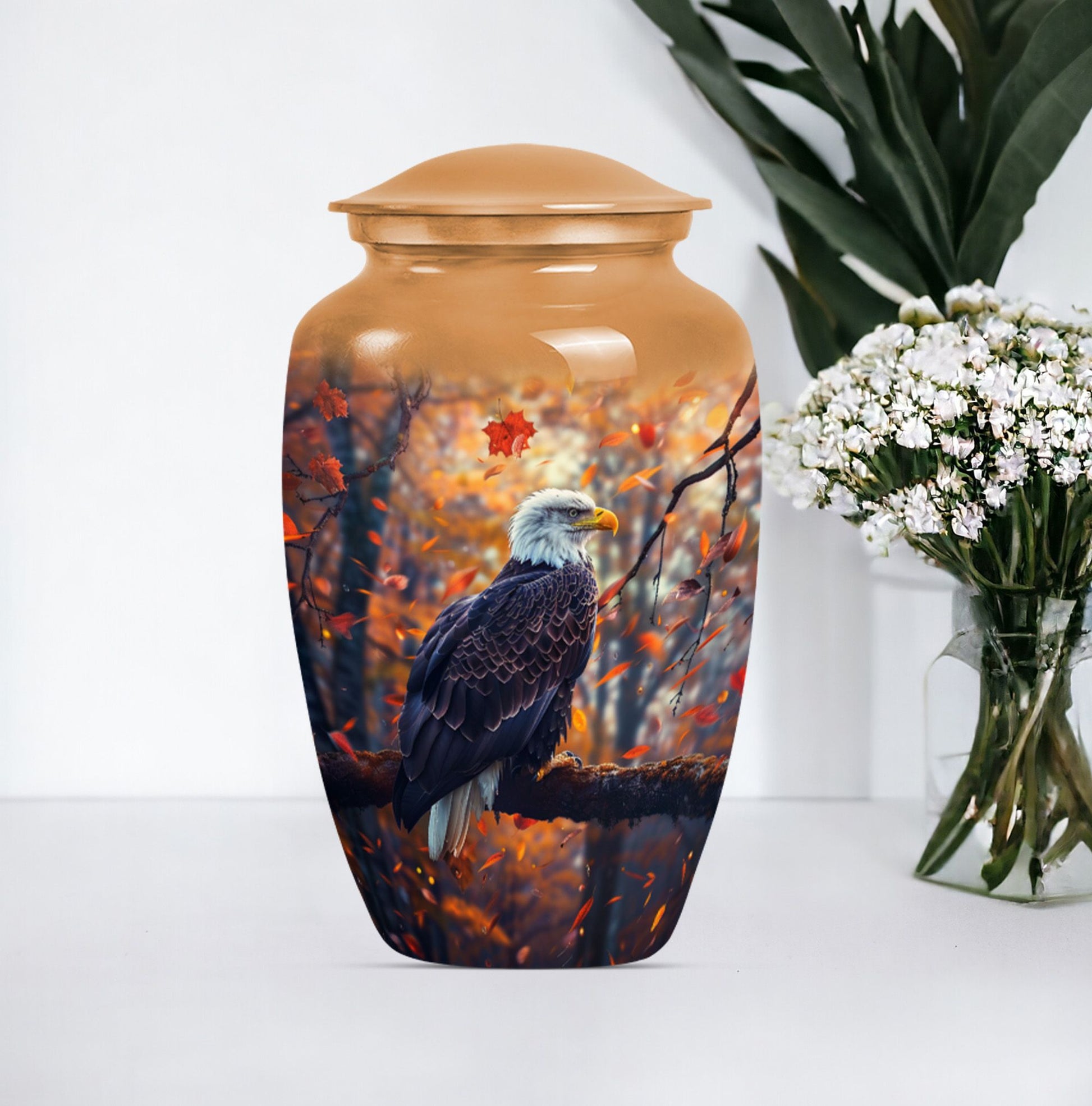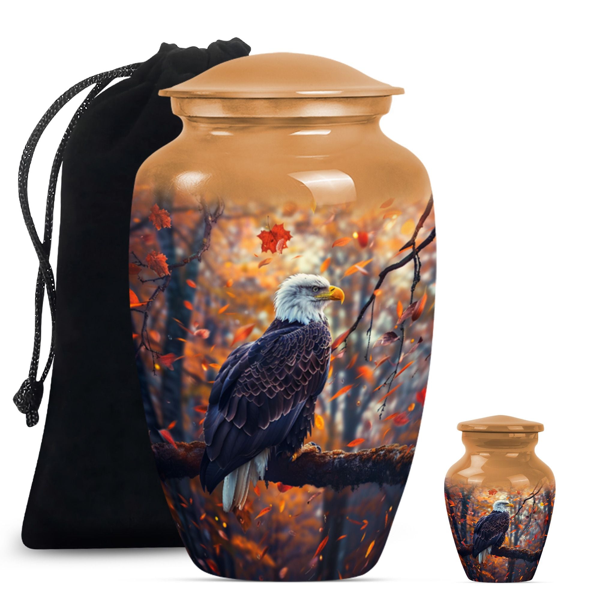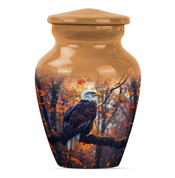 Presenting our EAGLE urn, an exquisite choice for memorializing your loved ones. Within the funeral large urns category, this aluminium urn is a fitting tribute for both adult males and females, ensuring their memory lasts steadfastly. The urn measures 10 inches in height, weighing a modest 3.3 pounds, and is capacious enough to hold up to 200 cubic inches of ashes. Every EAGLE urn is accompanied by a velvet pouch, delicately preserving the precious contents inside. Furthermore, to celebrate the uniqueness of the dearly departed, each urn can be personalized with engraved names. The unit is crowned with a compelling 'Wolf Howling' theme that is likely to evoke silent contemplation. So, for those searching for cremation urns or cremation companion urns, our EAGLE urn stands as a formidable option. Its classic urn design and enhanced features make it a standout in the ceremonial supplies category. Please note: This urn is of large type, thereby ideally suited for adult ashes.