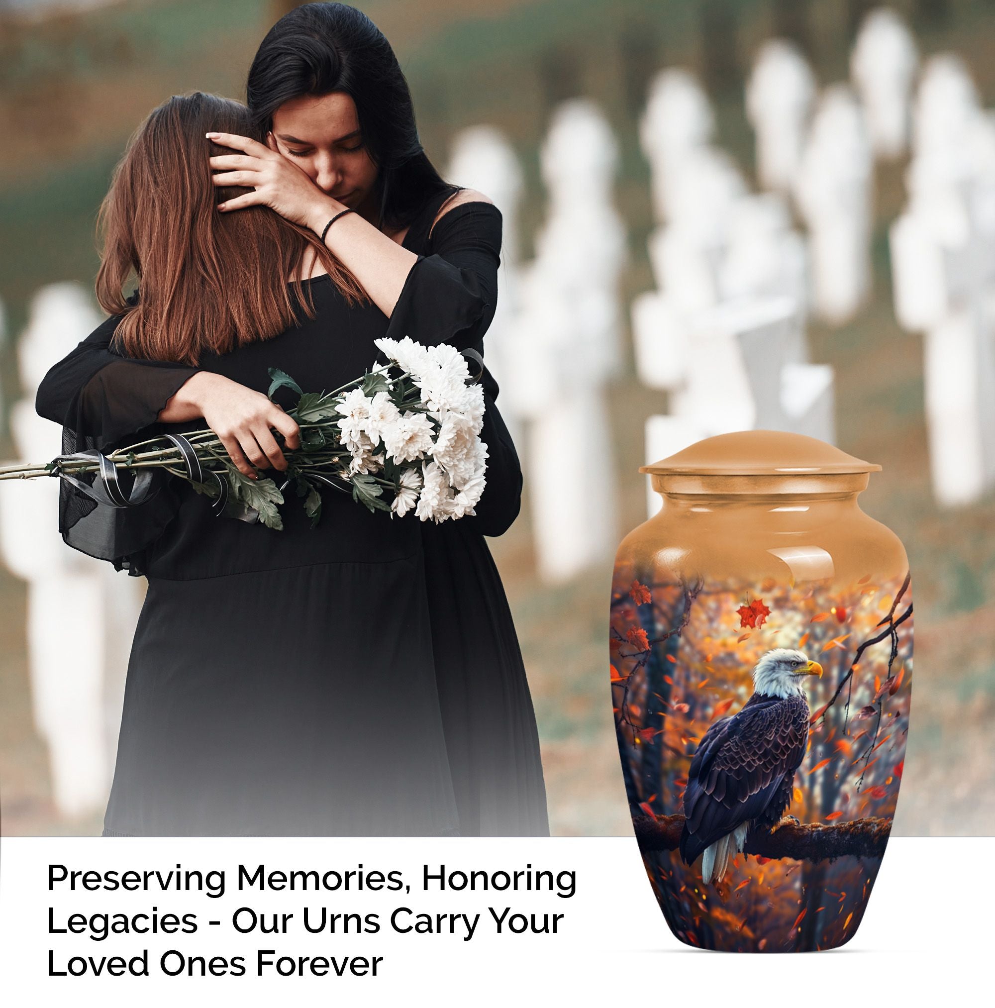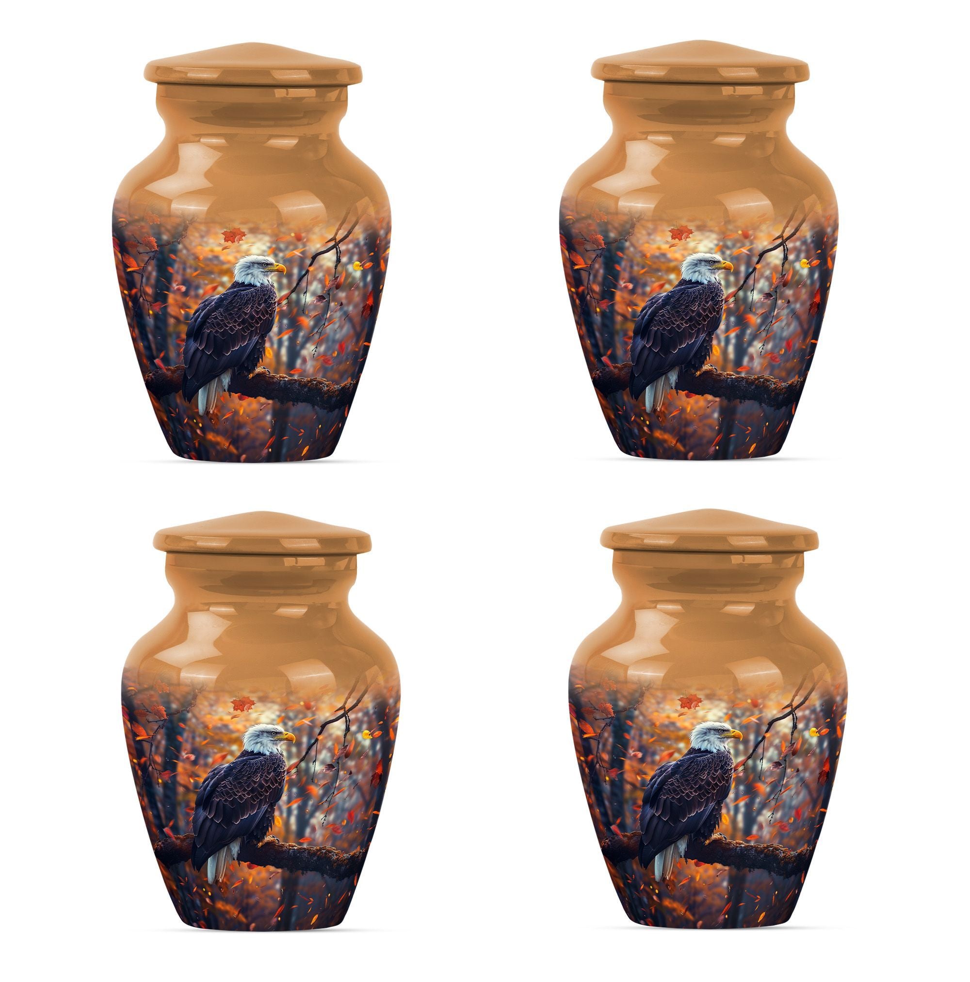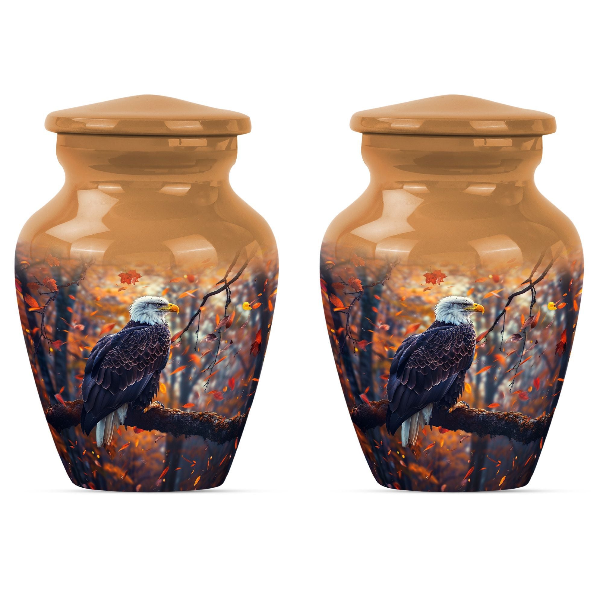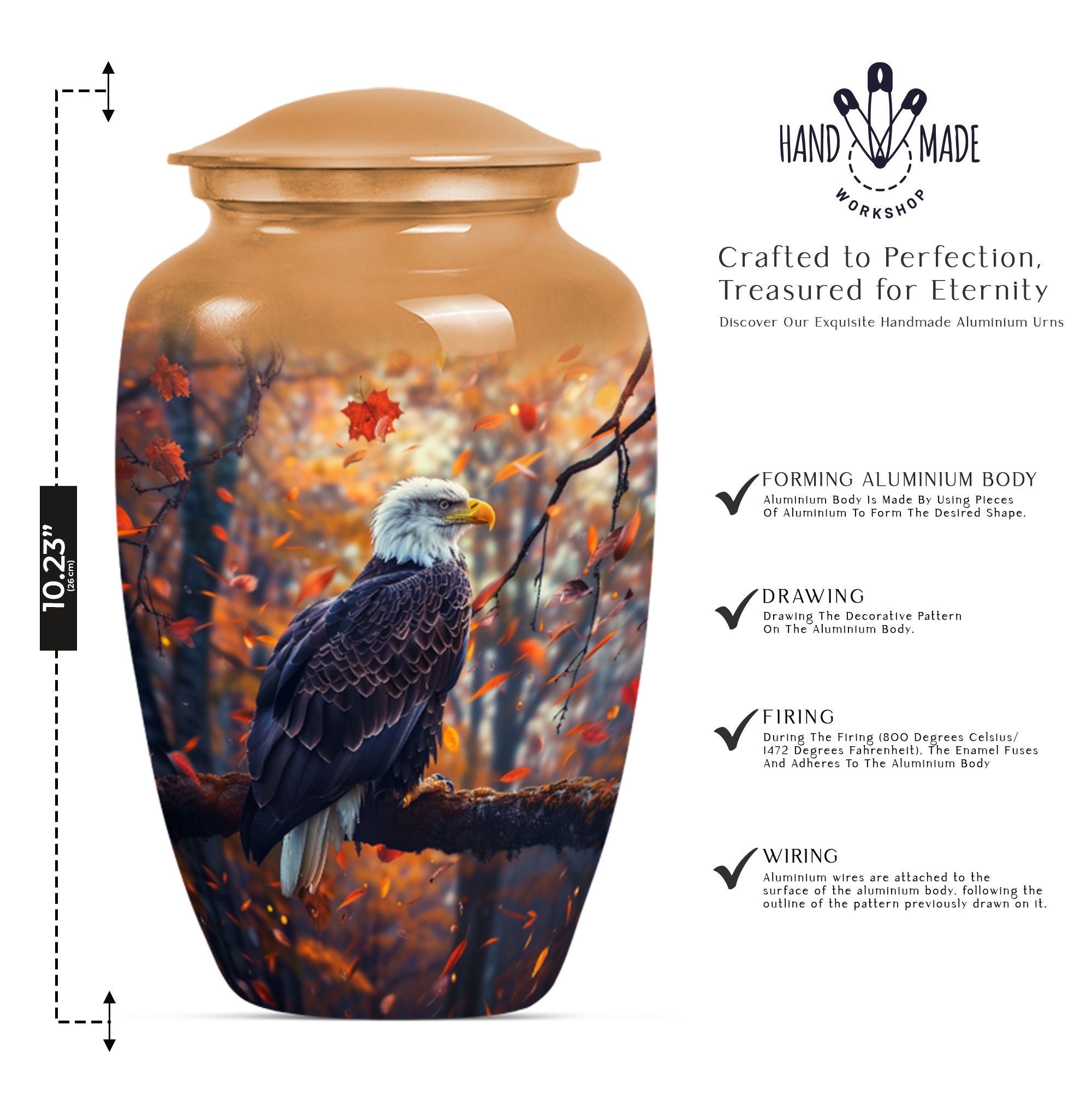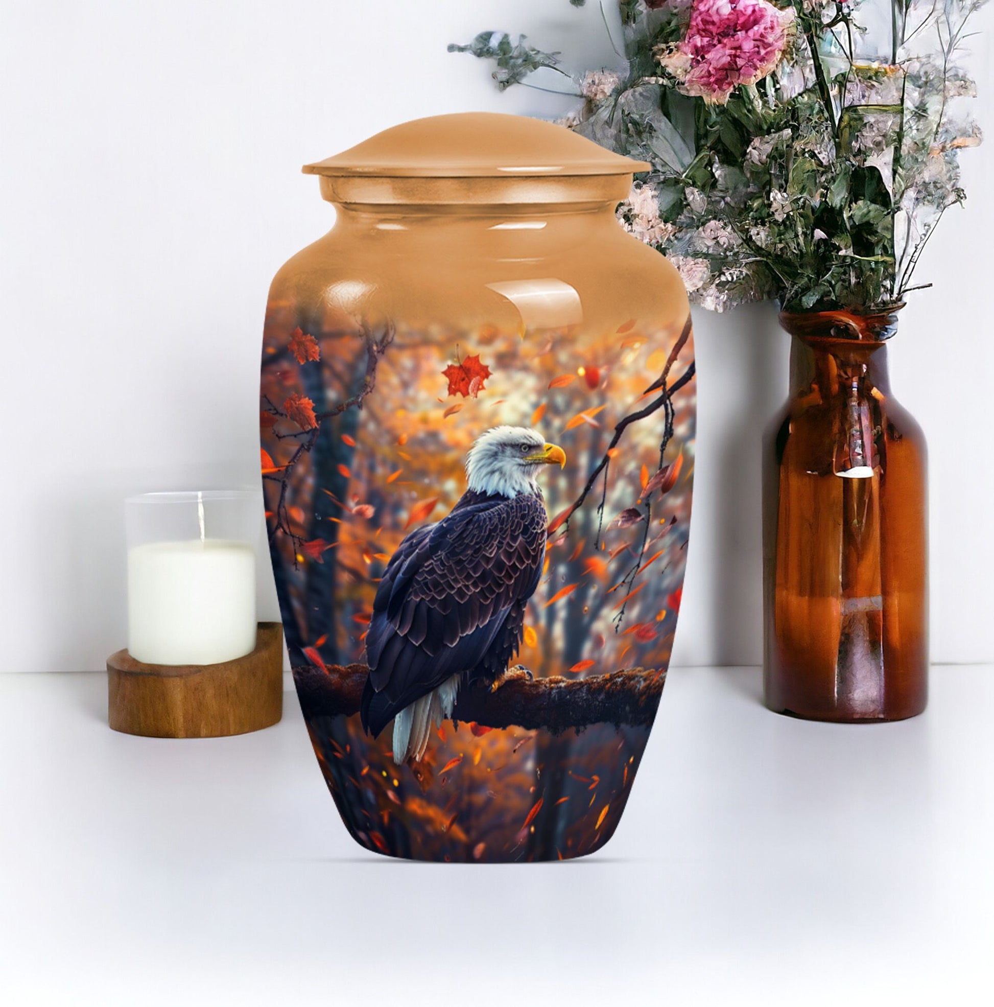Presenting our EAGLE urn, an exquisite choice for memorializing your loved ones. Within the funeral large urns category, this aluminium urn is a fitting tribute for both adult males and females, ensuring their memory lasts steadfastly. The urn measures 10 inches in height, weighing a modest 3.3 pounds, and is capacious enough to hold up to 200 cubic inches of ashes. Every EAGLE urn is accompanied by a velvet pouch, delicately preserving the precious contents inside. Furthermore, to celebrate the uniqueness of the dearly departed, each urn can be personalized with engraved names. The unit is crowned with a compelling 'Wolf Howling' theme that is likely to evoke silent contemplation. So, for those searching for cremation urns or cremation companion urns, our EAGLE urn stands as a formidable option. Its classic urn design and enhanced features make it a standout in the ceremonial supplies category. Please note: This urn is of large type, thereby ideally suited for adult ashes.
