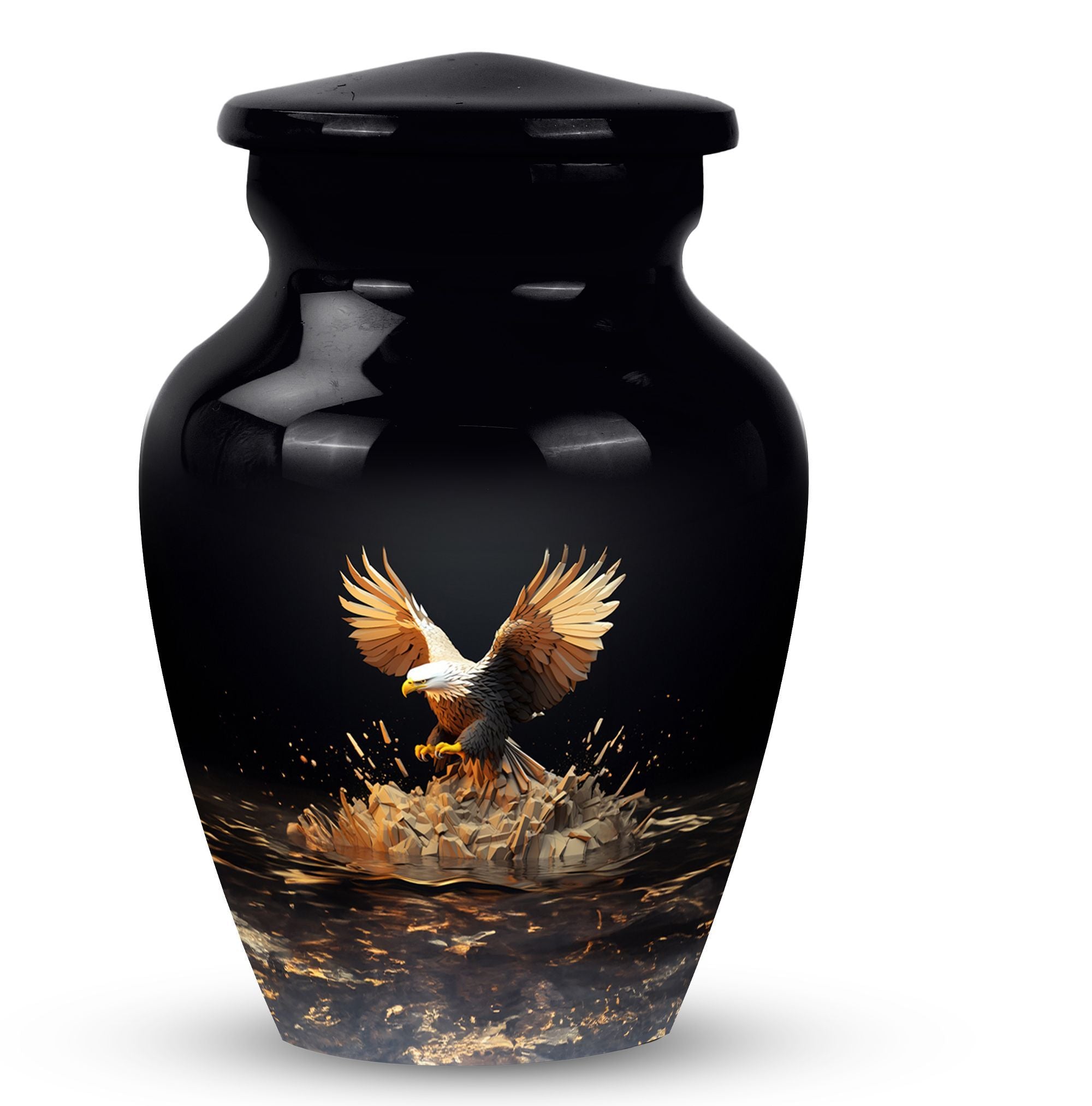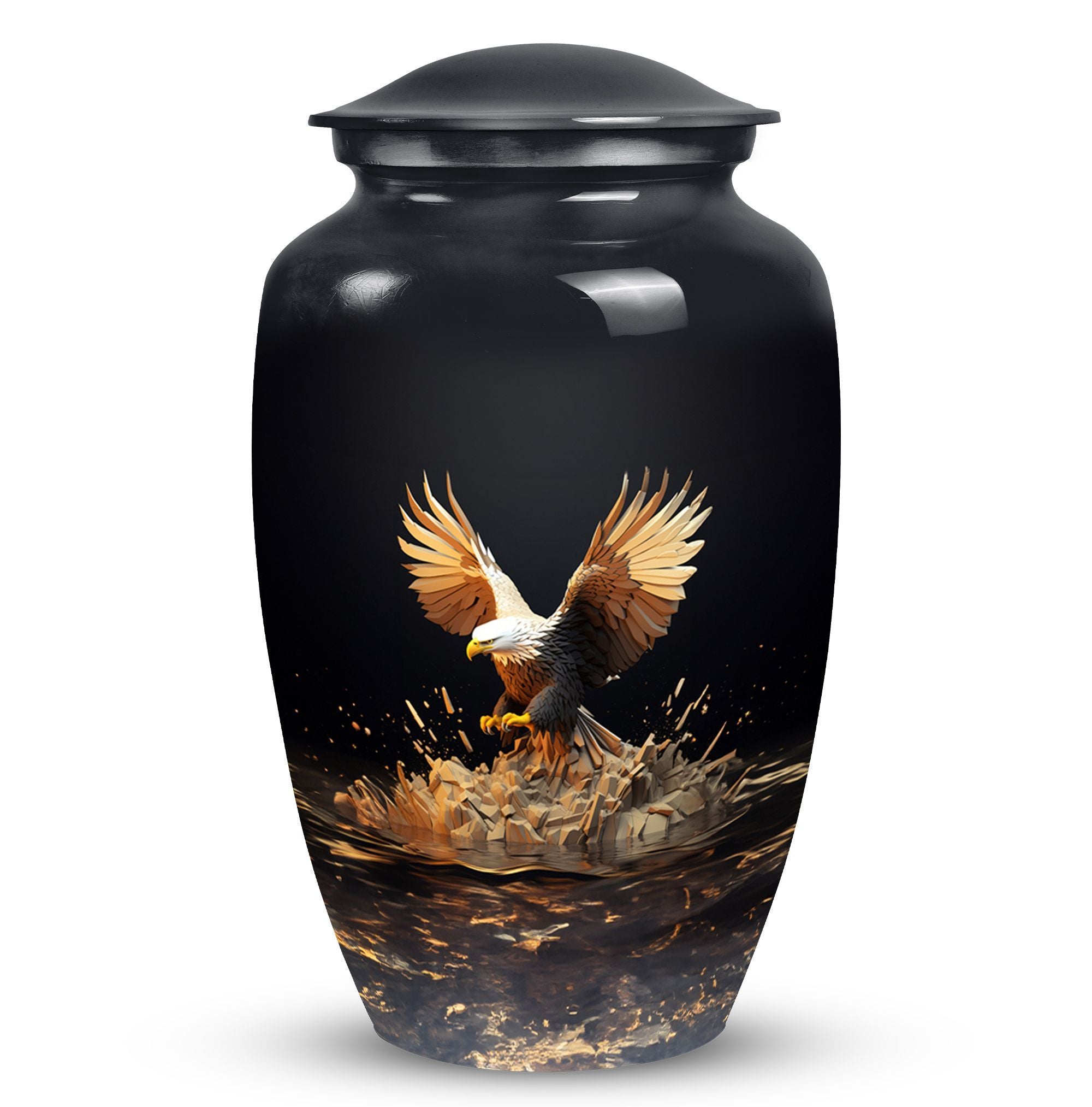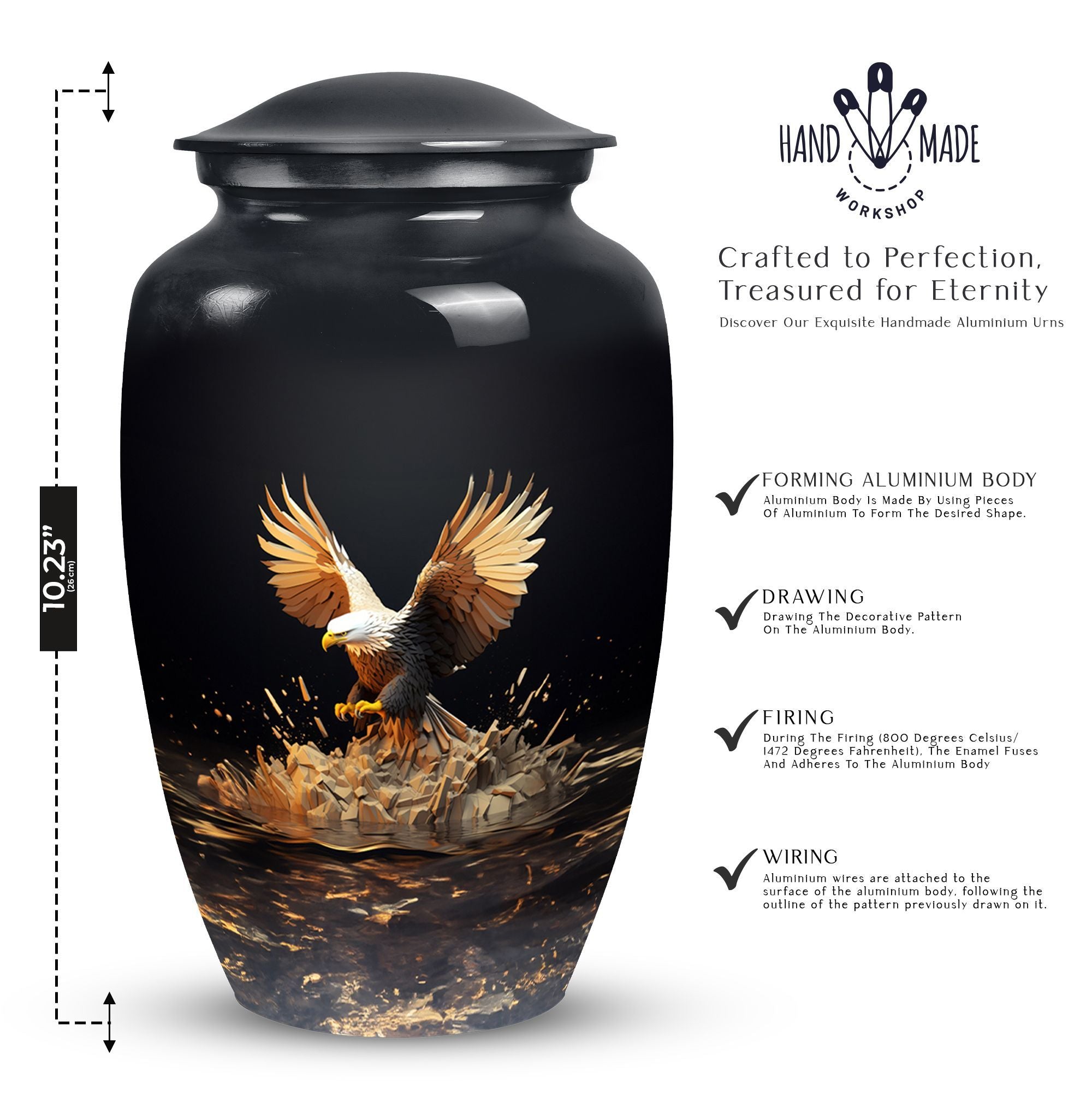 Express your sincere condolences with our tastefully designed Eagle Cremation Urn, a symbolic piece chosen with care for its classical design. Crafted from high-quality aluminium, this memorial urn boasts a substantial size of 10 inches in height and a capacity of 200 cubic inches. Weighing a solid 3.3 pounds, this large urn is more than equipped to hold and secure your cherished one's remains. With its extensive measurement of 3 inches, it offers space that reflects inclusivity and respect. The package is thoughtfully equipped with a velvet pouch, ensuring a dignified containment of ashes. Moreover, we highly regard your sentimental connection, offering the option to make this urn uniquely yours by personalizing it with engraved names. From 'Urns for Dad' to 'Cremation Urns for Burial', this product transcends traditional, narrating an enduring tale of love and remembrance. An ideal choice in the 'Decorative Urns for Human Ashes' category, this urn indeed stands out with its elegant fusion of tradition and modernity, providing a comforting presence during a difficult time.
