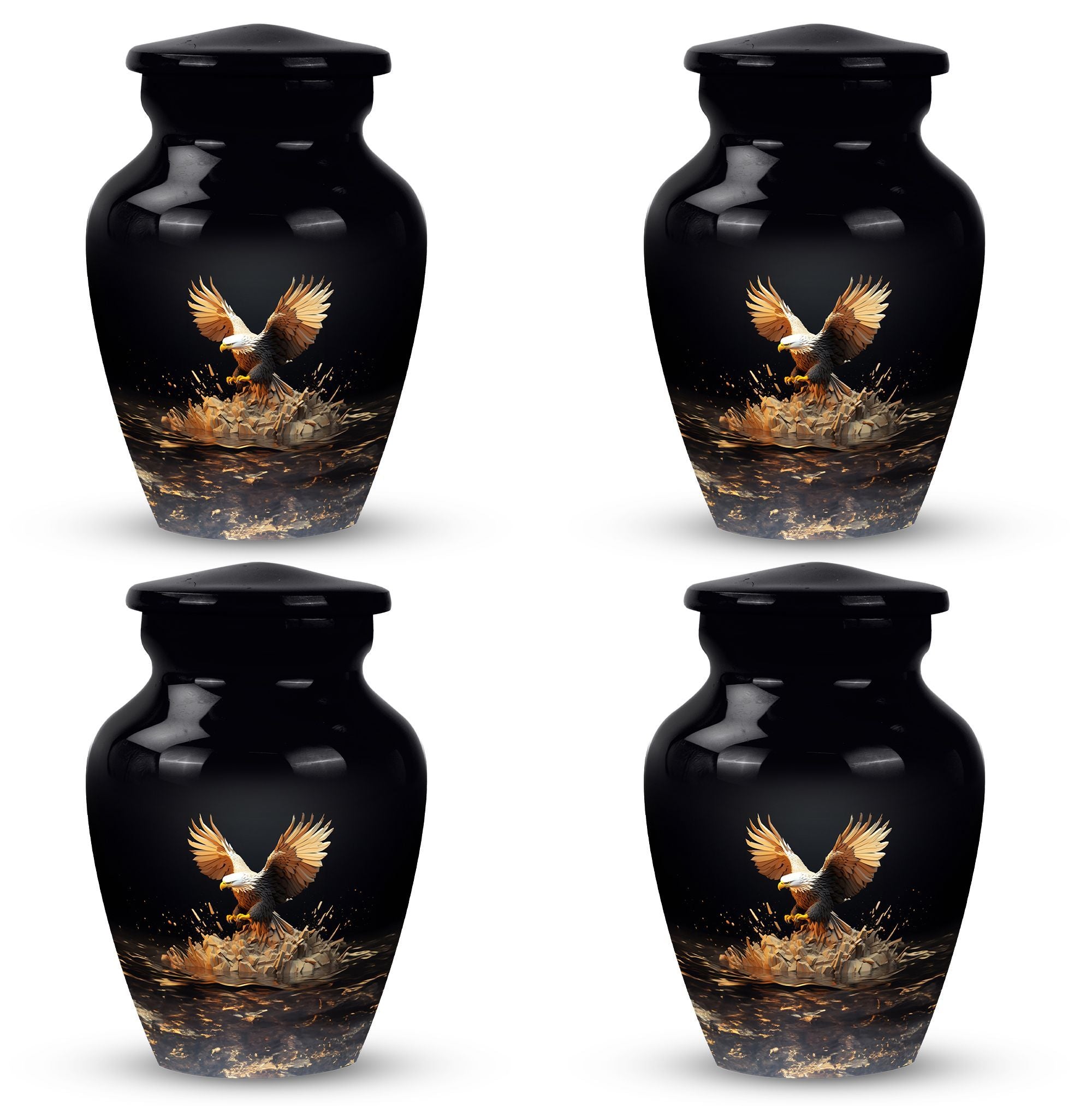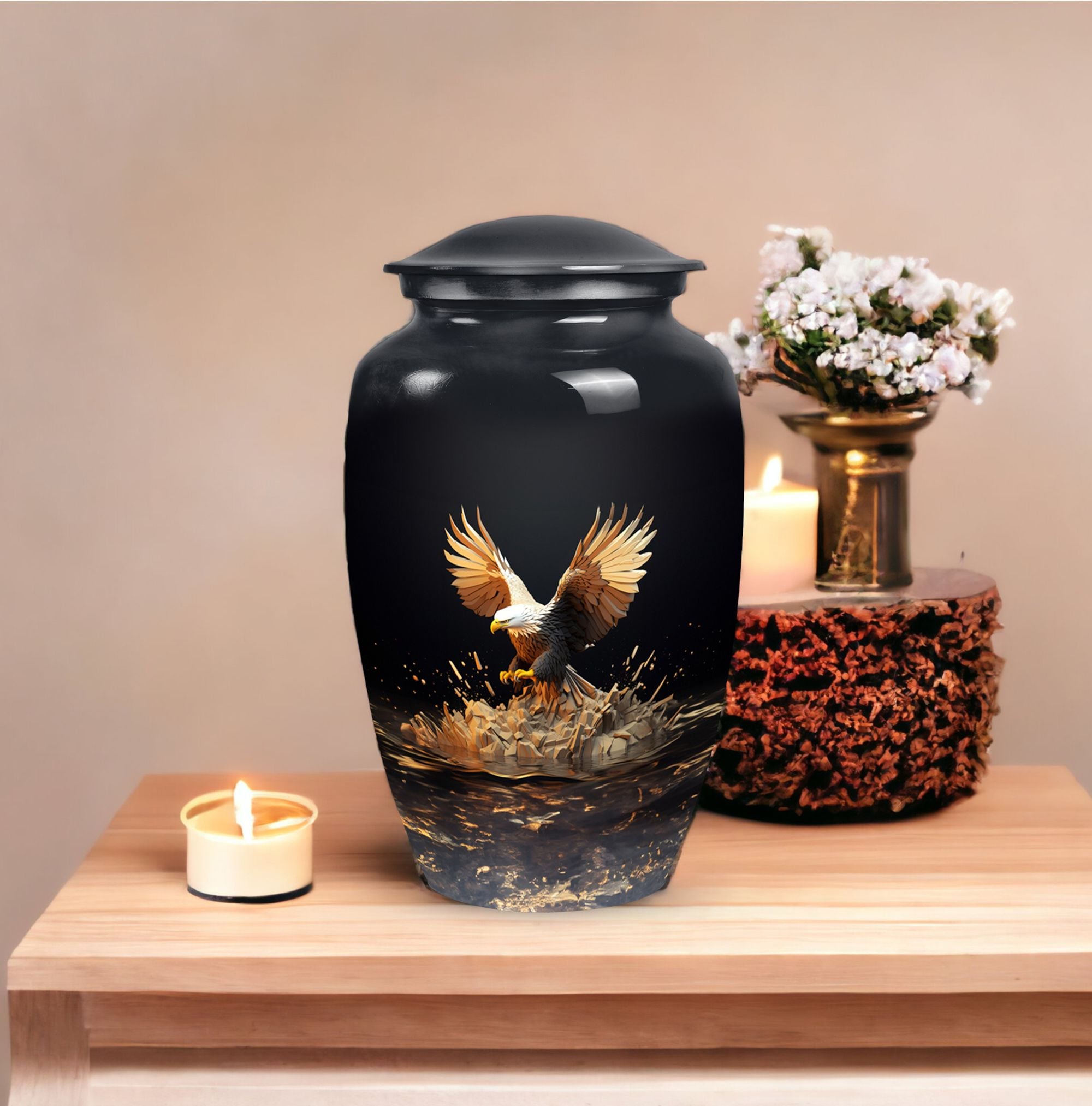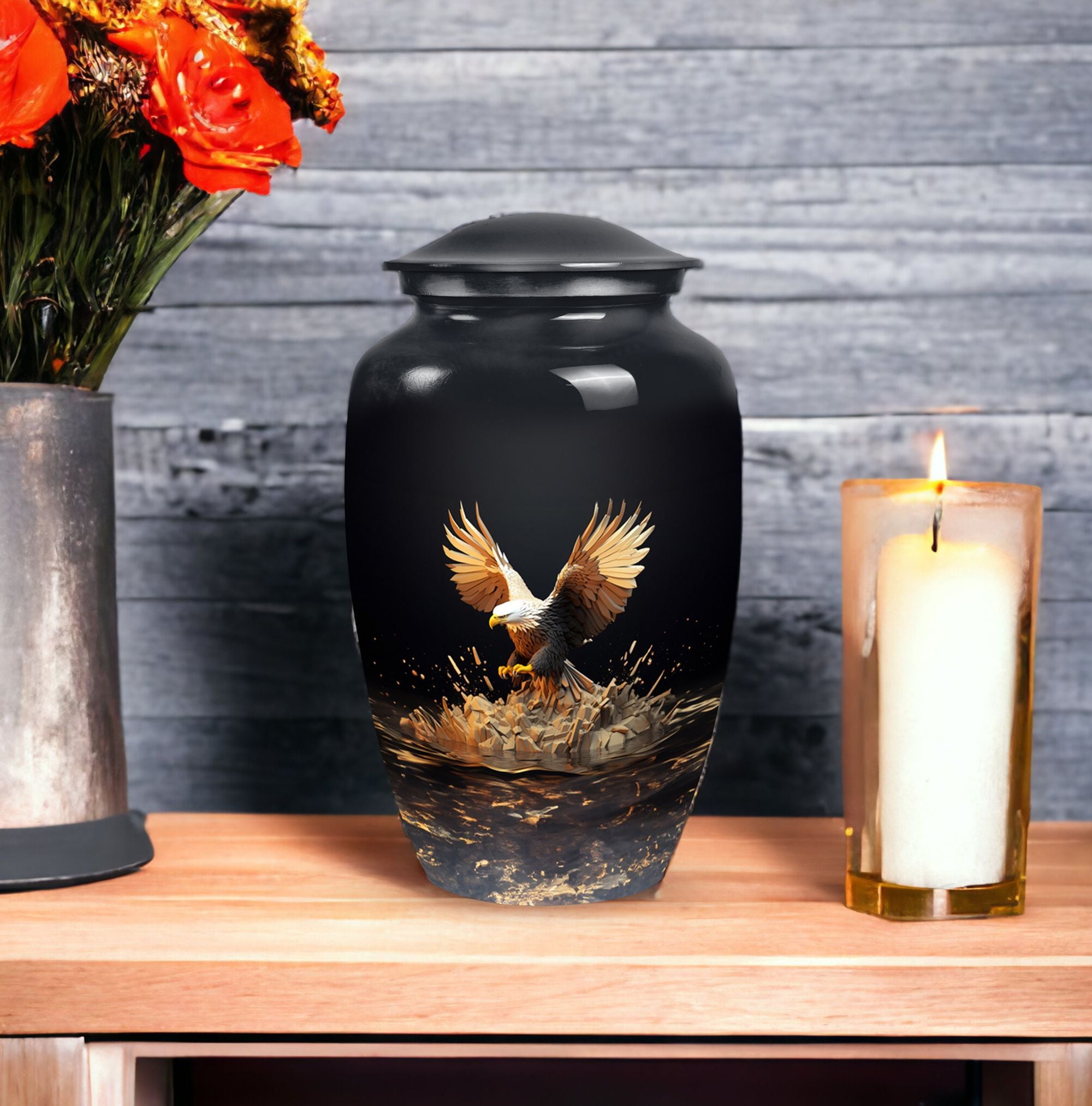 Express your sincere condolences with our tastefully designed Eagle Cremation Urn, a symbolic piece chosen with care for its classical design. Crafted from high-quality aluminium, this memorial urn boasts a substantial size of 10 inches in height and a capacity of 200 cubic inches. Weighing a solid 3.3 pounds, this large urn is more than equipped to hold and secure your cherished one's remains. With its extensive measurement of 3 inches, it offers space that reflects inclusivity and respect. The package is thoughtfully equipped with a velvet pouch, ensuring a dignified containment of ashes. Moreover, we highly regard your sentimental connection, offering the option to make this urn uniquely yours by personalizing it with engraved names. From 'Urns for Dad' to 'Cremation Urns for Burial', this product transcends traditional, narrating an enduring tale of love and remembrance. An ideal choice in the 'Decorative Urns for Human Ashes' category, this urn indeed stands out with its elegant fusion of tradition and modernity, providing a comforting presence during a difficult time.