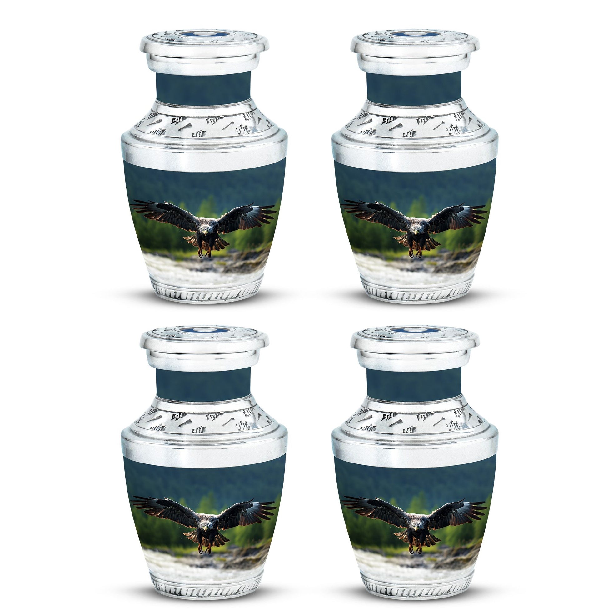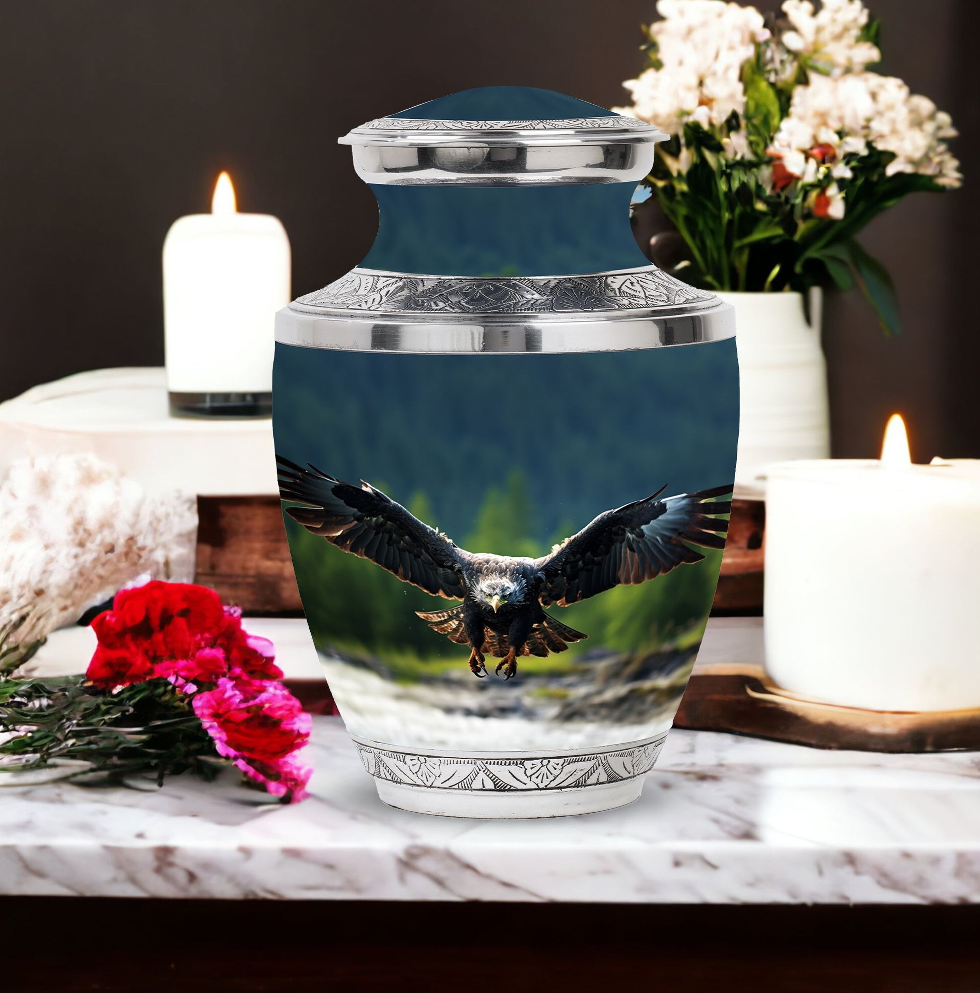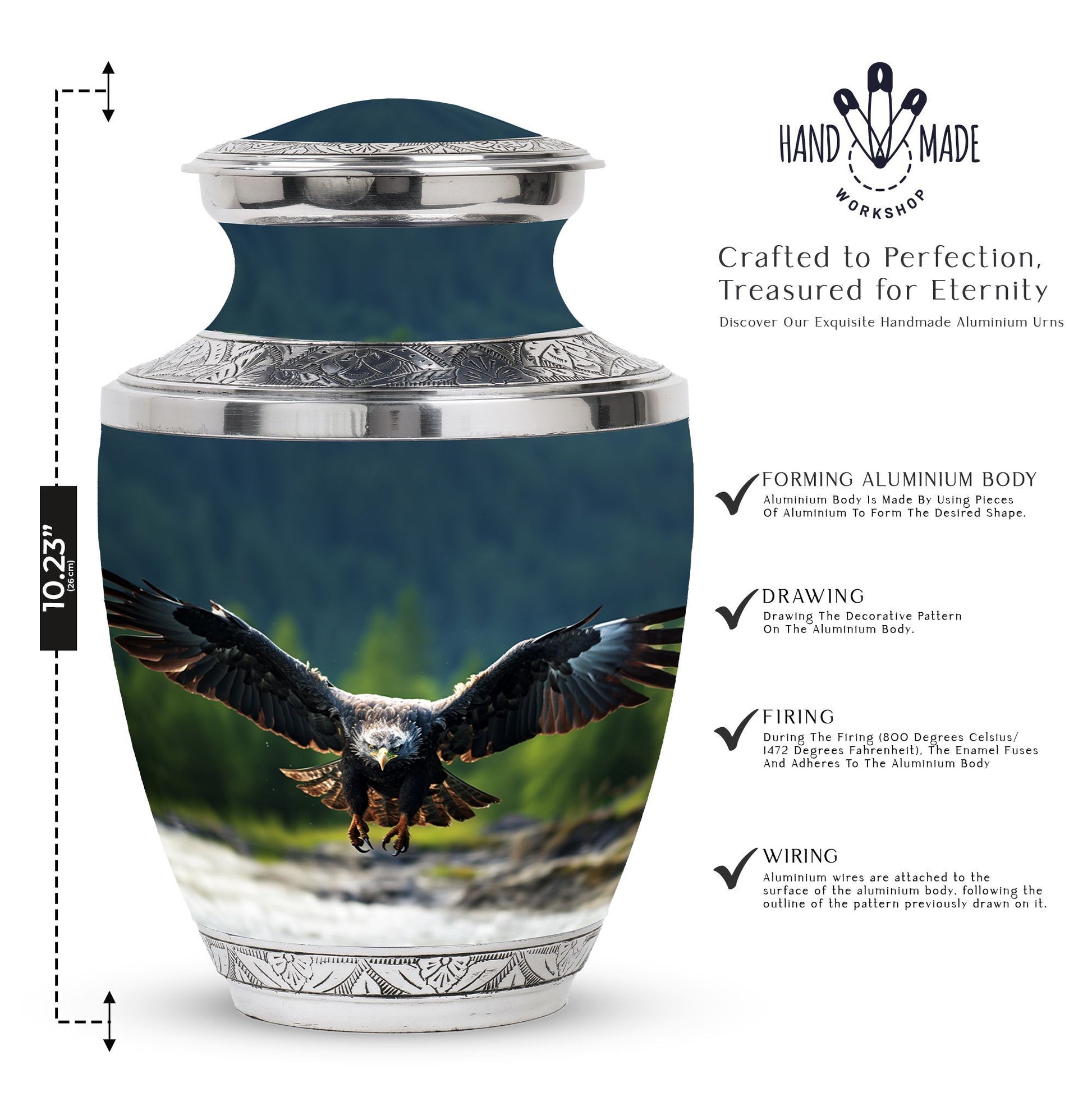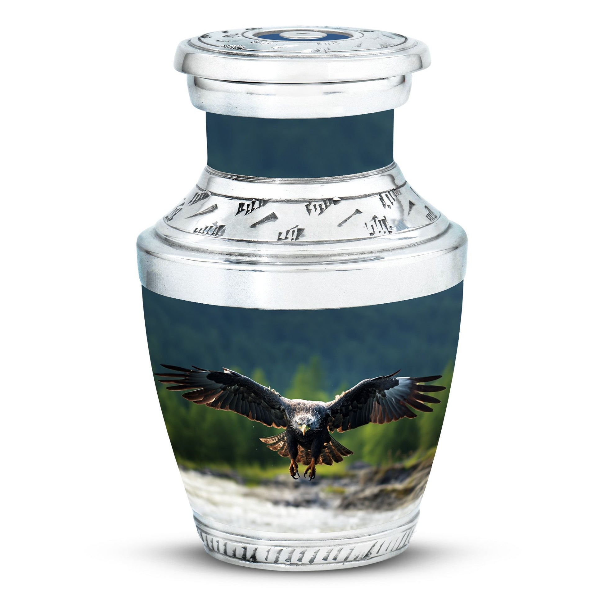 In eternal honor of your loved ones, their memory should be preserved with utmost respect and dignity. The heart-touching 'Eagle Urn for Ashes' is a large urn that stands as a magnificent tribute to your adored one. Crafted meticulously, it is robust in build, weighing 3.3 pounds due to its dense aluminum body. Its graceful design transcending 10 inches in height, with an internal capacity to preserve 200 cubic inches of ashes will surely resonate with reverent remembrance for your loved ones. A rare variant among small urns for ashes, this urn features eloquent personalization, allowing you to engrave names and express your venerable sentiment. Each order also includes a plush velvet pouch for the safe containment of the ashes.