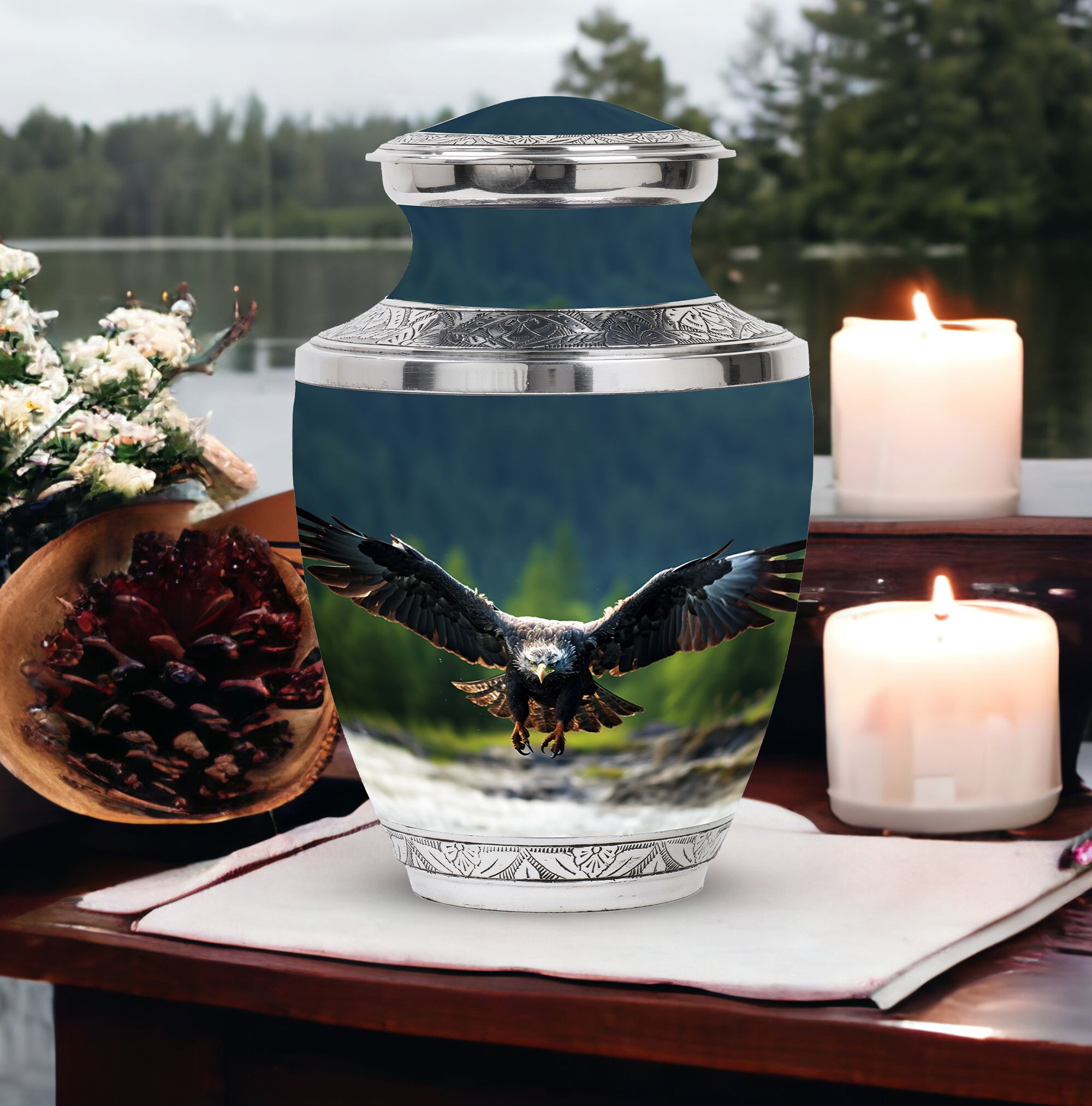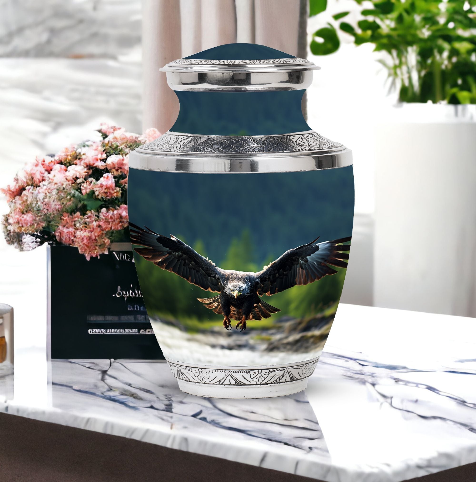 In eternal honor of your loved ones, their memory should be preserved with utmost respect and dignity. The heart-touching 'Eagle Urn for Ashes' is a large urn that stands as a magnificent tribute to your adored one. Crafted meticulously, it is robust in build, weighing 3.3 pounds due to its dense aluminum body. Its graceful design transcending 10 inches in height, with an internal capacity to preserve 200 cubic inches of ashes will surely resonate with reverent remembrance for your loved ones. A rare variant among small urns for ashes, this urn features eloquent personalization, allowing you to engrave names and express your venerable sentiment. Each order also includes a plush velvet pouch for the safe containment of the ashes.