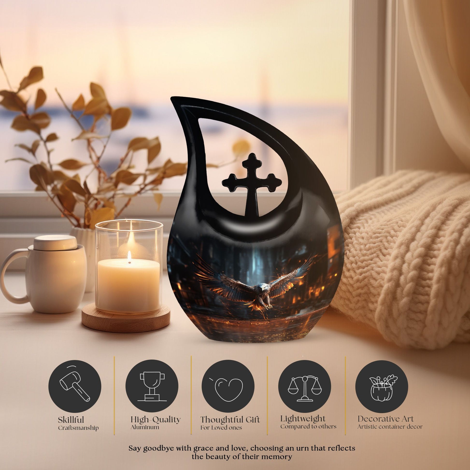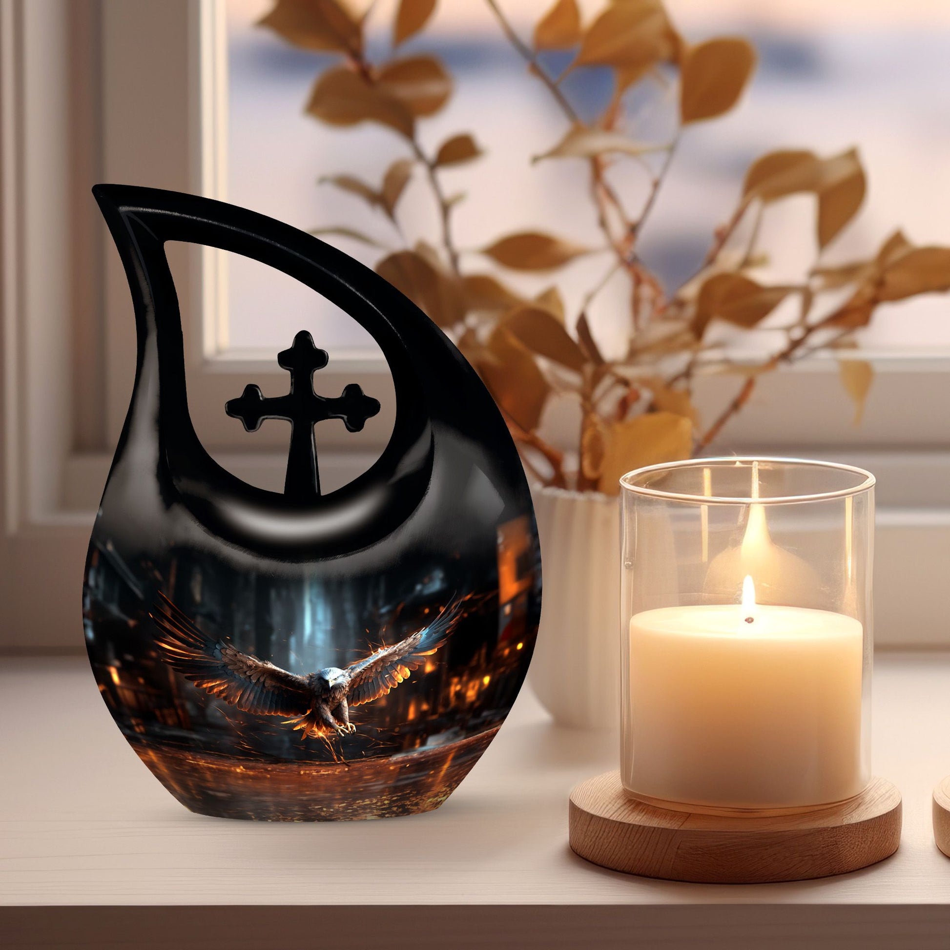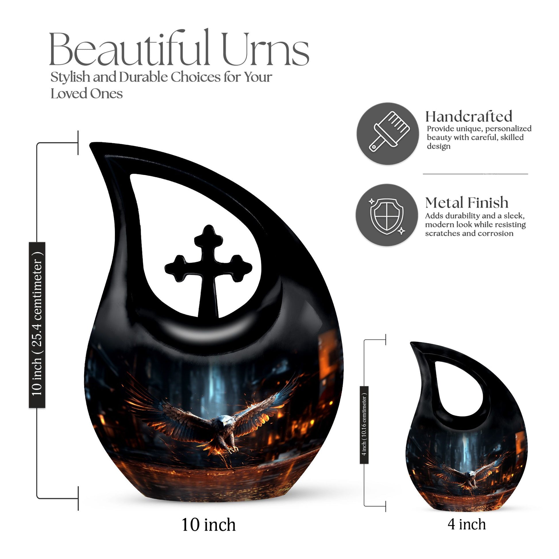 Crafted from high-quality aluminum, this urn is built to last. The sleek black finish is beautifully complemented by the soaring eagle and subtle cross-drop detailing, symbolizing freedom, faith, and eternal peace. This large human ashes urn combines superior craftsmanship with refined aesthetics, making it ideal for families seeking large cremation urns that merge art and purpose. The secure screw-top lid ensures ashes are safely preserved, while the classic design suits any home or memorial setting.