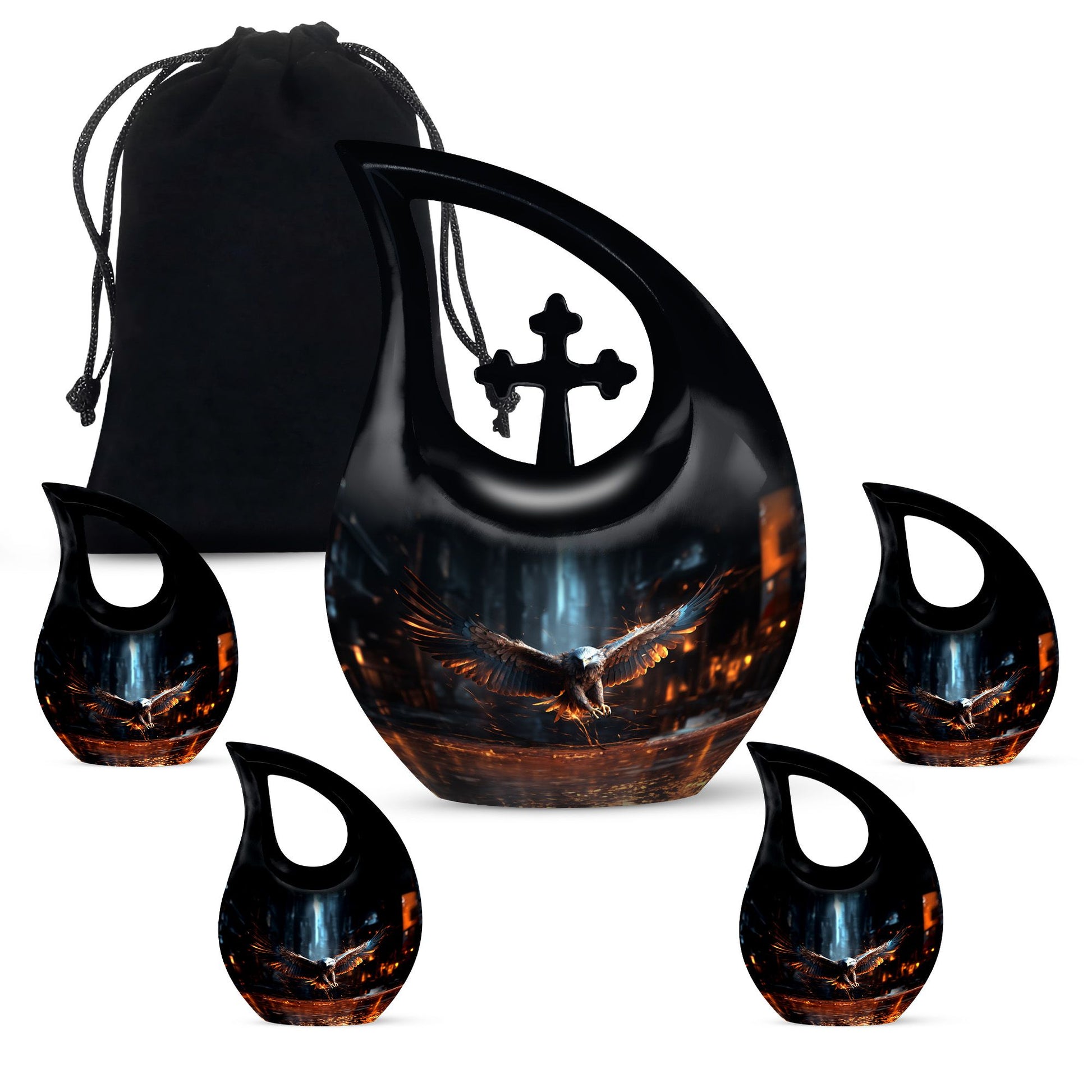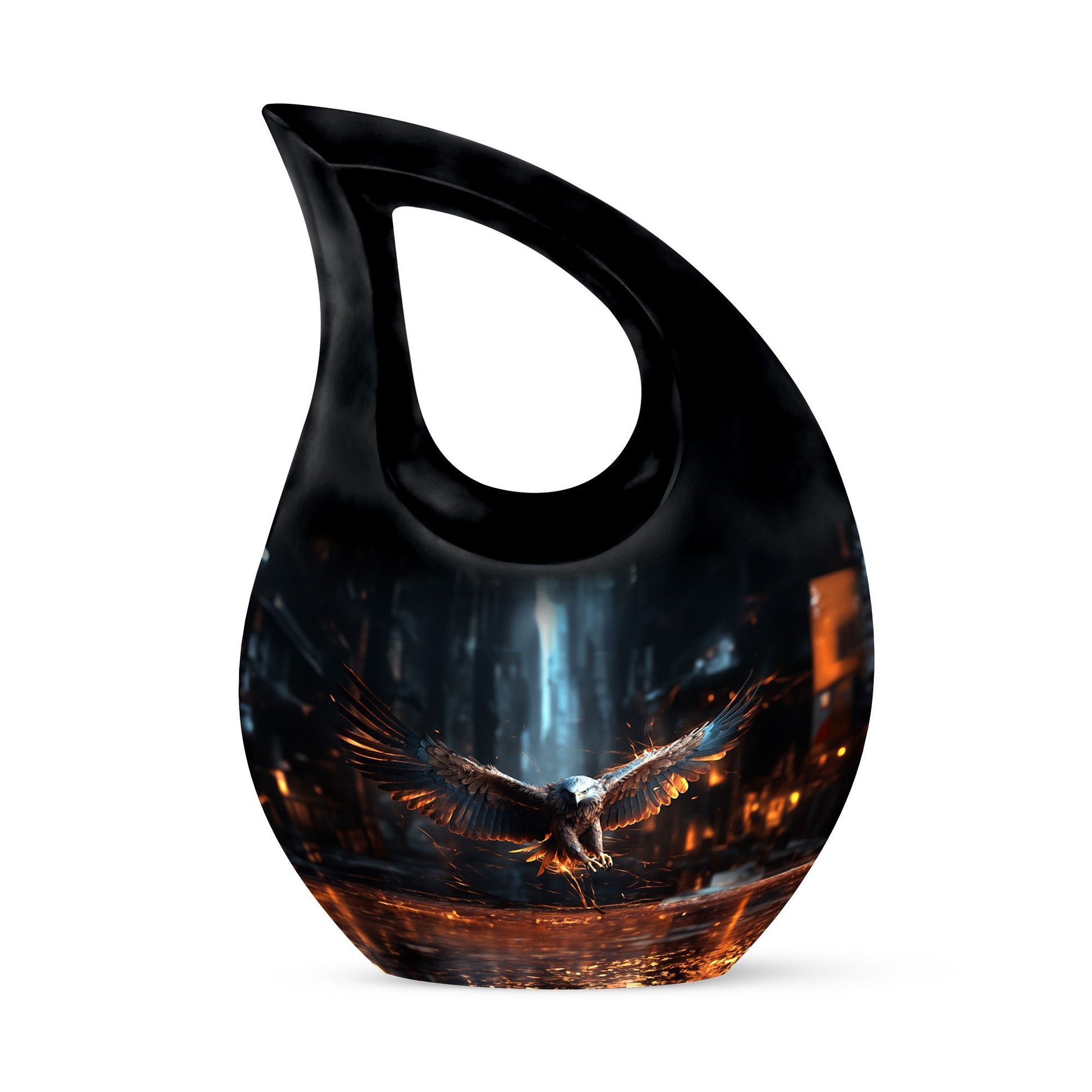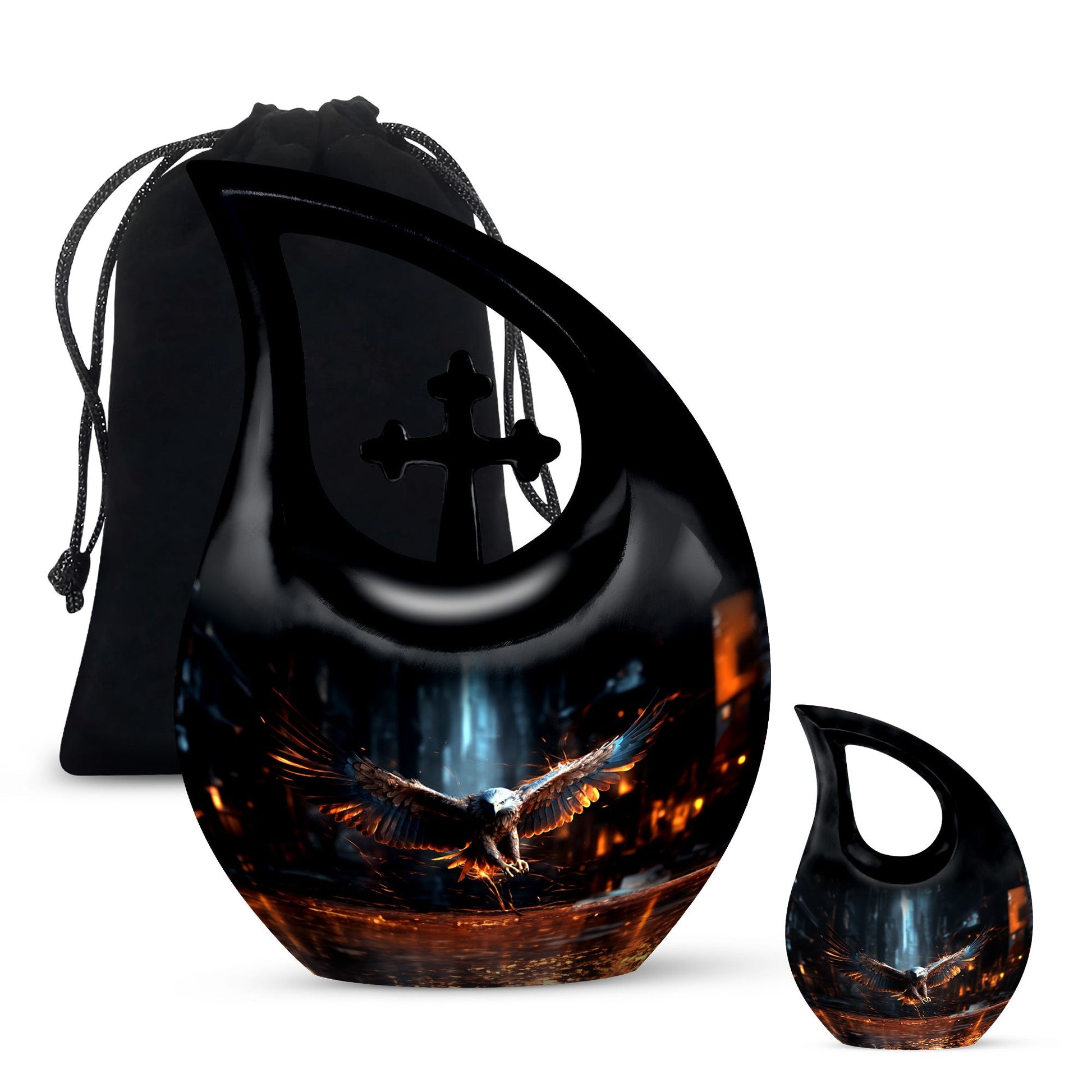 Crafted from high-quality aluminum, this urn is built to last. The sleek black finish is beautifully complemented by the soaring eagle and subtle cross-drop detailing, symbolizing freedom, faith, and eternal peace. This large human ashes urn combines superior craftsmanship with refined aesthetics, making it ideal for families seeking large cremation urns that merge art and purpose. The secure screw-top lid ensures ashes are safely preserved, while the classic design suits any home or memorial setting.