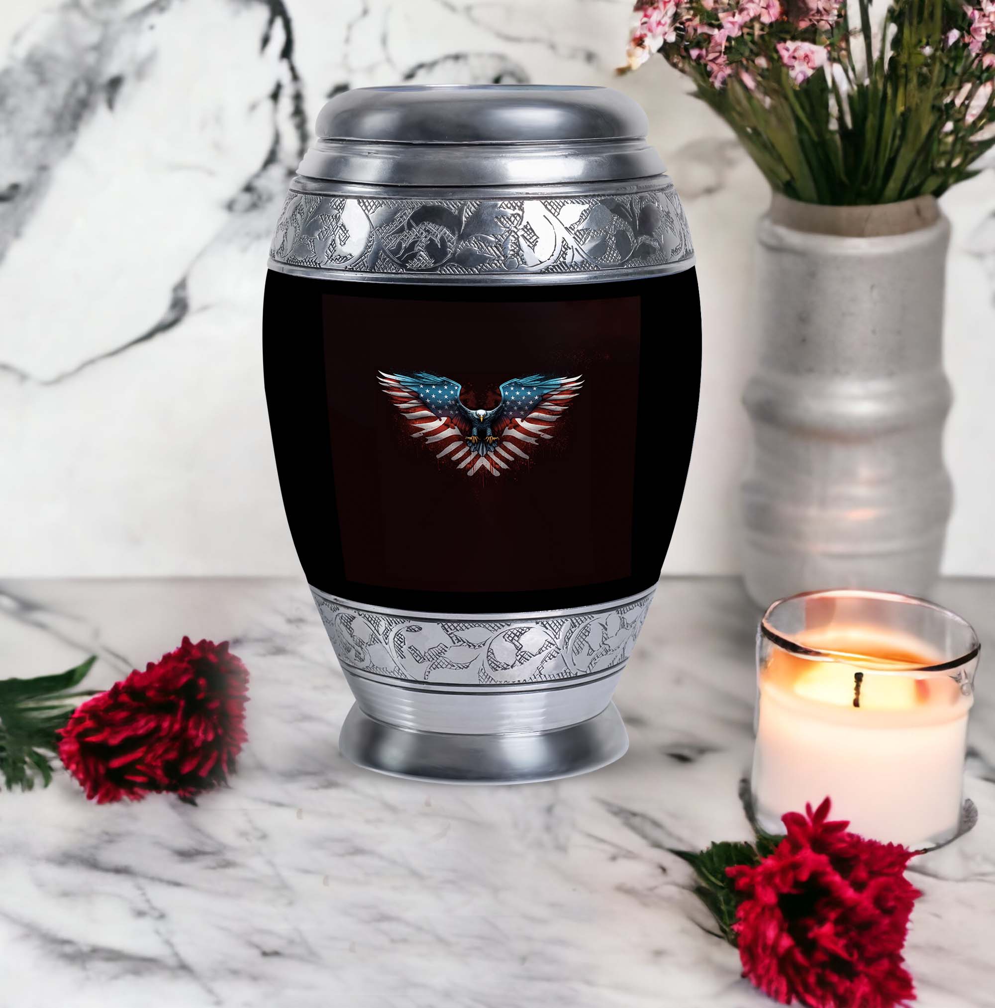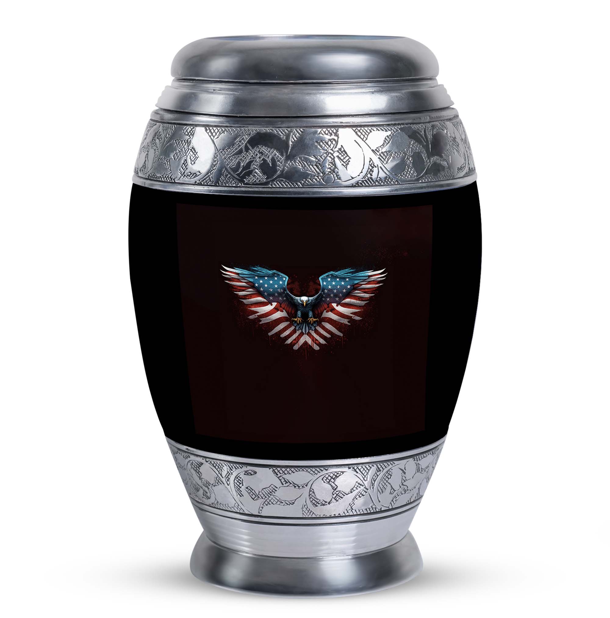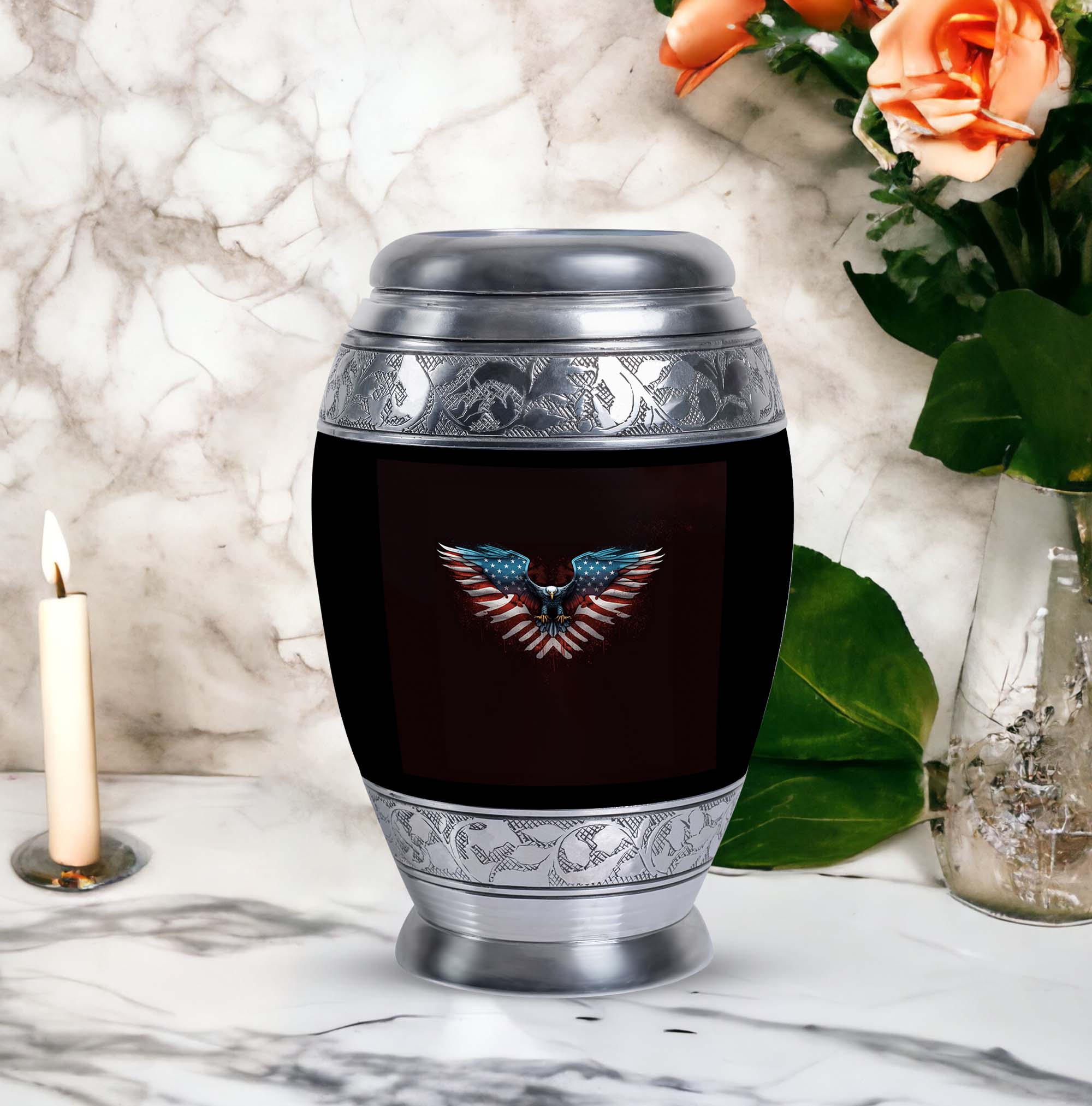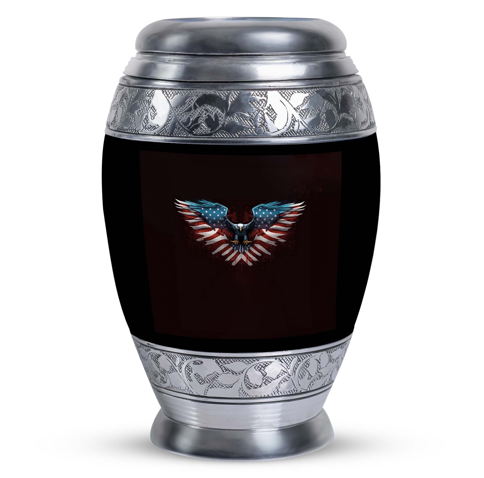 Preserve the memory of a loved one with our classic, Aluminium Eagle Urns for Human Ashes. Fashioned for durability, this large urn weighs 3.3 pounds, stands 10 inches tall, and possesses an impressive capacity of 200 cubic inches, perfect for your needs. Crafted to last, this cremation urn is an empowering symbol of an eagle soaring high, signifying freedom and strength. The package comes with a velvet pouch sufficient for the containment of ashes, enhancing the urn's convenience and functionality. This urn allows for customization - you can personalize it with engraved names, just the way you want. These urns are not just containers for ashes, they are a heartfelt tribute to a cherished life well-lived. Measuring just 3 inches, it's designed to fit perfectly in your space. Our urns exhibit unparalleled sophistication, authenticity and are a unique tribute to your loved one. Whether you are in search of unique urns for dad or large urns for cremation ashes, our Aluminium urn is a perfect choice.