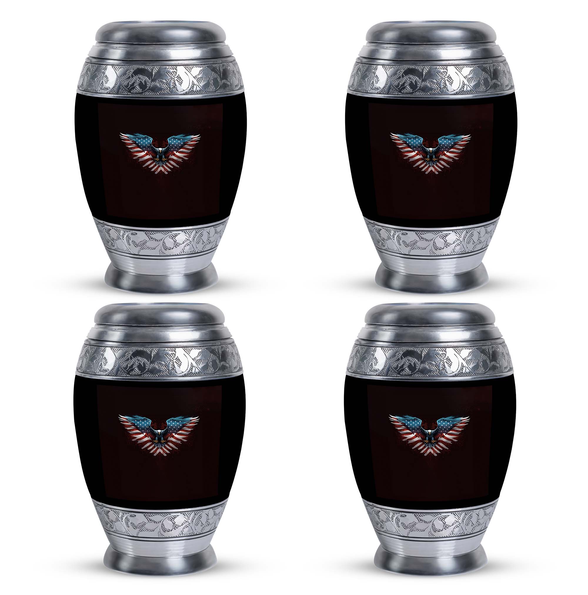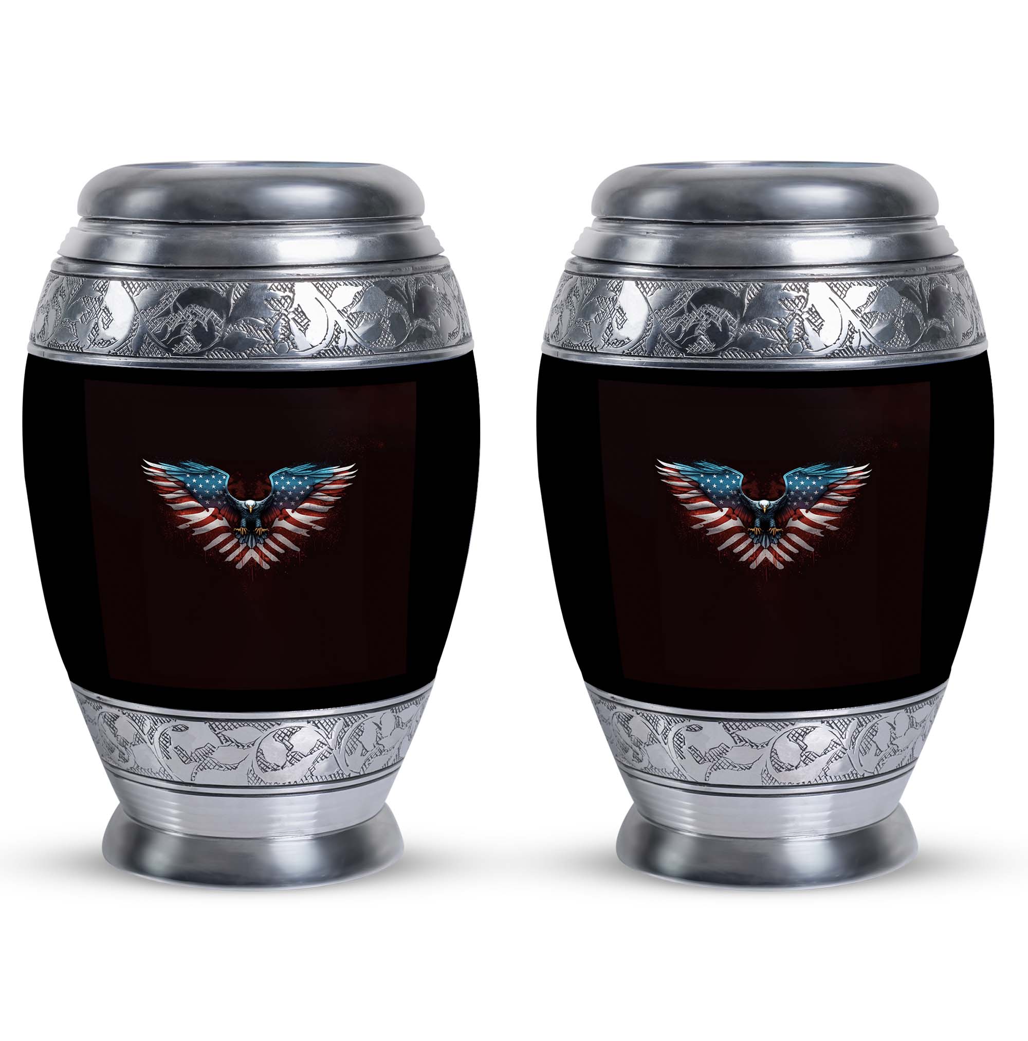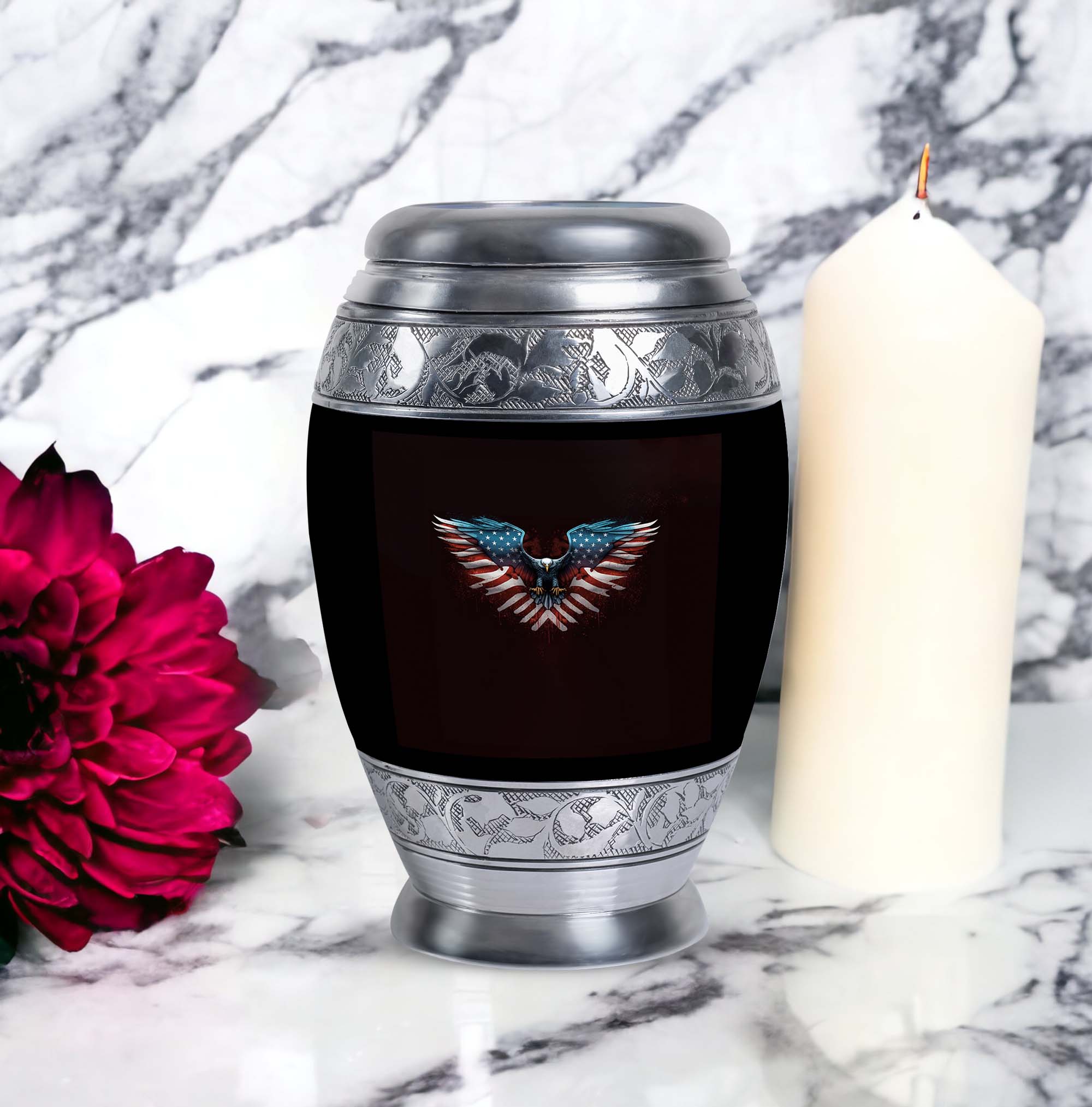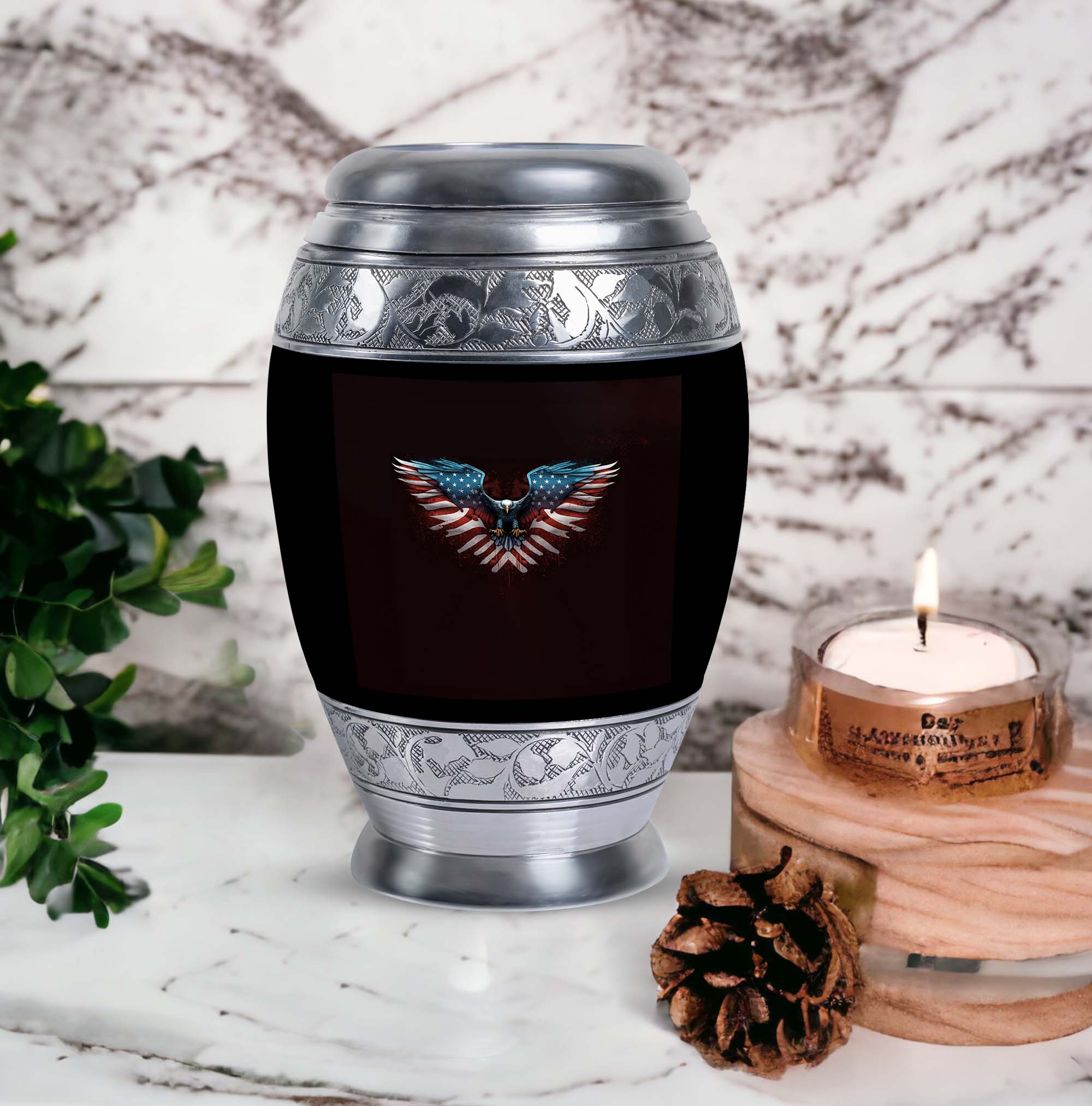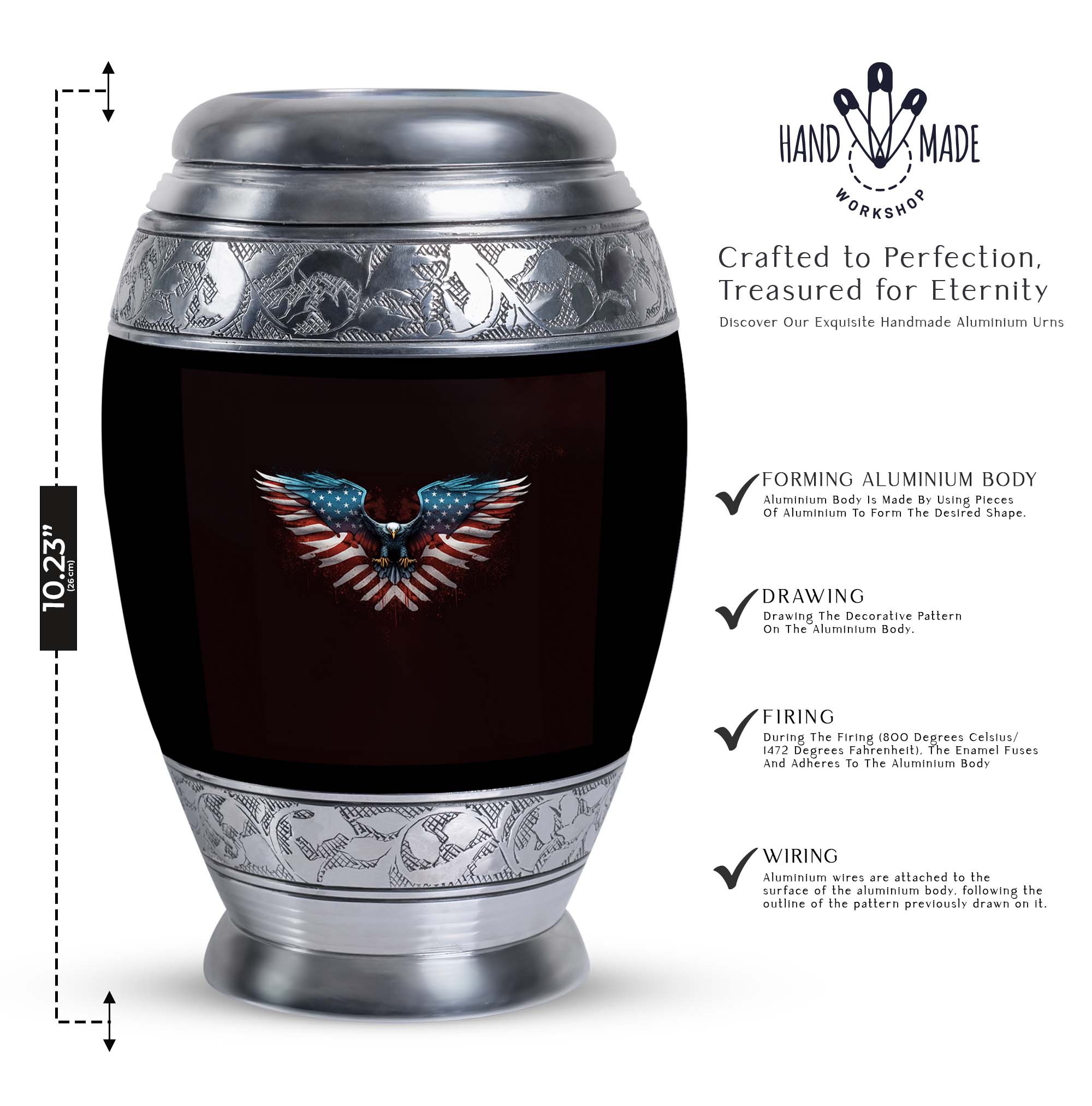 Preserve the memory of a loved one with our classic, Aluminium Eagle Urns for Human Ashes. Fashioned for durability, this large urn weighs 3.3 pounds, stands 10 inches tall, and possesses an impressive capacity of 200 cubic inches, perfect for your needs. Crafted to last, this cremation urn is an empowering symbol of an eagle soaring high, signifying freedom and strength. The package comes with a velvet pouch sufficient for the containment of ashes, enhancing the urn's convenience and functionality. This urn allows for customization - you can personalize it with engraved names, just the way you want. These urns are not just containers for ashes, they are a heartfelt tribute to a cherished life well-lived. Measuring just 3 inches, it's designed to fit perfectly in your space. Our urns exhibit unparalleled sophistication, authenticity and are a unique tribute to your loved one. Whether you are in search of unique urns for dad or large urns for cremation ashes, our Aluminium urn is a perfect choice.