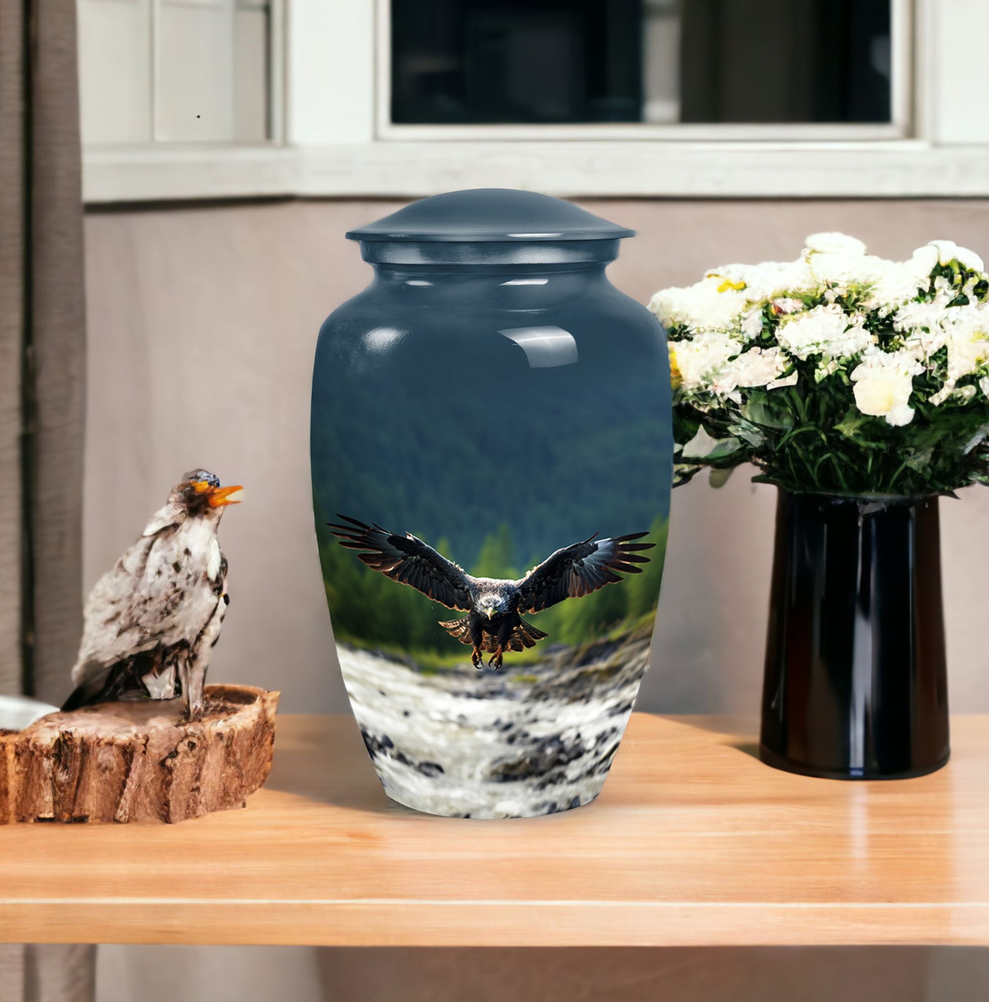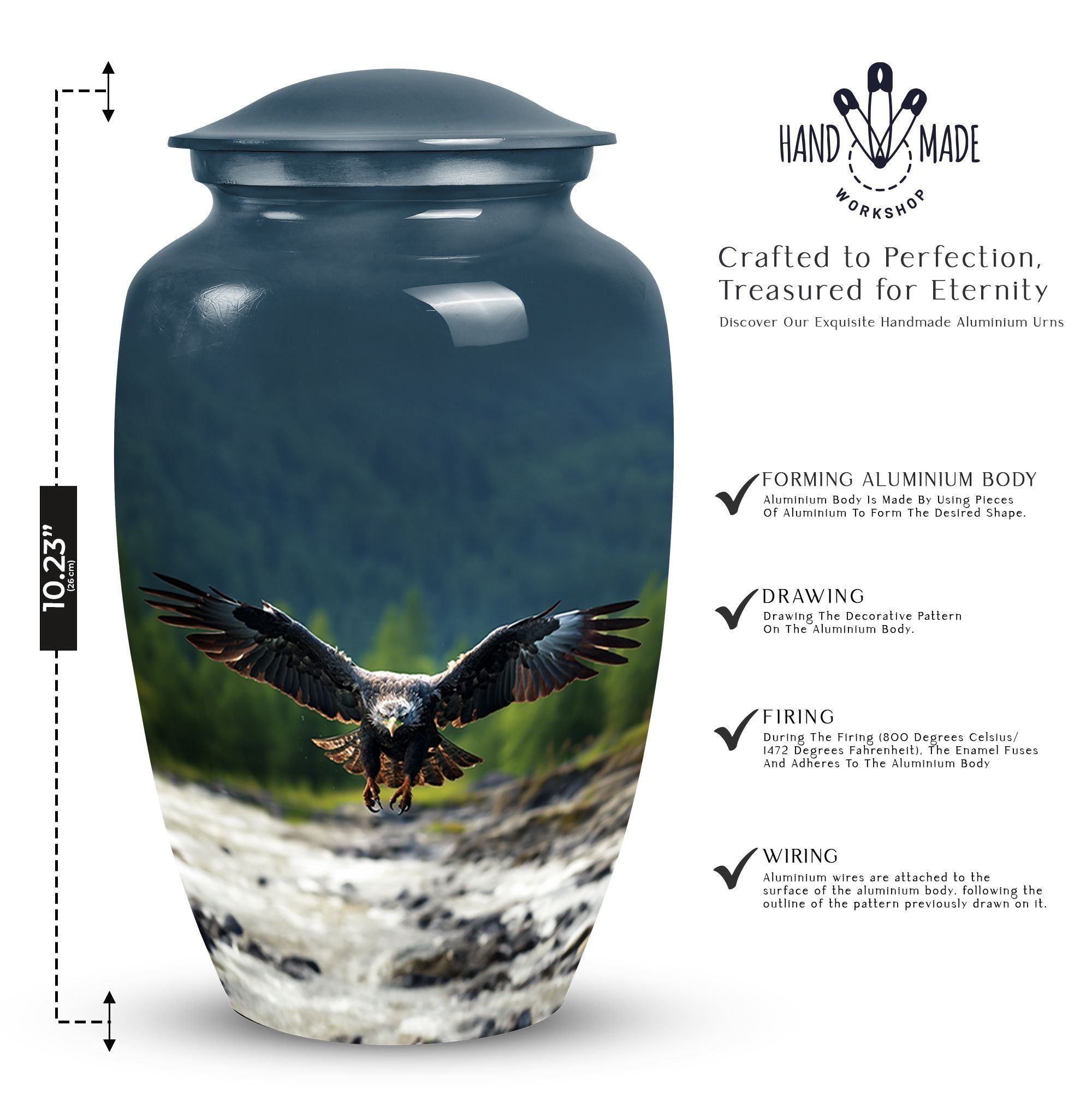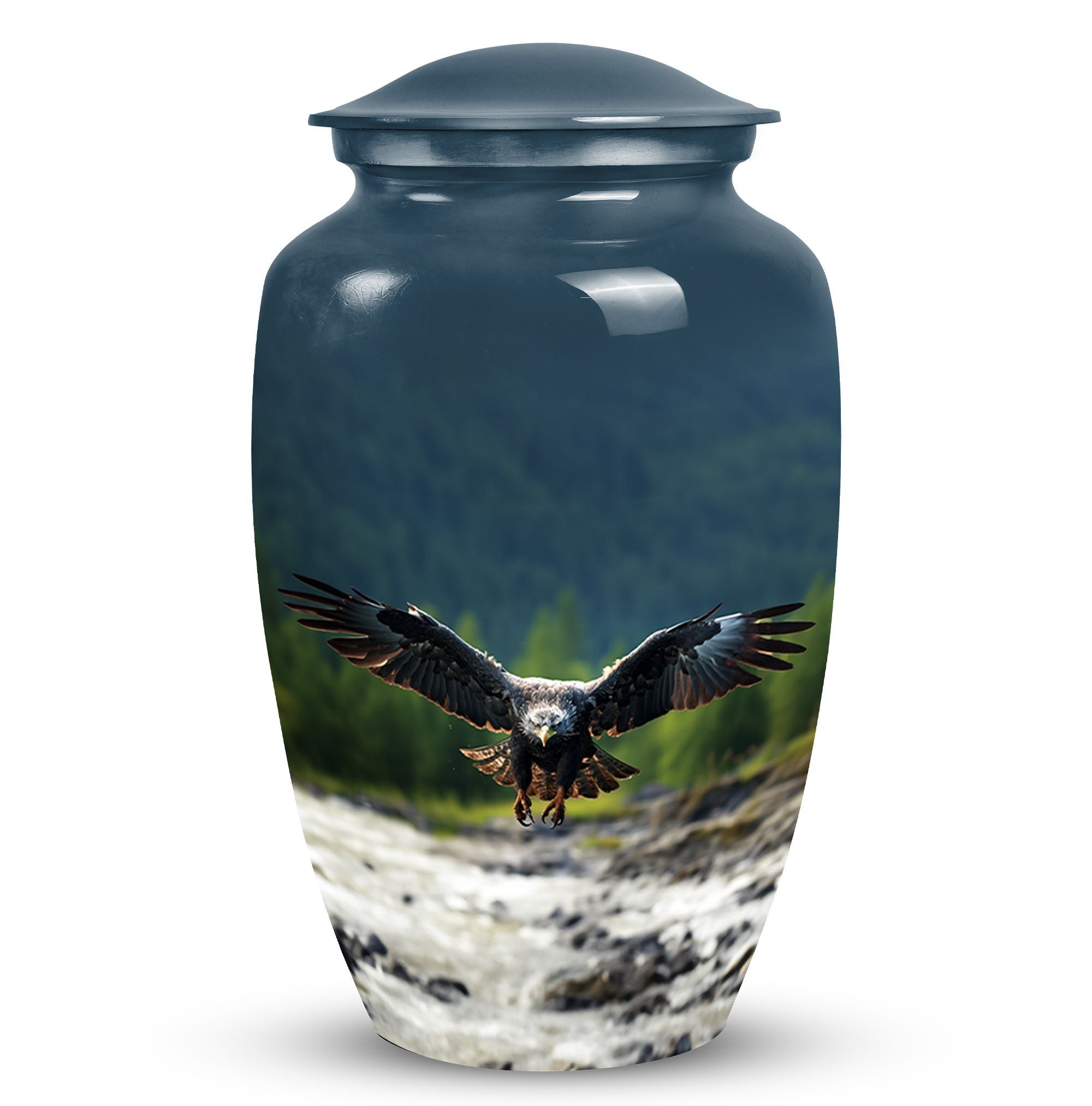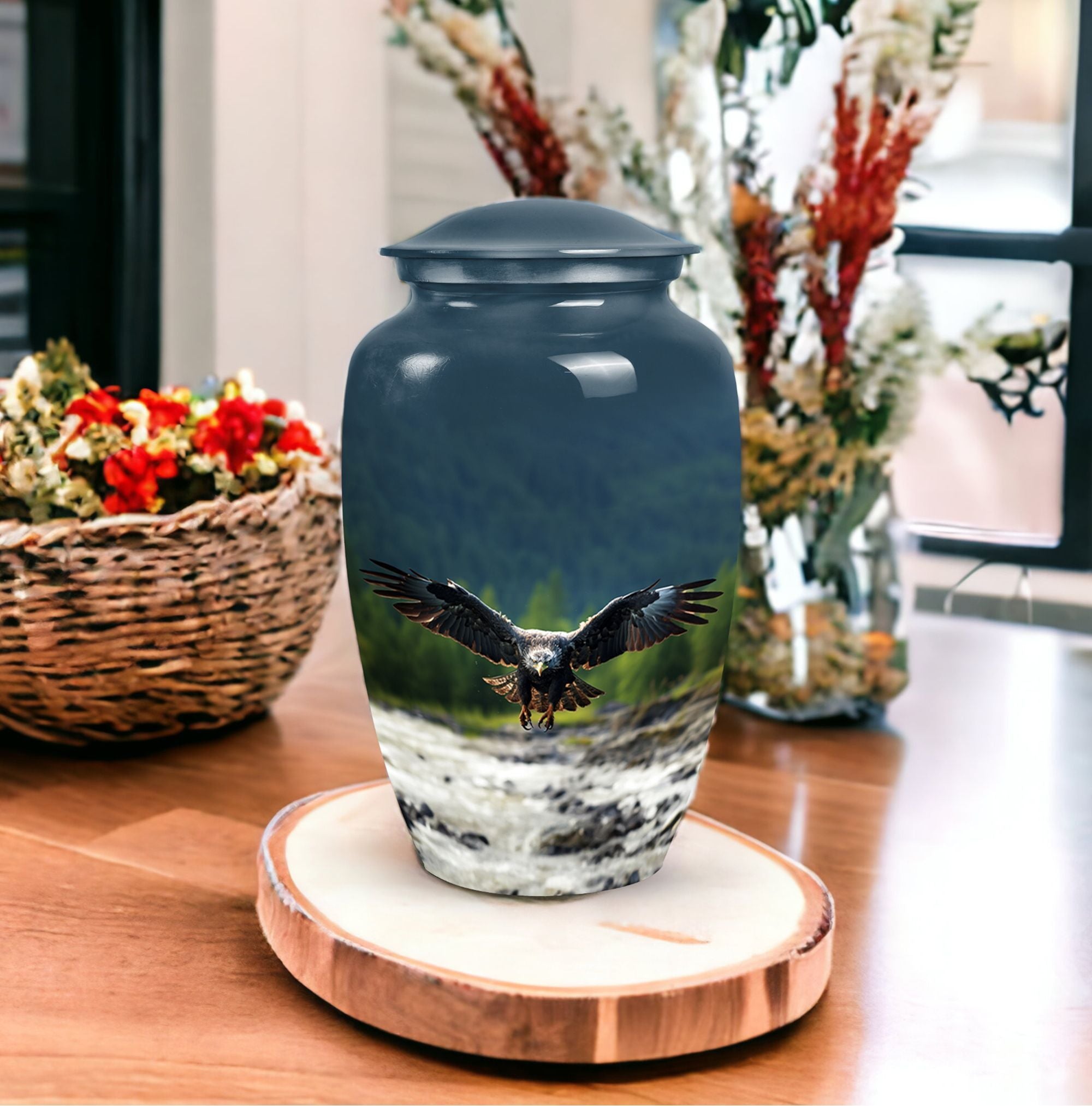 Our Eagle Urns for Ashes offers a dignified and suitable resting place for the cherished ashes of your loved one. Crafted from sustainable yet sturdy aluminium, it stands 10 inches tall, weighing in at 3.3 pounds, showcasing a tasteful and classical form. Accommodating up to 200 cubic inches, this cremation urn perfectly combines an elegant aesthetic with functional design. The urn comes with a soft velvet pouch, providing gentle containment for the cherished remains. Our 3-inch small urns for ashes offer a comforting presence during times of mourning, and they can be customized to your preference. We offer the ability to make the urn that much more special by personalizing it with engraved names. Celebrate the journey of your dear departed with Beautiful Urns for Mom, Large Cremation Urns, and Personalized Urns for Adults, which show uniqueness in obligation and honor to your beloved. Each urn is created with love and respect. Note that the design of this particular urn is explicitly classic— timelessly elegant yet unobtrusive.