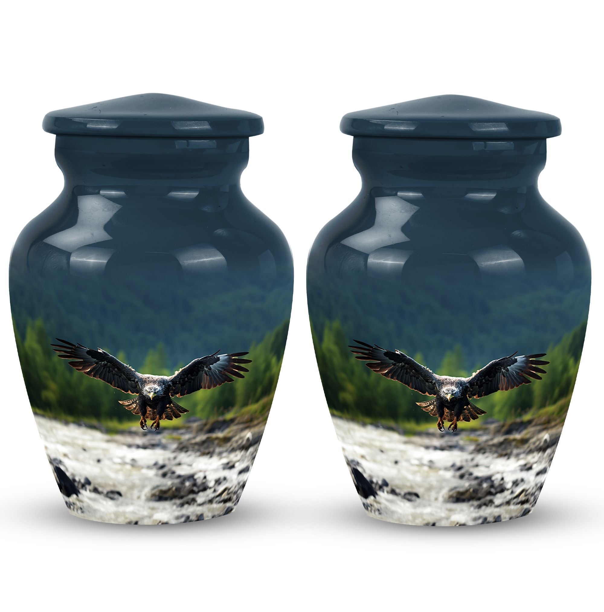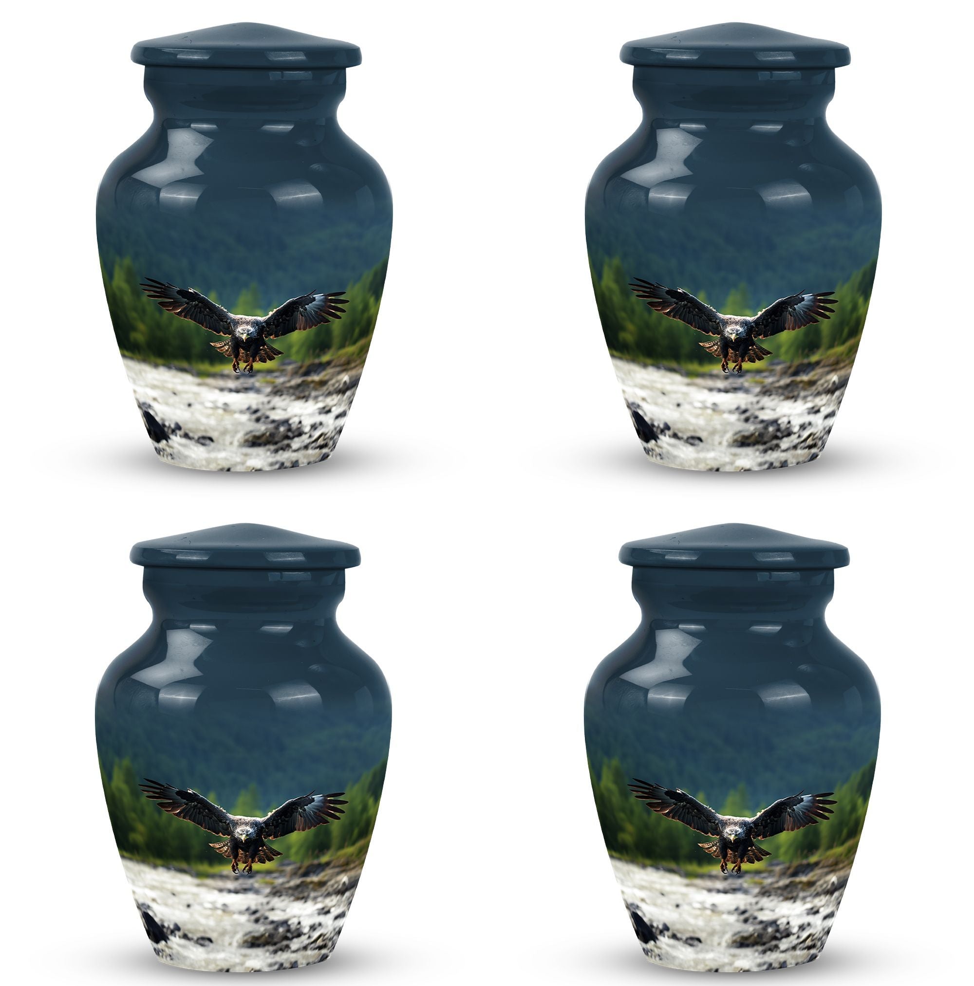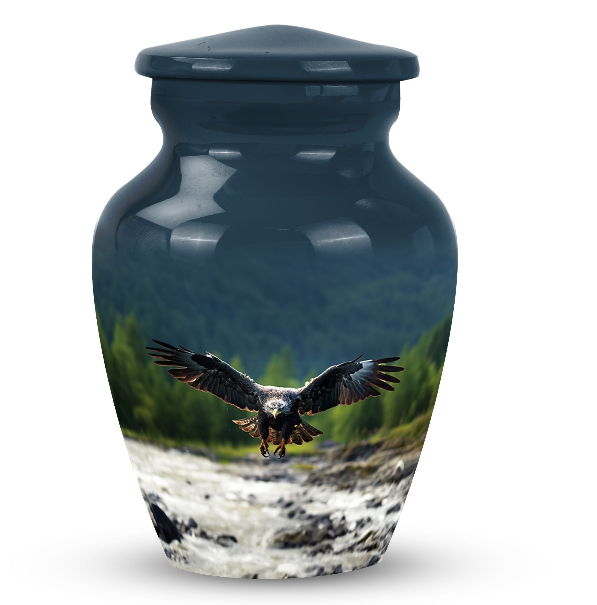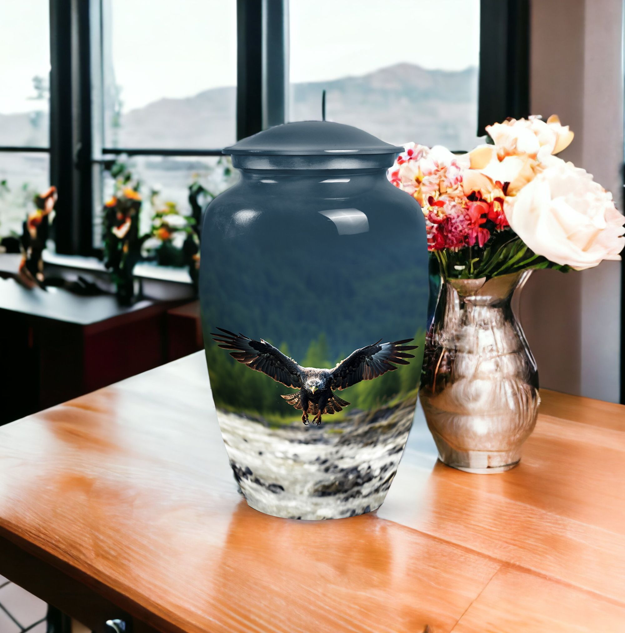 Our Eagle Urns for Ashes offers a dignified and suitable resting place for the cherished ashes of your loved one. Crafted from sustainable yet sturdy aluminium, it stands 10 inches tall, weighing in at 3.3 pounds, showcasing a tasteful and classical form. Accommodating up to 200 cubic inches, this cremation urn perfectly combines an elegant aesthetic with functional design. The urn comes with a soft velvet pouch, providing gentle containment for the cherished remains. Our 3-inch small urns for ashes offer a comforting presence during times of mourning, and they can be customized to your preference. We offer the ability to make the urn that much more special by personalizing it with engraved names. Celebrate the journey of your dear departed with Beautiful Urns for Mom, Large Cremation Urns, and Personalized Urns for Adults, which show uniqueness in obligation and honor to your beloved. Each urn is created with love and respect. Note that the design of this particular urn is explicitly classic— timelessly elegant yet unobtrusive.
