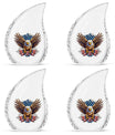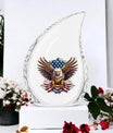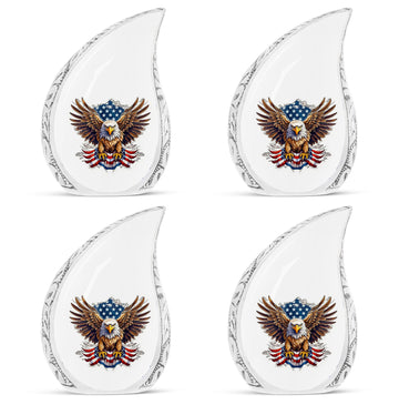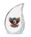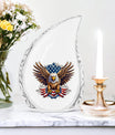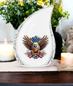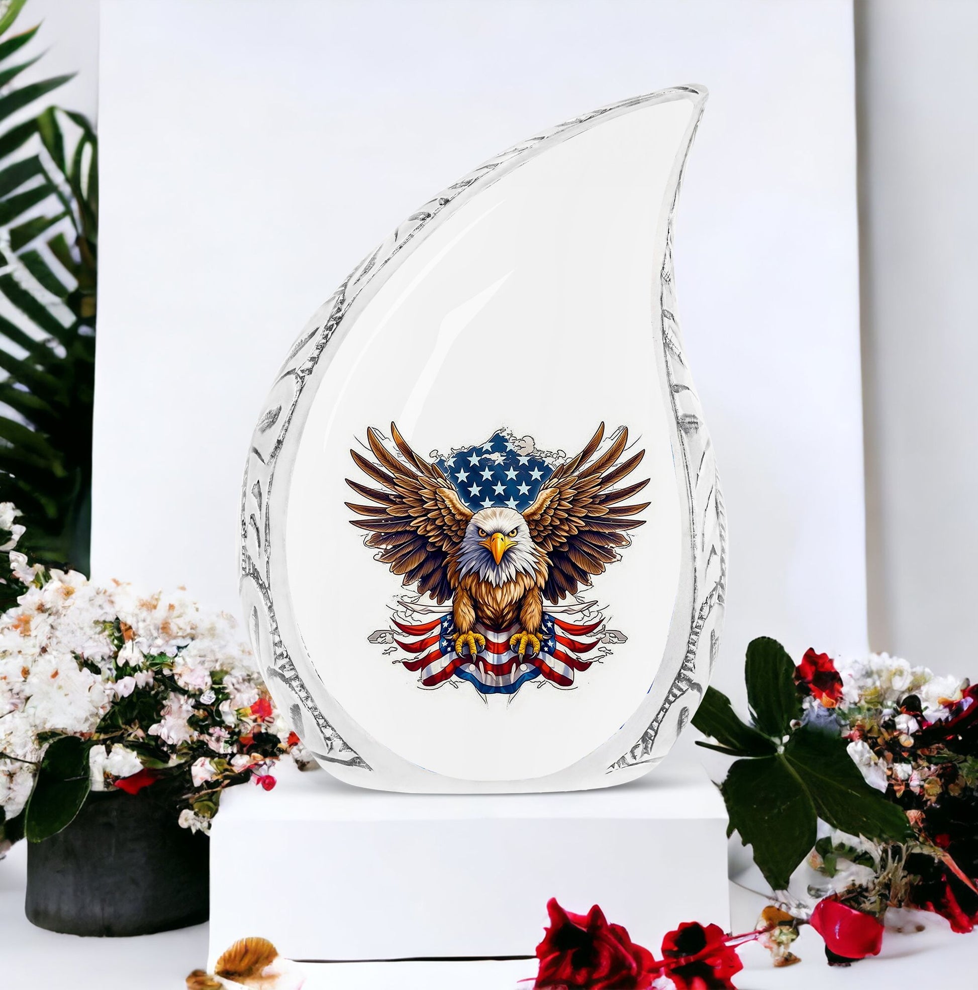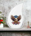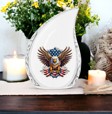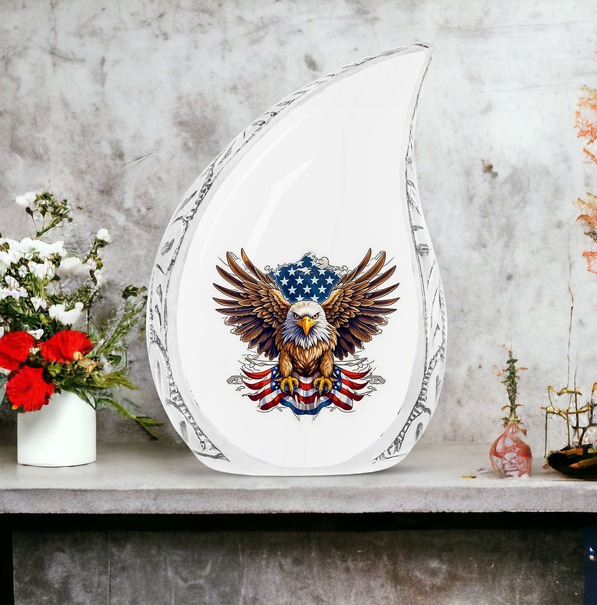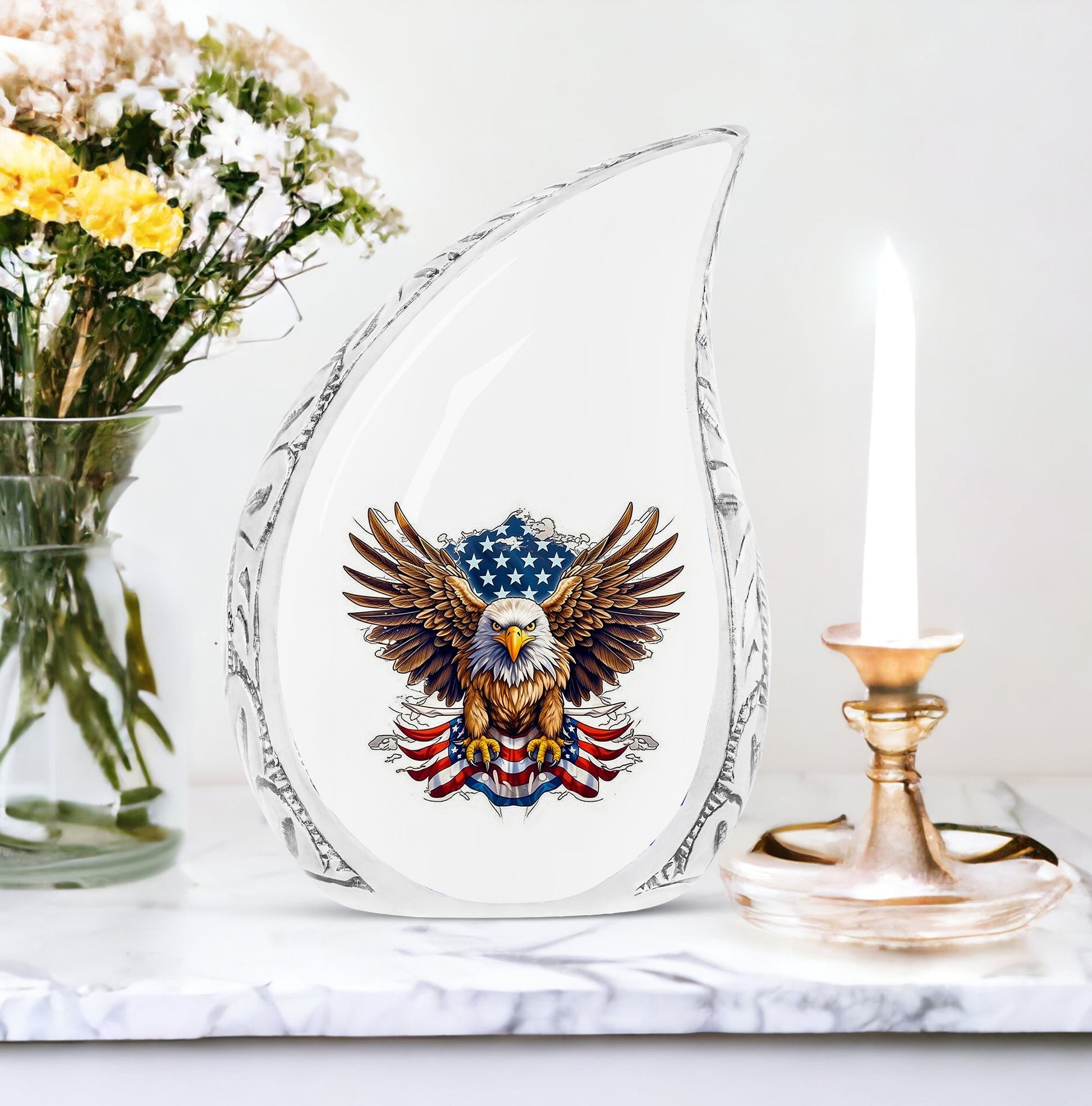Pay your respects and preserve a cherished memory with our 'Eagle with American flag Memorial Urn'. Graciously crafted from robust aluminium, this large, elegant memorial urn is perfect for preserving ashes in the most respectful way. Sized at a modest 3 inches and weighing a firm 3.3 pounds, it can effortlessly contain up to 200 cubic inches of ceremonial ashes. The urn stands tall at 10 inches in height, making it an imposing keepsake of your dearly departed. What's more? We offer you the option to enrich this urn with a deeply personal touch; you can personify this urn by engraving names onto it. Packaged with a plush velvet pouch for secure containment of ashes, the urn promises a dignified repository of your dear one's remains.
