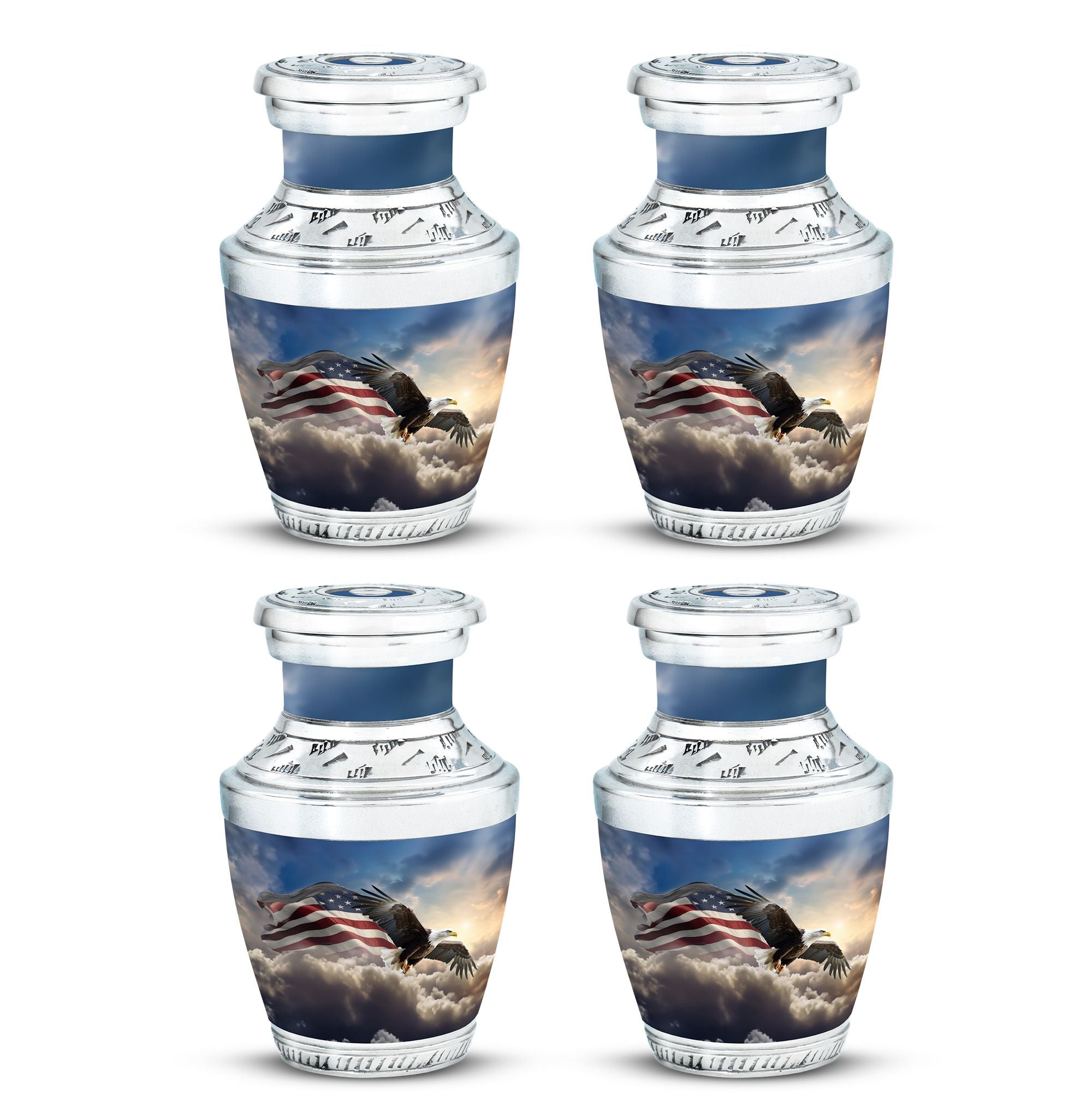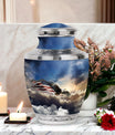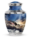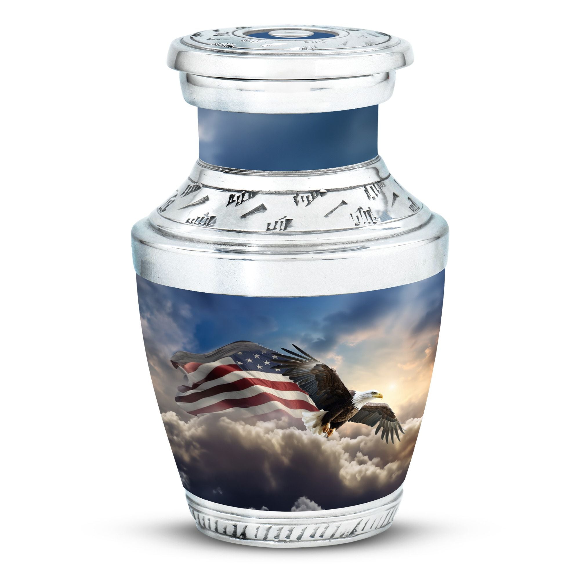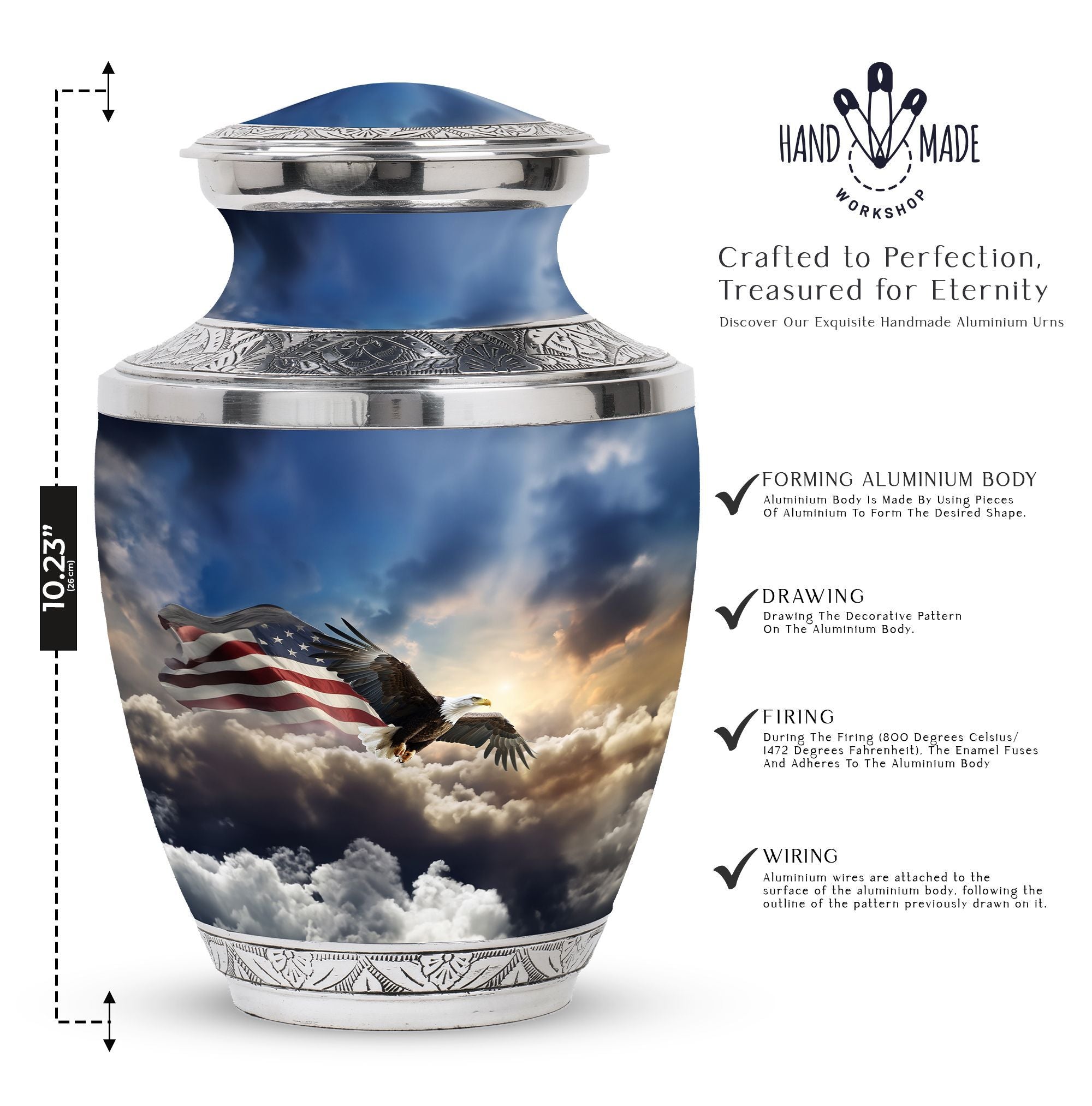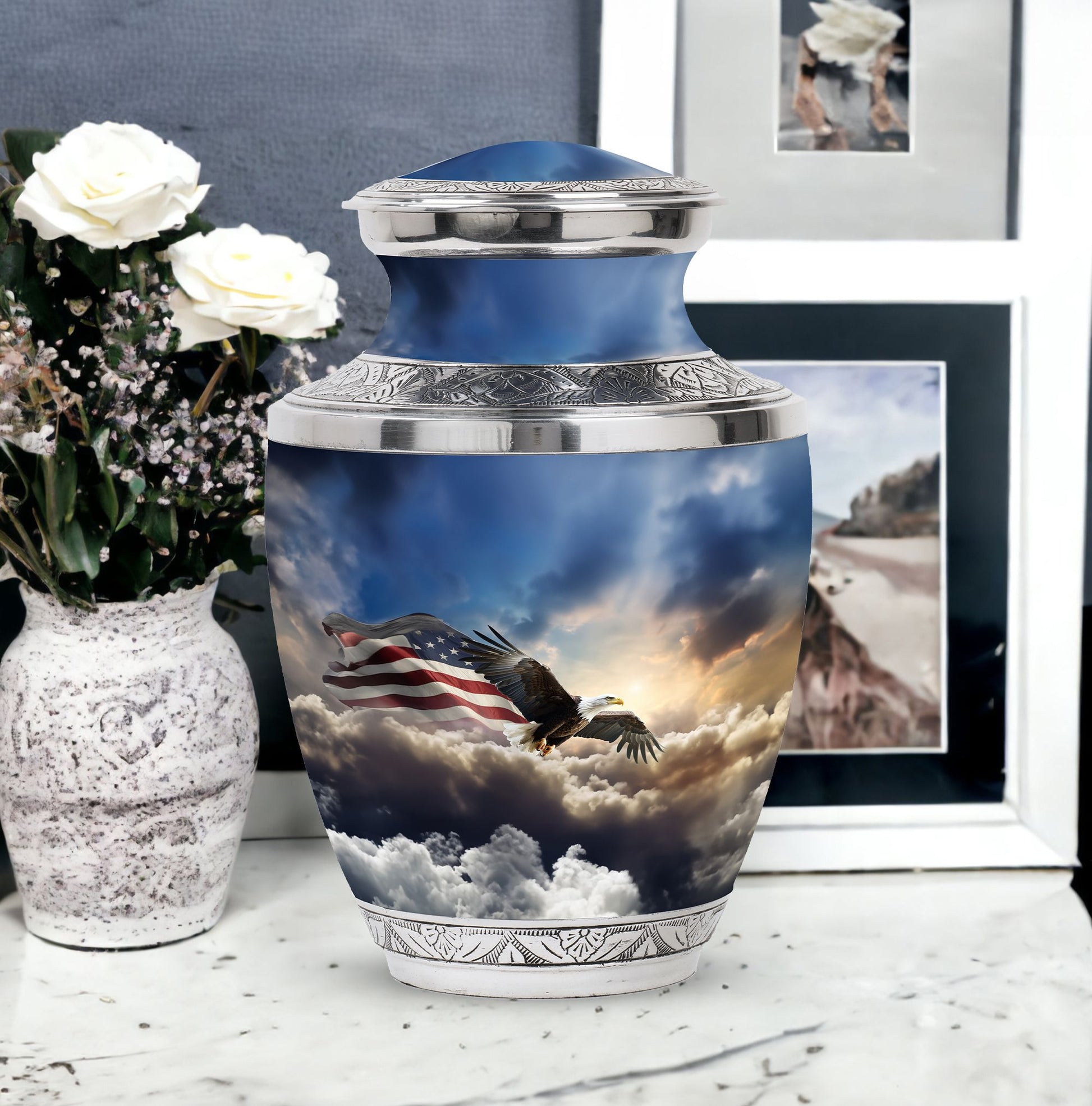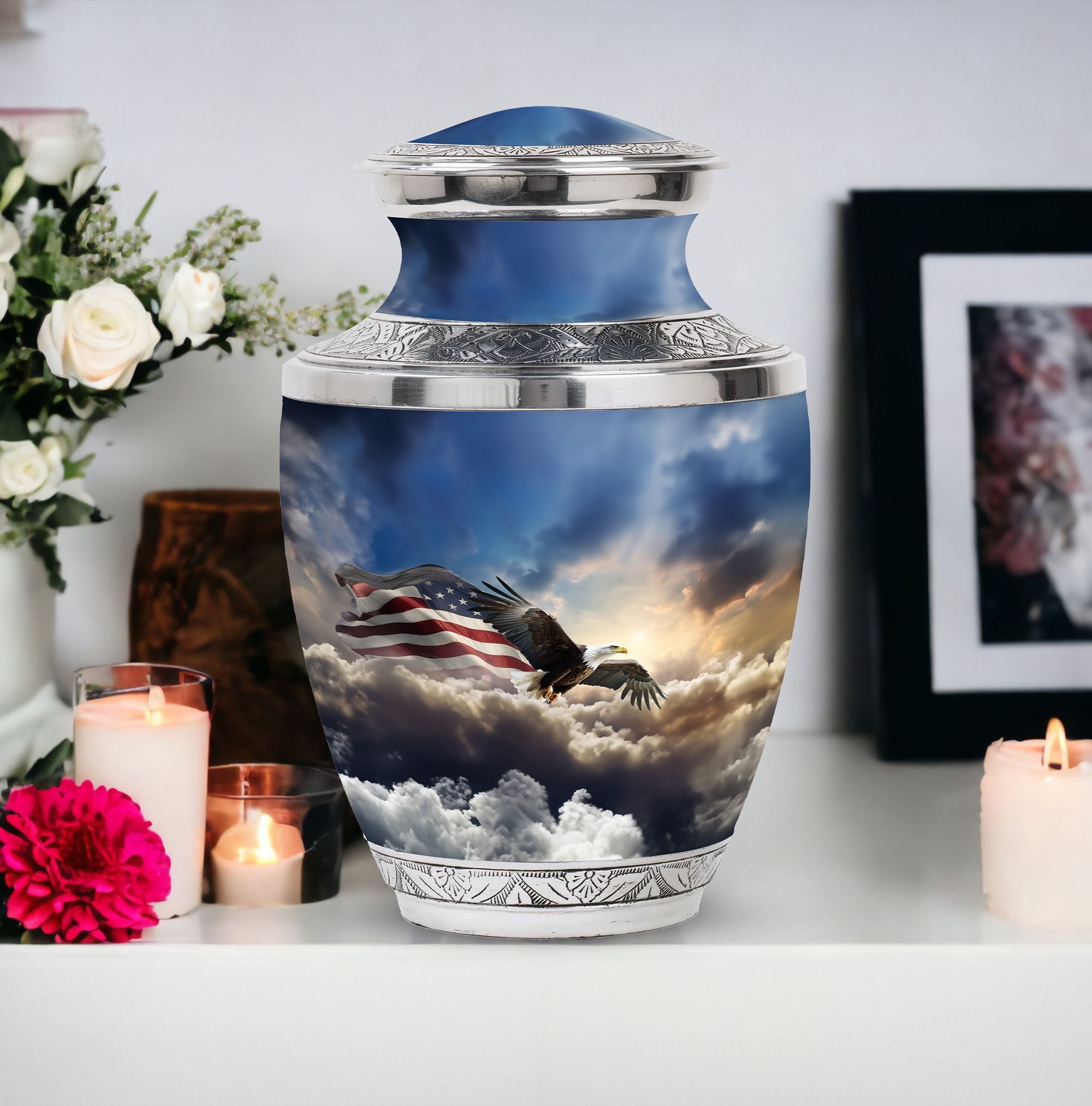 Honor your lost loved ones and keep their precious memories alive with our Eagle Memorial Urn, a tastefully refined receptacle fashioned for cherishing what was once vital presence. This large, aluminium urn remarkably weighs only 3.3 pounds and showcases an aesthetically pleasing classic urn shape that can hold up to 200 cubic inches of remains. The stature of this urn extends up to 10 inches in height, providing an elegant statement that respectfully houses the essence of the departed. Ideal particularly as urns for men's ashes, owing to its sturdily masculine yet sensitive appeal. The urn comes with a luxurious velvet pouch, adding an extra layer of protection and sophistication when containing the ashes. Further personalize this symbol of remembrance with engraved names, making it a uniquely tailored tribute for your loved one. Whether you’re searching for urns for ashes for dad or general containers for human ashes, our product serves your needs with dignity and grace. Explore more in our 'memorial urns' collection.