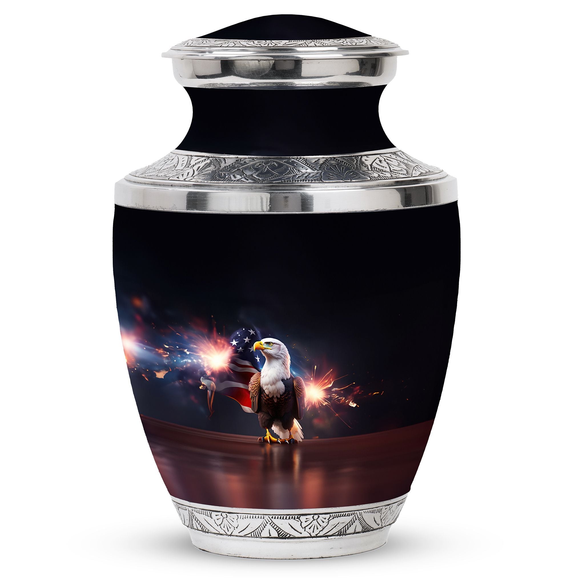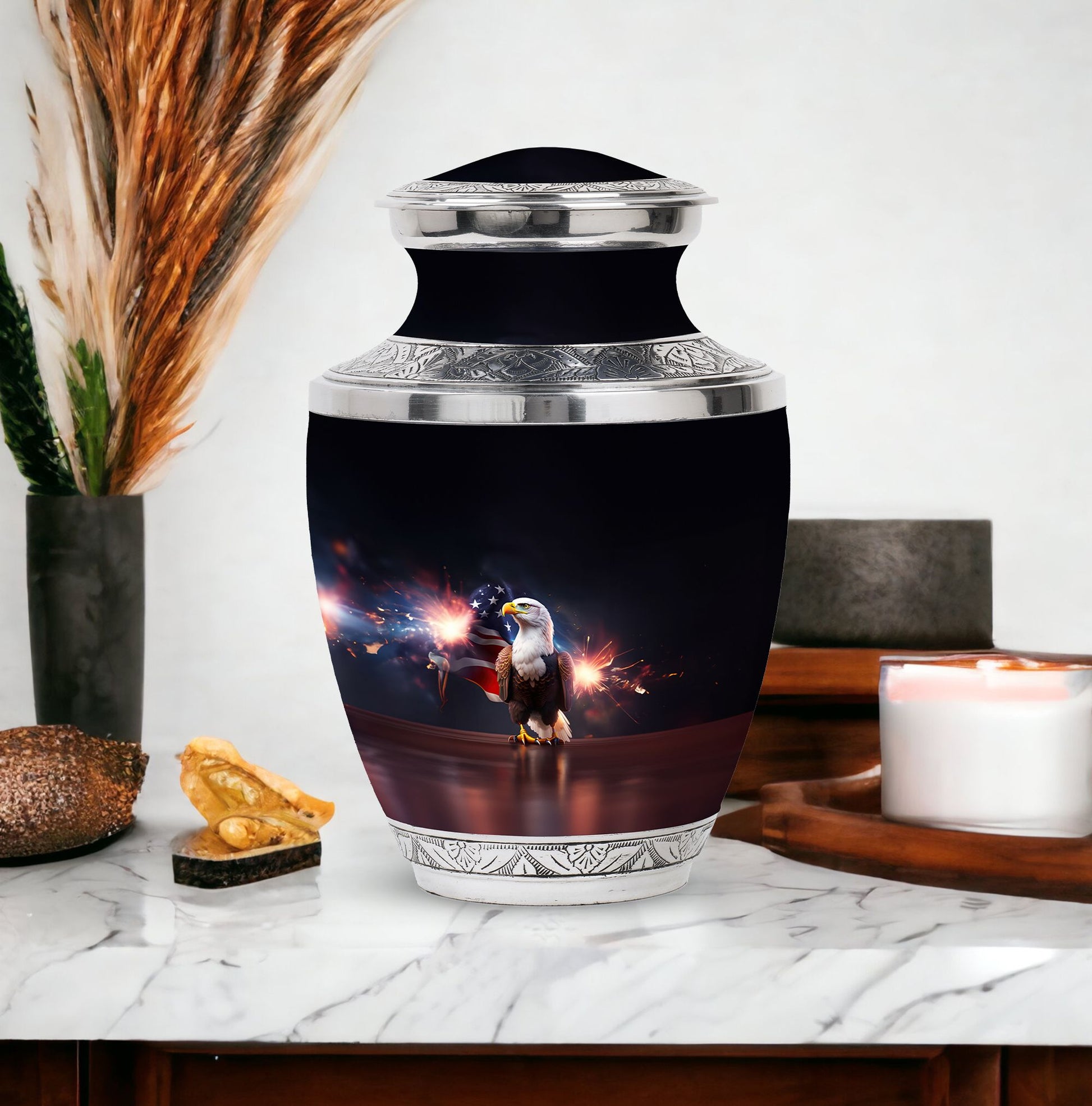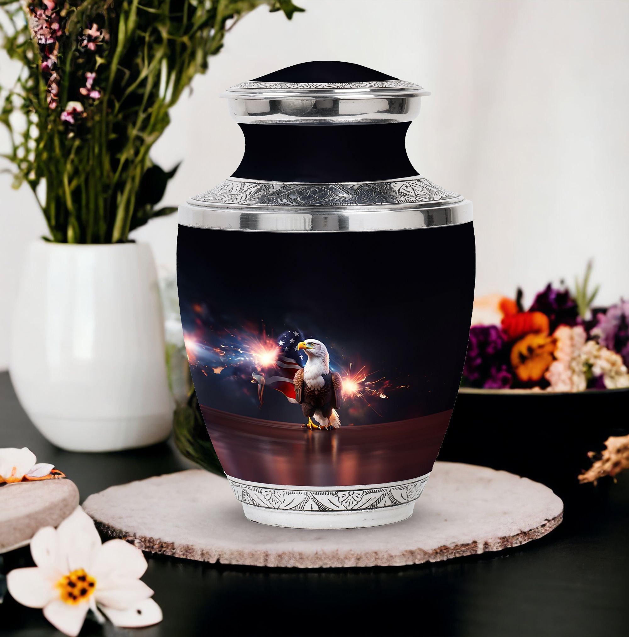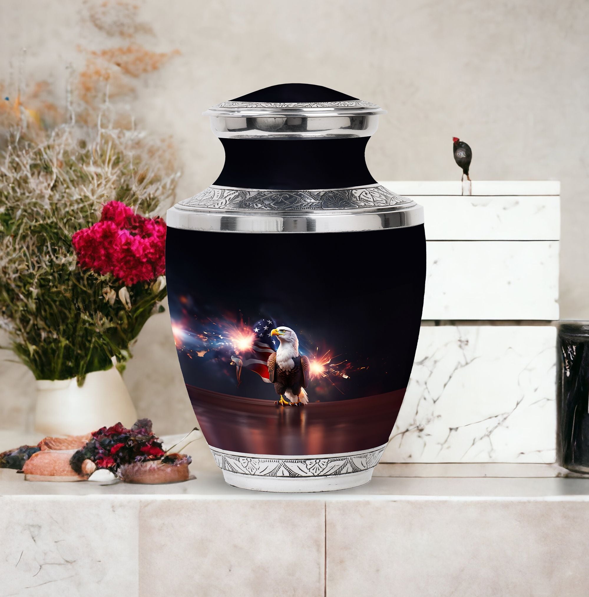 Pay a fitting tribute to your departed loved ones with our Large Eagle Urns for ashes, uniquely crafted for adults and seniors. Measuring a convenient 3 inches and weighing a solid 3.3 pounds, these memorial urns are more than just a container, they create space for remembrance and reflection. The urn's sizeable 200 cubic inch capacity ensures you can securely store the ashes, with dimensions reaching 10 inches in height. Each urn is carefully fashioned from durable aluminum, known for its long-lasting qualities, ensuring your memories stand the test of time. The package also includes a soft velvet pouch, designed specifically for the containment of ashes. Adding a touch of personal sentiment, these urns offer an option for an engraved name customization. Tailored for those seeking Metal Urns for Human Ashes, Funeral Ashes Containers, Custom Cremation Urns, or Modern Urns for Ashes, our Classic Eagle Urn offers a solemn and discreet solution for your memorial ceremony needs.