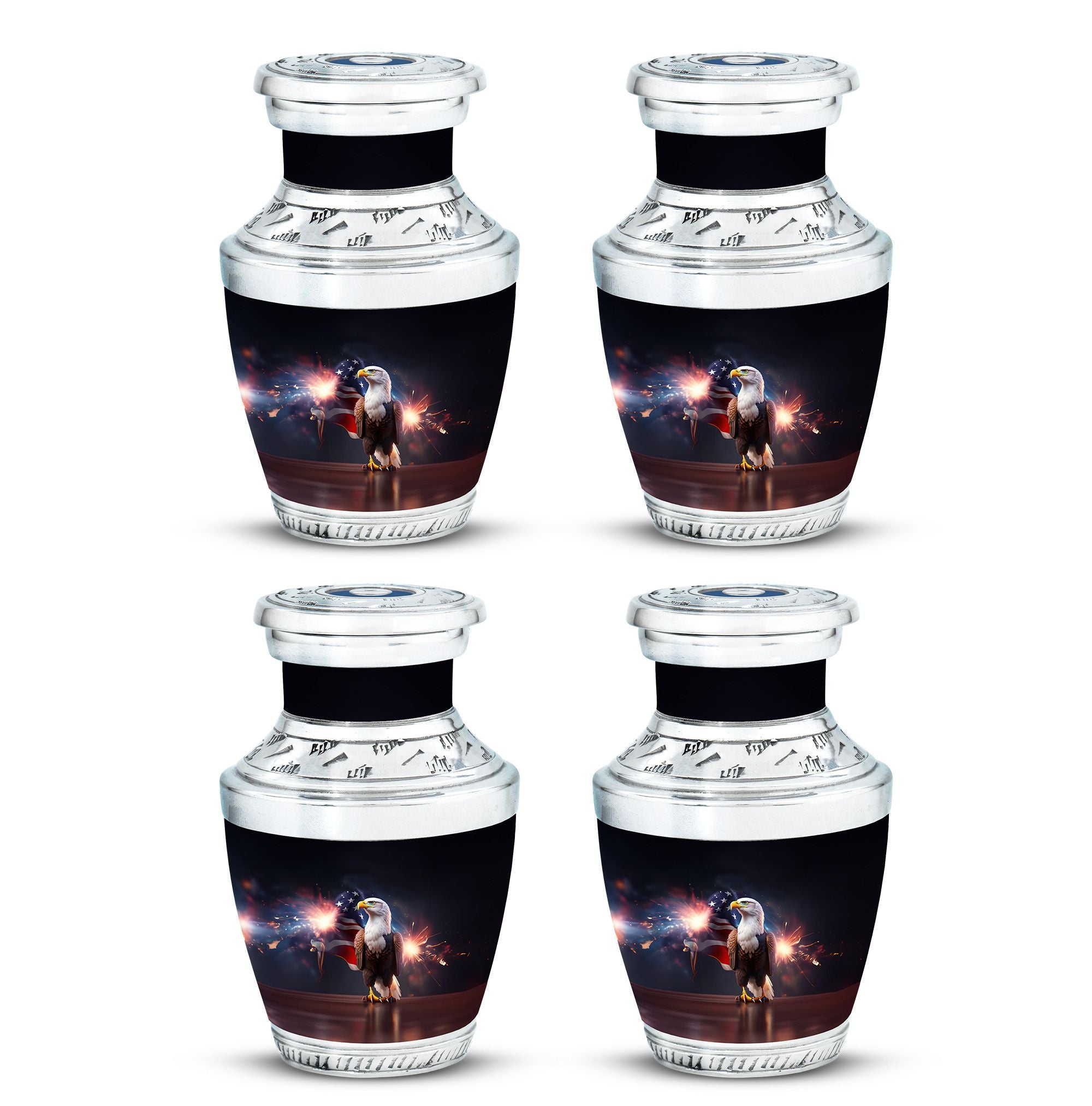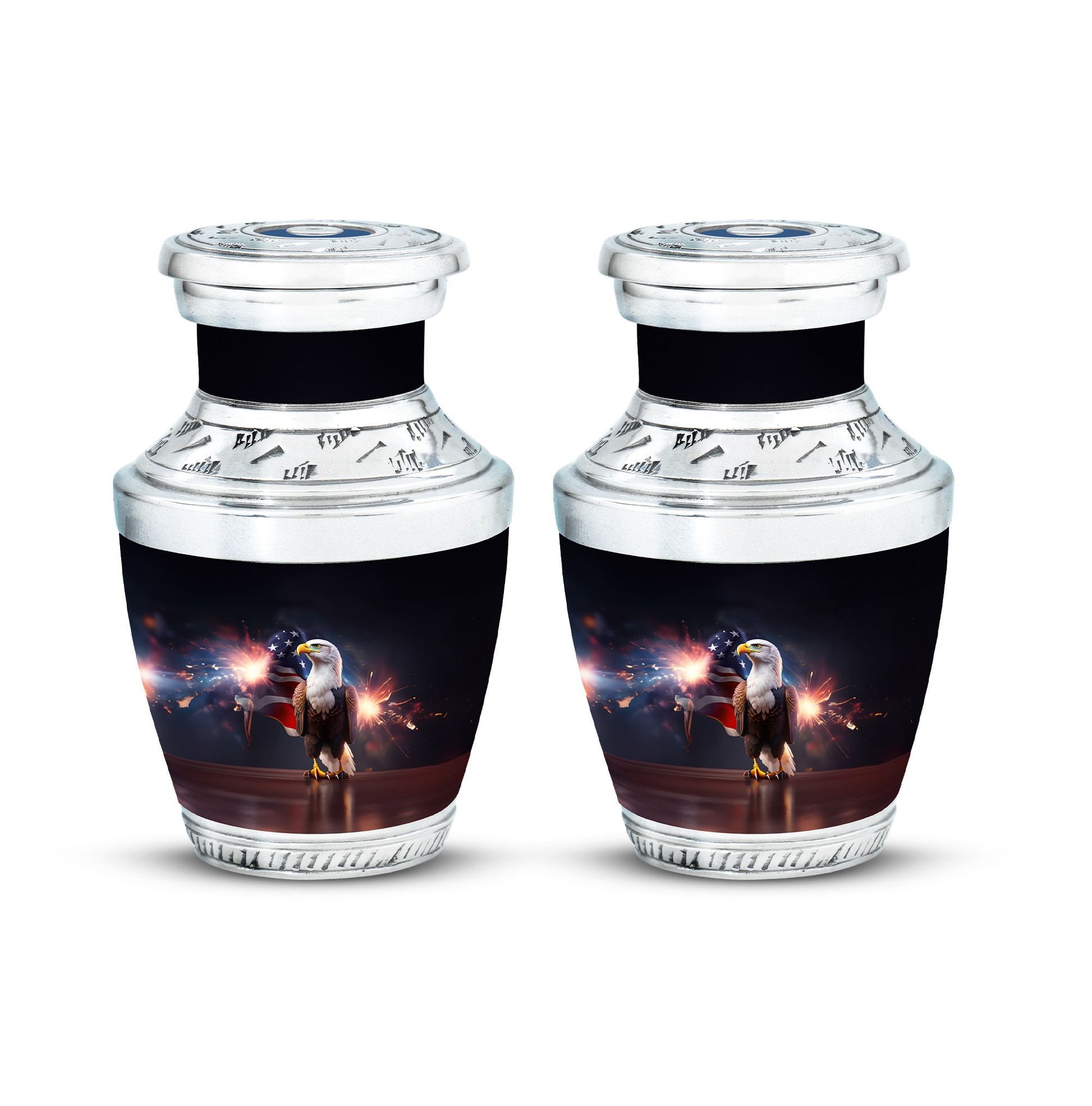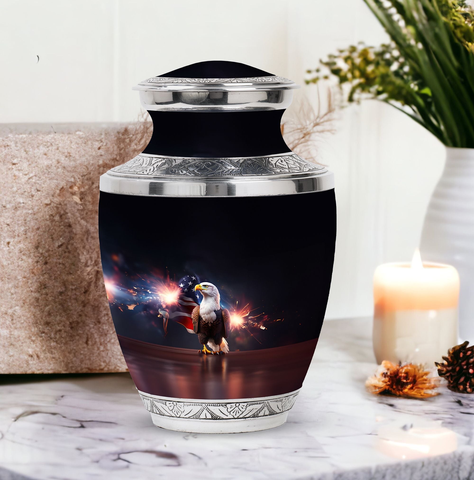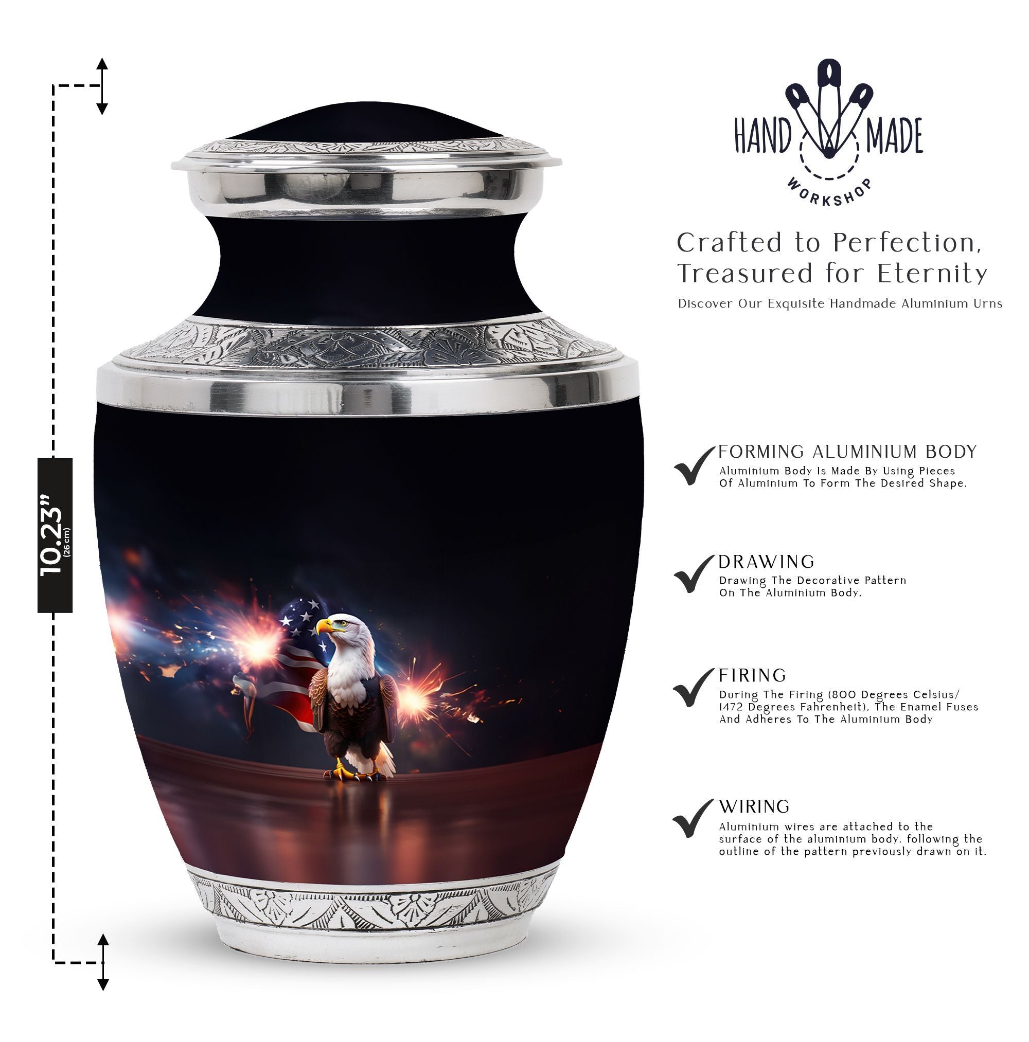 Pay a fitting tribute to your departed loved ones with our Large Eagle Urns for ashes, uniquely crafted for adults and seniors. Measuring a convenient 3 inches and weighing a solid 3.3 pounds, these memorial urns are more than just a container, they create space for remembrance and reflection. The urn's sizeable 200 cubic inch capacity ensures you can securely store the ashes, with dimensions reaching 10 inches in height. Each urn is carefully fashioned from durable aluminum, known for its long-lasting qualities, ensuring your memories stand the test of time. The package also includes a soft velvet pouch, designed specifically for the containment of ashes. Adding a touch of personal sentiment, these urns offer an option for an engraved name customization. Tailored for those seeking Metal Urns for Human Ashes, Funeral Ashes Containers, Custom Cremation Urns, or Modern Urns for Ashes, our Classic Eagle Urn offers a solemn and discreet solution for your memorial ceremony needs.