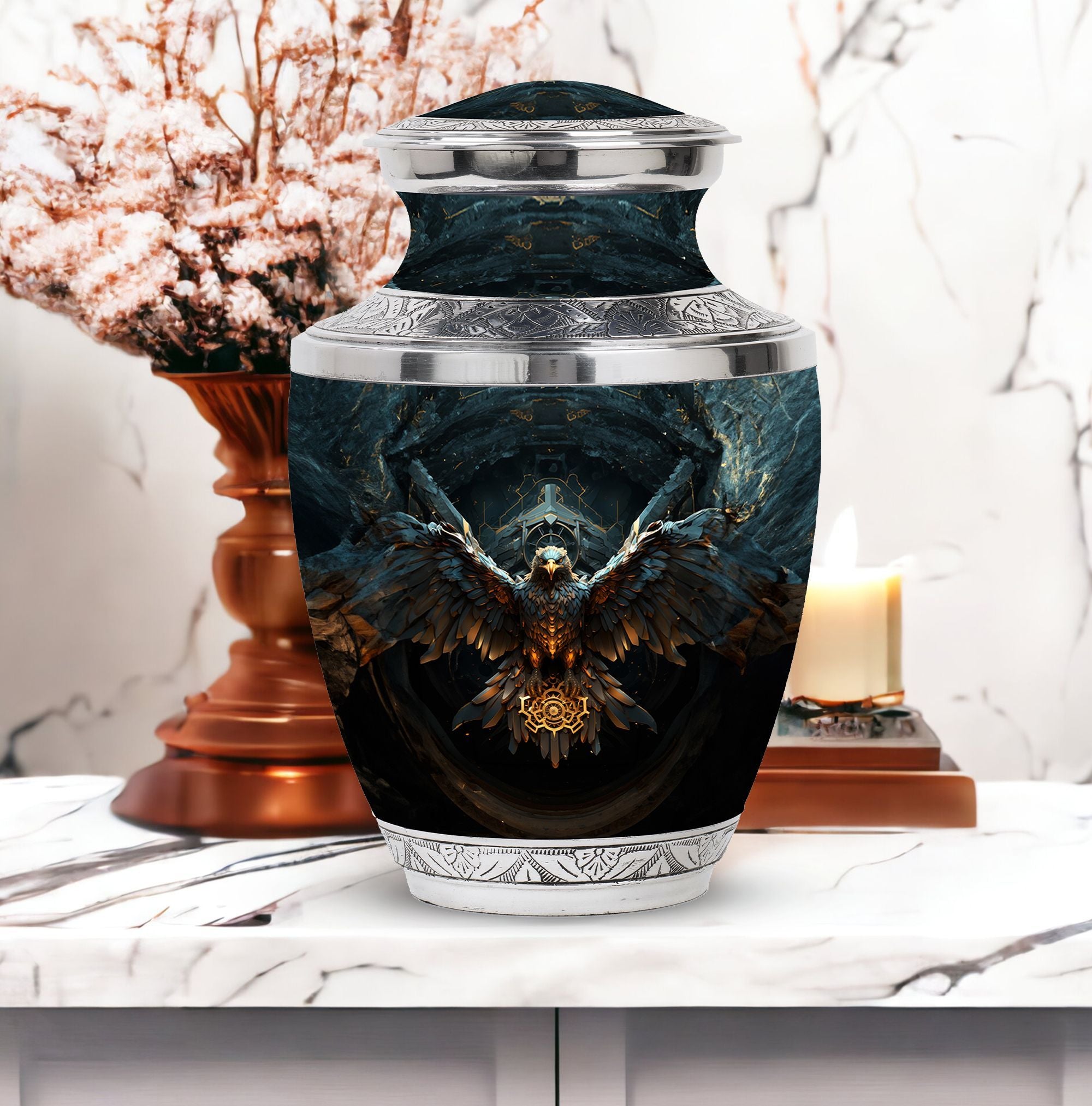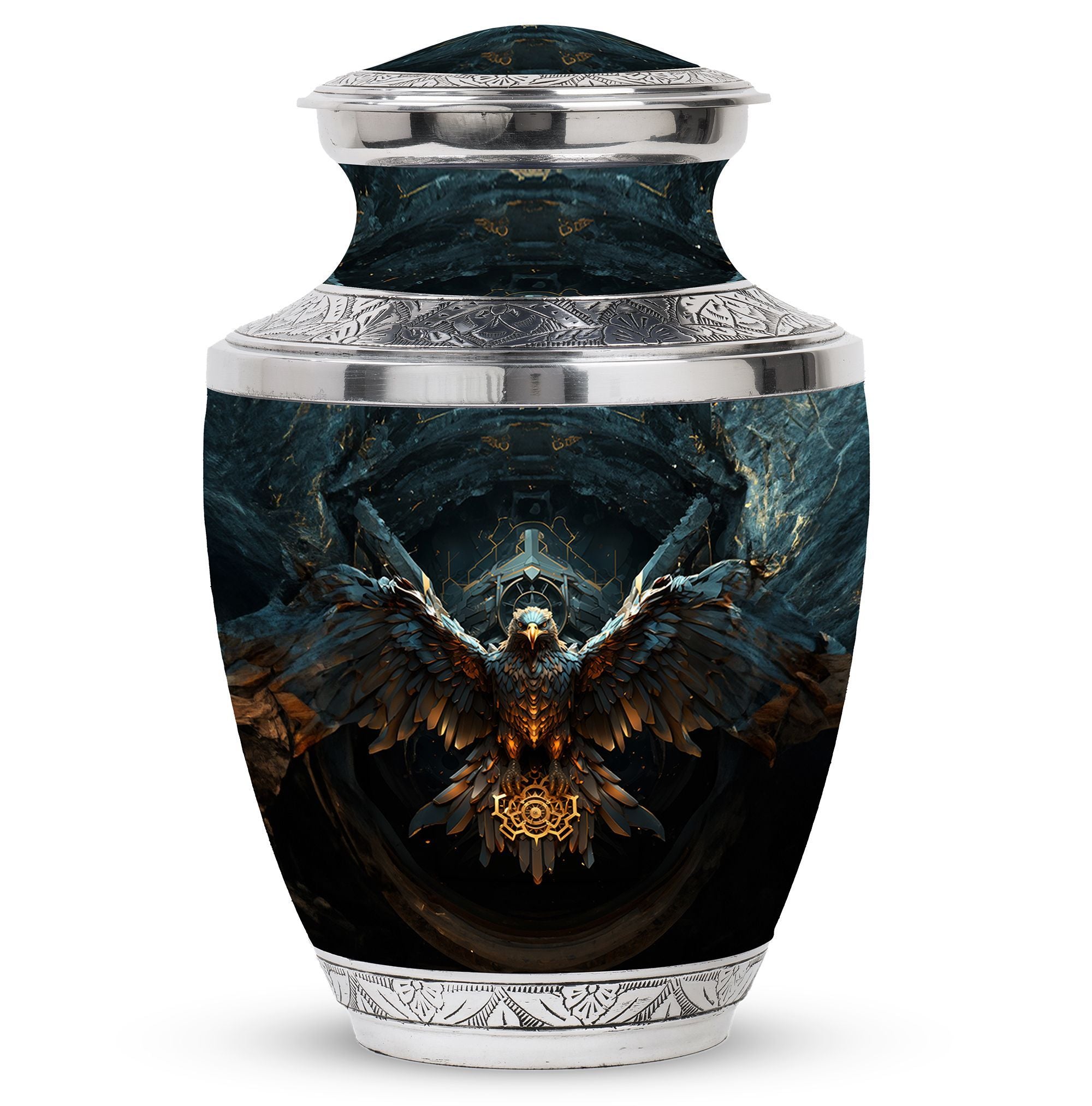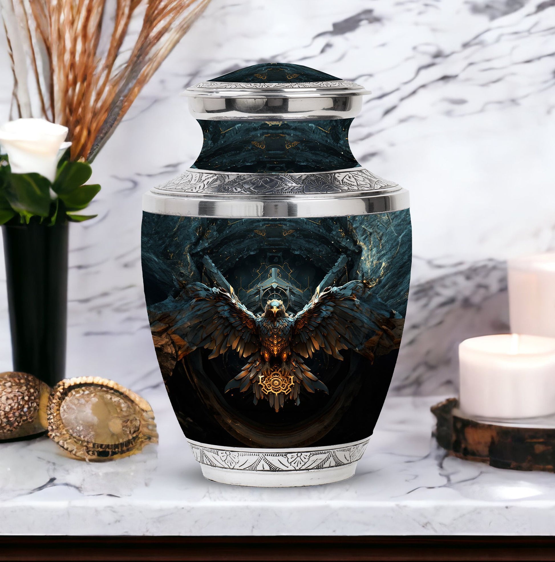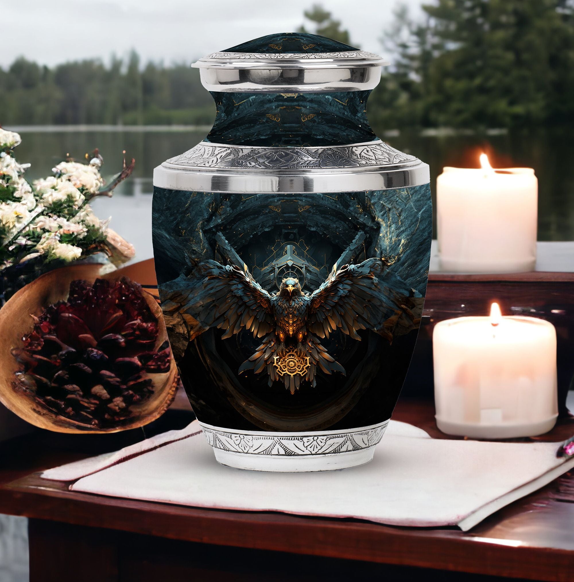 Our robust Eagle Guarding Urn is an exquisite manifestation of immense respect and love for your beloved ones. This handcrafted 3-inch Aluminium urn, known as the Classic Urn, exudes a timeless design that can fit 200 cubic inches of remains. With a substantial form of 10 inches in height and weight of 3.3 pounds, this large urn seamlessly combines practicality and aesthetics. When received, a high-quality velvet pouch for the containment and protection of the ashes is included. What makes this urn unique is the ability to personalize it - engrave the names of your loved ones, making their memory everlasting.