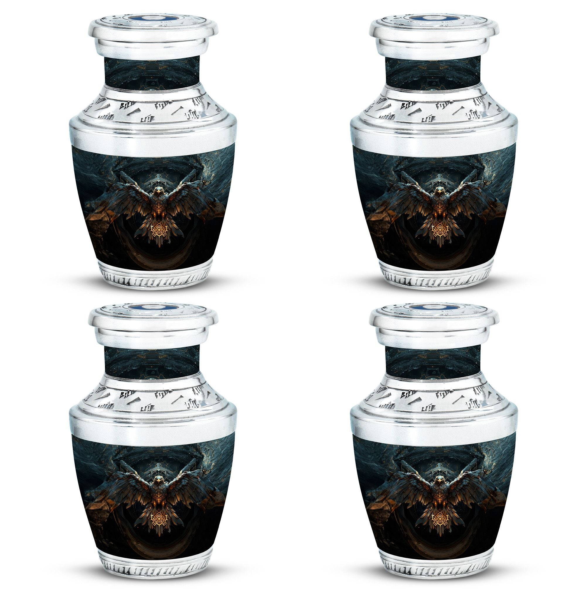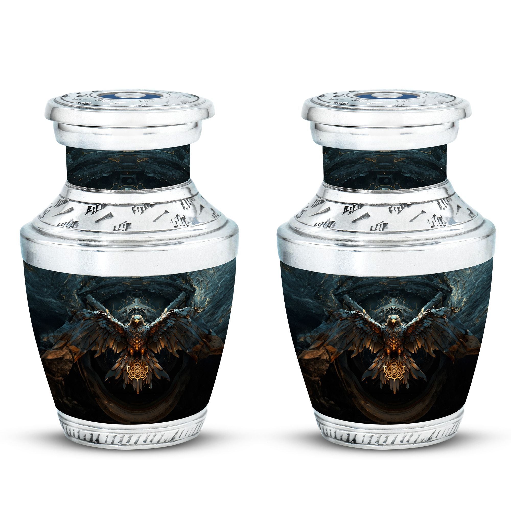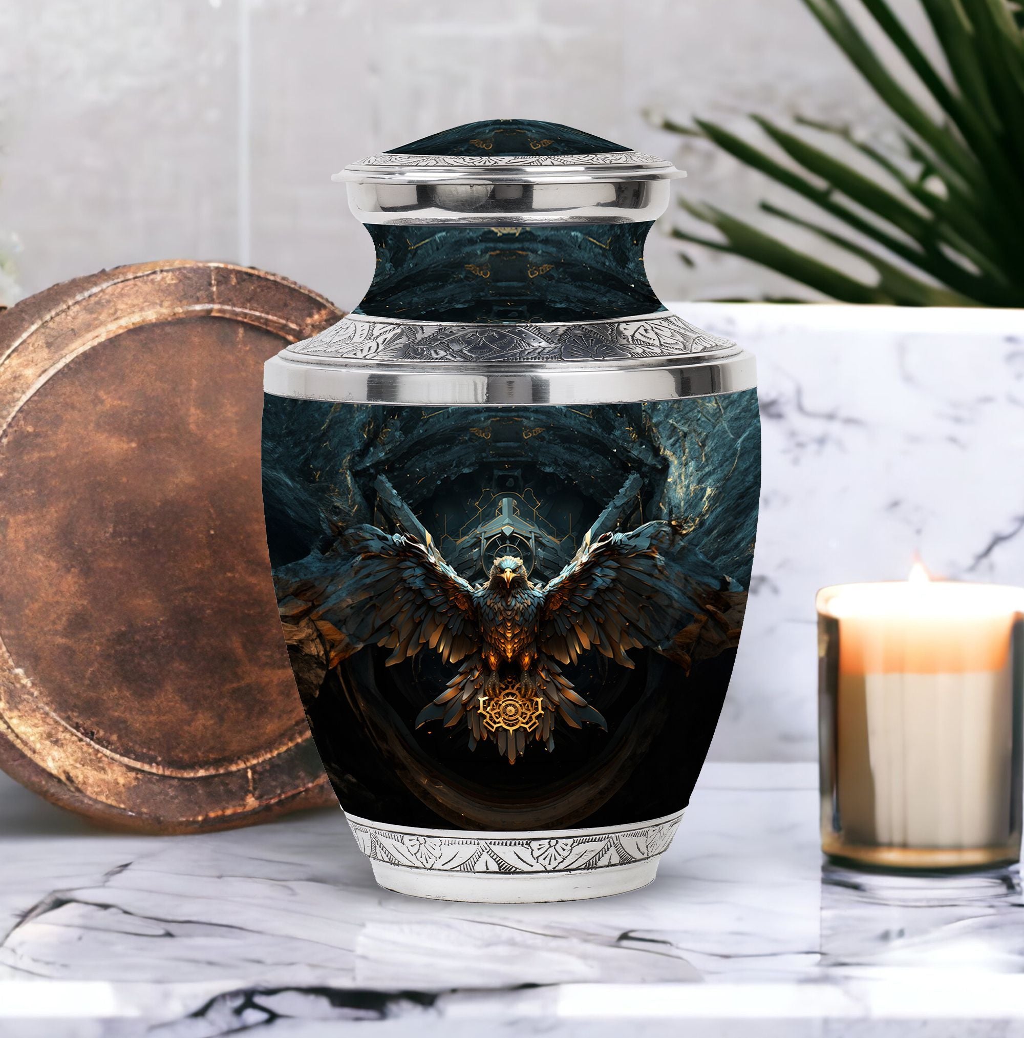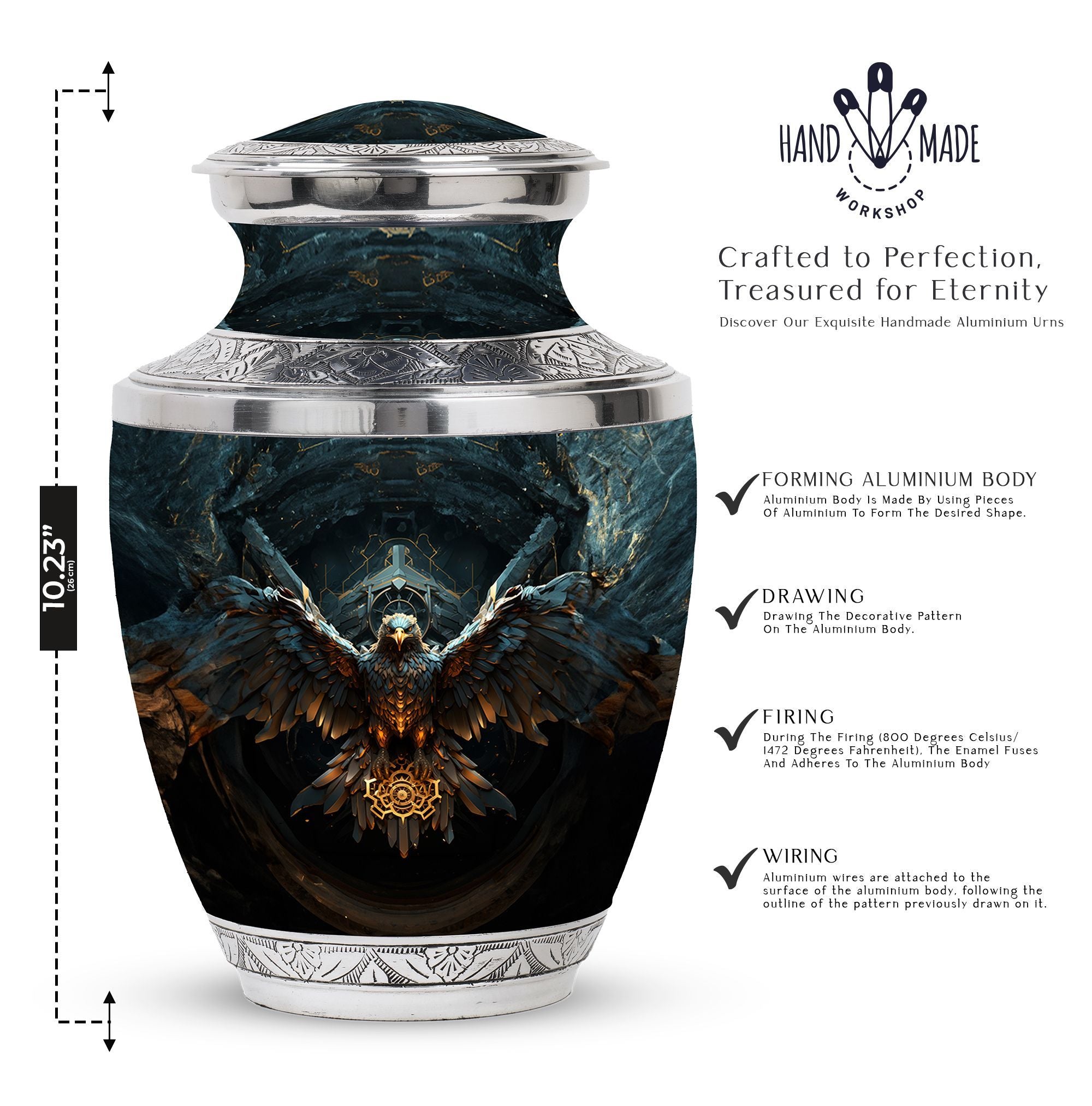 Our robust Eagle Guarding Urn is an exquisite manifestation of immense respect and love for your beloved ones. This handcrafted 3-inch Aluminium urn, known as the Classic Urn, exudes a timeless design that can fit 200 cubic inches of remains. With a substantial form of 10 inches in height and weight of 3.3 pounds, this large urn seamlessly combines practicality and aesthetics. When received, a high-quality velvet pouch for the containment and protection of the ashes is included. What makes this urn unique is the ability to personalize it - engrave the names of your loved ones, making their memory everlasting.