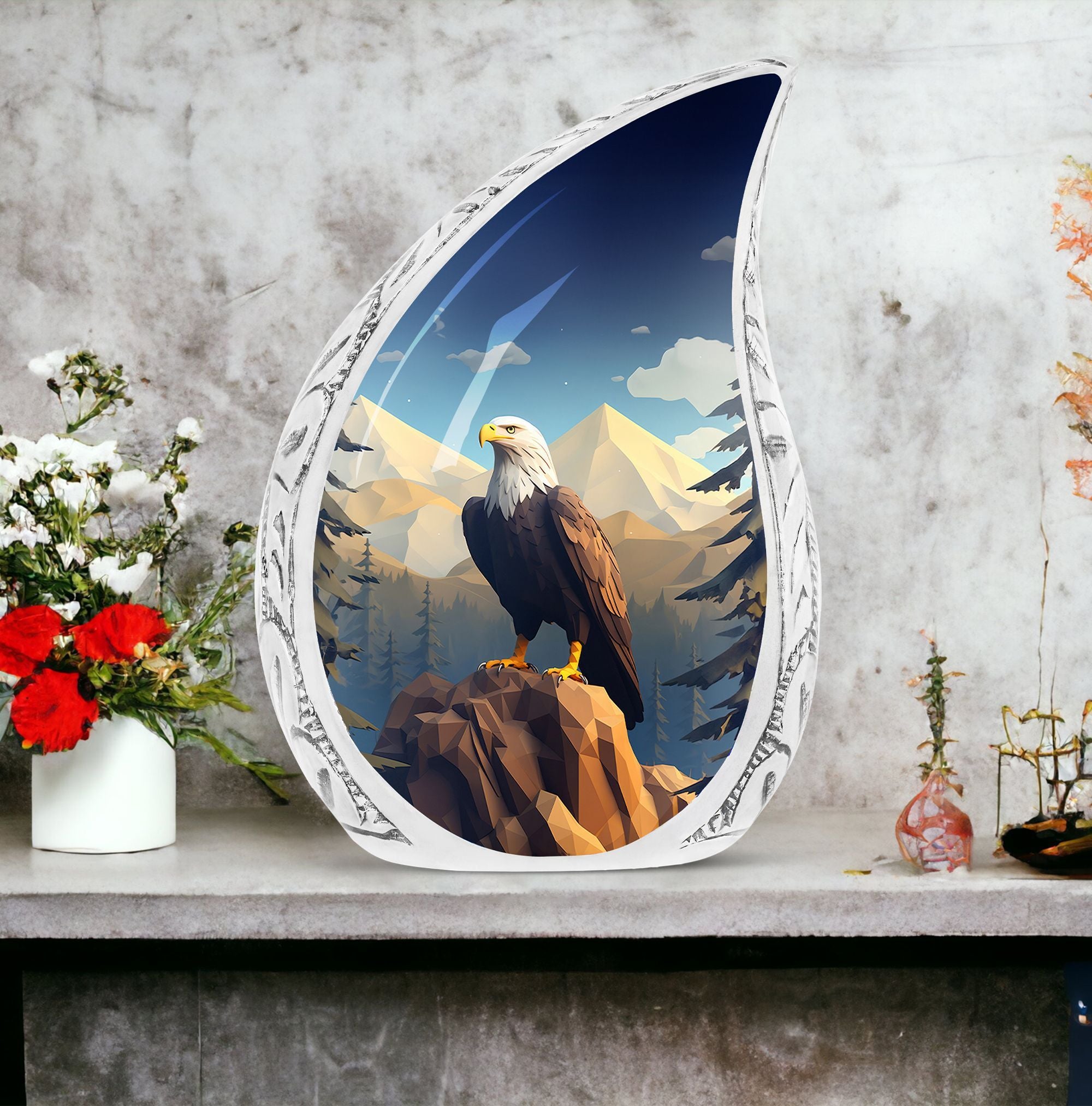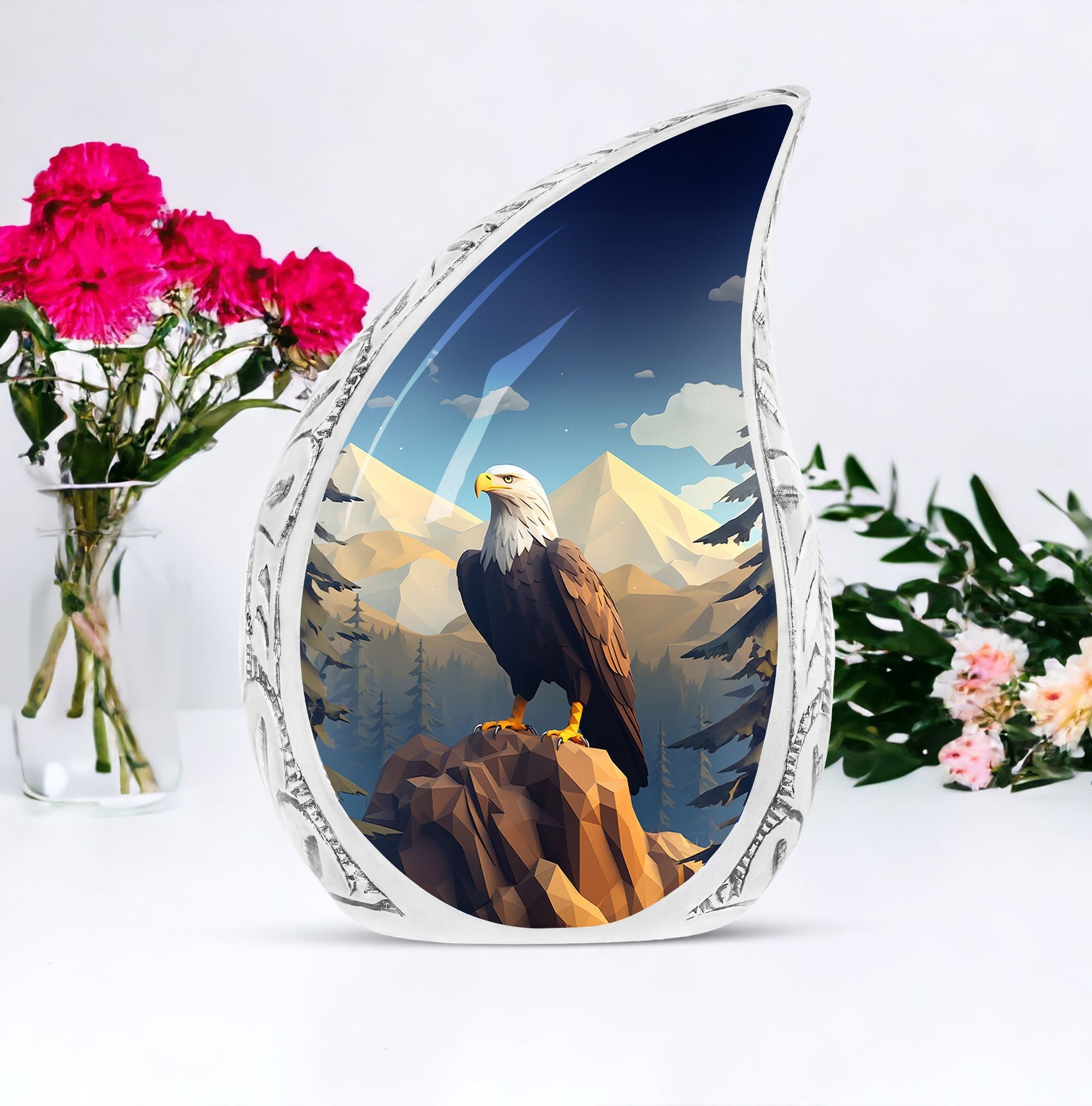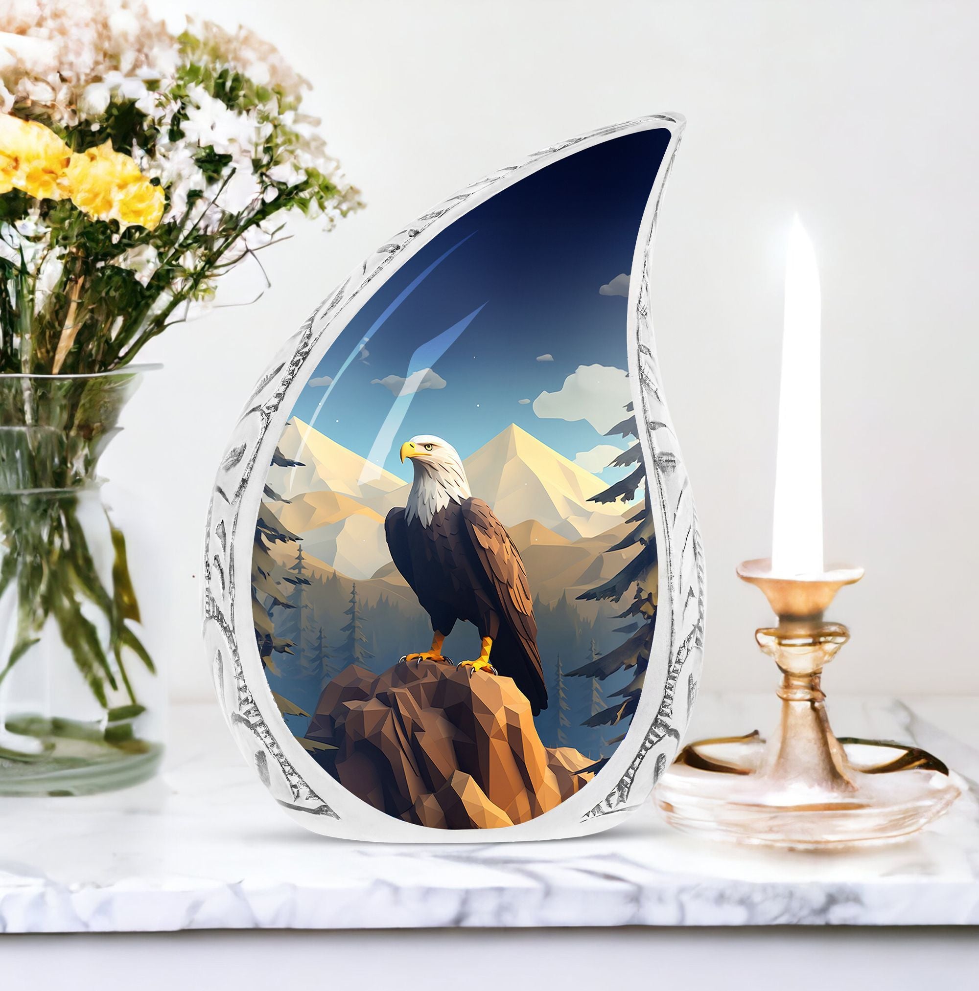 Discover the perfect expression of love, respect, and remembrance for your loved ones embarking on their final journey. Our 'Eagle in Mountains Cremation Urn'- a large urn, majestically stands at 10 inches in height, encapsulating the essence of serenity and strength. Made from fine-quality aluminium, this 3-inch urn is surprisingly lightweight at 3.3 pounds, making it effortlessly portable, yet enduring enough for long-term storage. This urn's capacity of 200 cubic inches assures ample space for preserving your loved one’s ashes. With an added option for personalizing with engraved names, the urn not only serves as a cherished possession but also aids in the healing process as you feel a piece of your loved one always with you. The package also includes a tasteful velvet pouch, offering an elegant containment for the ashes. Ideal for adults and seniors, aiming to find solace amid the storm of grief, 'Eagles in Mountains Cremation Urn' serves as a comforting reminder of the warmth and memories shared with their loved ones. Explore our range of 'memorial urns' to find the right token of love for your departed.