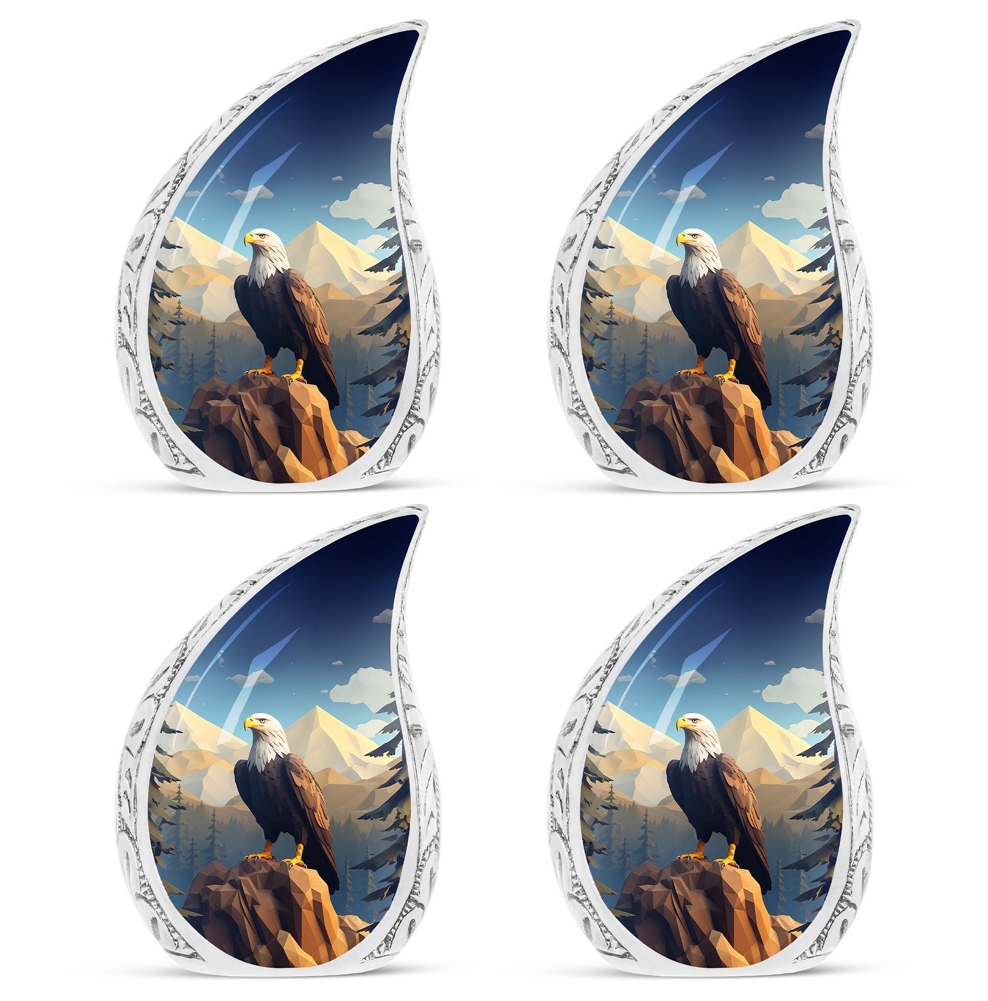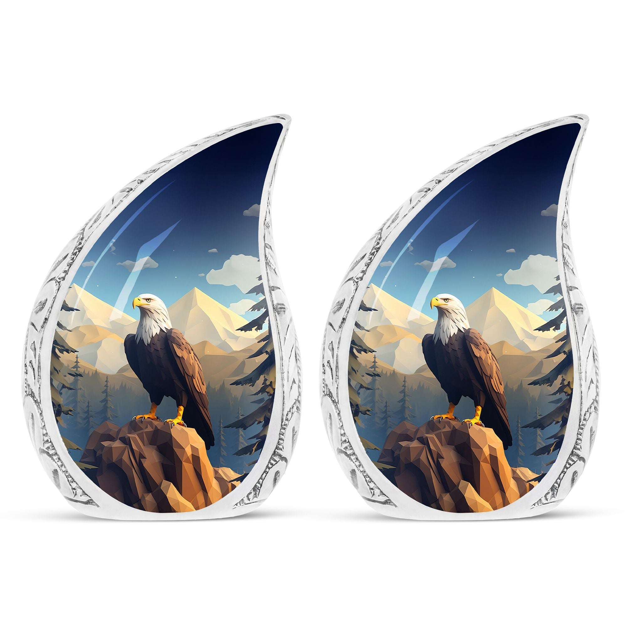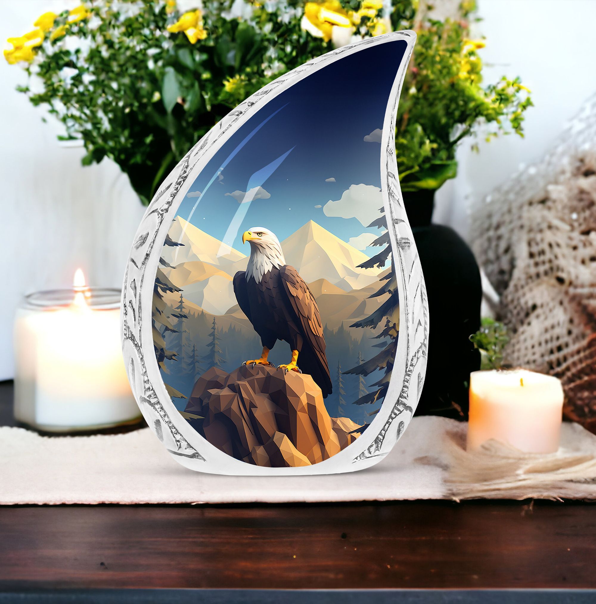 Discover the perfect expression of love, respect, and remembrance for your loved ones embarking on their final journey. Our 'Eagle in Mountains Cremation Urn'- a large urn, majestically stands at 10 inches in height, encapsulating the essence of serenity and strength. Made from fine-quality aluminium, this 3-inch urn is surprisingly lightweight at 3.3 pounds, making it effortlessly portable, yet enduring enough for long-term storage. This urn's capacity of 200 cubic inches assures ample space for preserving your loved one’s ashes. With an added option for personalizing with engraved names, the urn not only serves as a cherished possession but also aids in the healing process as you feel a piece of your loved one always with you. The package also includes a tasteful velvet pouch, offering an elegant containment for the ashes. Ideal for adults and seniors, aiming to find solace amid the storm of grief, 'Eagles in Mountains Cremation Urn' serves as a comforting reminder of the warmth and memories shared with their loved ones. Explore our range of 'memorial urns' to find the right token of love for your departed.