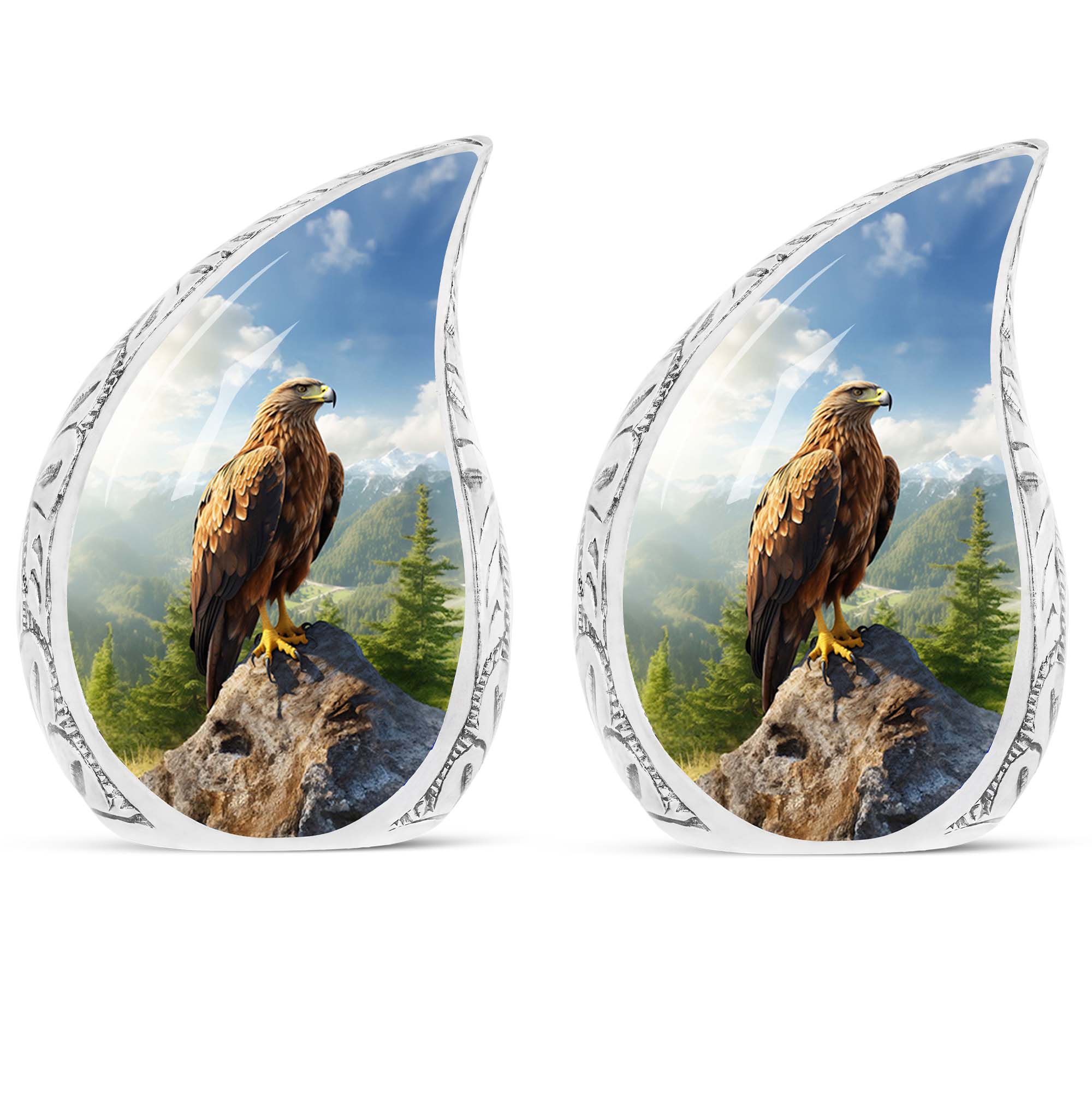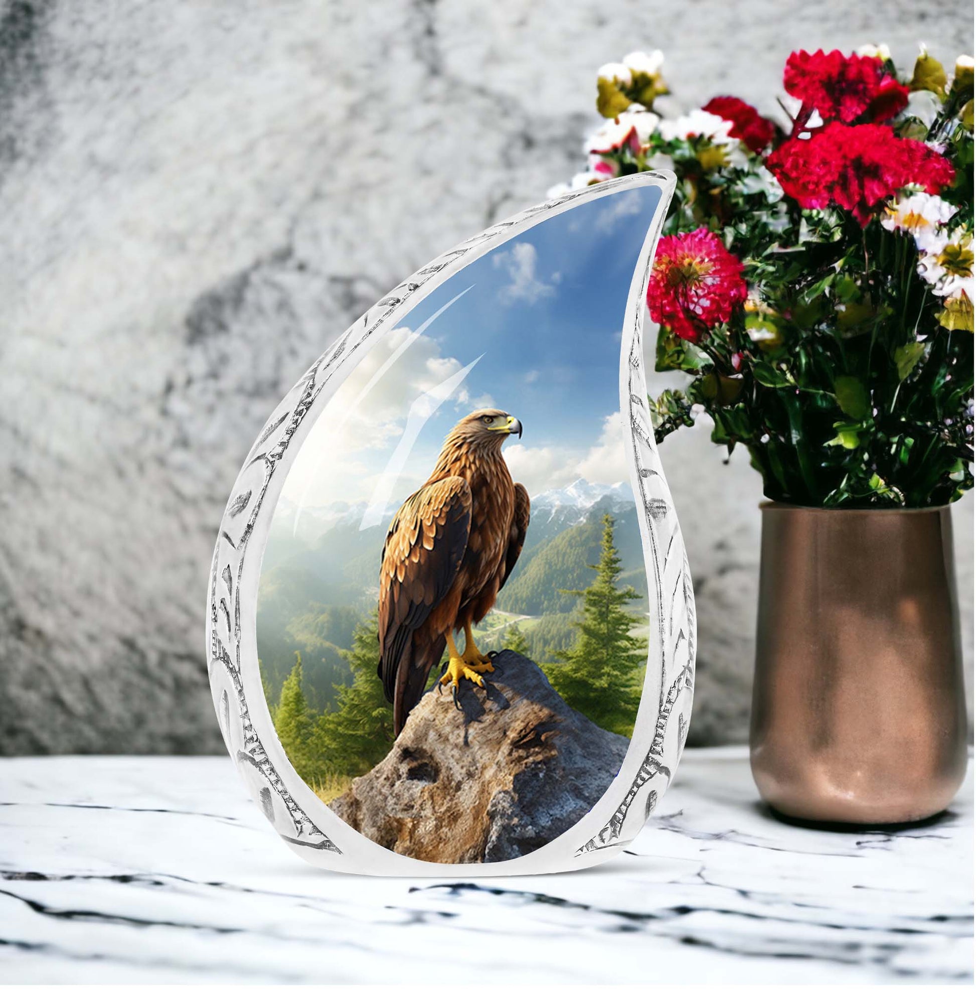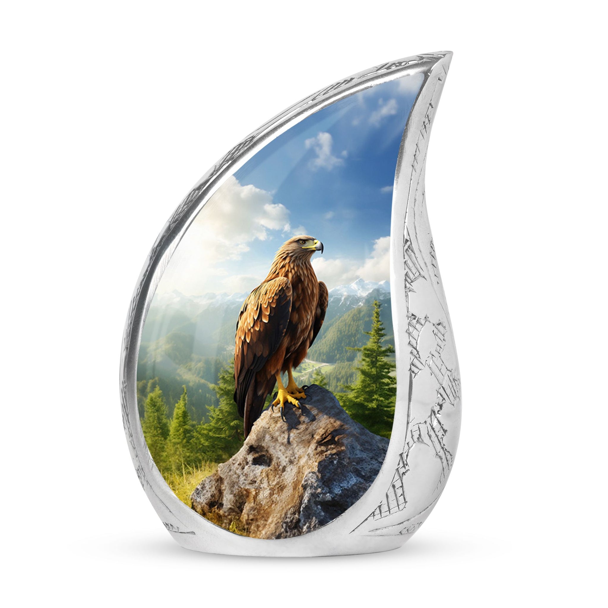 Our Eagle Memorial Urn is the perfect tribute for loved ones, comfortably holding 200 cubic inches of cremation ashes within its 10-inch aluminium structure that weighs a manageable 3.3 pounds. Carefully crafted in a revered 'Classic Urn' style, this piece is not just a cremation urn; it's a work of art which seamlessly blends with your decor. The urn comes with a comforting velvet pouch to securely stow the precious contents. We offer the possibility to make this Large Urn even more special by personalizing it with engraved names, making it truly unique. Straying from traditional terminology,