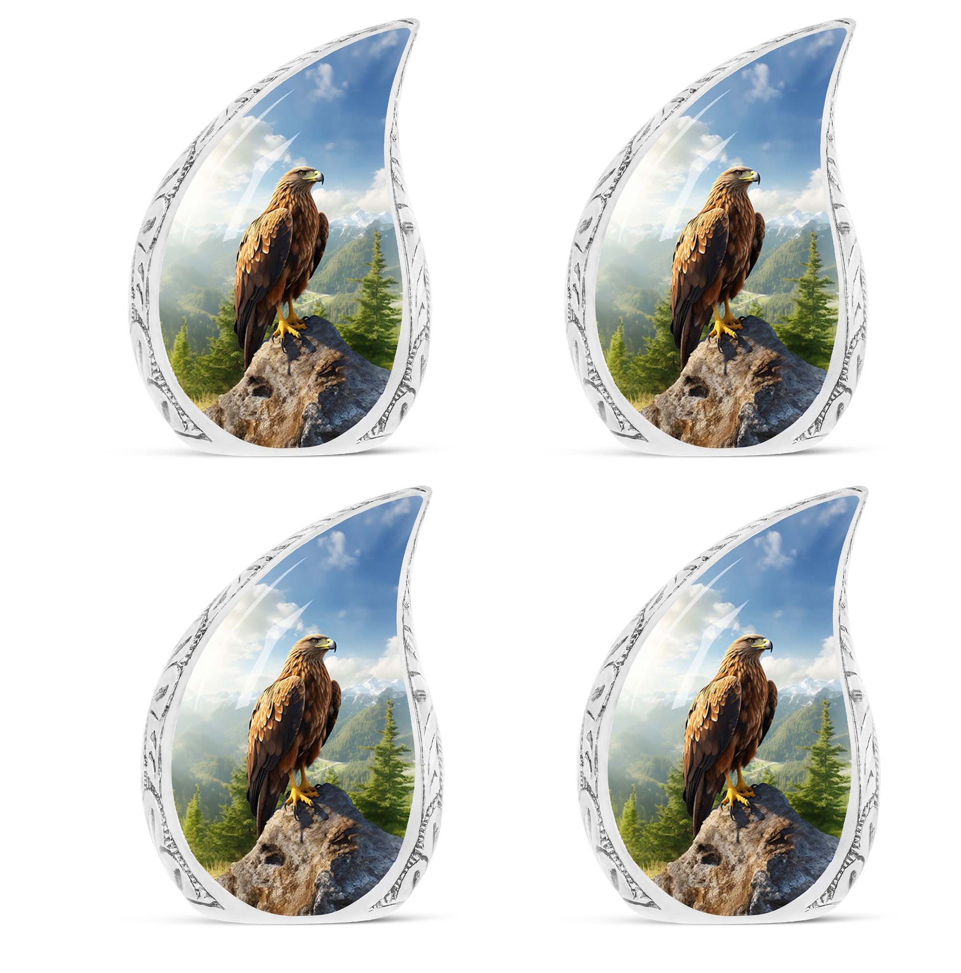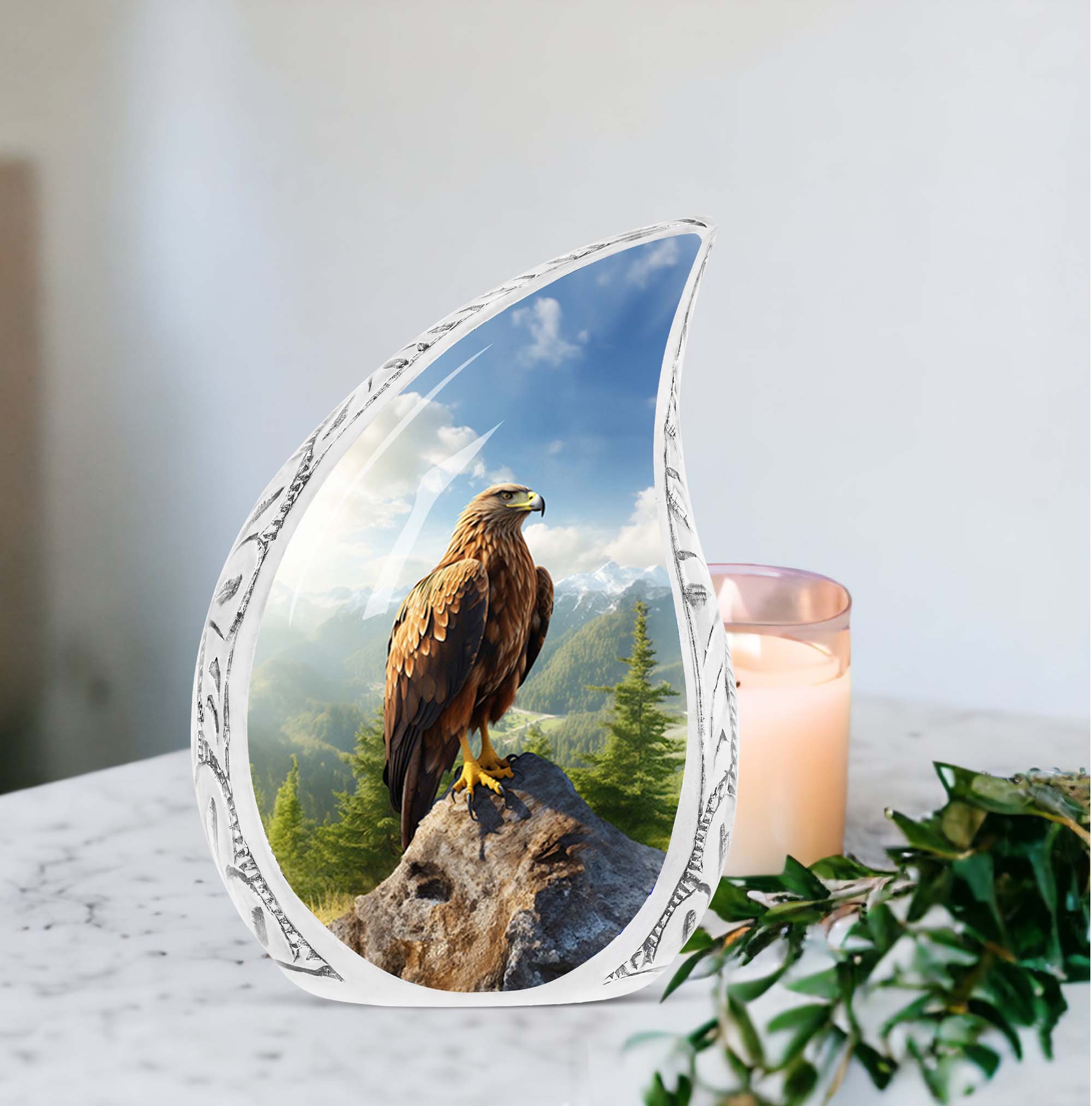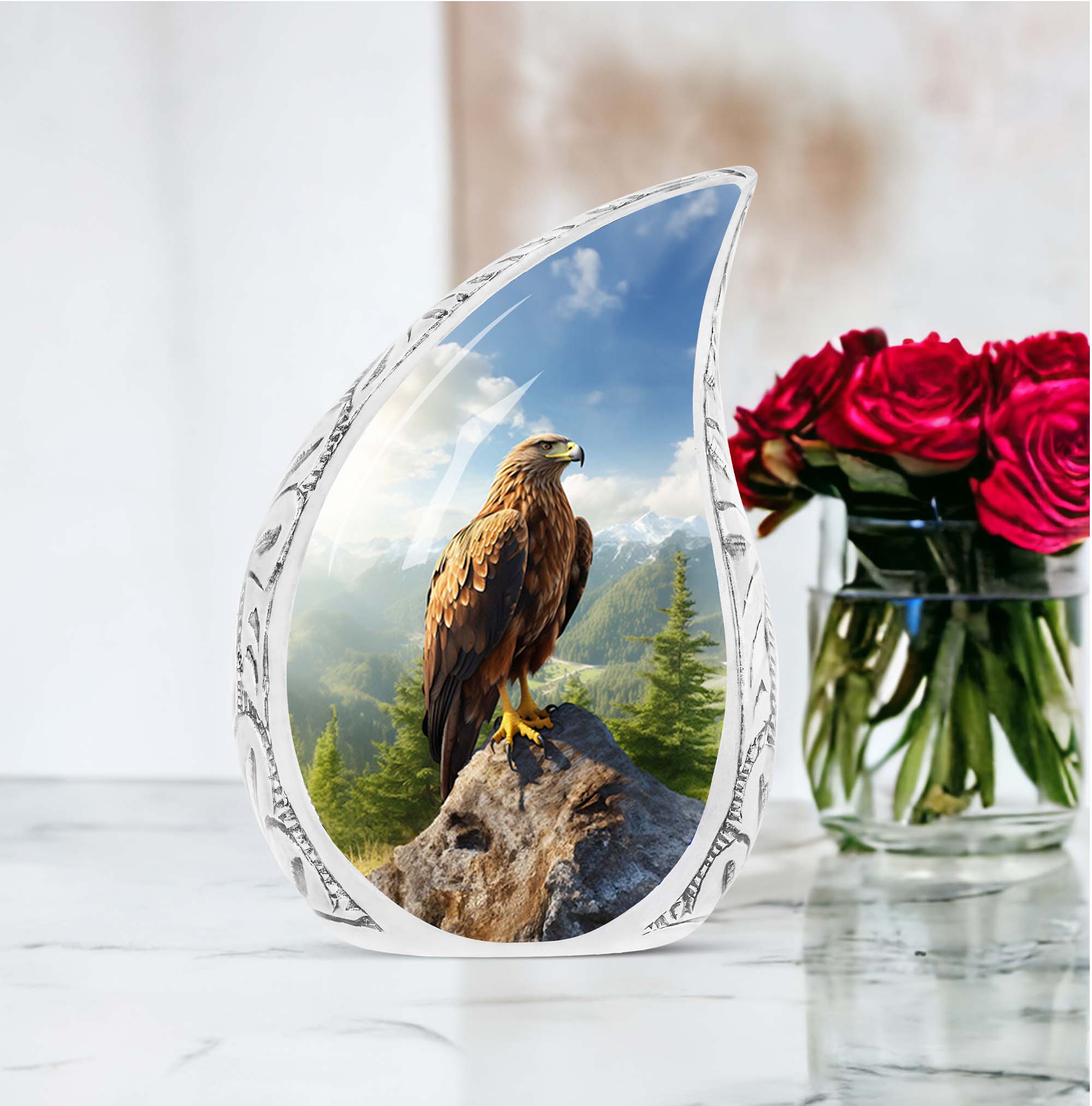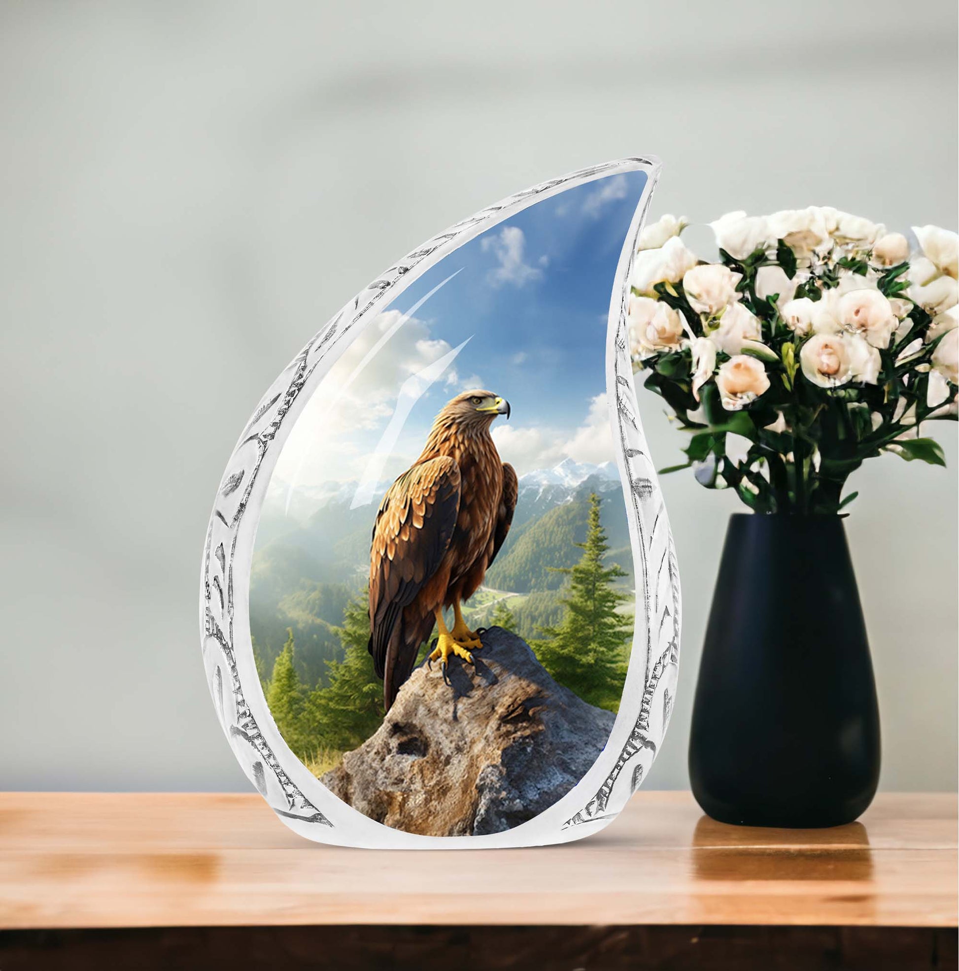 Our Eagle Memorial Urn is the perfect tribute for loved ones, comfortably holding 200 cubic inches of cremation ashes within its 10-inch aluminium structure that weighs a manageable 3.3 pounds. Carefully crafted in a revered 'Classic Urn' style, this piece is not just a cremation urn; it's a work of art which seamlessly blends with your decor. The urn comes with a comforting velvet pouch to securely stow the precious contents. We offer the possibility to make this Large Urn even more special by personalizing it with engraved names, making it truly unique. Straying from traditional terminology,
