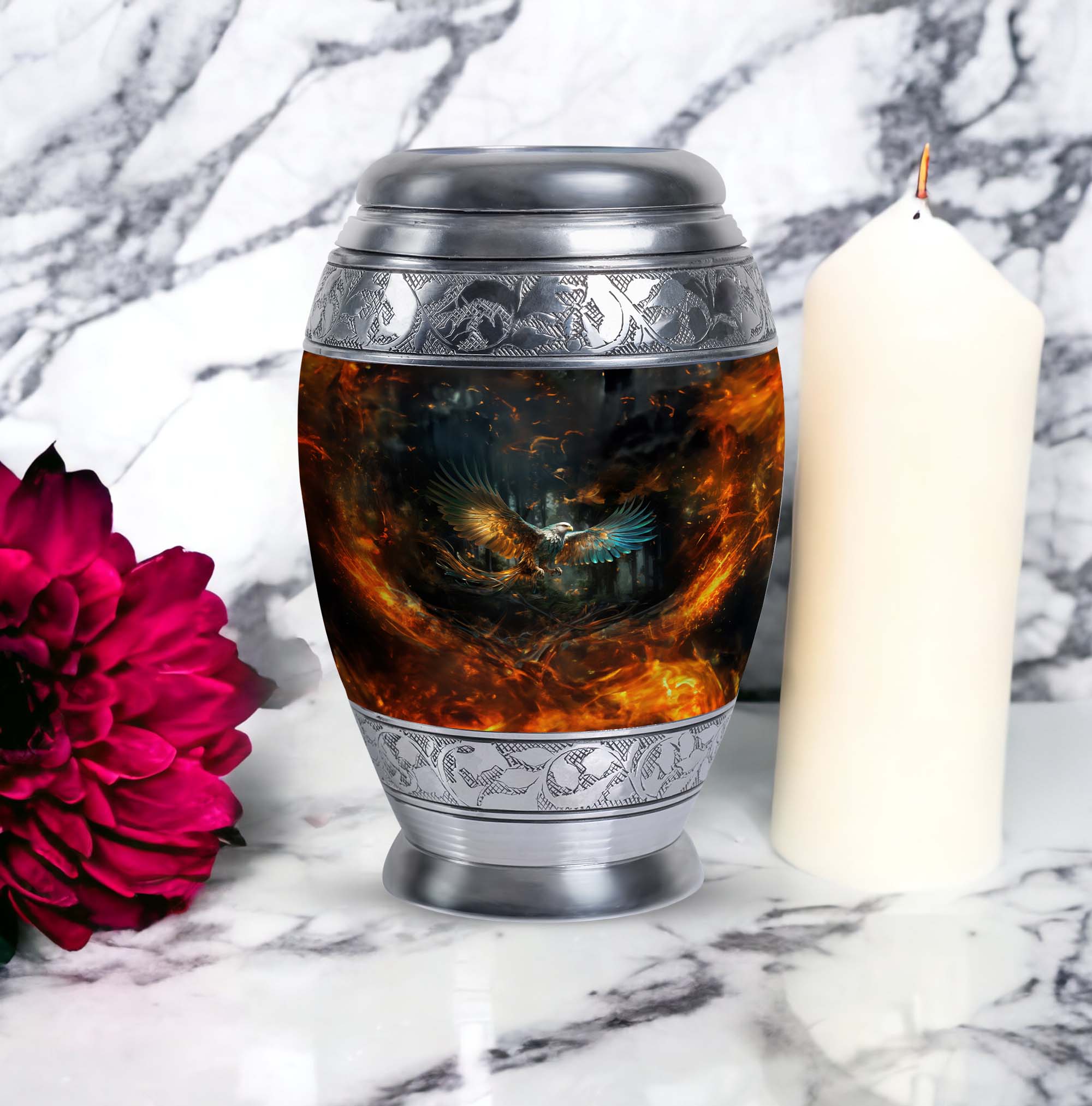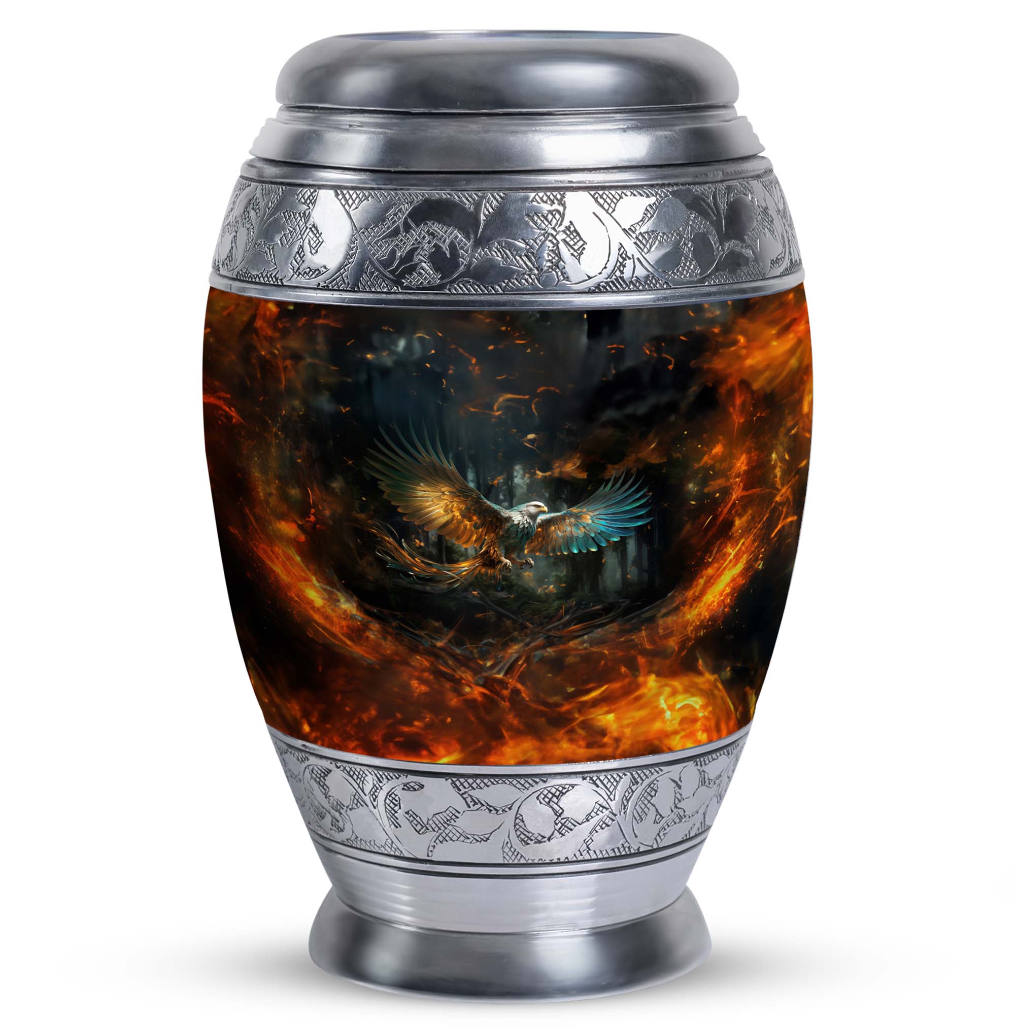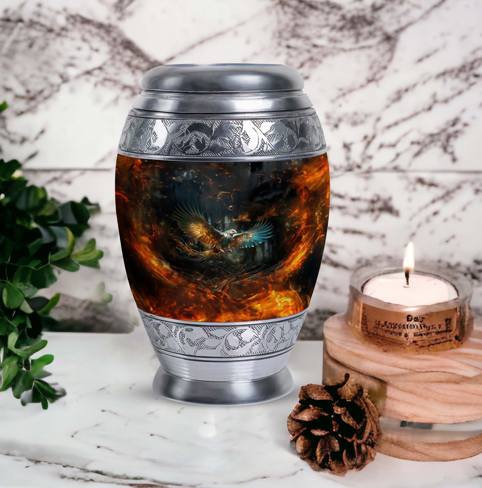 The Eagle Memorial Urn, intricately crafted from robust aluminium, is not just a burial urn for ashes, but a beautiful vessel that encapsulates precious memories. With a commanding height of 10 inches and a weight of 3.3 pounds, this classic urn is distinctively large. It offers ample space with a capacity of 200 cubic inches, allowing you to securely preserve the mortal remains of your cherished one. The urn comes complemented with a soft velvet pouch for containment of ashes, adding an extra layer of protection, while also enhancing the overall presentation. For a special touch, you have the freedom to personalize this modern urn with engraved names, making it a unique tribute to those deeply missed. Compact in size at just 3 inches, this personalised urn will comfortably fit in your chosen spot. Remember, it's more than just an urn for cremation – it's a testament to the life lived. Uncommonly beautiful, the Eagle Memorial Urn is a remarkable blend of utility and aesthetics.