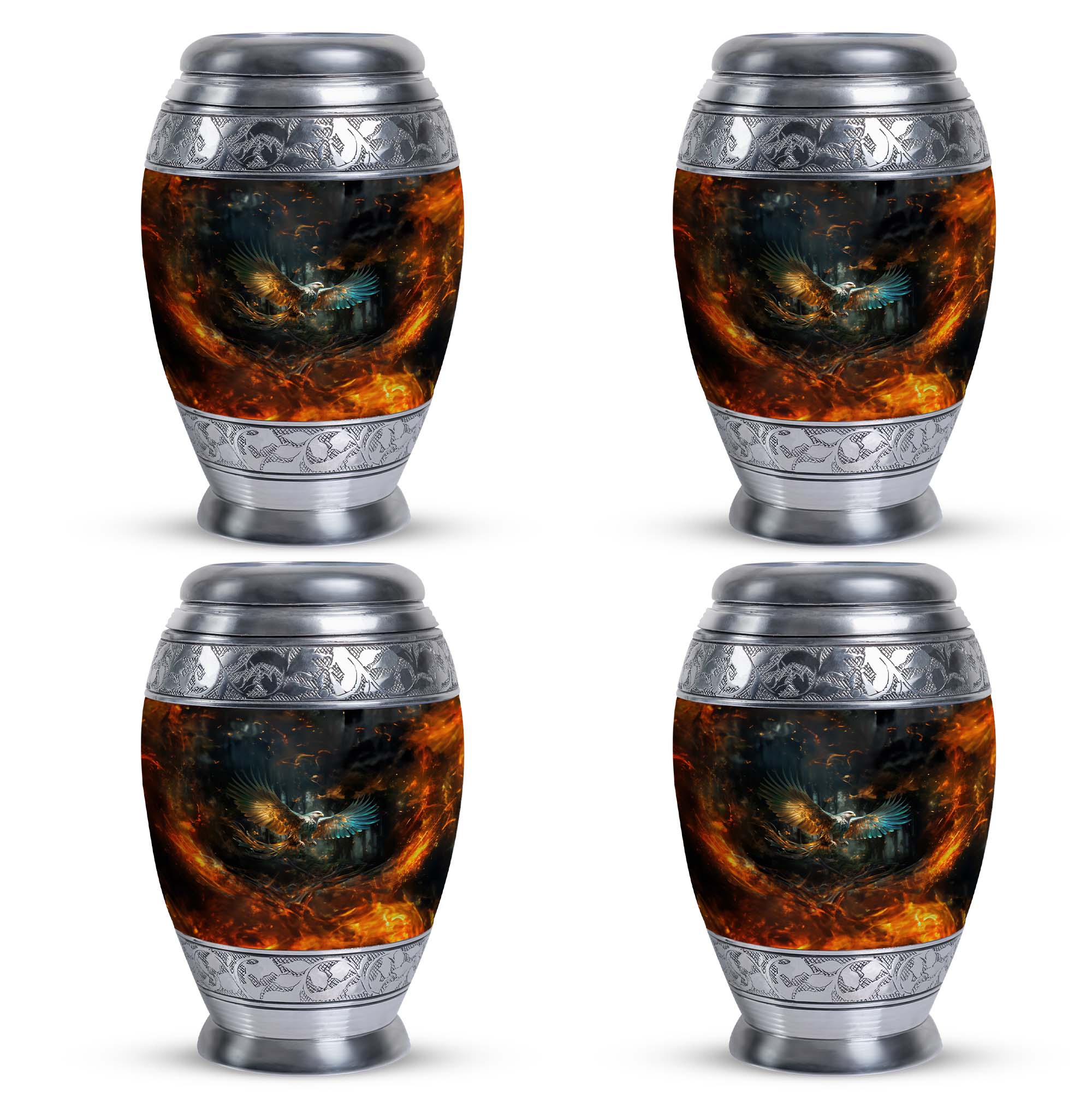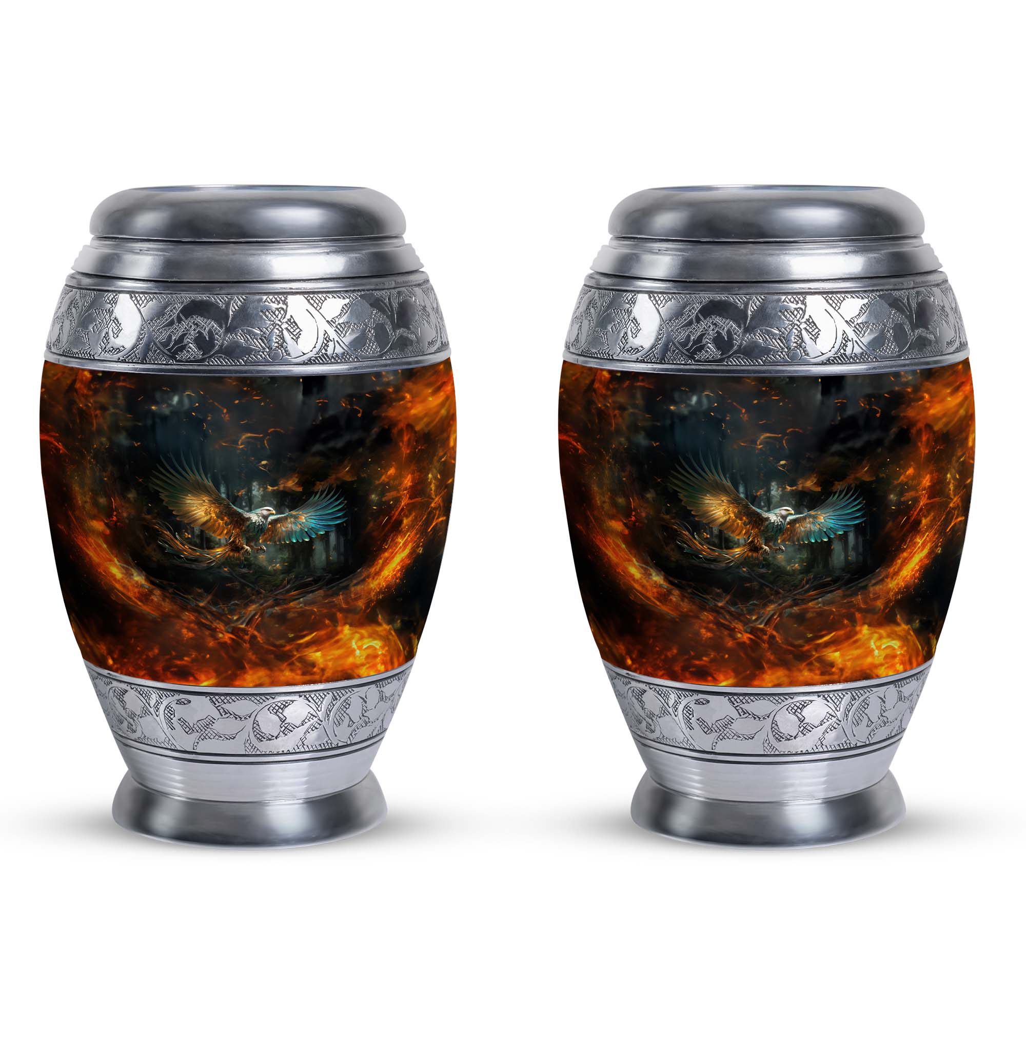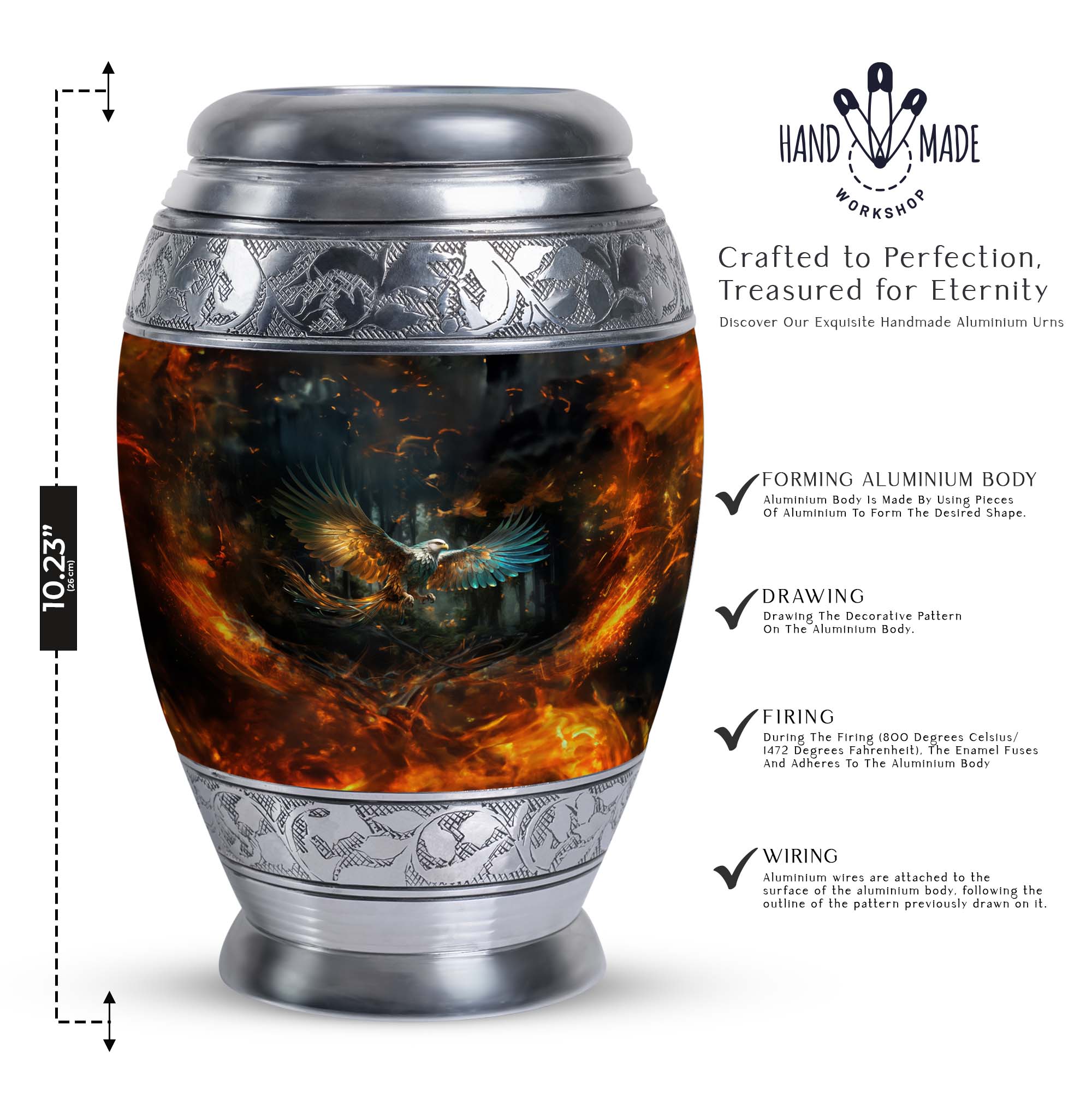The Eagle Memorial Urn, intricately crafted from robust aluminium, is not just a burial urn for ashes, but a beautiful vessel that encapsulates precious memories. With a commanding height of 10 inches and a weight of 3.3 pounds, this classic urn is distinctively large. It offers ample space with a capacity of 200 cubic inches, allowing you to securely preserve the mortal remains of your cherished one. The urn comes complemented with a soft velvet pouch for containment of ashes, adding an extra layer of protection, while also enhancing the overall presentation. For a special touch, you have the freedom to personalize this modern urn with engraved names, making it a unique tribute to those deeply missed. Compact in size at just 3 inches, this personalised urn will comfortably fit in your chosen spot. Remember, it's more than just an urn for cremation – it's a testament to the life lived. Uncommonly beautiful, the Eagle Memorial Urn is a remarkable blend of utility and aesthetics.