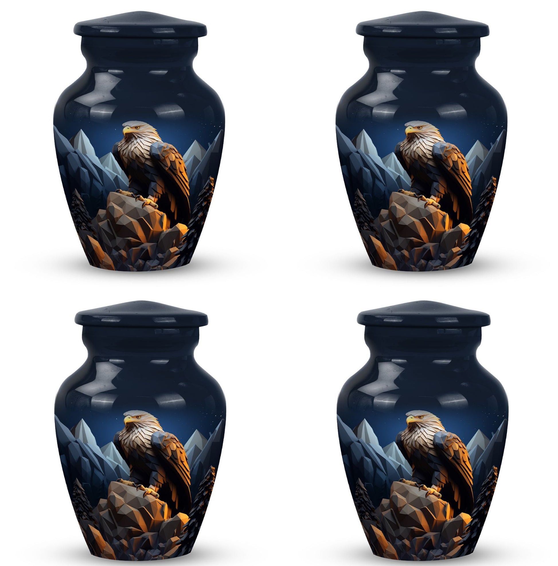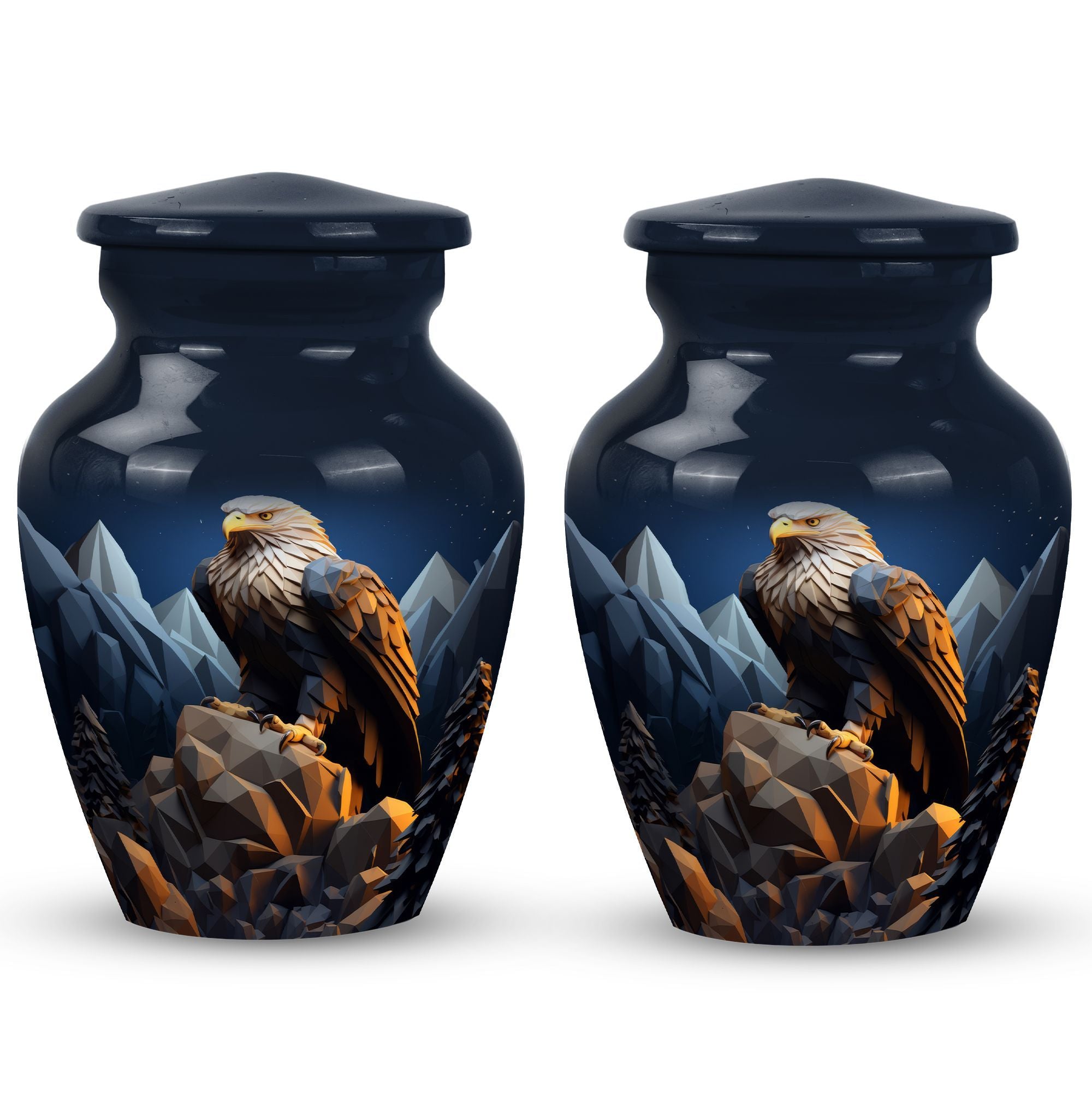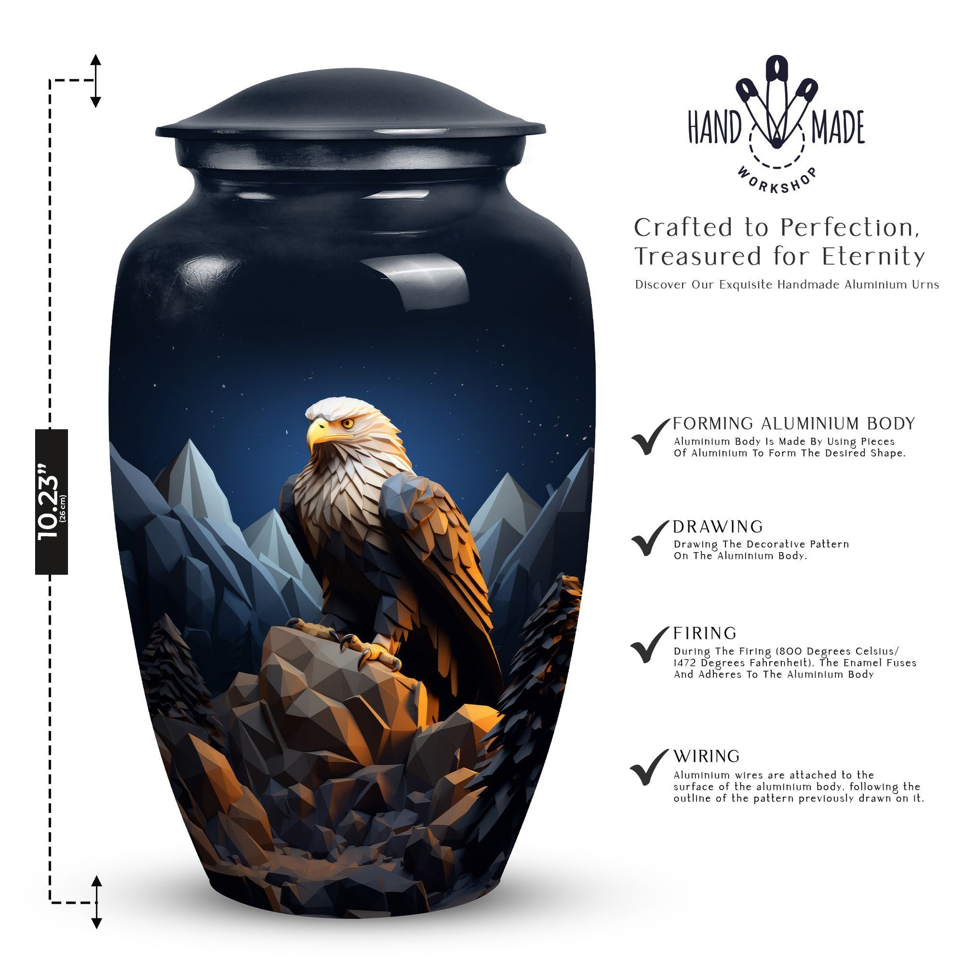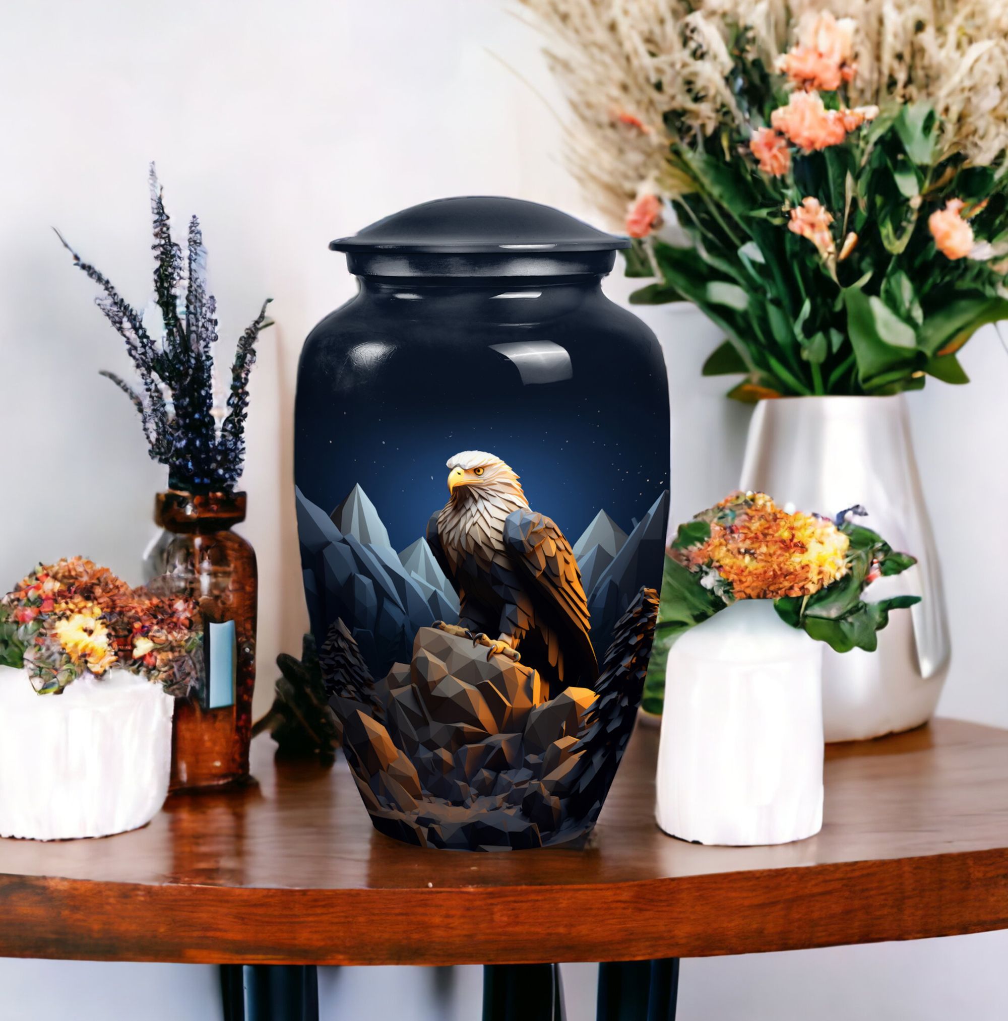 The Eagle Memorial Urn is an exceptional choice amongst large urns for those seeking a dignified receptacle for the ashes of a loved one. Manufactured from robust yet lightweight aluminium, this urn has a net weight of 3.3 pounds and measures 10 inches in height. Reflecting its ample size, it boasts a capacity of 200 cubic inches, making it suitable for the ashes of adults and seniors. Each purchase of the Eagle Memorial Urn arrives complete with a velvet pouch for the containment and protection of ashes, underscoring the respect and care this product offers. Personalize this cremation urn by engraving names onto it – a meaningful touch for a loved one's memorial. Appreciated for its subdued yet elegant 'Classic Urn' design, this cremation urn is not only a considerate choice for in-tearment but also as a decorative urn for human ashes in your home. This product reaffirms your affection and remembrance whether you're looking for 'Urns for Dad', 'Cremation Urns for Burial', or an addition to your choice of commemorative keepsakes.