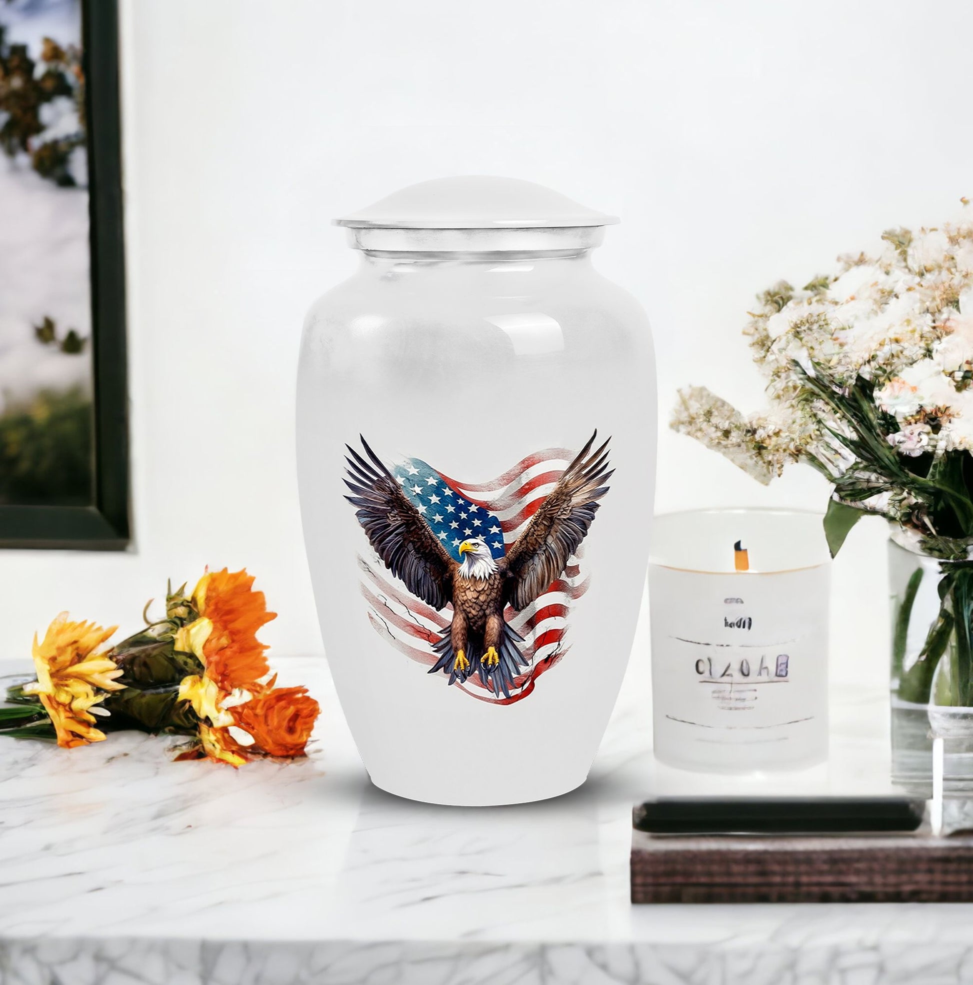 Discover the dignified elegance of our 3-inch Eagle Urns, an essential item for those seeking memorial urns that encapsulate the timeless essence of remembrance. We offer a substantial size of large urns, at 10 inches in height and weighing a substantial 3.3 pounds. Each urn is constructed of robust aluminium, ensuring a lasting tribute. This Classic Urn holds capacity up to 200 cubic inches, ideal for safely storing ashes. Additionally, these urns for human remains come complete with a soothing velvet pouch, providing a serene containment for ashes. Personalize these custom urns with engraved names, emphasizing the uniqueness of your beloved. Although custom urns are versatile, these urns are particularly suitable as Urns for Dad, adding a touch of individuality to the mourning process. Browse our collection of Eagle Urns for Human Ashes and personalised urns to honor your departed loved ones.