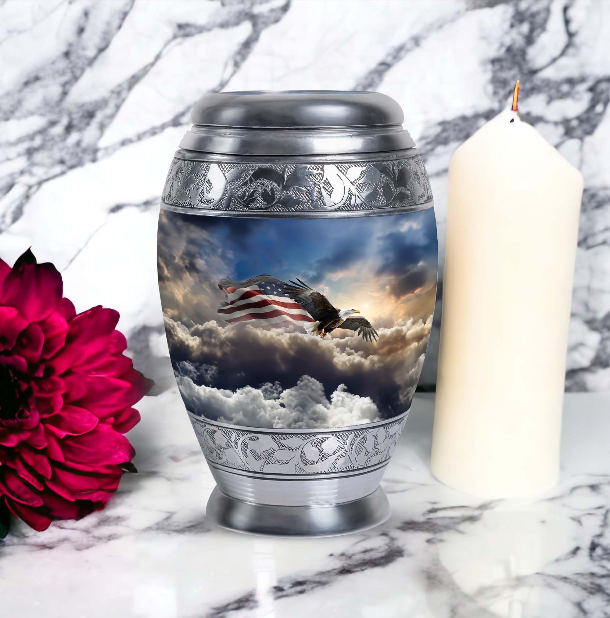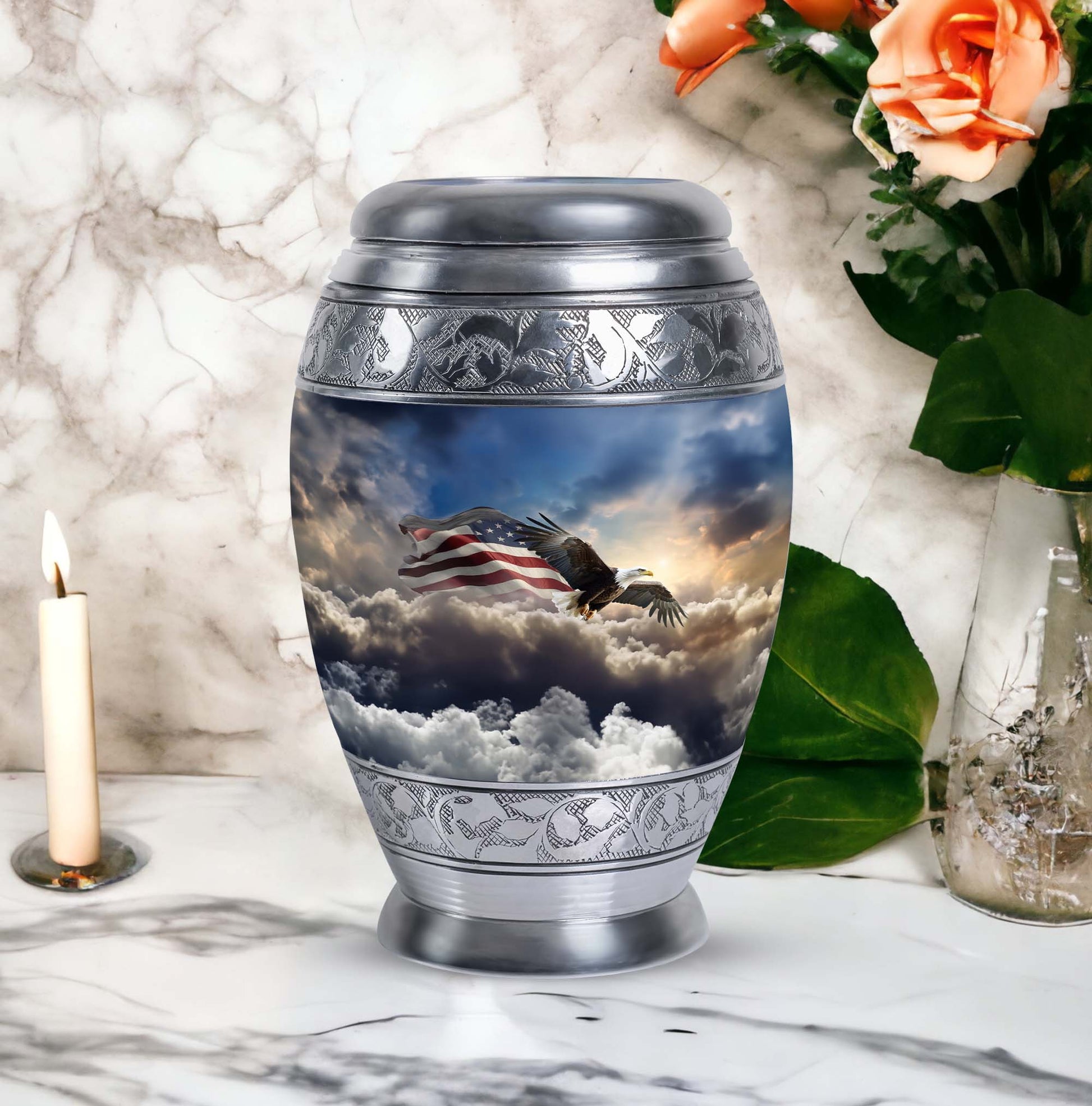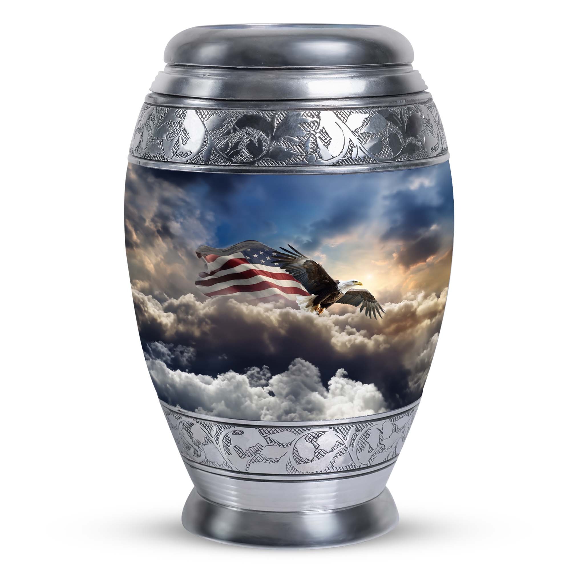 Crafted from premium aluminum, the urn features a soaring eagle set against a vivid American flag—symbolizing courage, pride, and everlasting honor. Its durable build and detailed artwork make it an ideal large urn for adult ashes, offering ample space and timeless elegance. The secure screw-top lid protects the contents, making it a fitting choice for families seeking adult urns for human ashes large, large human urns, or even a respectful large urn mom tribute.
