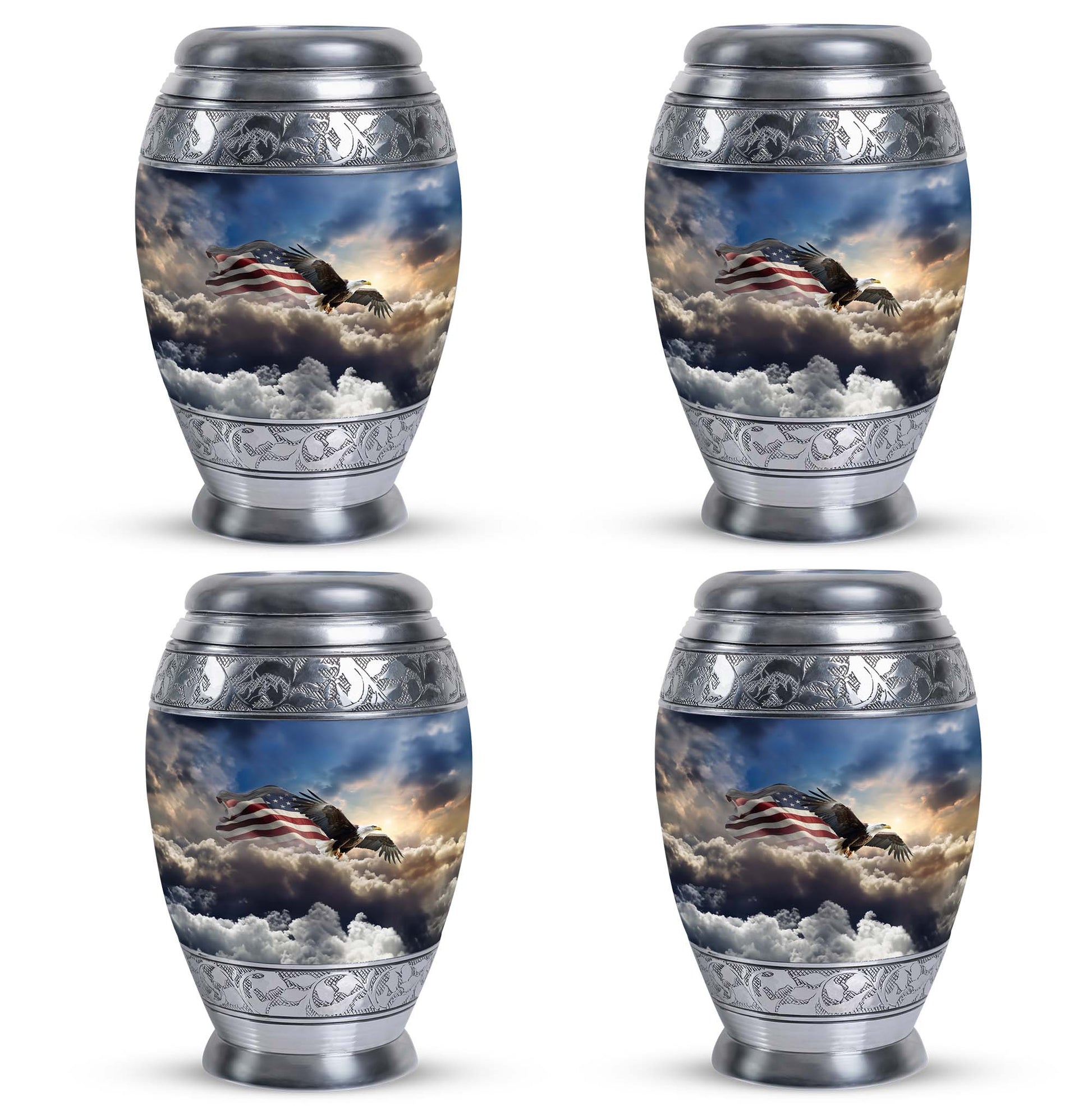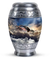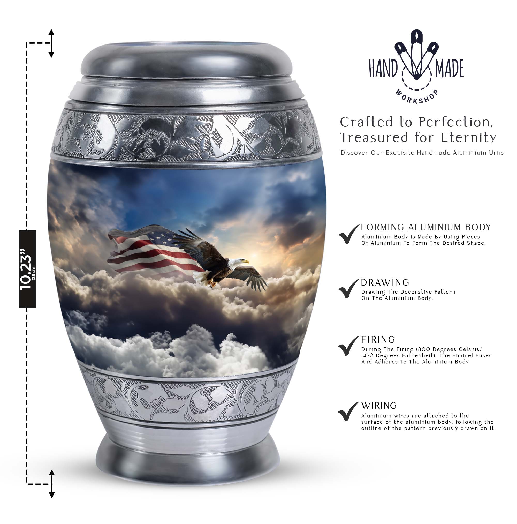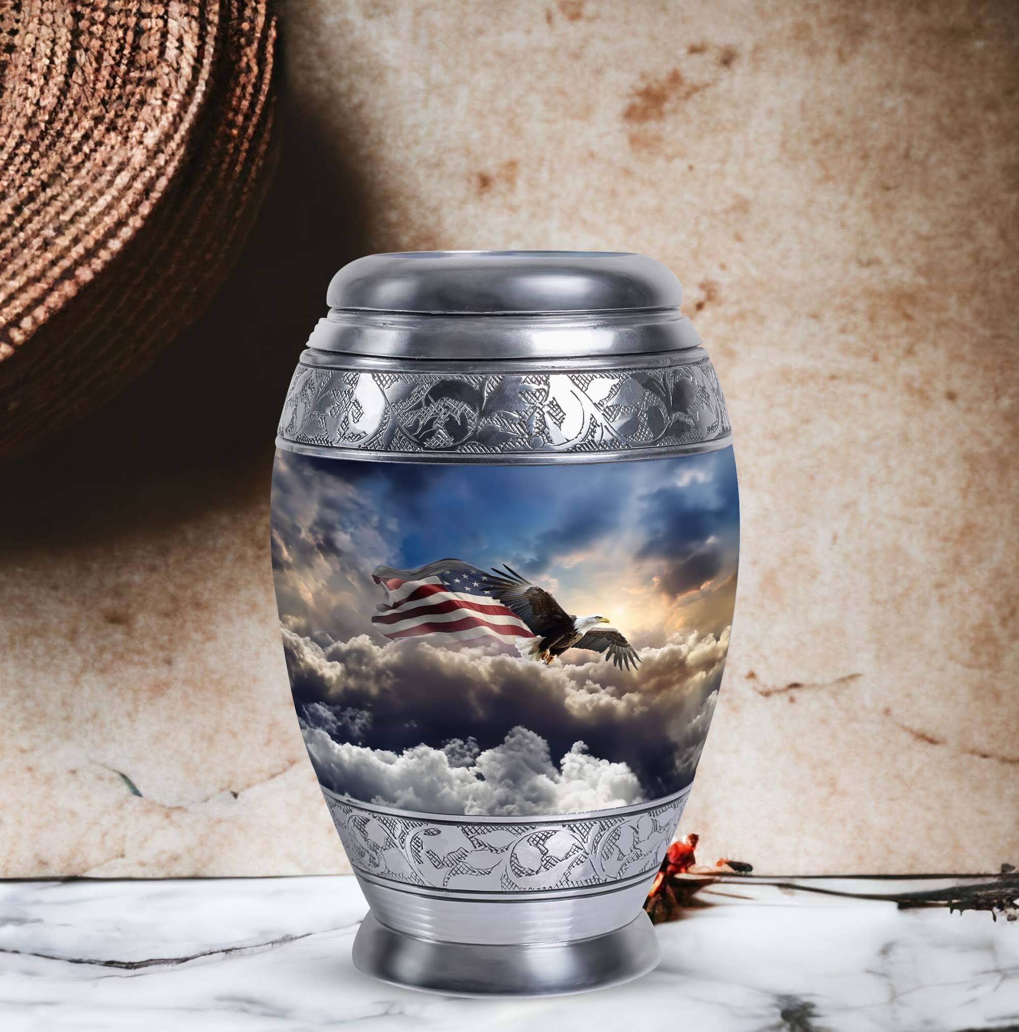 Crafted from premium aluminum, the urn features a soaring eagle set against a vivid American flag—symbolizing courage, pride, and everlasting honor. Its durable build and detailed artwork make it an ideal large urn for adult ashes, offering ample space and timeless elegance. The secure screw-top lid protects the contents, making it a fitting choice for families seeking adult urns for human ashes large, large human urns, or even a respectful large urn mom tribute.