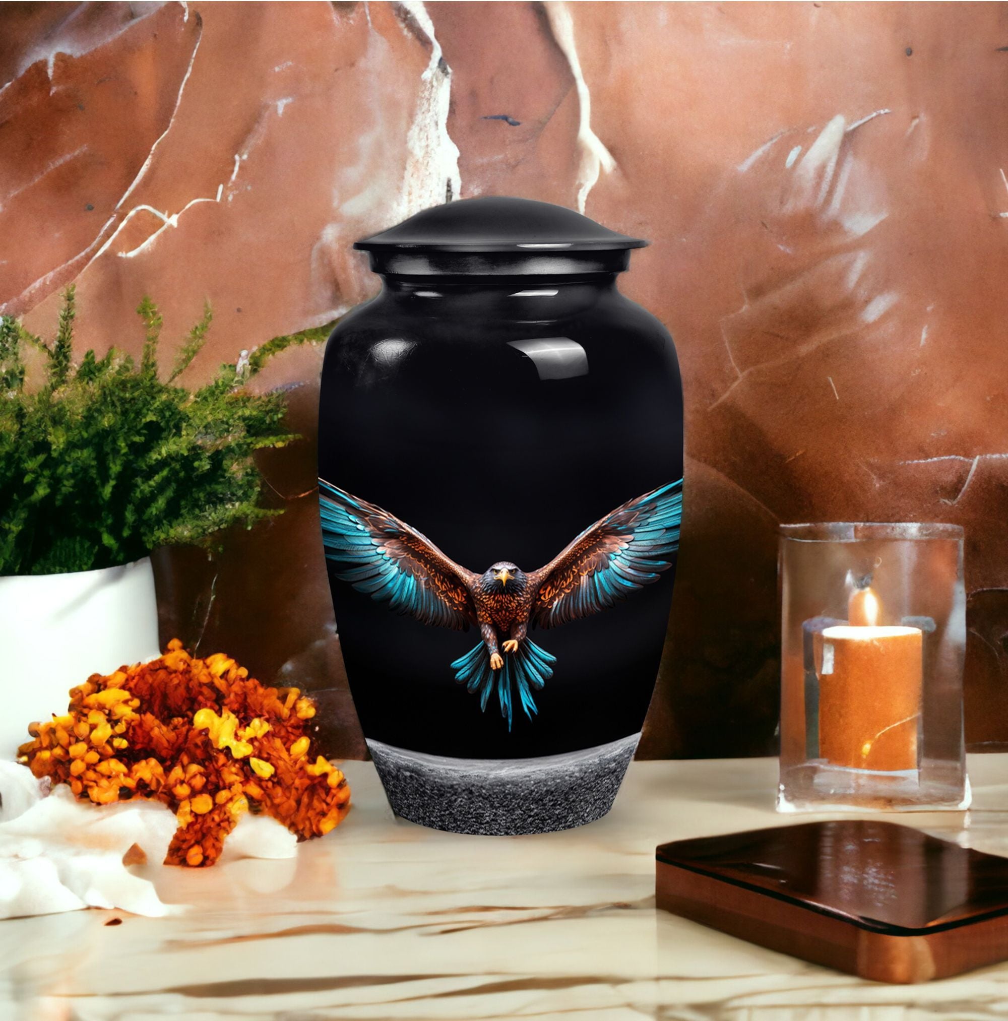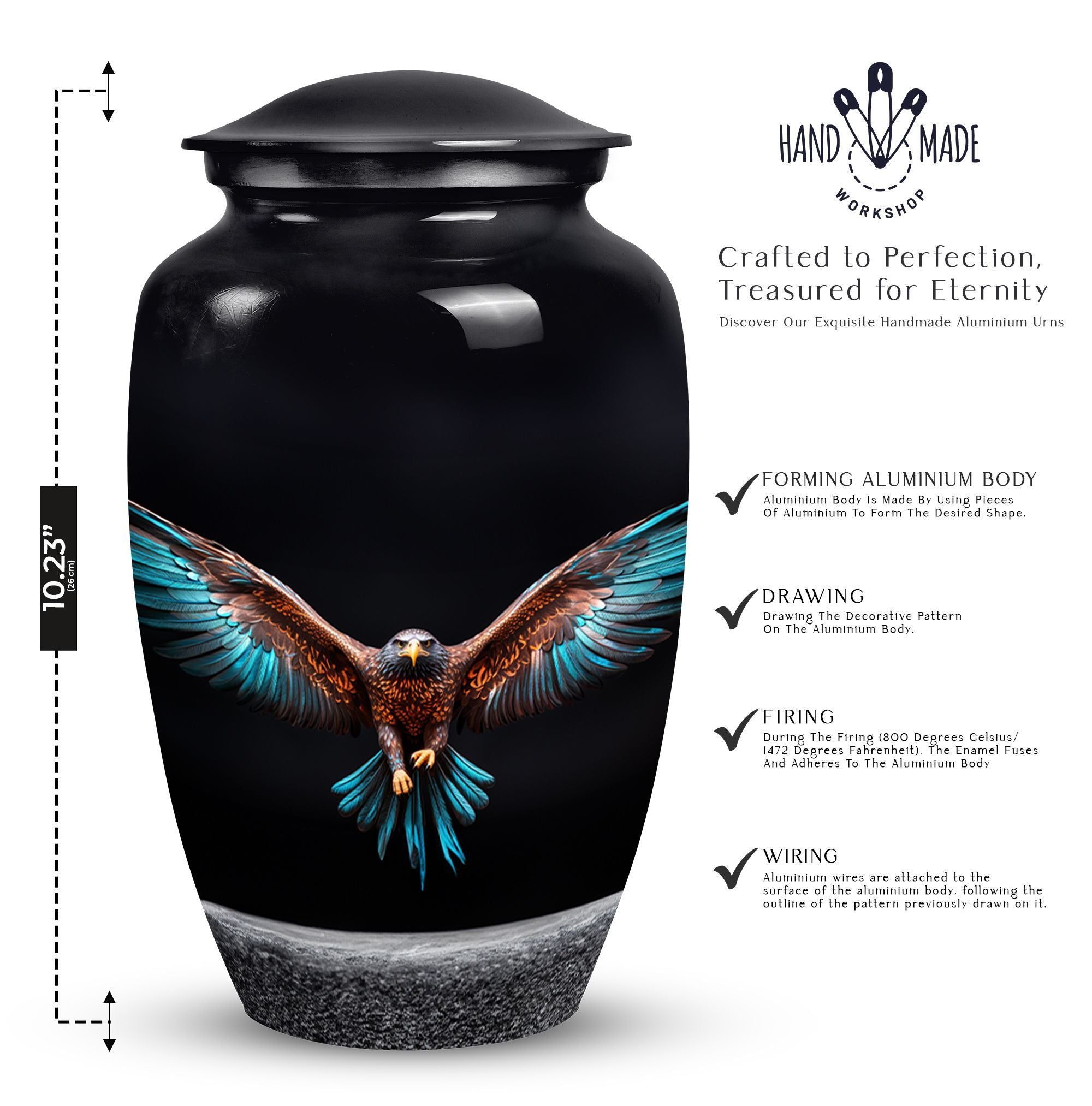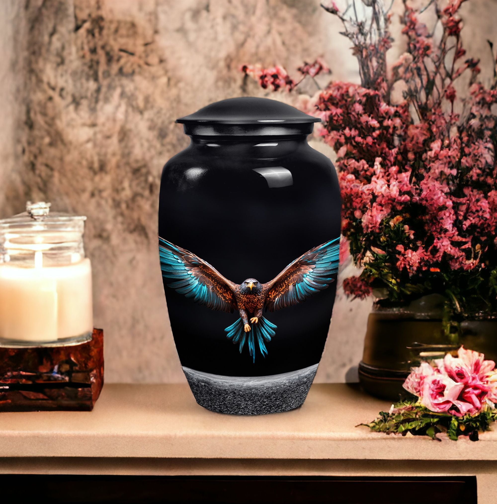 For those seeking a unique, yet classic way to remember and honor their loved ones, look no further than our Large Eagle Spreading Wings Cremation Urn. Made from a durable aluminum material, this urn weighs a sturdy 3.3 pounds and boasts a generous 200 cubic inches of capacity -- suitable for most adults. The overall height of the urn reaches 10 inches, with the impressive eagle spreading wings design drawing attention to its stature. More than just a container for ashes, this urn serves as a beautiful tribute to the departed. When you choose our urn, you also receive a velvet pouch that lends an extra layer of care and respect to the containment of ashes. To further add to the uniqueness of your tribute, the cremation urn allows for personalization. Engraved names or messages can turn this urn into the perfect homage to your loved one's legacy. Considered one of our Large Urns, the Eagle Spreading Wings Cremation Urn makes for a uniquely captivating resting place. Remember, this is more than just an urn for cremation. With this customized urn for ashes for adults, you create a testament of legacy and love.