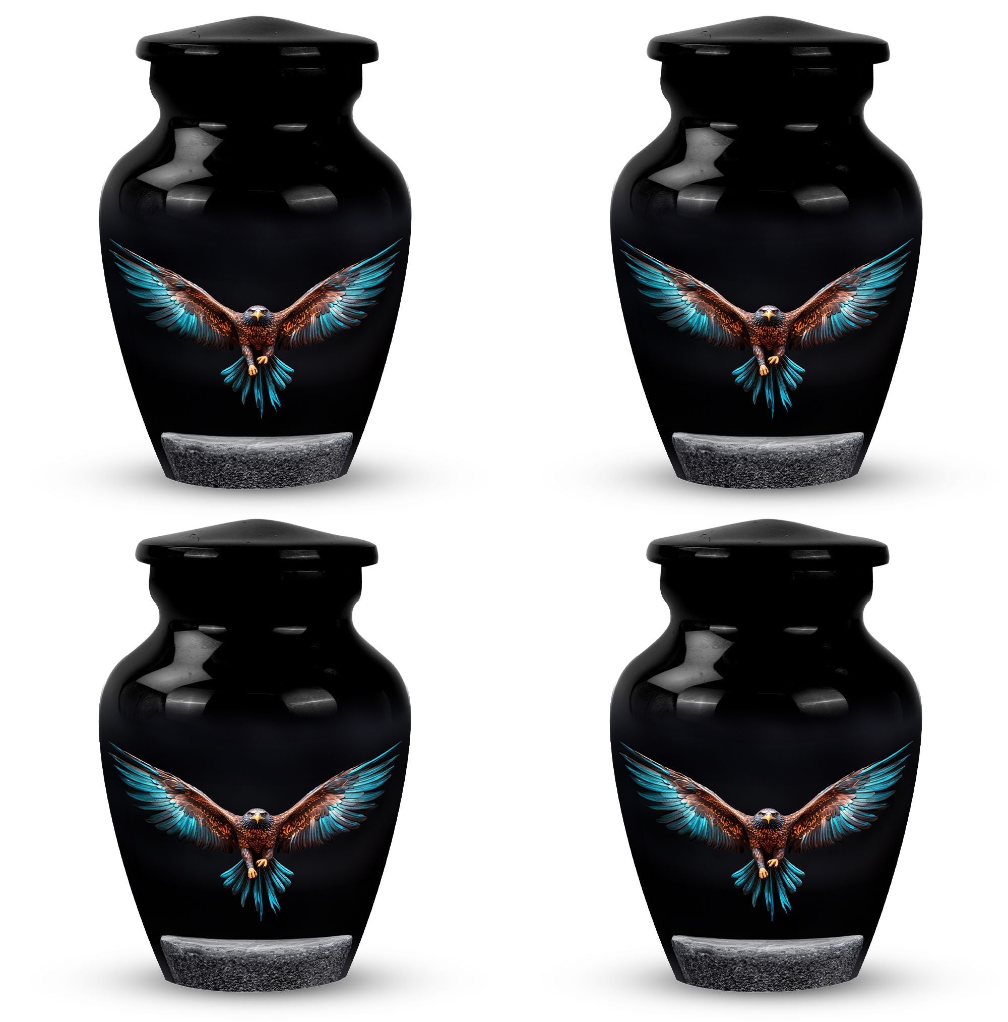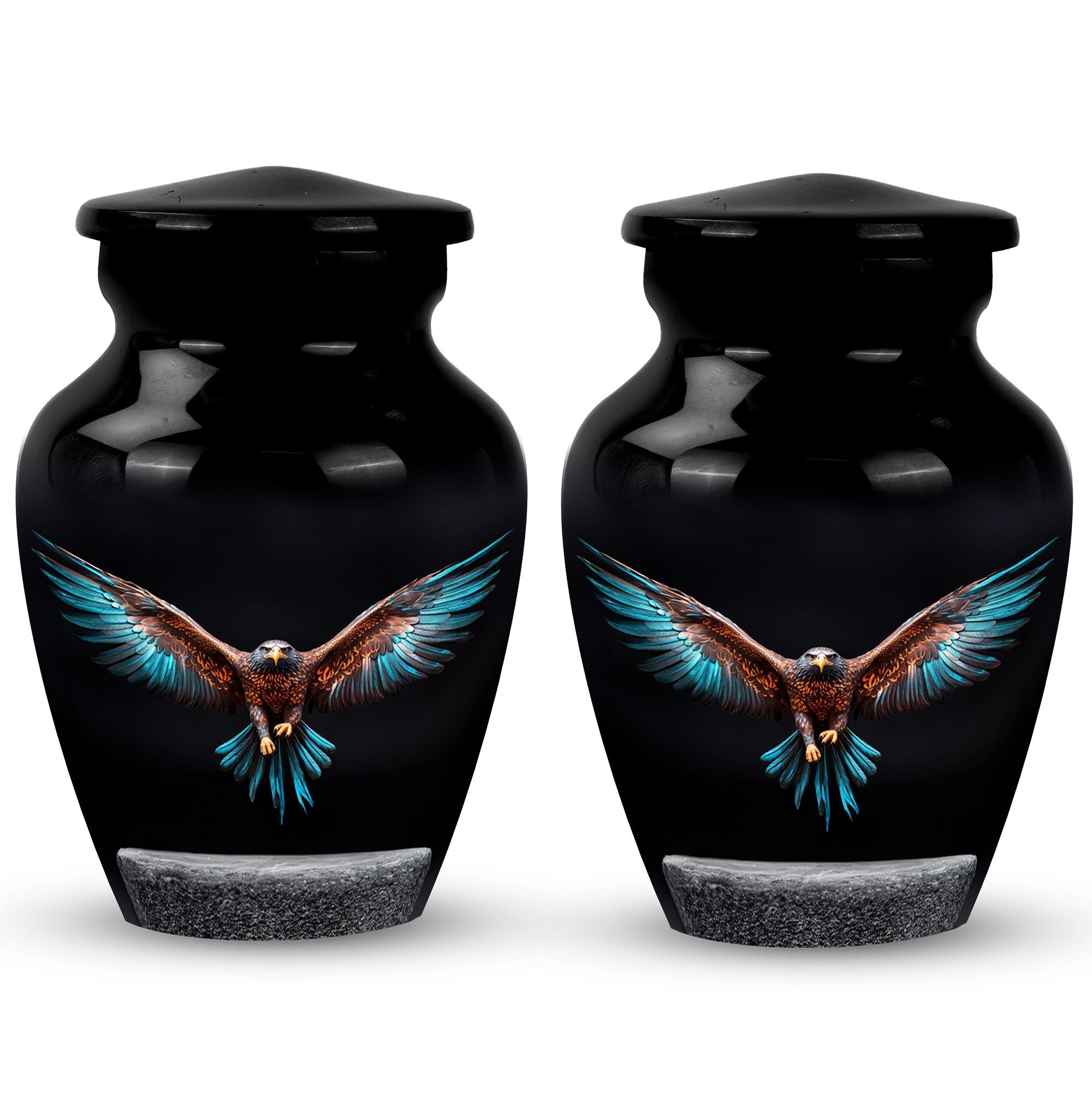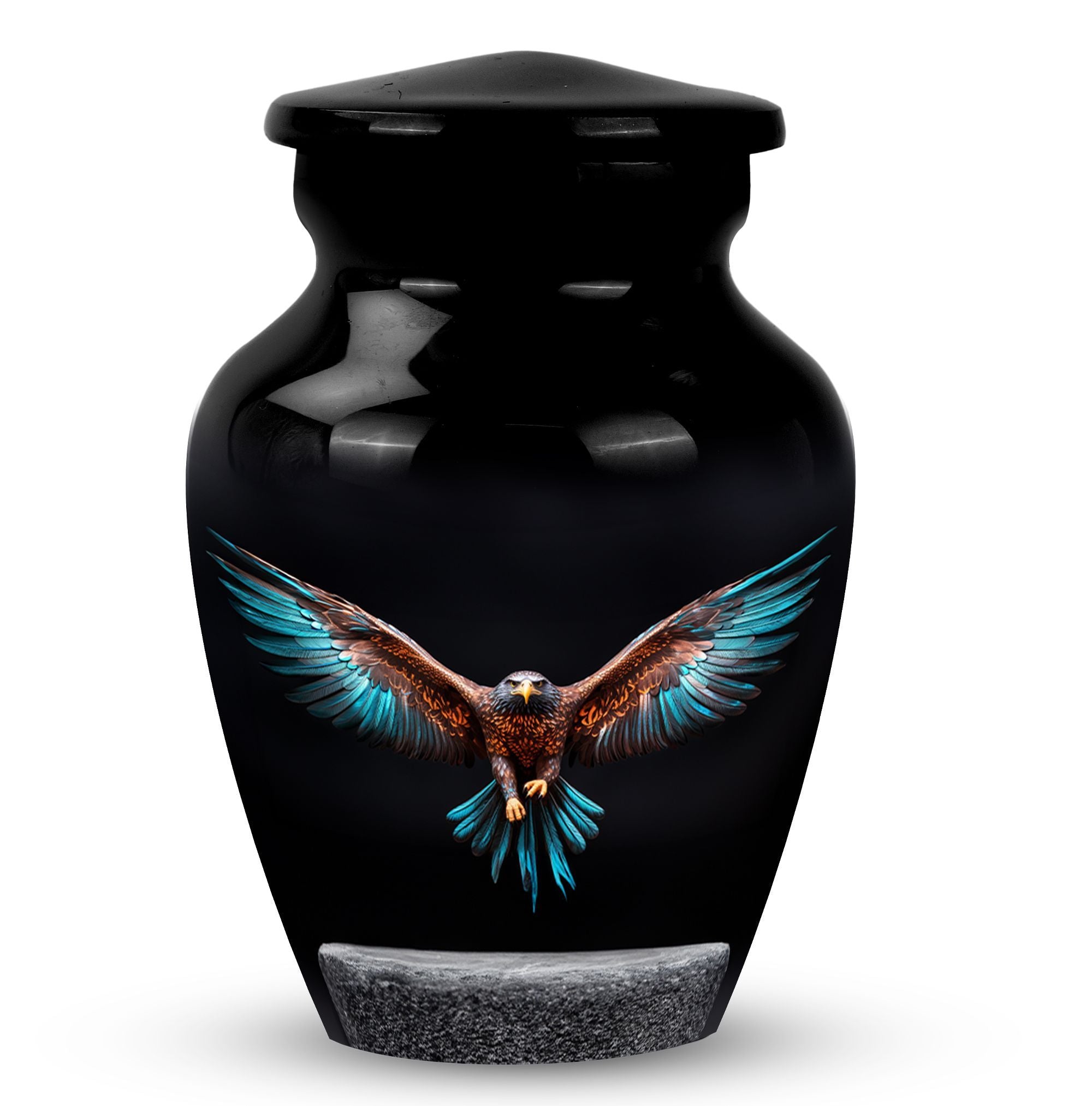 For those seeking a unique, yet classic way to remember and honor their loved ones, look no further than our Large Eagle Spreading Wings Cremation Urn. Made from a durable aluminum material, this urn weighs a sturdy 3.3 pounds and boasts a generous 200 cubic inches of capacity -- suitable for most adults. The overall height of the urn reaches 10 inches, with the impressive eagle spreading wings design drawing attention to its stature. More than just a container for ashes, this urn serves as a beautiful tribute to the departed. When you choose our urn, you also receive a velvet pouch that lends an extra layer of care and respect to the containment of ashes. To further add to the uniqueness of your tribute, the cremation urn allows for personalization. Engraved names or messages can turn this urn into the perfect homage to your loved one's legacy. Considered one of our Large Urns, the Eagle Spreading Wings Cremation Urn makes for a uniquely captivating resting place. Remember, this is more than just an urn for cremation. With this customized urn for ashes for adults, you create a testament of legacy and love.