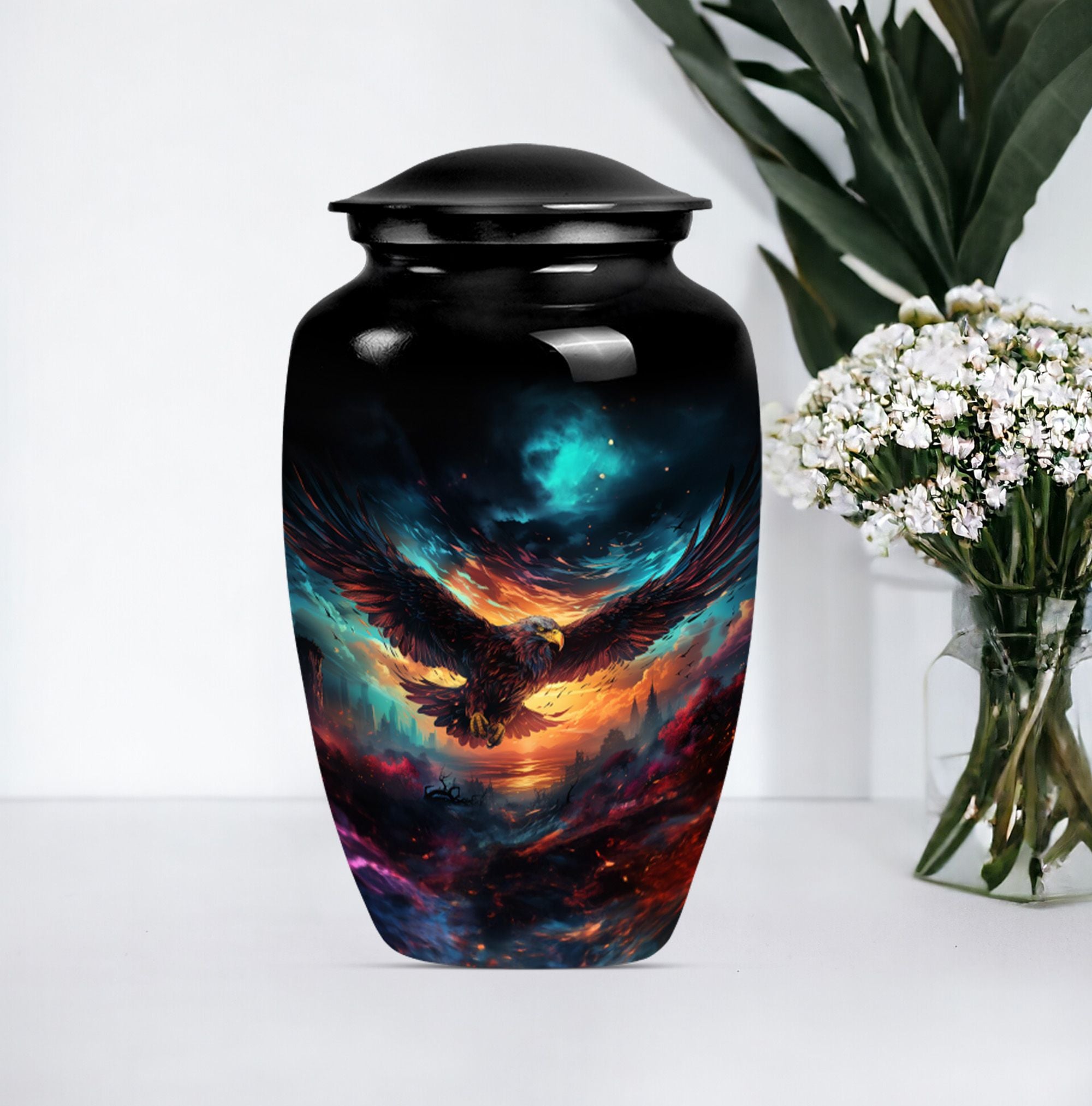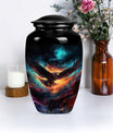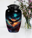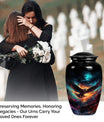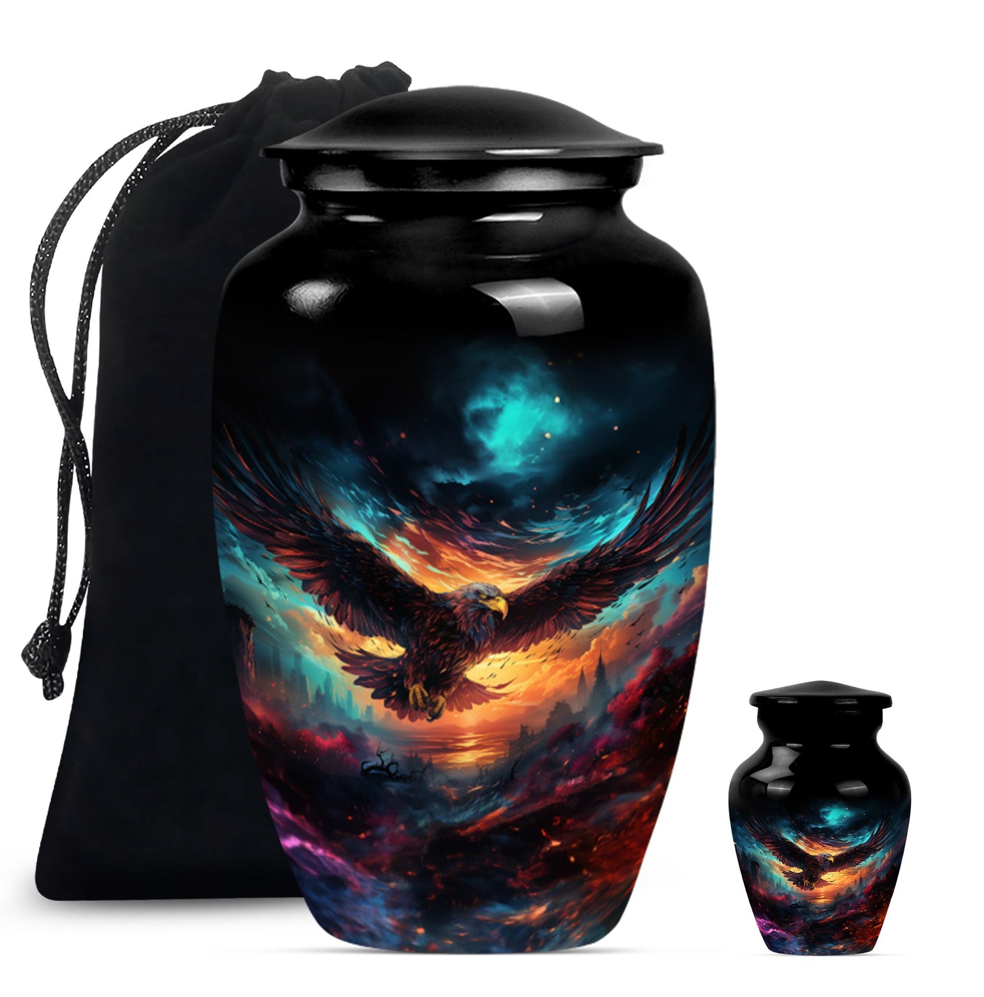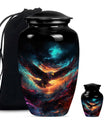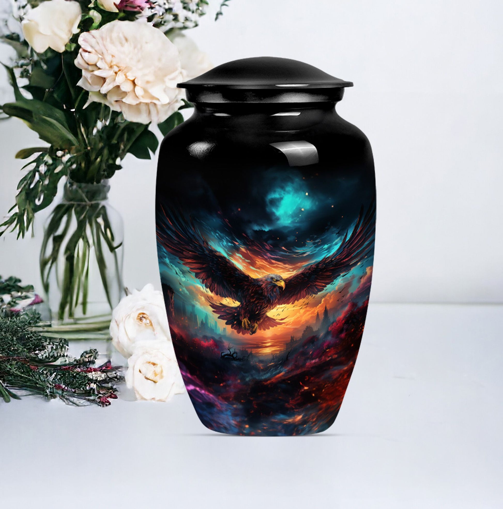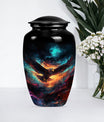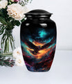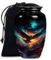 Introducing our meticulously crafted EAGLE Urn, a quintessential choice for memorial medium-sized urns veiled with a profound theme of a Wolf Howling. This large-sized urn, standing at 10 inches in height, has a substantial capacity of 200 cubic inches, ample to securely hold human ashes. Hailing from the realm of funeral medium-sized urns, this urn is composed of high-quality aluminum, guaranteeing robustness and longevity. The quality of materials used ensures that the urn weighs just 3.3 pounds, making it convenient to handle and move around as needed. Esteemed customers seeking urns for human ashes or urns for cremation will appreciate the added customization feature - an engraving of a loved one's name to further personalize this honorable abode. Each urn is delivered with a lavish velvet pouch for safekeeping your loved one's precious ashes. The timeless design adds a touch of classic style to this memorial urn, making it a fitting tribute for your loved one.
