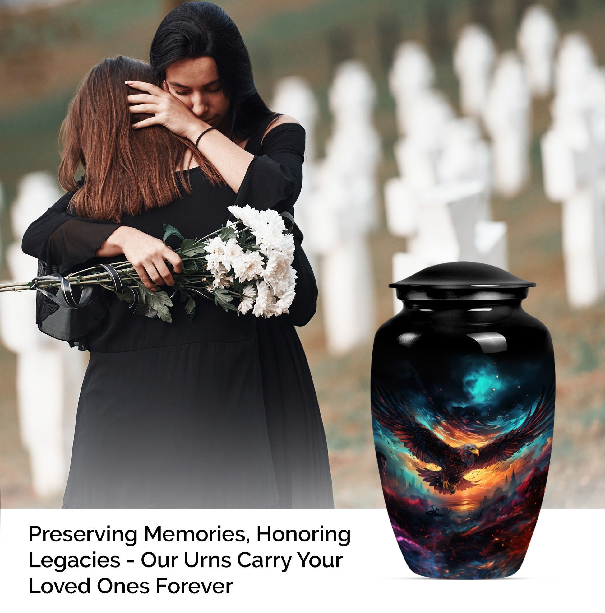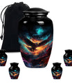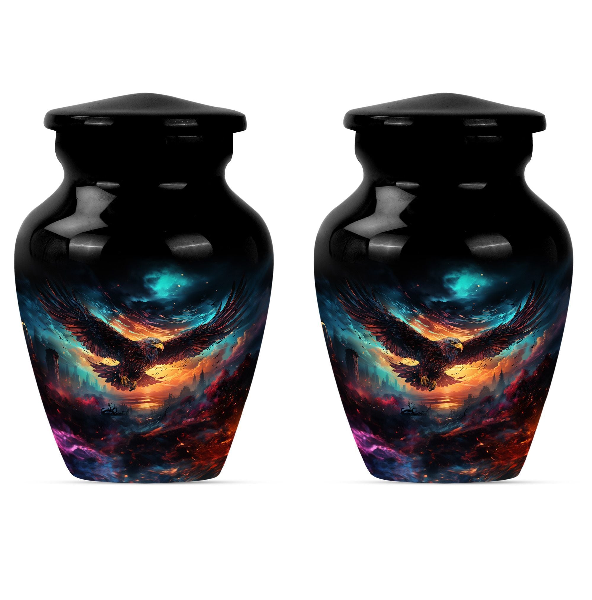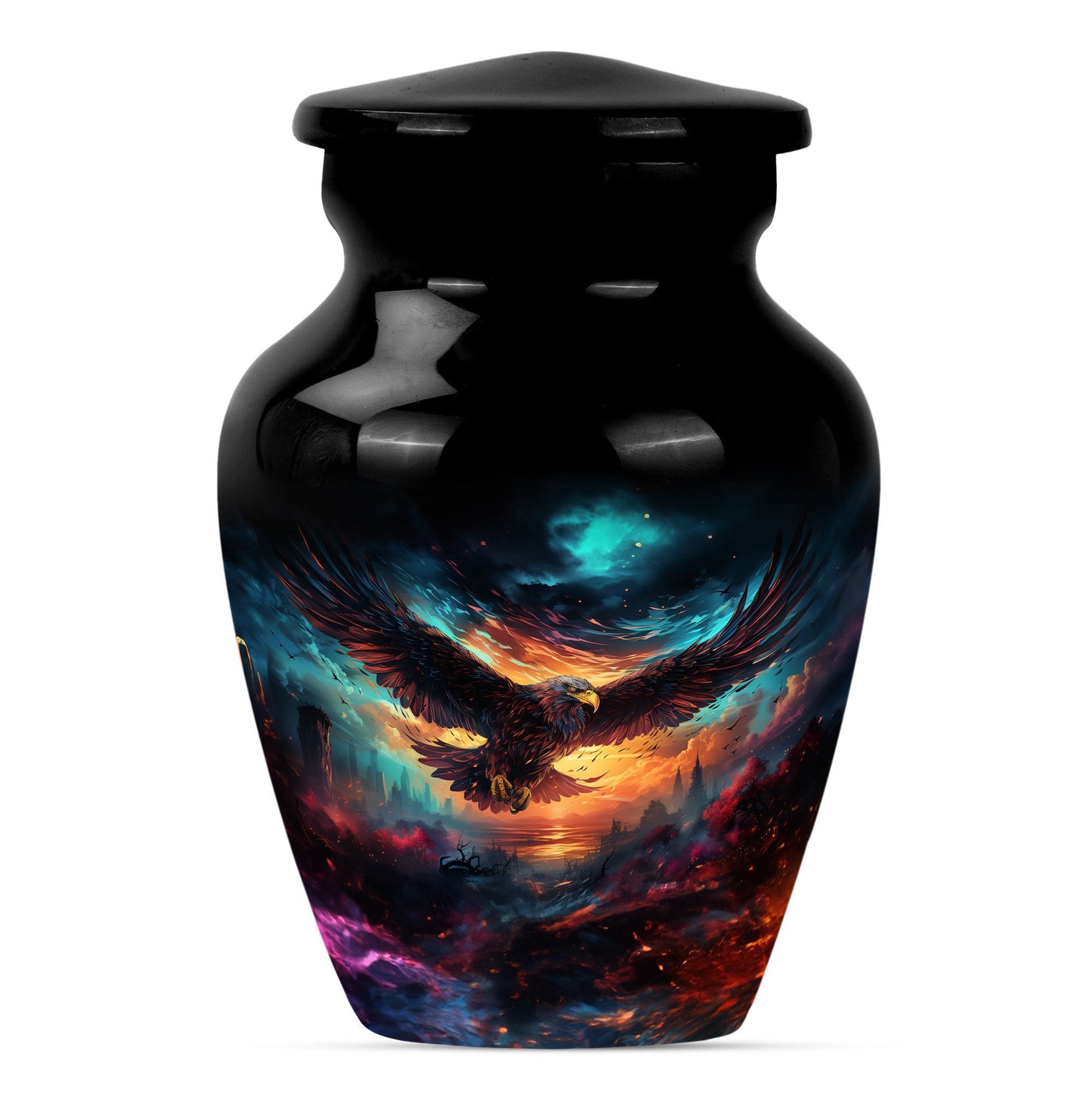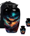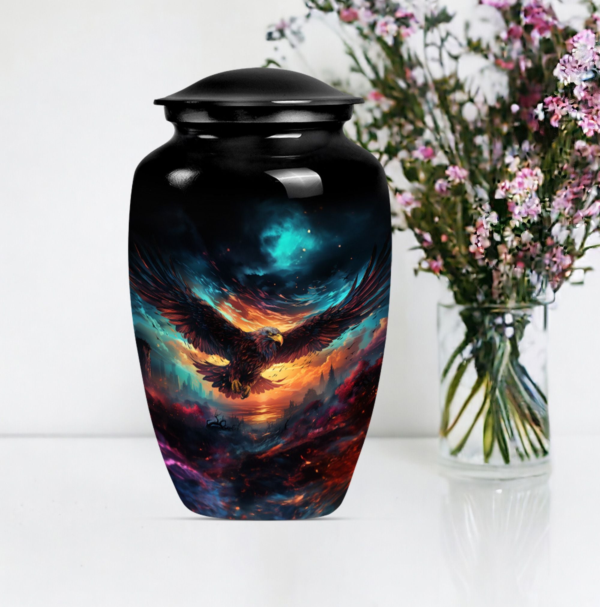 Introducing our meticulously crafted EAGLE Urn, a quintessential choice for memorial medium-sized urns veiled with a profound theme of a Wolf Howling. This large-sized urn, standing at 10 inches in height, has a substantial capacity of 200 cubic inches, ample to securely hold human ashes. Hailing from the realm of funeral medium-sized urns, this urn is composed of high-quality aluminum, guaranteeing robustness and longevity. The quality of materials used ensures that the urn weighs just 3.3 pounds, making it convenient to handle and move around as needed. Esteemed customers seeking urns for human ashes or urns for cremation will appreciate the added customization feature - an engraving of a loved one's name to further personalize this honorable abode. Each urn is delivered with a lavish velvet pouch for safekeeping your loved one's precious ashes. The timeless design adds a touch of classic style to this memorial urn, making it a fitting tribute for your loved one.