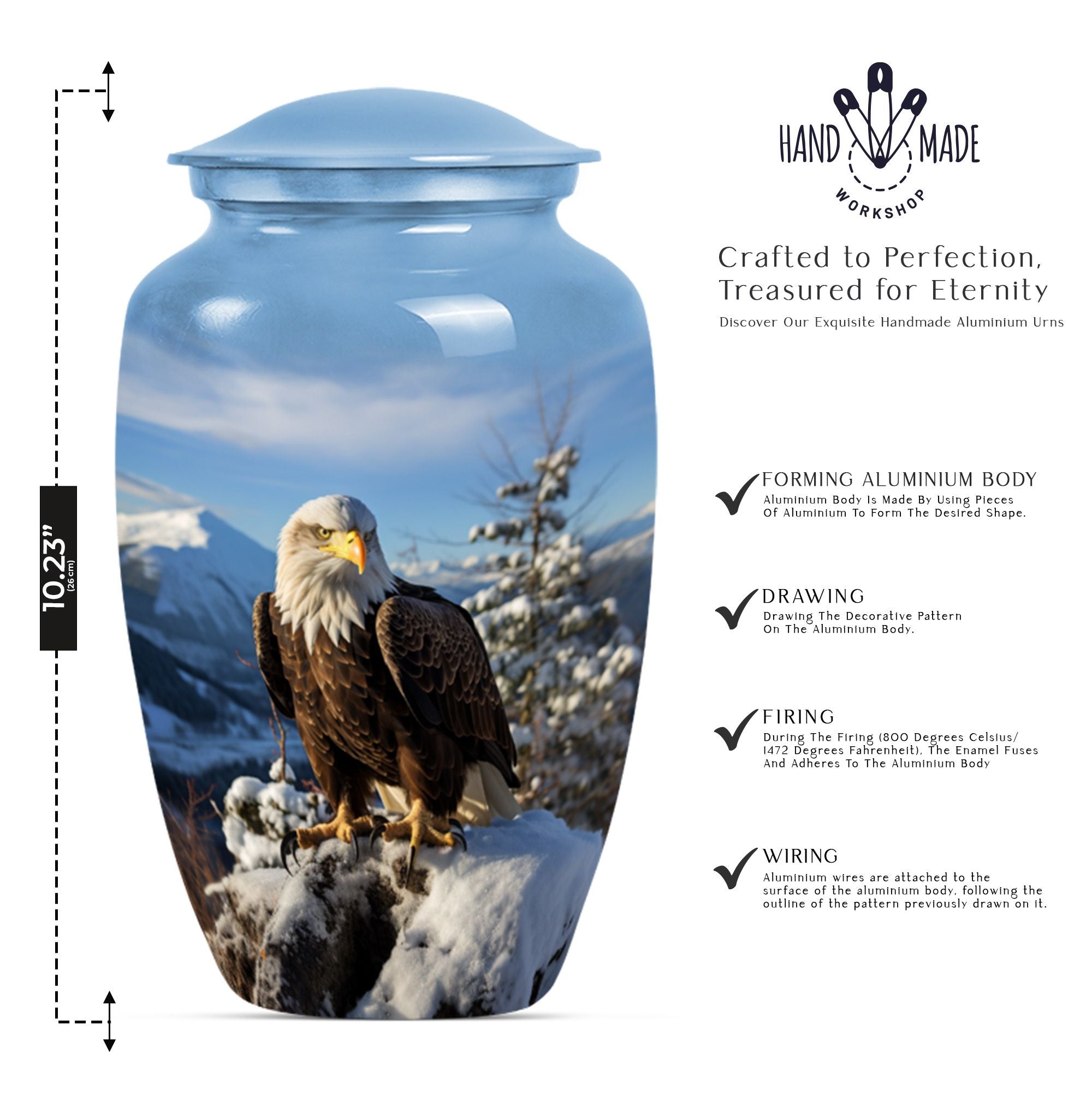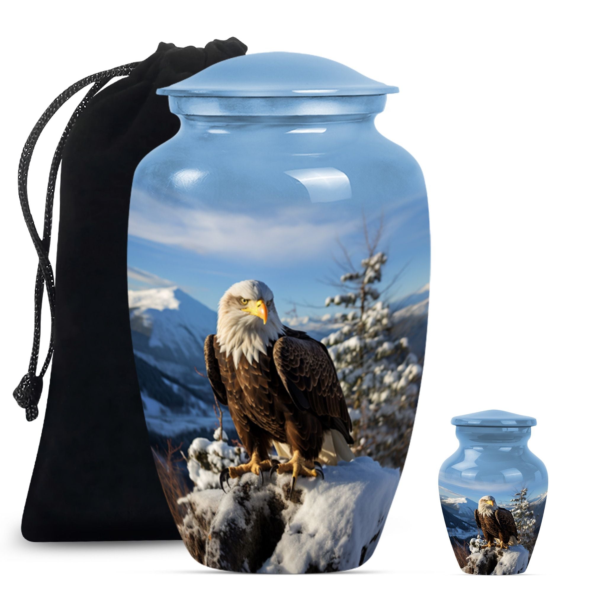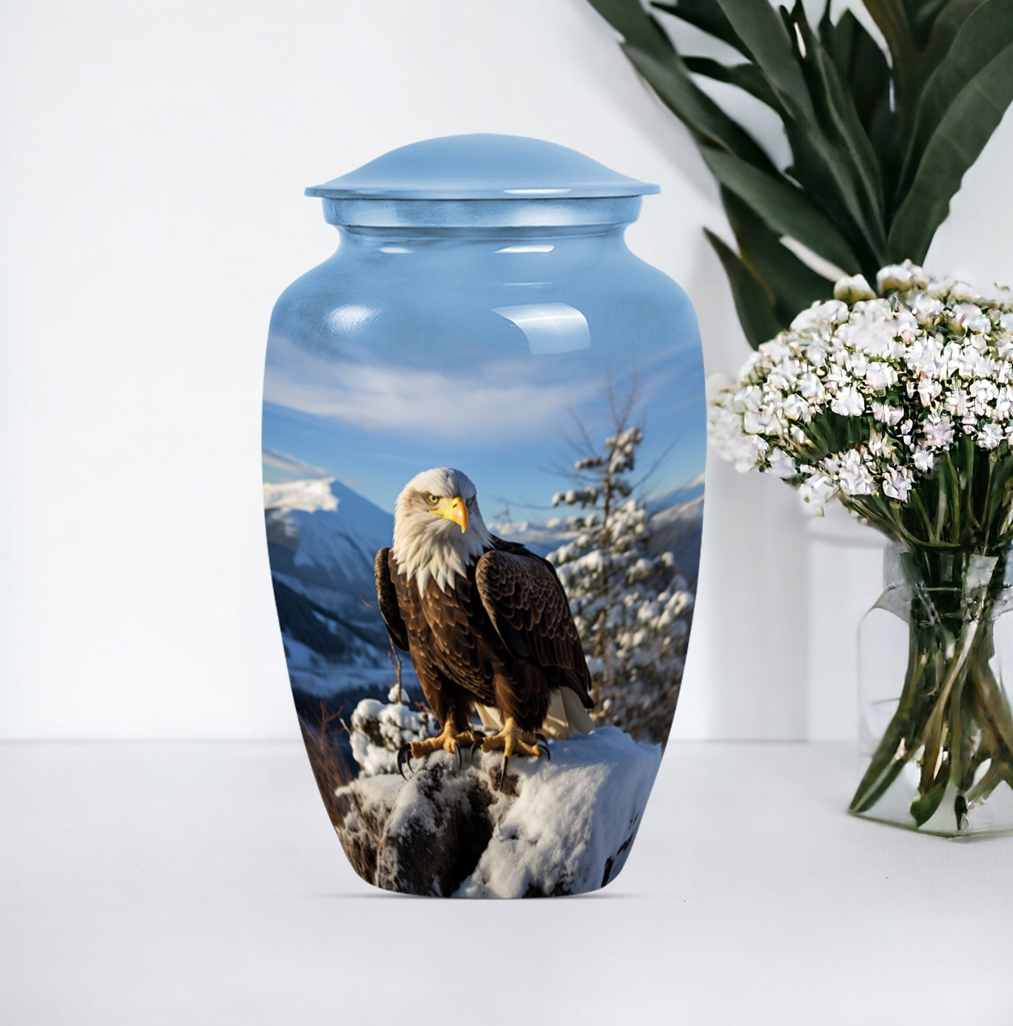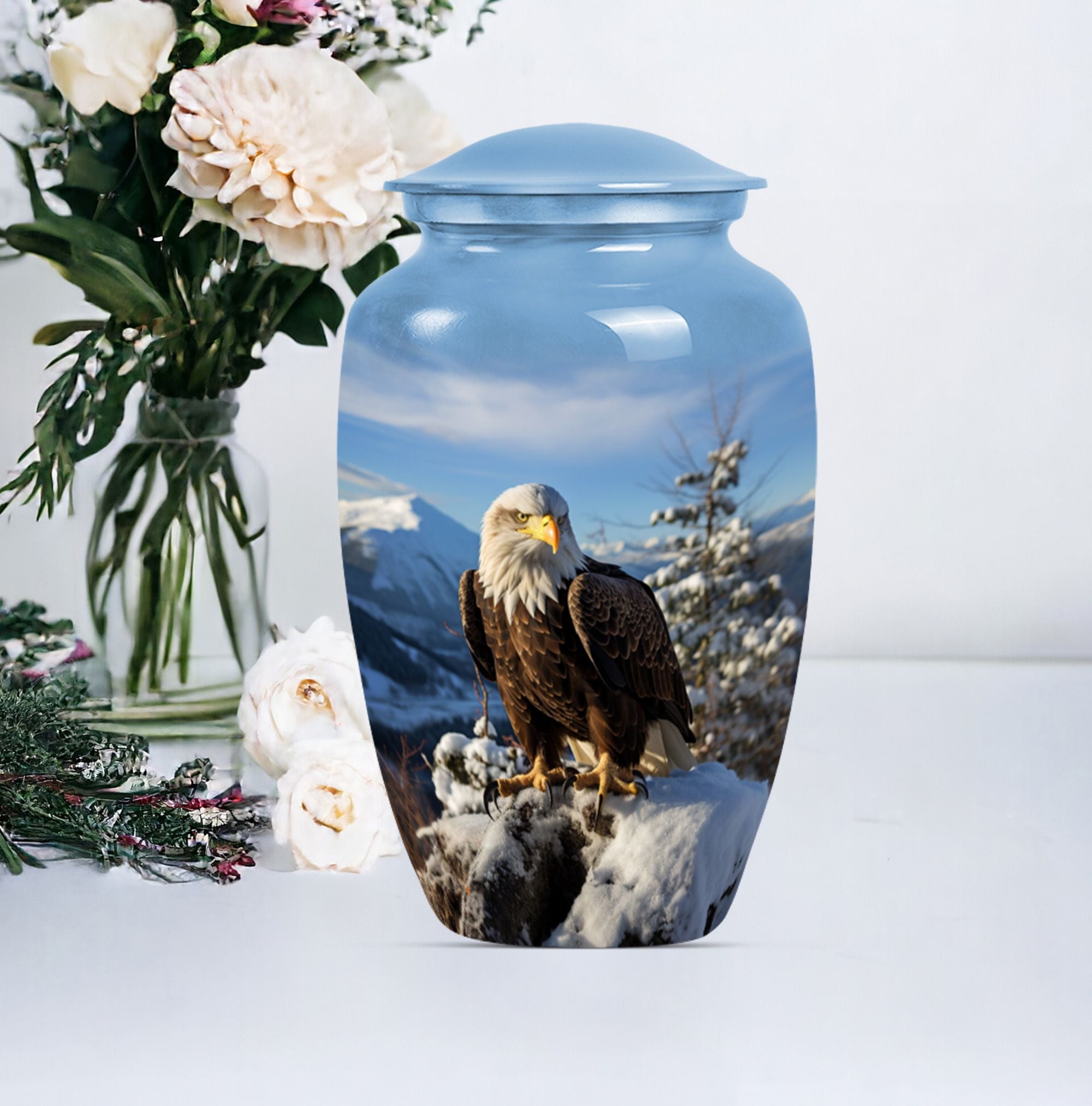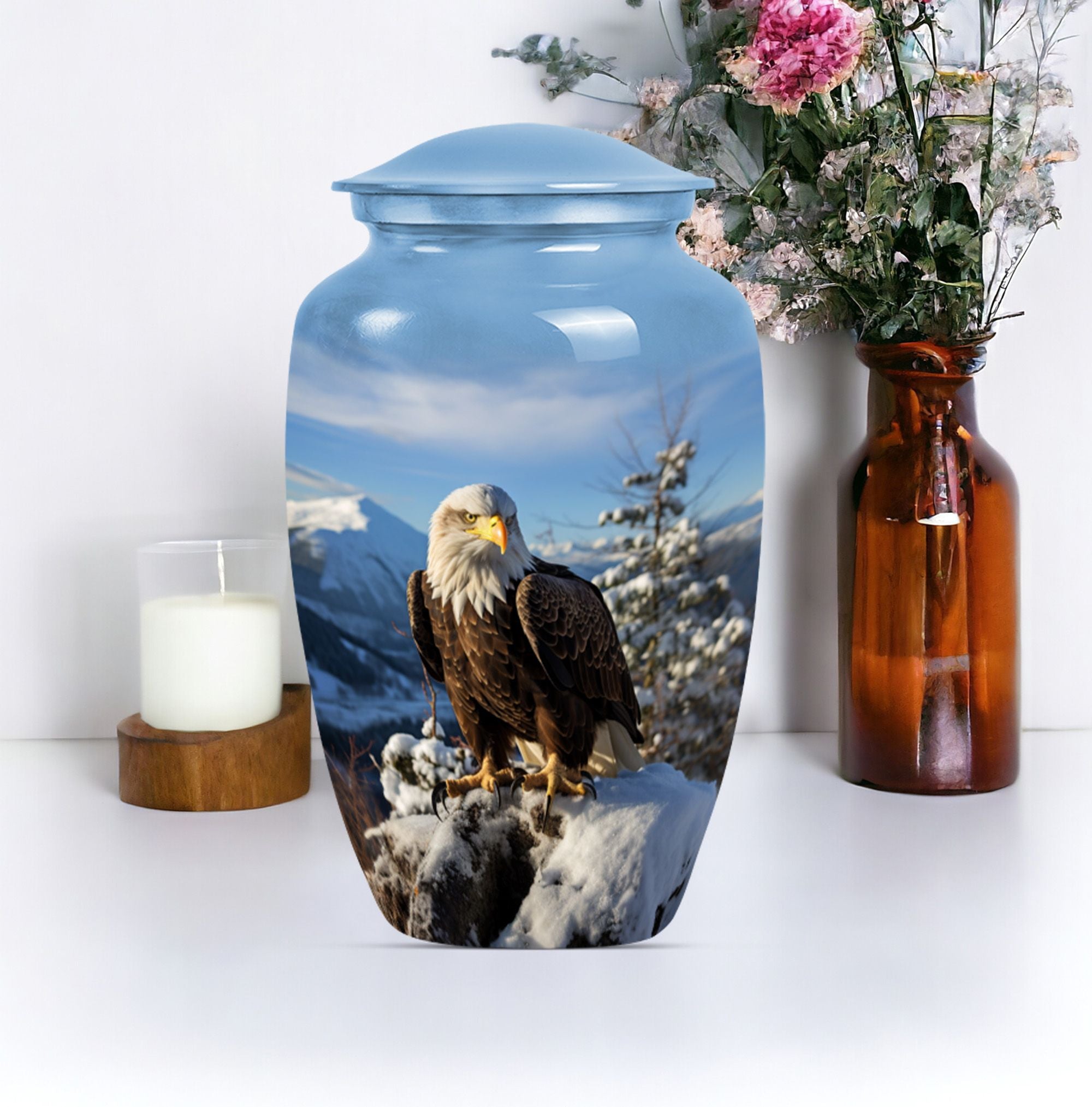 Honor your cherished one with our beautiful EAGLE Urn, a poignant tribute for keeping their memory alive. This 10-inch, aluminium, Large Urn stands out not just for its classic urn design but for its evocative Wolf Howling theme, thoughtfully selected to echo their unique spirit. It carries a weight of 3.3 pounds and an ample capacity of 200 cubic inches, ensuring a secure sanctum for your loved one's ashes. Each funeral burial urn is personalized with an engraved name, adding a special touch to your memorial. Moreover, this urn comes with a velvet pouch, providing a dignified containment for the ashes. Whether referred to as a memorial urn, ashes urn, or cremation container for human ashes, this EAGLE Urn is a symbolic aesthetic piece, ideal for an intimate remembrance. Ignite memories and keep your loved one close as you journey through grief and healing.