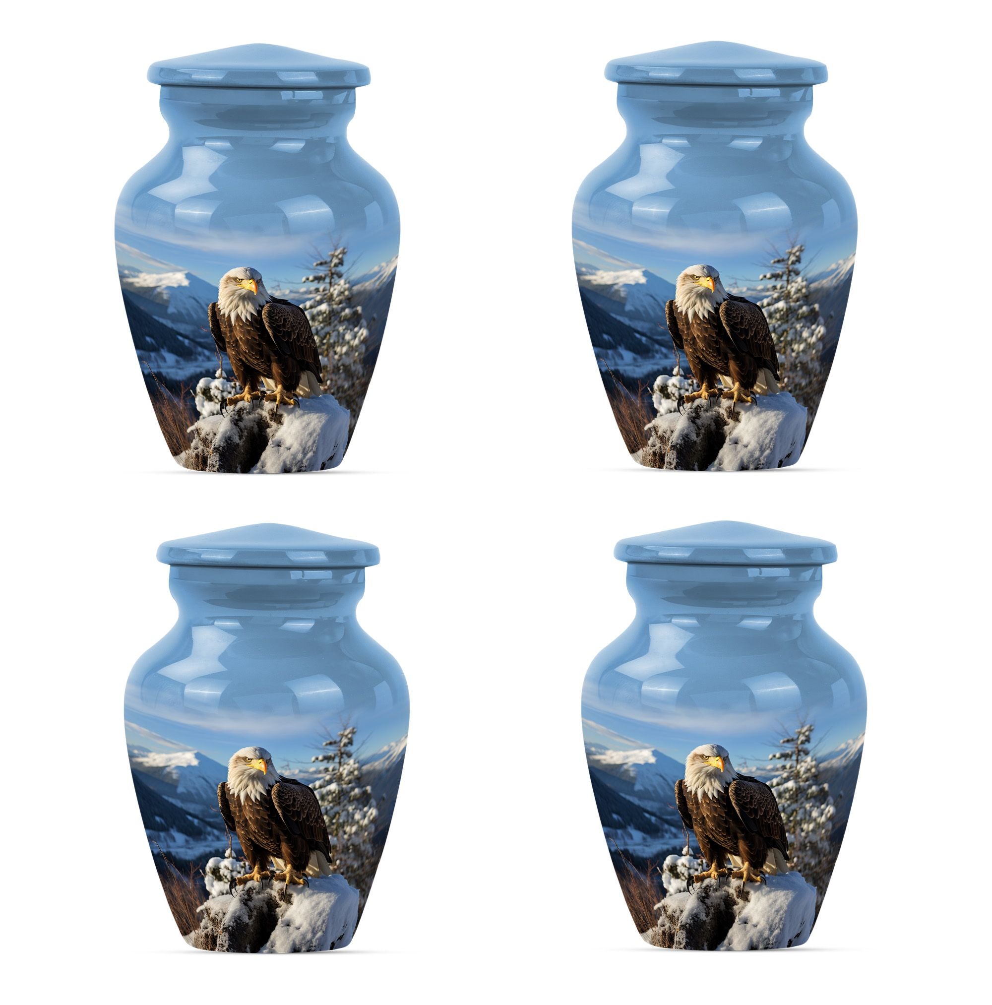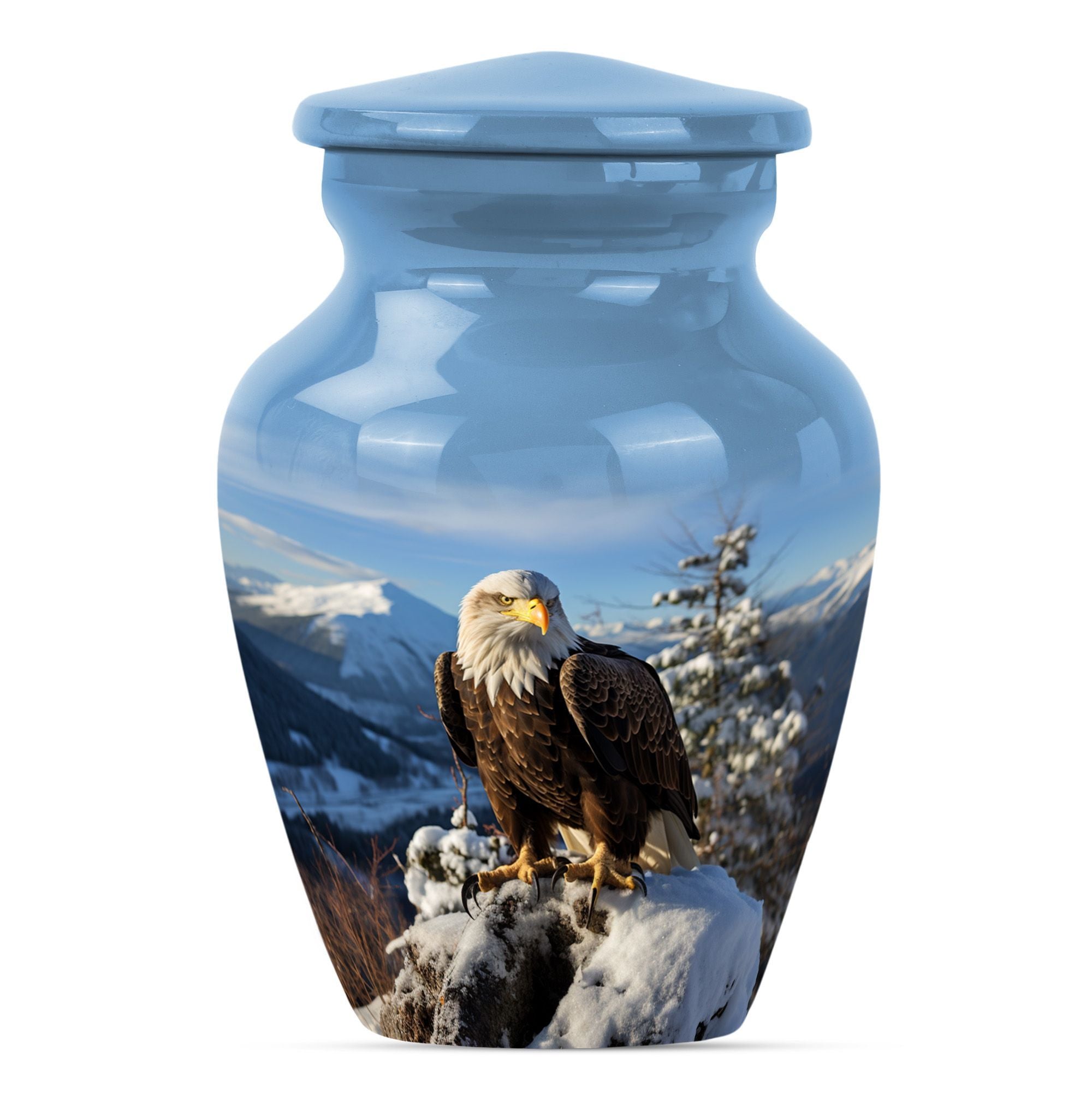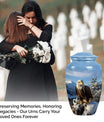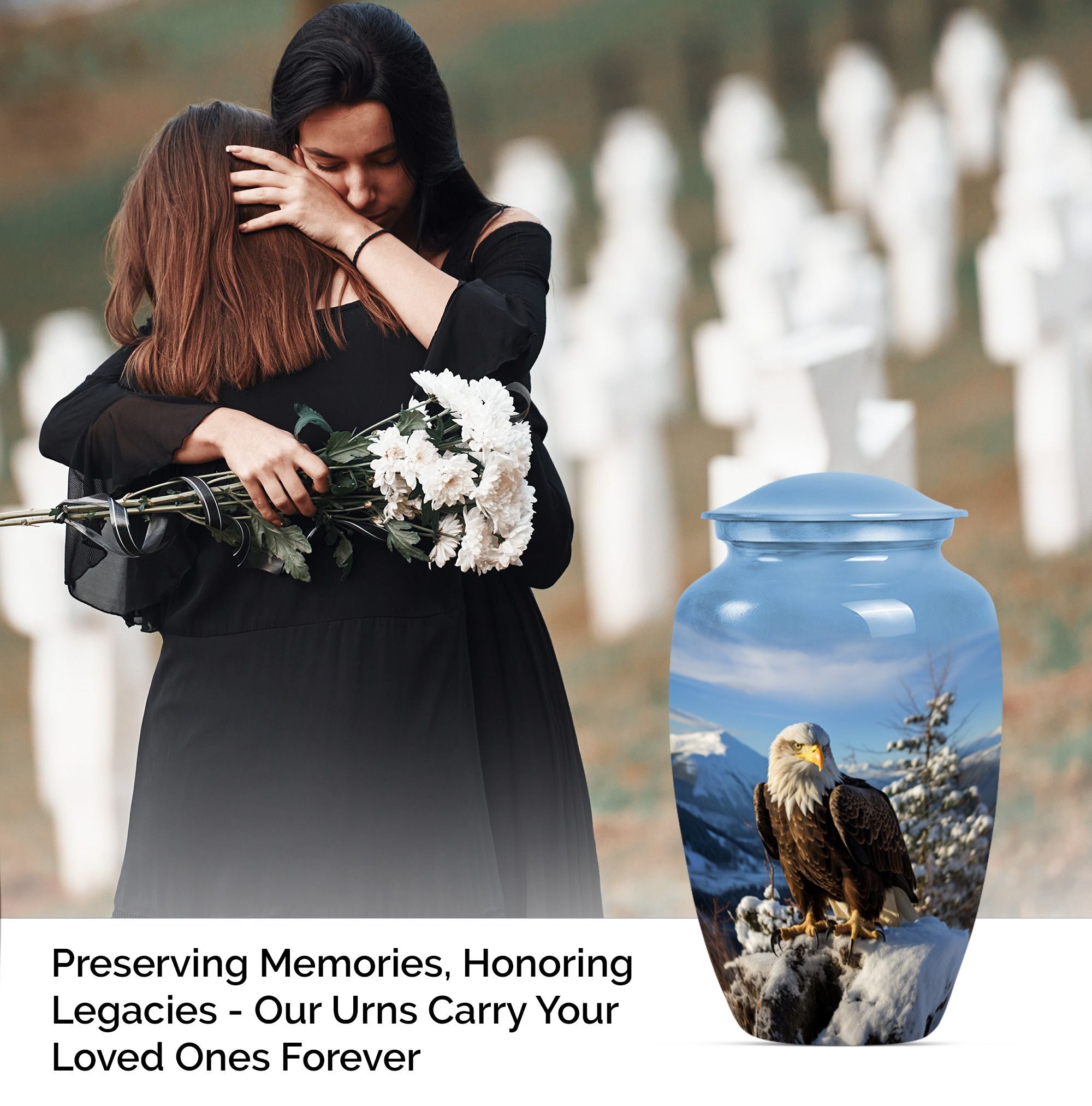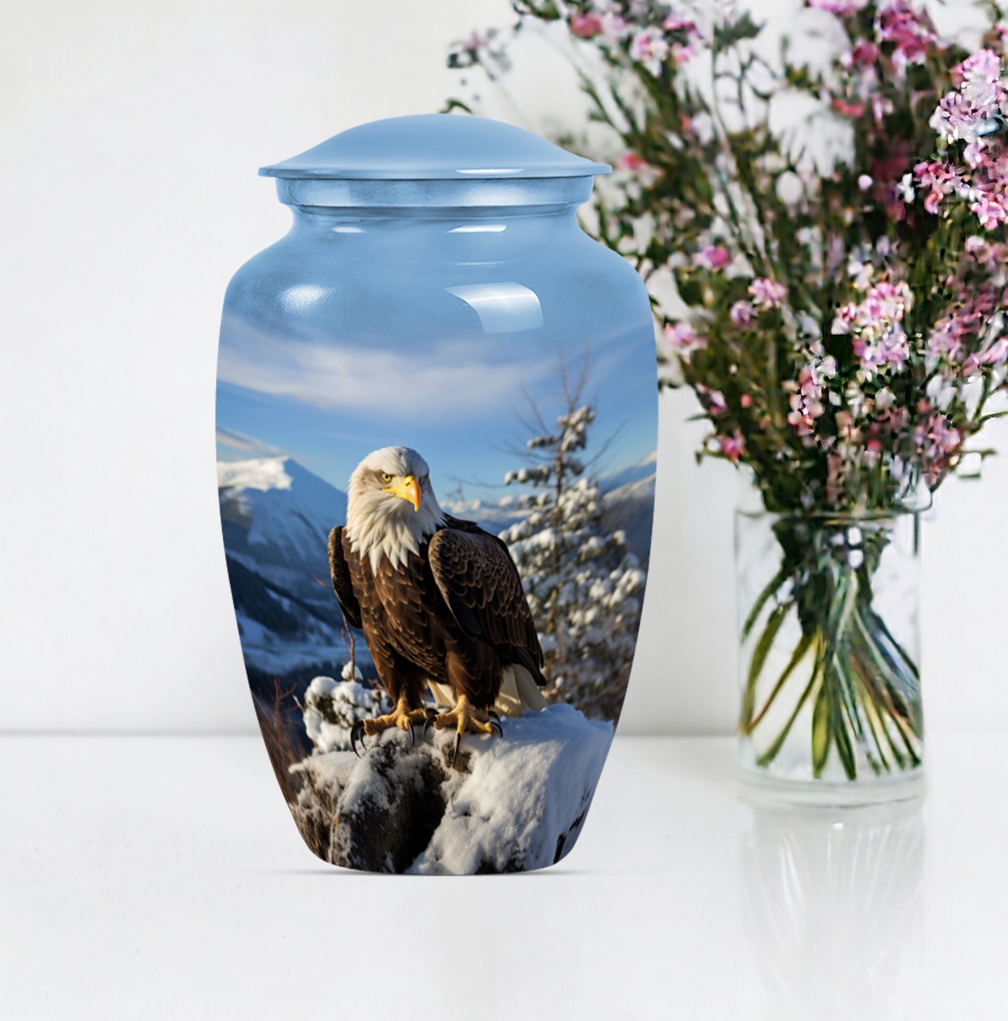 Honor your cherished one with our beautiful EAGLE Urn, a poignant tribute for keeping their memory alive. This 10-inch, aluminium, Large Urn stands out not just for its classic urn design but for its evocative Wolf Howling theme, thoughtfully selected to echo their unique spirit. It carries a weight of 3.3 pounds and an ample capacity of 200 cubic inches, ensuring a secure sanctum for your loved one's ashes. Each funeral burial urn is personalized with an engraved name, adding a special touch to your memorial. Moreover, this urn comes with a velvet pouch, providing a dignified containment for the ashes. Whether referred to as a memorial urn, ashes urn, or cremation container for human ashes, this EAGLE Urn is a symbolic aesthetic piece, ideal for an intimate remembrance. Ignite memories and keep your loved one close as you journey through grief and healing.