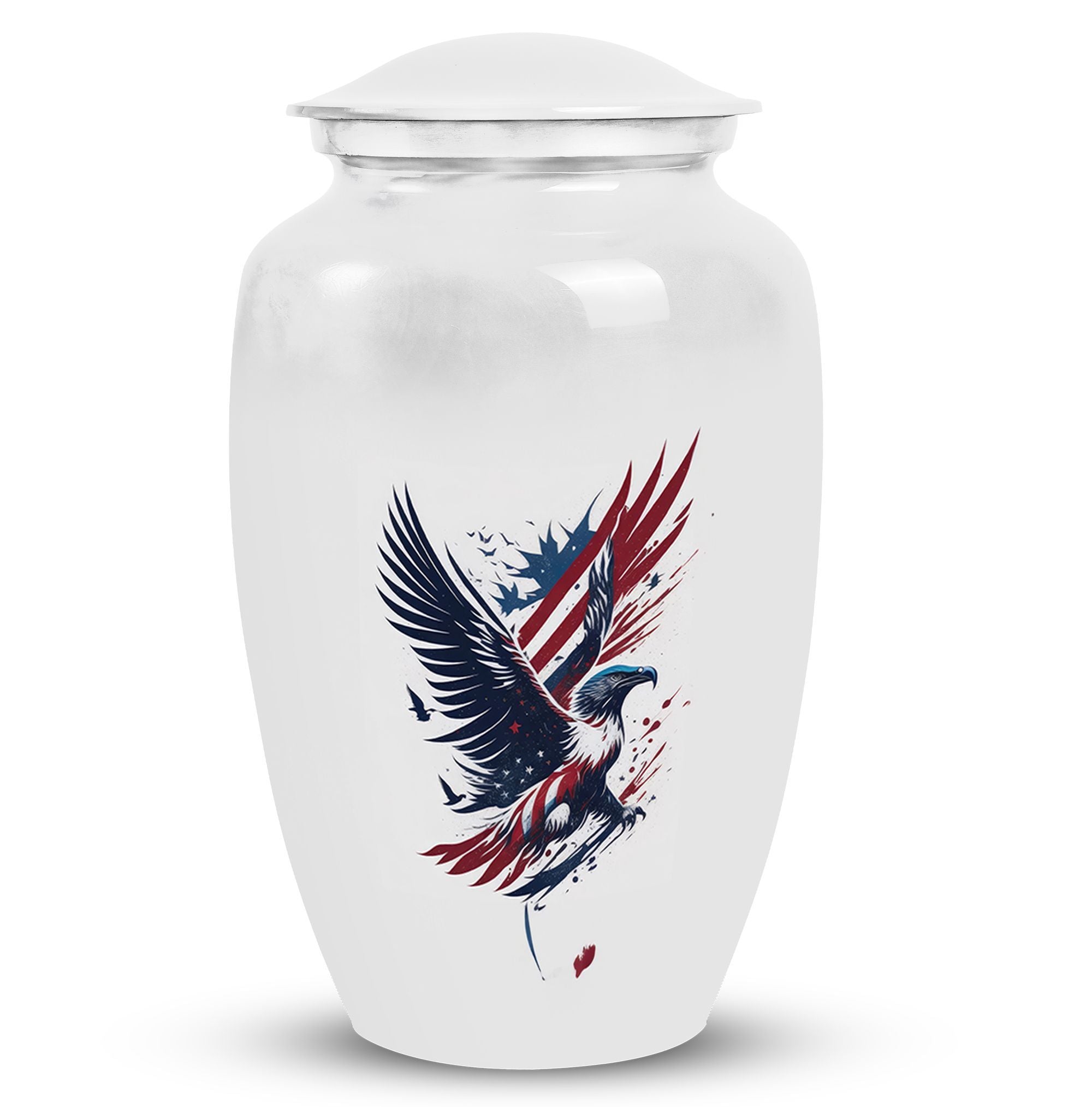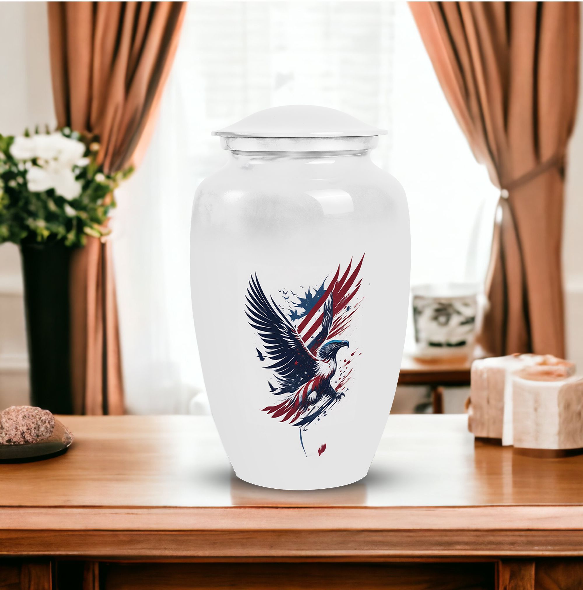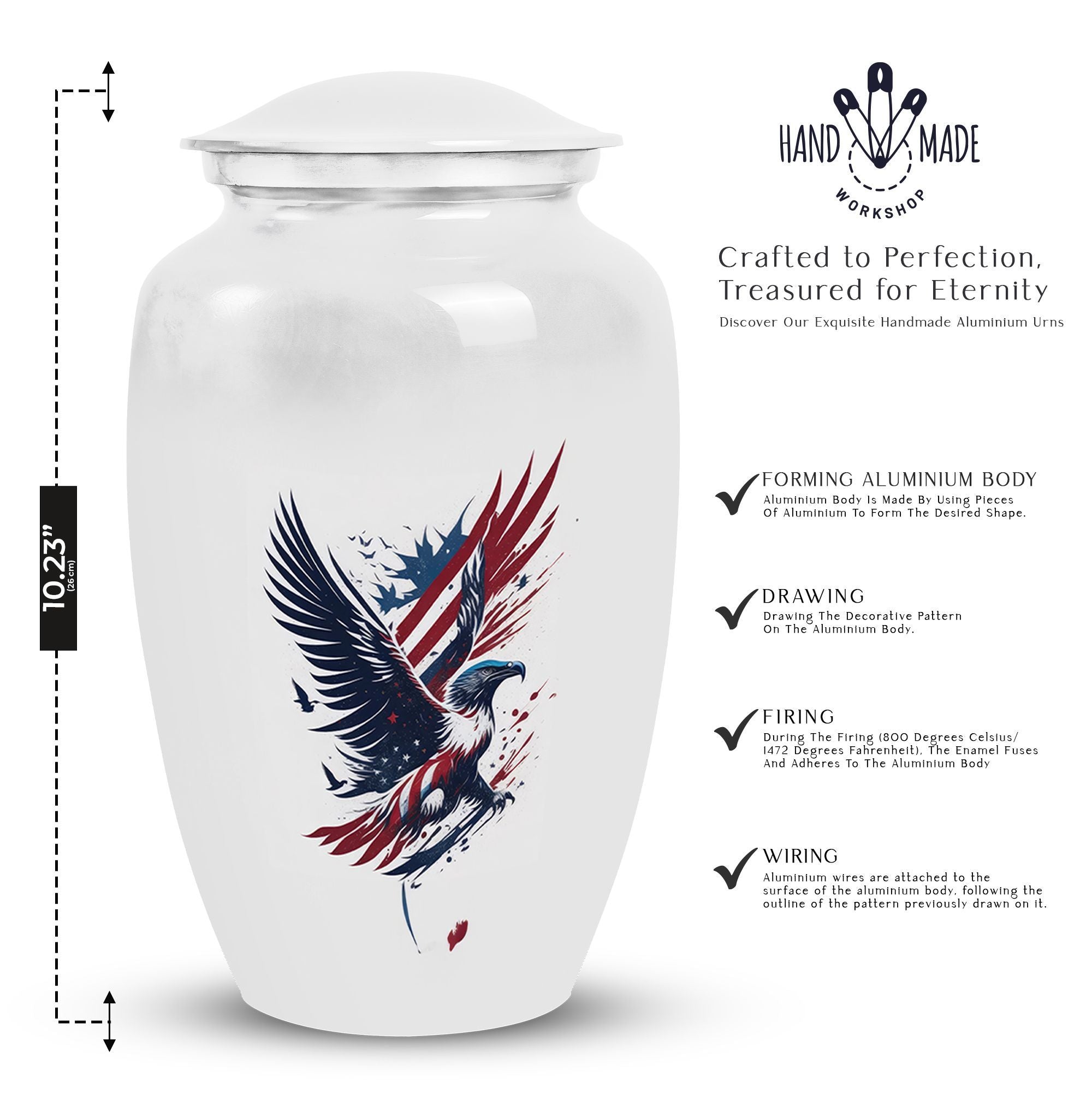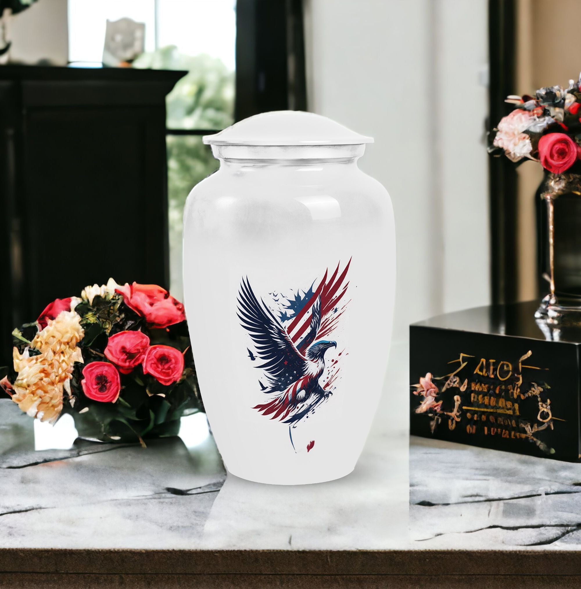 Celebrate the indomitable spirit of your loved ones with this meticulously crafted Eagle Urn. This item entirely encompasses reverence and respect and makes a powerful memorial gift. Standing tall at 10 inches in height, it strikingly captivates attention. Constructed with a robust aluminium material, its weight clocks in at 3.3 pounds, making it sturdy and stable. An amiable size of 200 cubic inches capacity renders it as one of the comfortable large urns available. It also allows for a personal touch with the addition of engraved names, letting you create a unique homage for your loved one. This crafted beauty arrives with a ruffled velvet pouch for secure containment of ashes. From Urns for Human remains to Decorative Urns for ashes, the Classic Urn style of this Eagle Urn is a respectful addition to any remembrance ceremony. Beyond its evident visual appeal, this urn brings a sense of peace, allowing memories to resonate every time your gaze falls upon it.