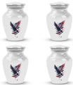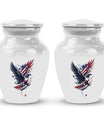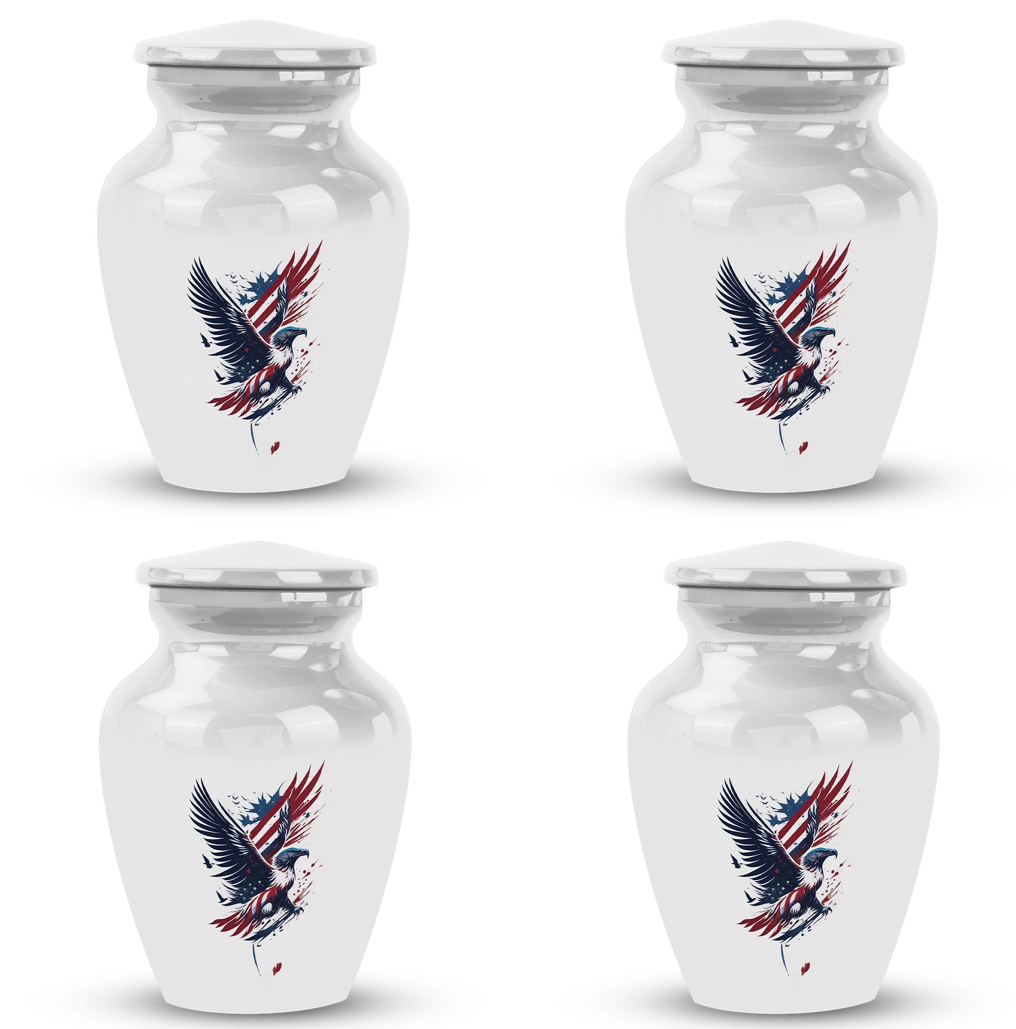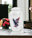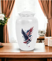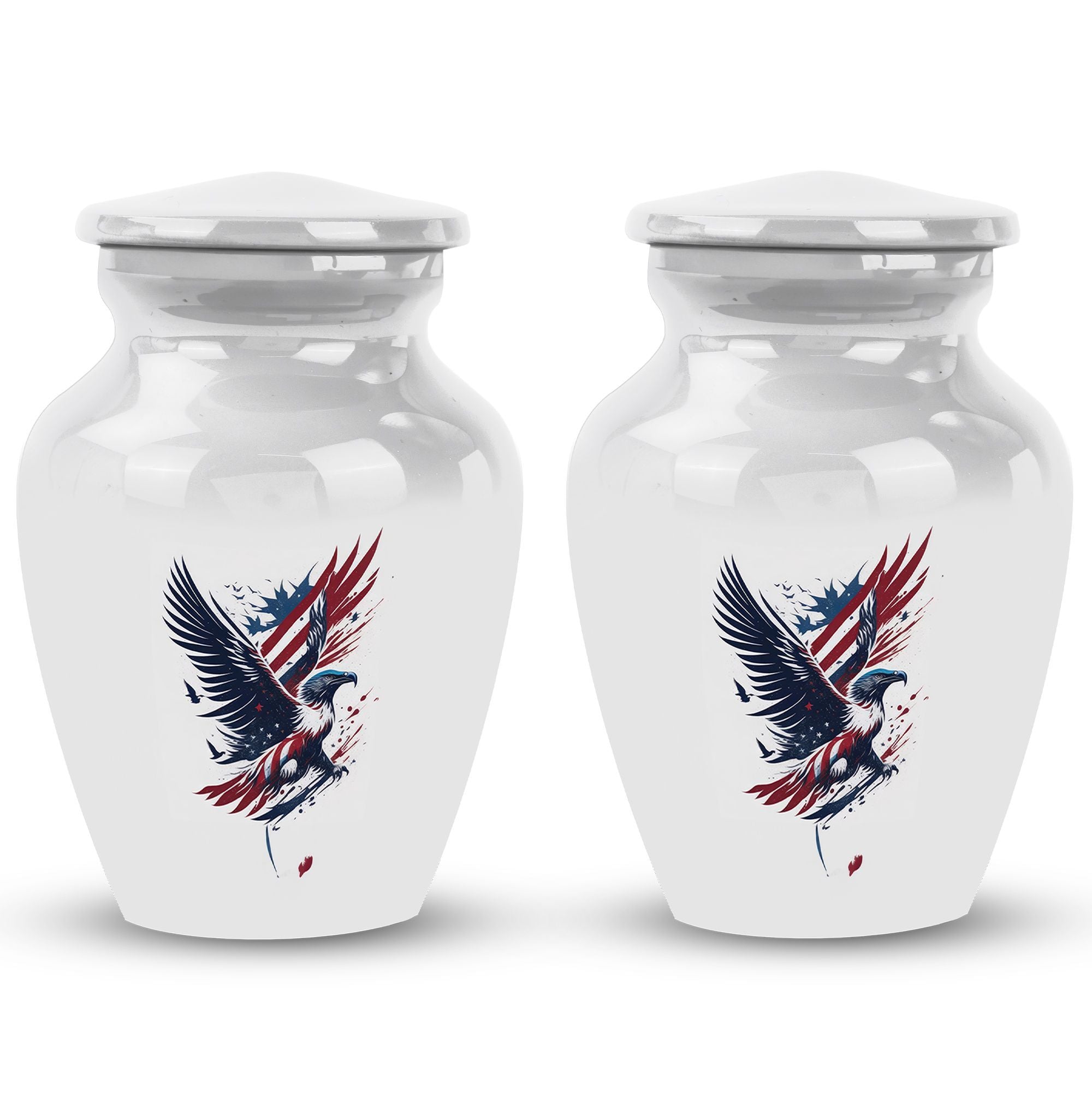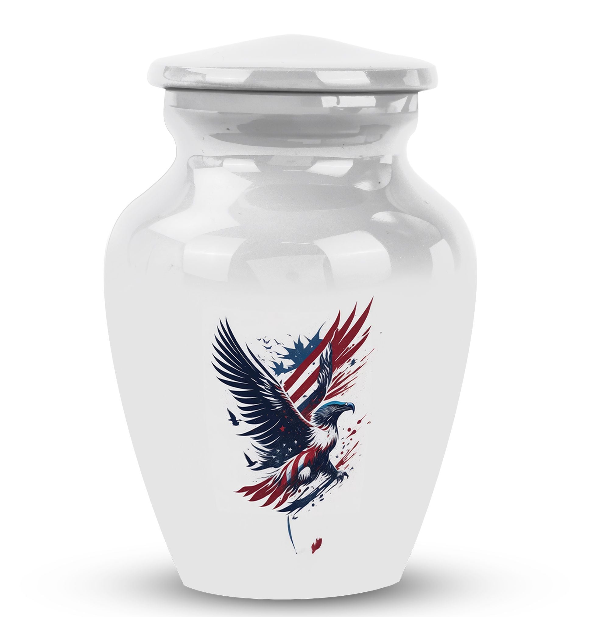 Celebrate the indomitable spirit of your loved ones with this meticulously crafted Eagle Urn. This item entirely encompasses reverence and respect and makes a powerful memorial gift. Standing tall at 10 inches in height, it strikingly captivates attention. Constructed with a robust aluminium material, its weight clocks in at 3.3 pounds, making it sturdy and stable. An amiable size of 200 cubic inches capacity renders it as one of the comfortable large urns available. It also allows for a personal touch with the addition of engraved names, letting you create a unique homage for your loved one. This crafted beauty arrives with a ruffled velvet pouch for secure containment of ashes. From Urns for Human remains to Decorative Urns for ashes, the Classic Urn style of this Eagle Urn is a respectful addition to any remembrance ceremony. Beyond its evident visual appeal, this urn brings a sense of peace, allowing memories to resonate every time your gaze falls upon it.