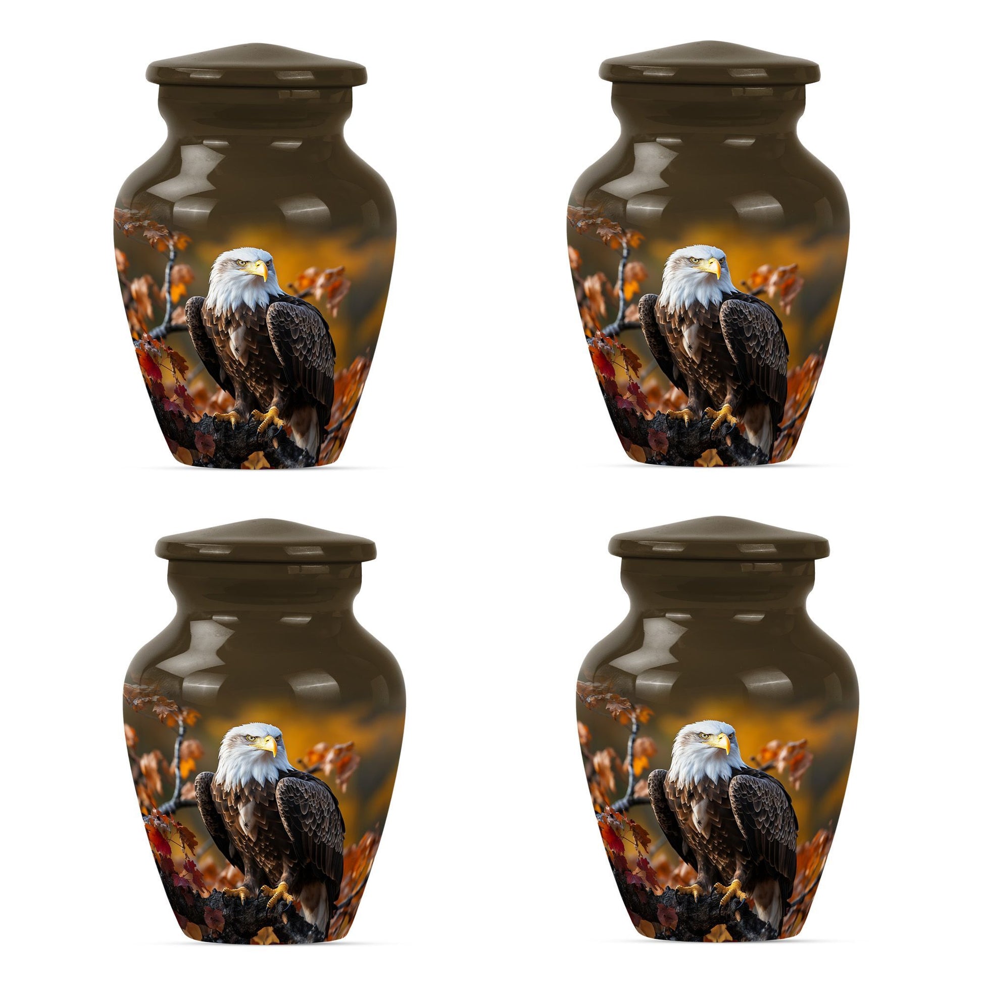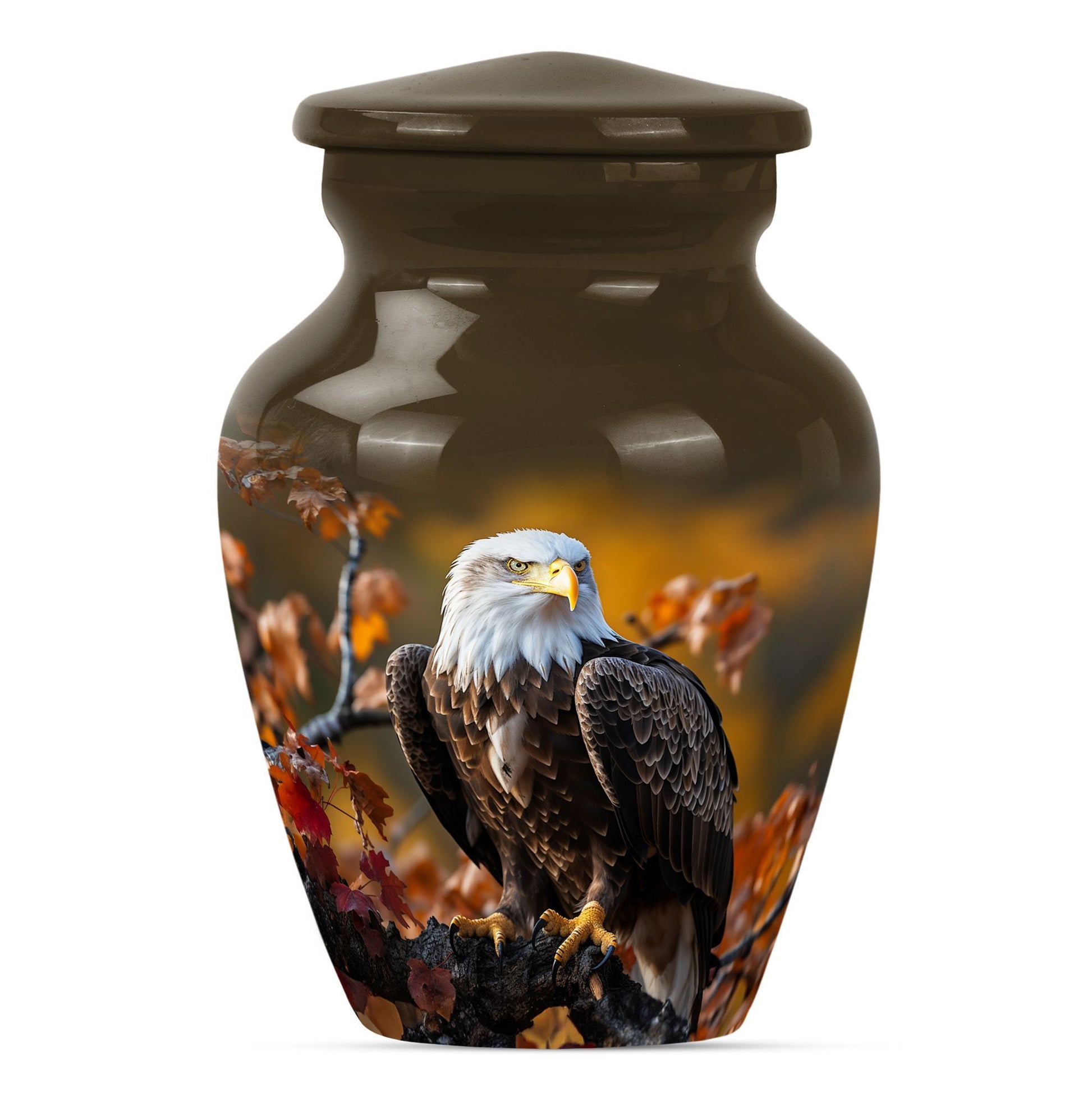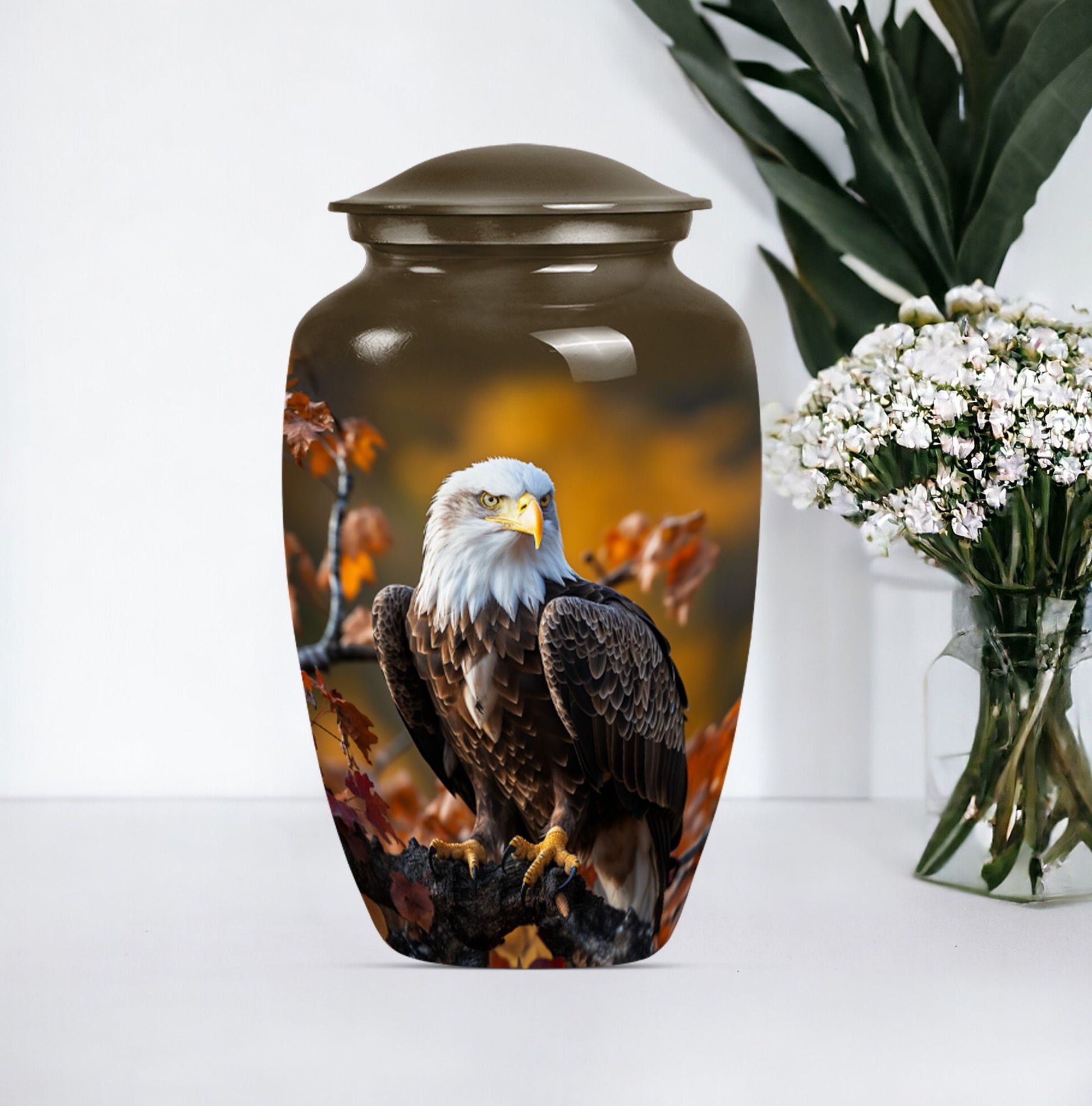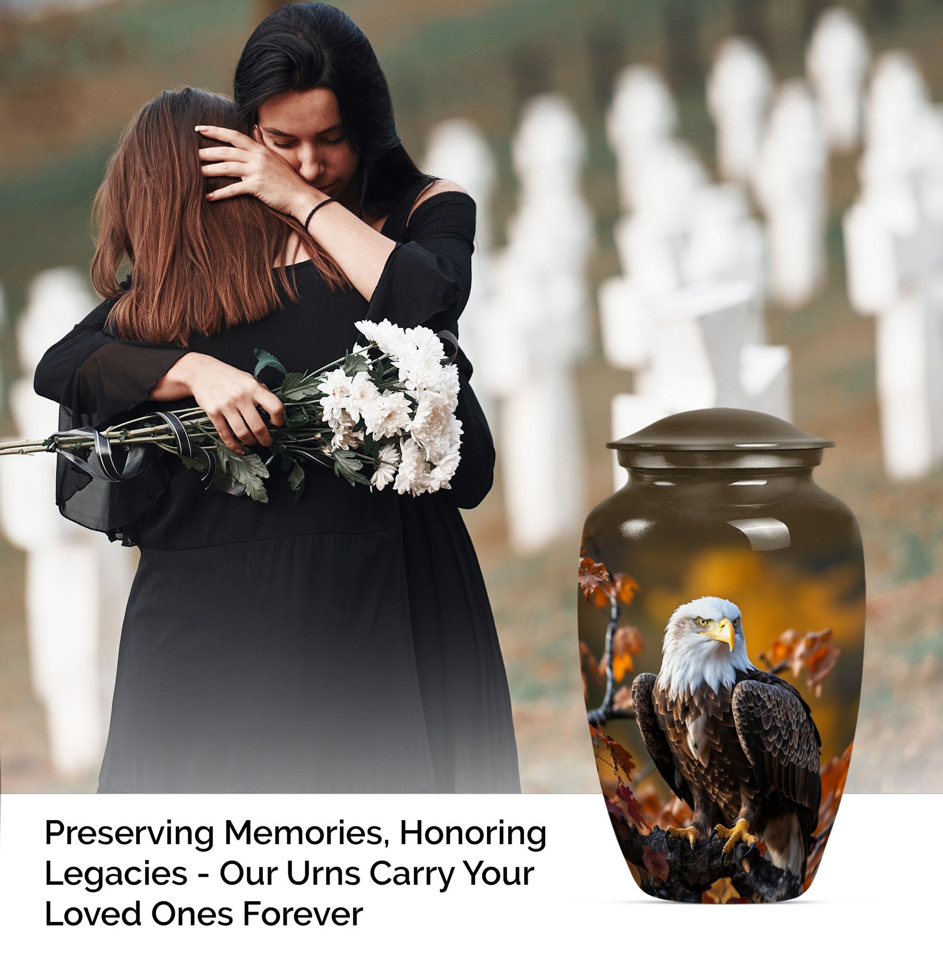 Be prepared for one of life's most profound transitions with the exquisite EAGLE Urn, carefully crafted for the containment of burial ashes. Measuring 10 inches in stature, this large urn is artfully shaped from sturdy aluminium, providing a hefty presence with a manageable weight of 3.3 pounds. The Wolf Howling theme injects a serene beauty to this traditional memorial urn, imparting an essence of tranquility and dignity. With a considerable capacity of 200 cubic inches, this piece ensures substantial space for adult ashes, making it a poignant selection for urns for cremation ashes. It comes inclusive of a velvet pouch for the ashes, providing an extra layer of protection and respect. The piece also provides an option for personalization- you can engrave names, adding a touch of intimacy to this aluminium memorial. Break away from the mundane with an urn that combines functionality, elegance, and personal touch, making the commemoration of your loved ones truly special.